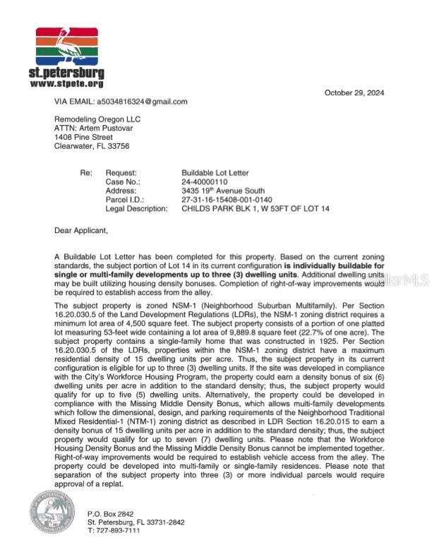 7 doors multifamily development opportunity close to Downtown St Petersburg. Surrounded by new construction multifamily. 225k/7= about 32k a door for land. See buildable lot letter from city attached. Soil Tests completed and report attached. Owner developed plans for 2 story triplex 4bed/4.5bath each with SplitPad rental model in mind. Total 12 en suit bedrooms. Plans are ready to be submitted to city as an option. Buyer to verify all information.