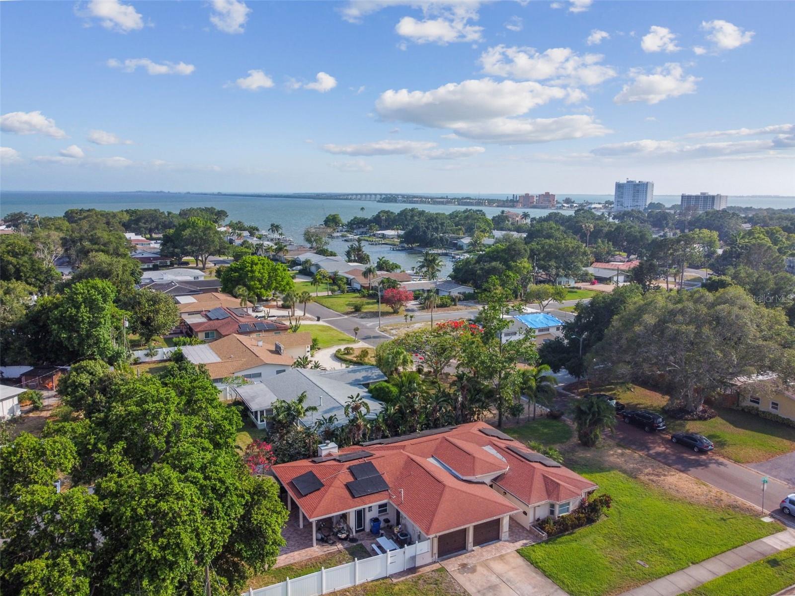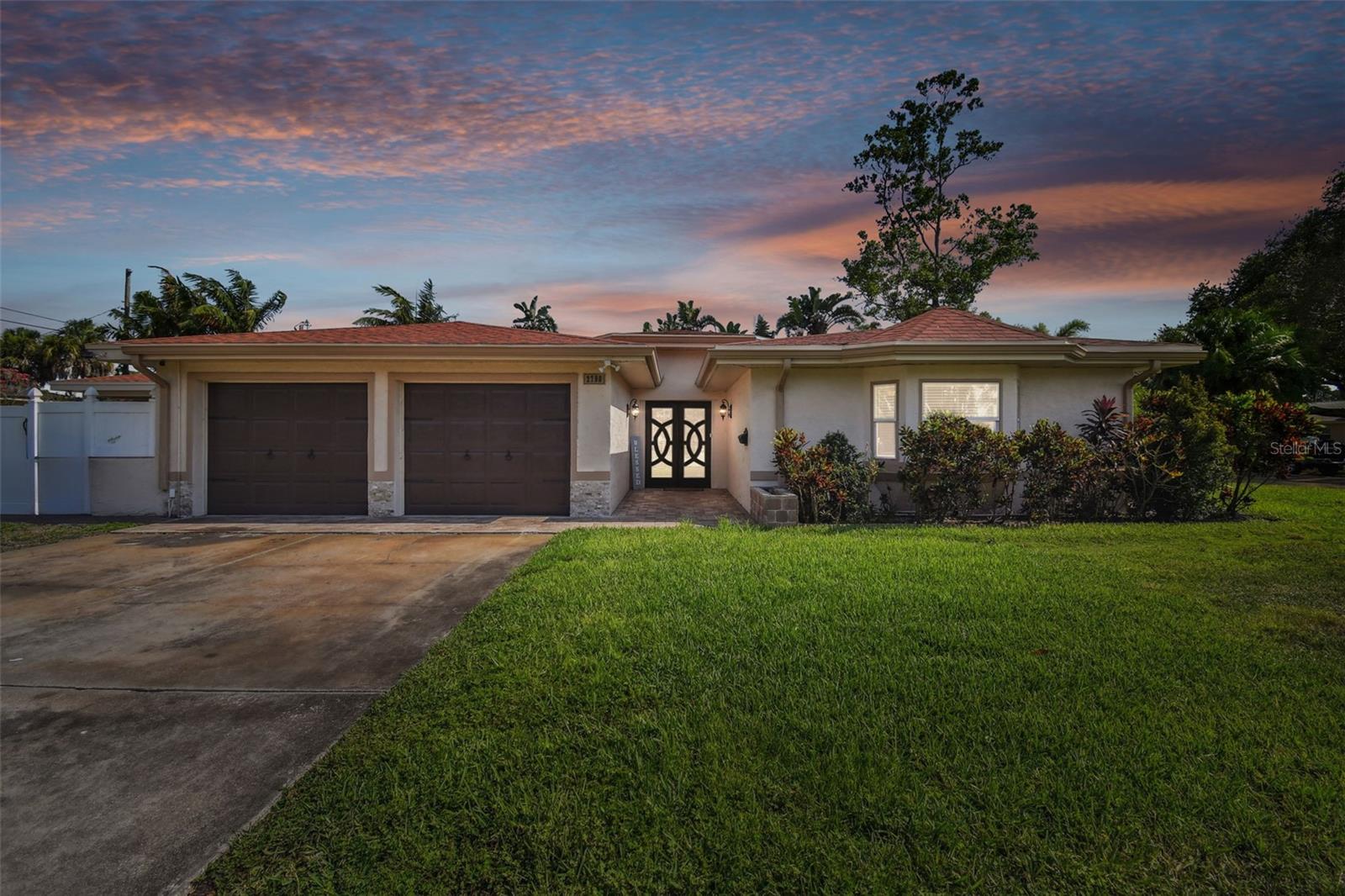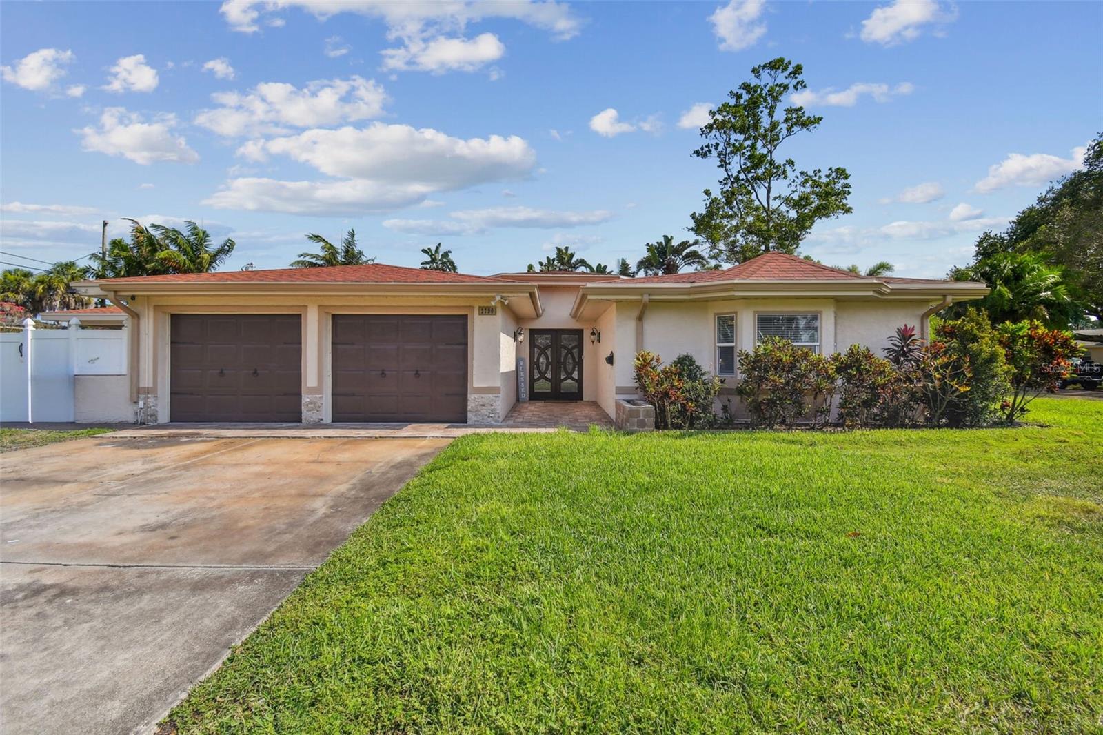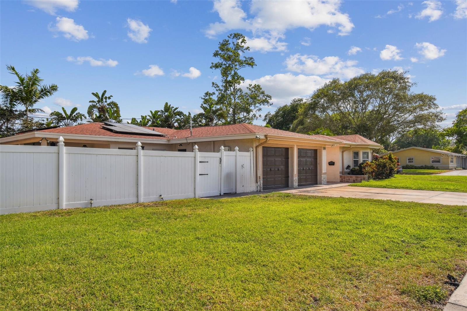 Discover this beautifully updated 3 bedroom, 3 bathroom residence nestled in the sunny locale of St. Pete, FL. Step inside to find a grand foyer adorned with a striking chandelier, leading into a spacious living room. This home seamlessly combines comfort with elegance, boasting recently installed sleek porcelain tile flooring throughout. The heart of the home features a bright and inviting family room and dining area, complete with a cozy wood-burning fireplace and charming built-in window seat. Adjacent to this space is a versatile open area with built-in shelves and a desk, perfect for a home office or study. Culinary enthusiasts will delight in the fully renovated kitchen equipped with exquisite cabinetry, a large central island, and modern built-ins. Double doors open from the kitchen to a beautifully landscaped paver patio, featuring a serene gazebo and an enticing jacuzzi—ideal for relaxation or entertaining guests. Each of the three spacious bedrooms offers ample comfort and style, with the bathrooms having undergone stunning updates. Practical features include solar panels to reduce electricity costs, a brand new HVAC system , and a roof that's been well-maintained for a decade. Enjoy the added financial benefits of no HOA or CDD fees and no flood insurance requirement. Positioned just moments from award-winning beaches, vibrant nightlife, and various attractions, and with easy access to the Skyway Bridge, this home is perfectly placed for enjoying the best of St. Pete’s lifestyle. Make this exquisite house your new home and live your Florida dream in style! PLEASE TAKE NOTE: FLOOD ZONE X (also know as "low risk flood zone")s the area determined to be outside the 500-year flood and protected by levee from 100- year flood.