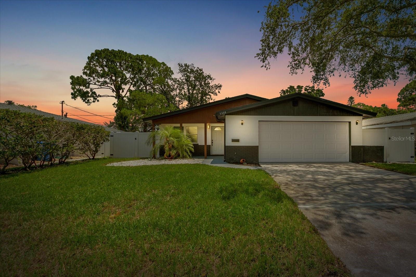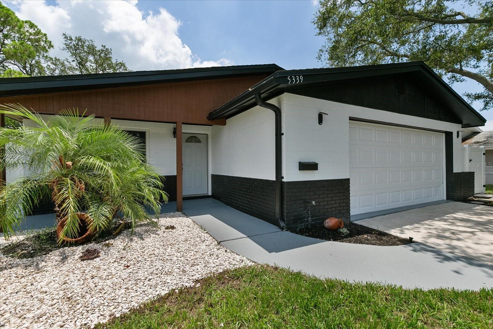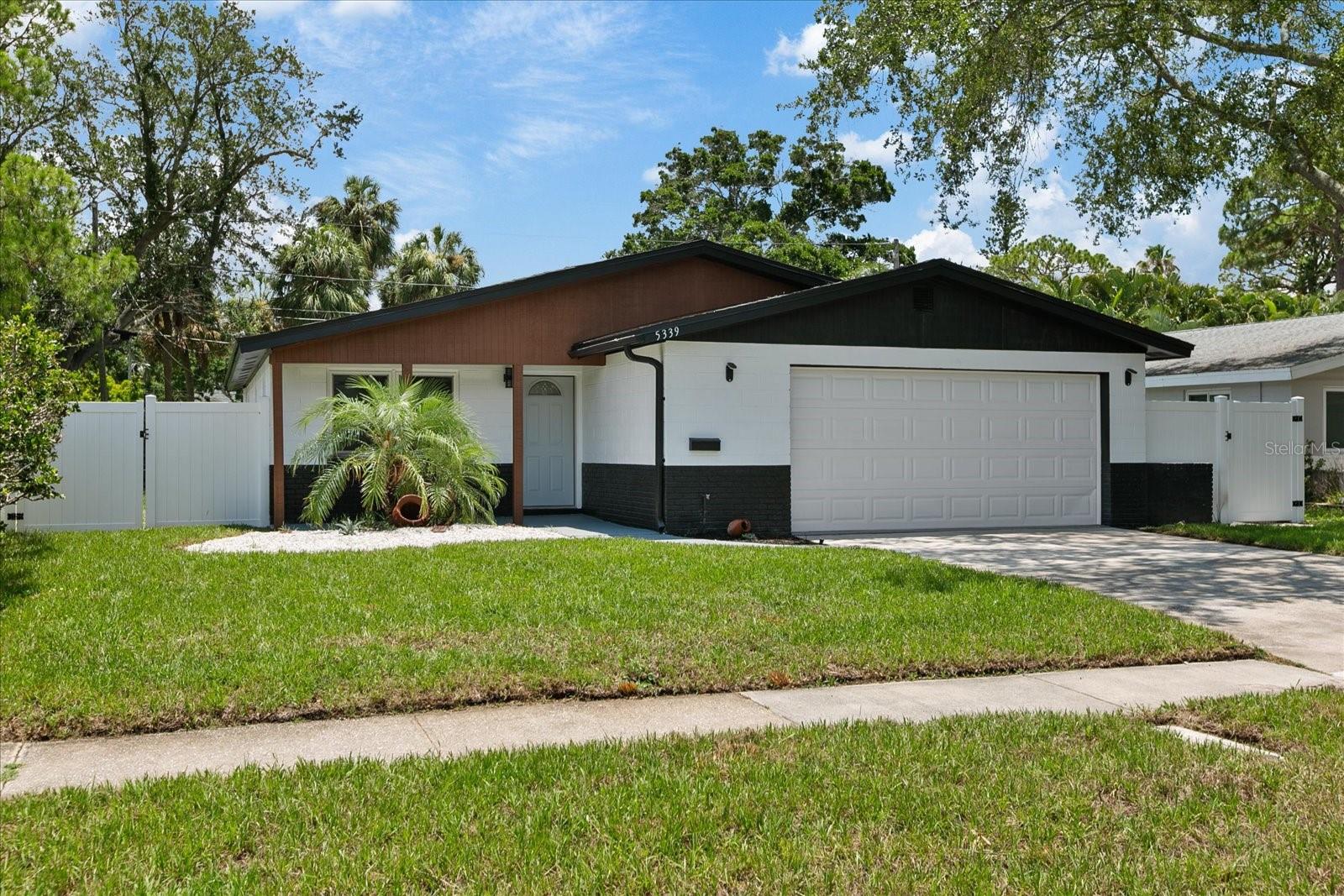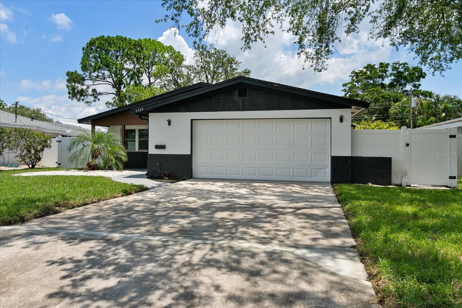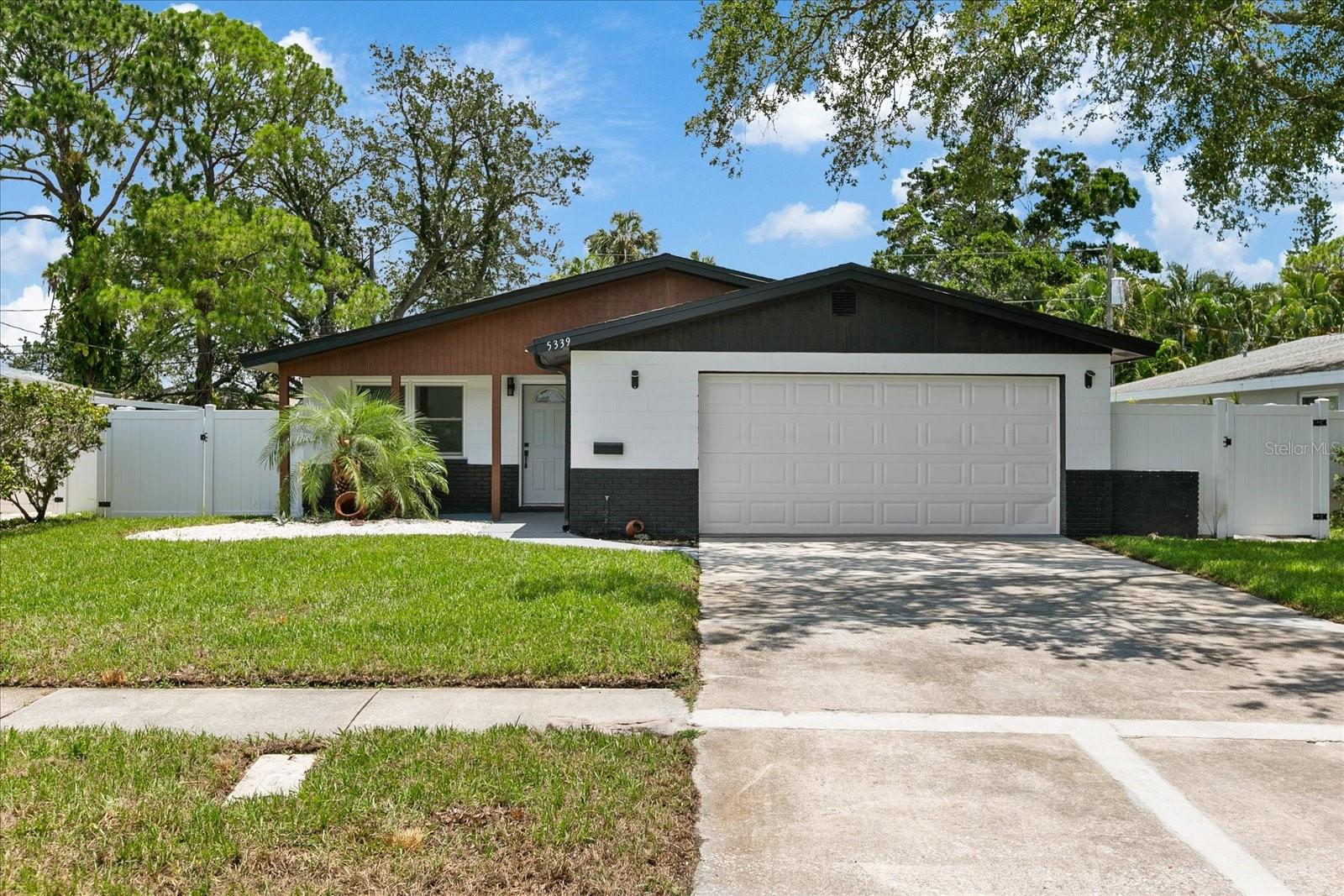 One or more photo(s) has been virtually staged. Step into modern luxury! This completely renovated block home features 3 bedrooms and 2 bathrooms, boasting stunning quartz kitchen countertops, pristine white shaker cabinets, and abundant shelving and storage space. Enjoy sleek laminate flooring throughout, a spacious two-car garage, and a brand-new roof. Modern amenities include a gas heater, gas stovetop, and brand-new appliances. The ample backyard offers the possibility of adding a pool for ultimate relaxation. Nestled in a quiet neighborhood, this home is conveniently located close to downtown St. Pete and beautiful beaches. Plus, enjoy the freedom of no HOA or CDD fees. Don't miss out on this perfect blend of style and convenience!