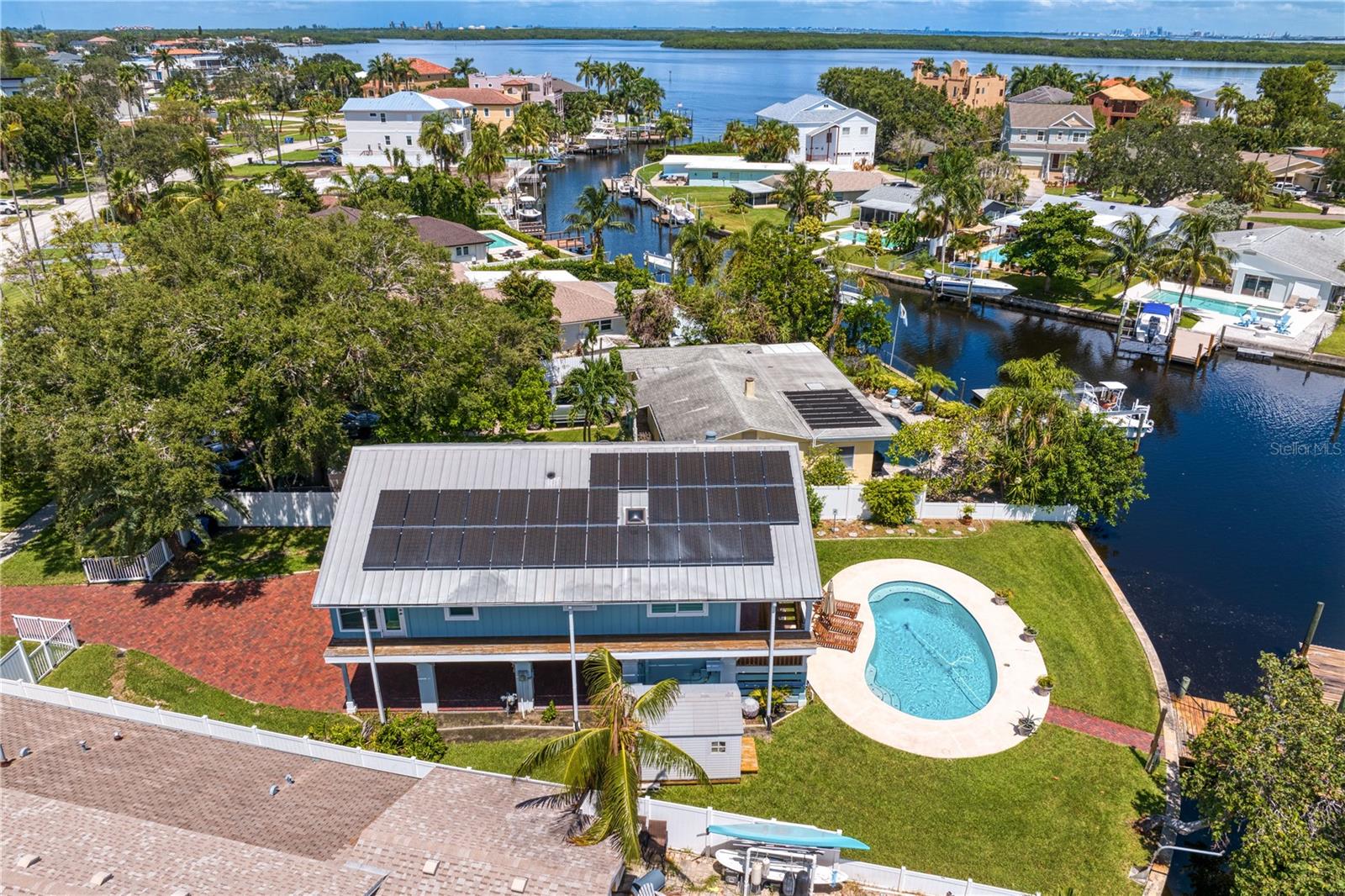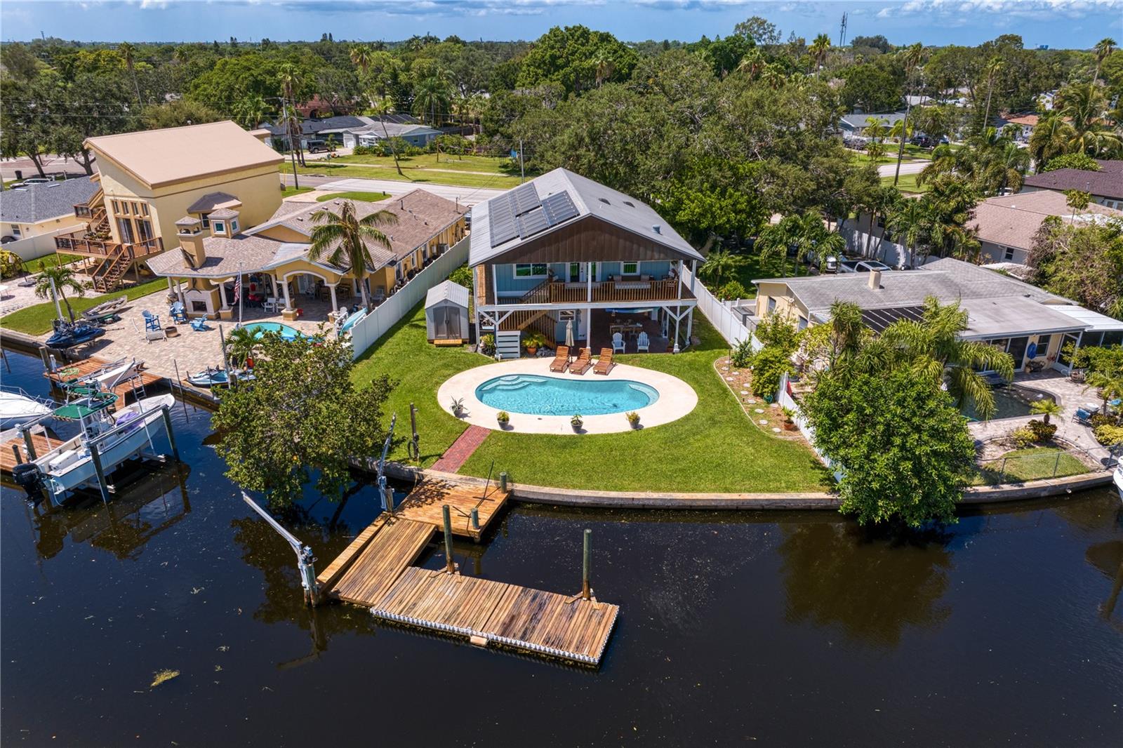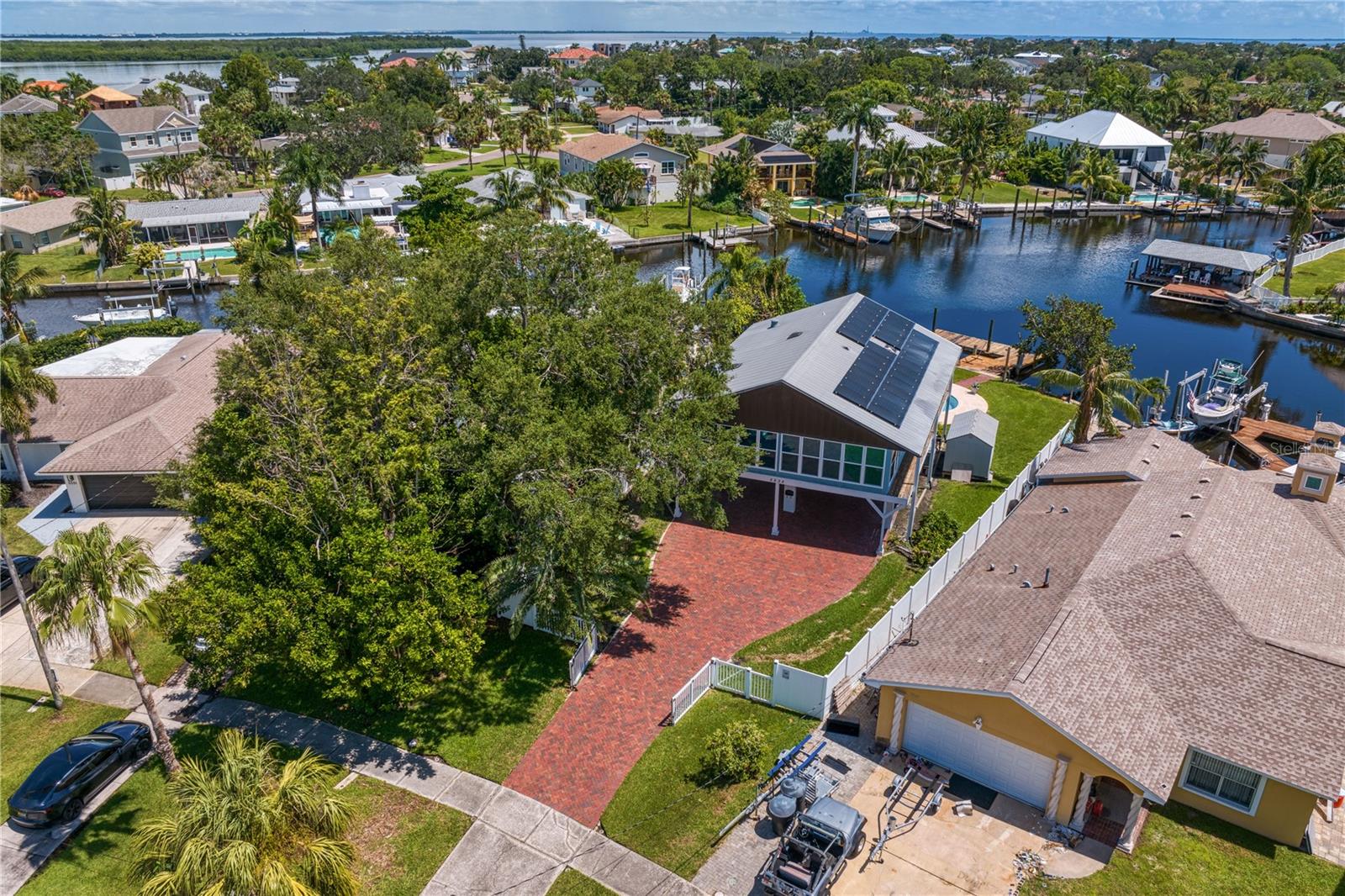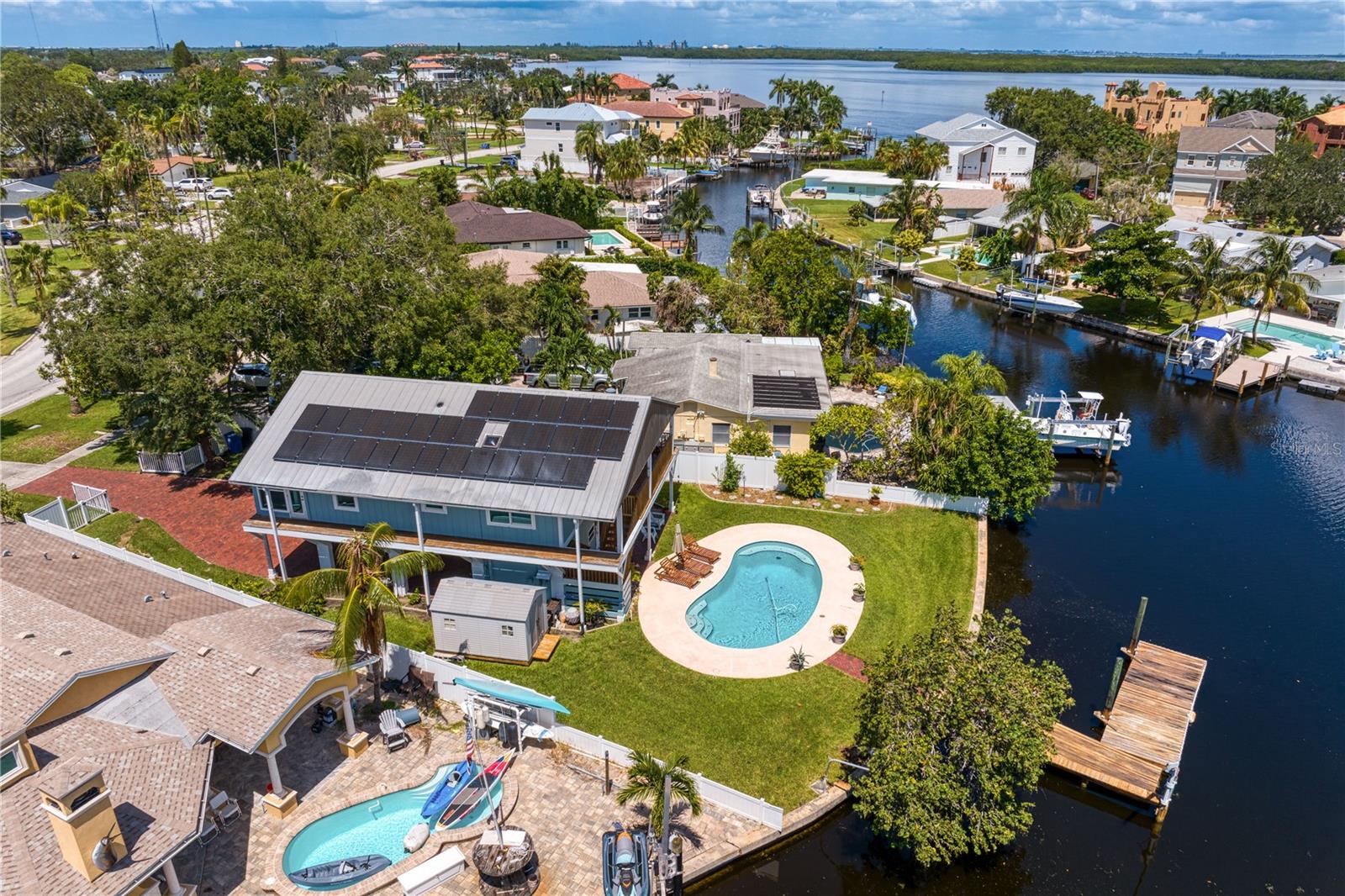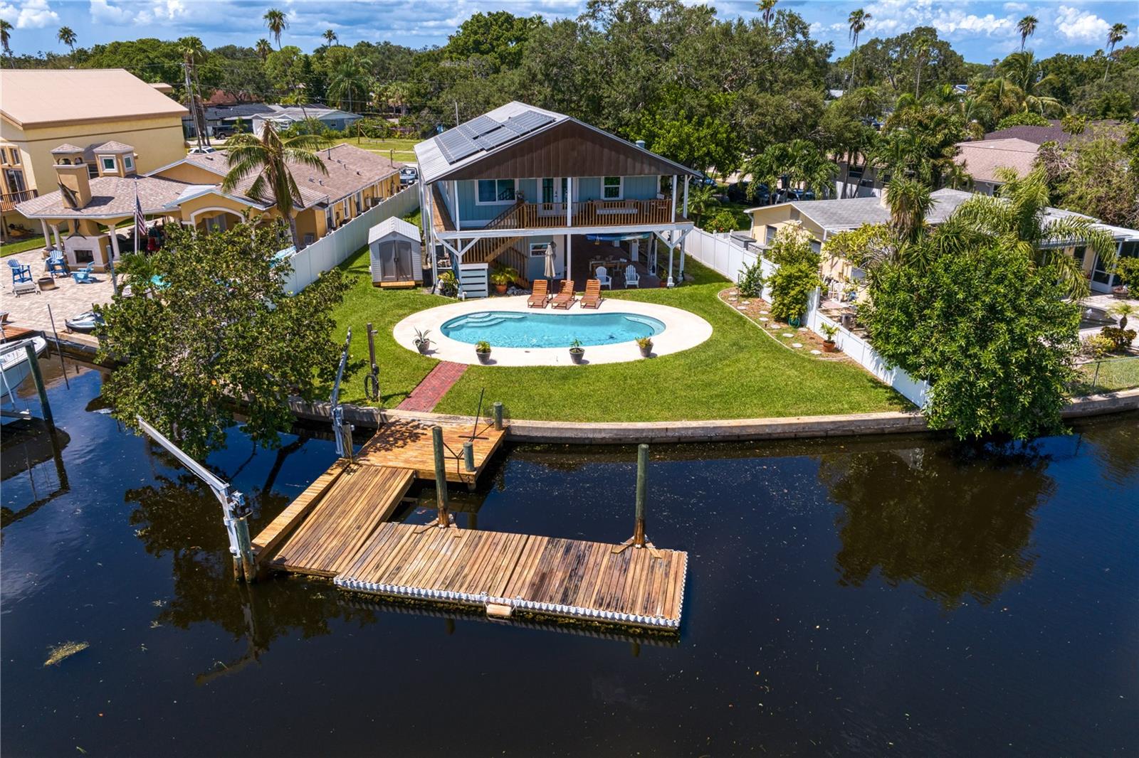 This home withstood both Hurricane Helene and Hurricane Milton with very minimal damage to the storage room on first floor. The main living floor of the home was undamaged in either storm….one more benefit of being built up above most of their neighbors in Shore Acres. What an amazing opportunity to make that dream of waterfront living a reality! This prime Shore Acres location provides a perfect launch for boating enthusiasts with 85 feet of waterfront footage on a wide canal that gives you direct access to Tampa Bay. The uniqueness of this property is what makes it so special. The home is wisely built 12 feet above base flood elevation, giving you endless views and eliminating the worry of flooding. You’ll love waking up to sunrises to the East and sunsets that will drench your home with that magic hour glow. Two bedrooms and two full baths give you everything you may be looking for in a lower maintenance property with all the amenities that come with large waterfront living. The sunny and inviting pool is the ideal backdrop for friends and family to gather on one of Shore Acres best lots. The situation on the canal provides added distance from your neighbors and an increased level of privacy. Open living spaces indoors make the efficient square footage feel even larger than it is. You’ll be charmed by the warmth of the home and the ease of lifestyle that comes with it. Warm knotty hardwood floors throughout, and stunning paneled ceilings contribute to the ambiance within. The newer renovated kitchen features solid wood cabinetry, upgraded stainless appliances, a gorgeous tile backsplash and stunning granite counters. The first level of the home includes a recently remodeled office or utility room with great storage space. Solar panels on the newer roof make monthly bills a breeze. Pull up to your home, put your toes in the water, and get ready to fall in love.