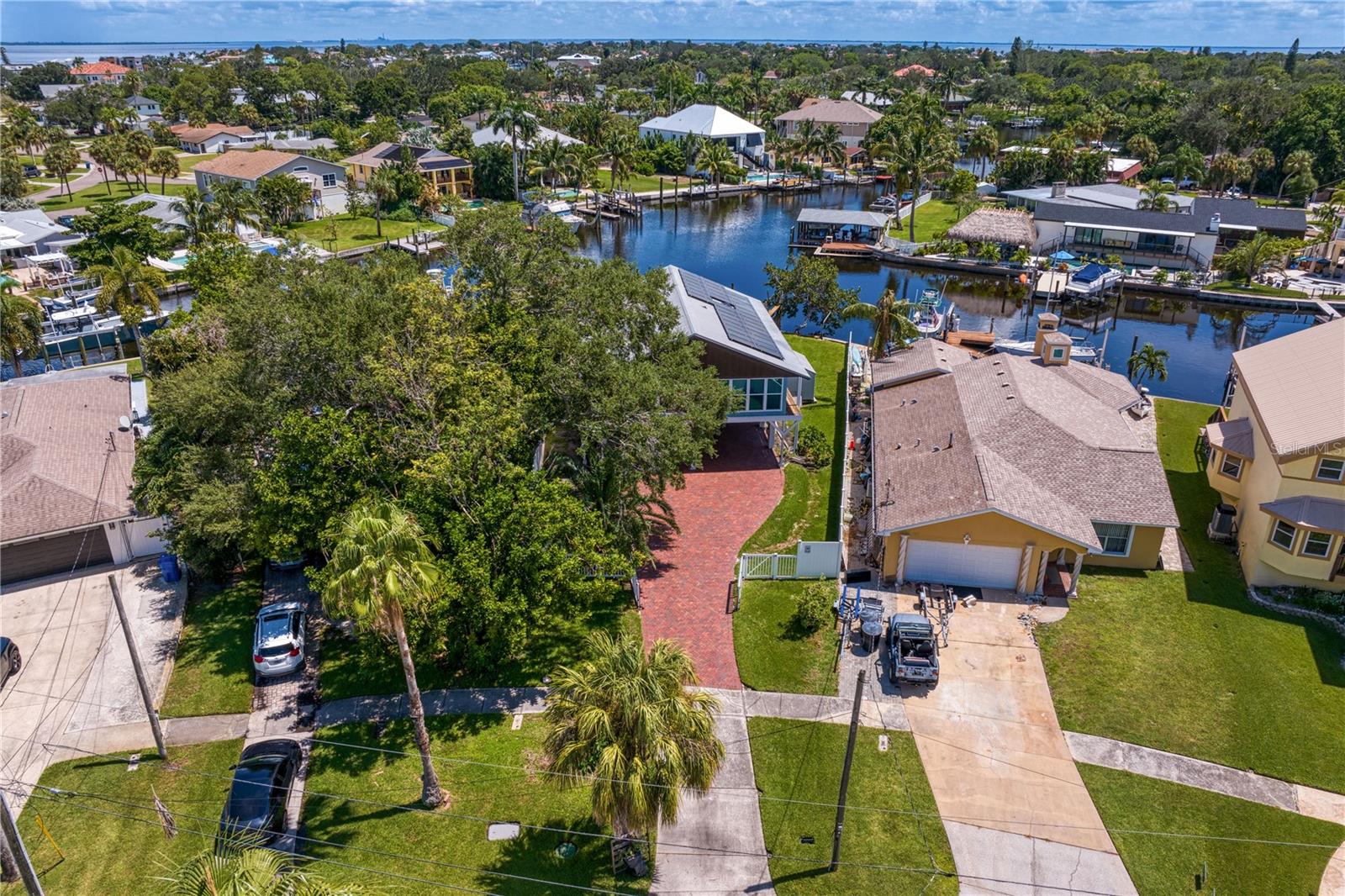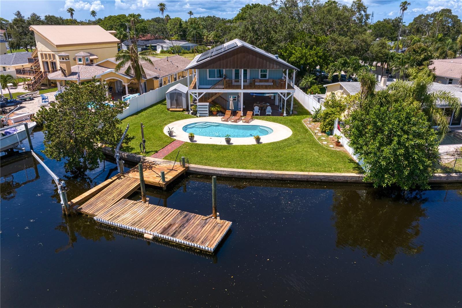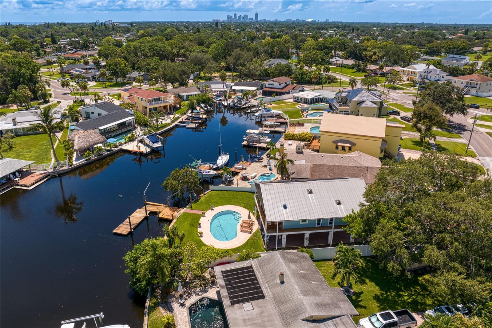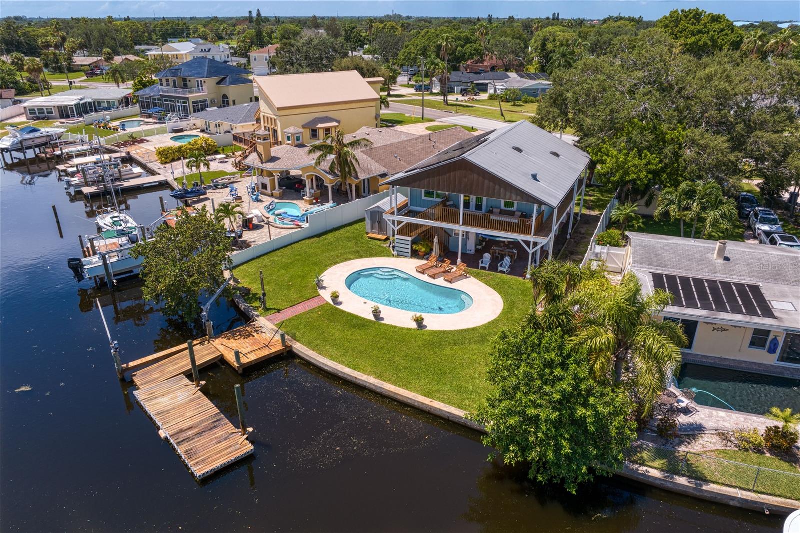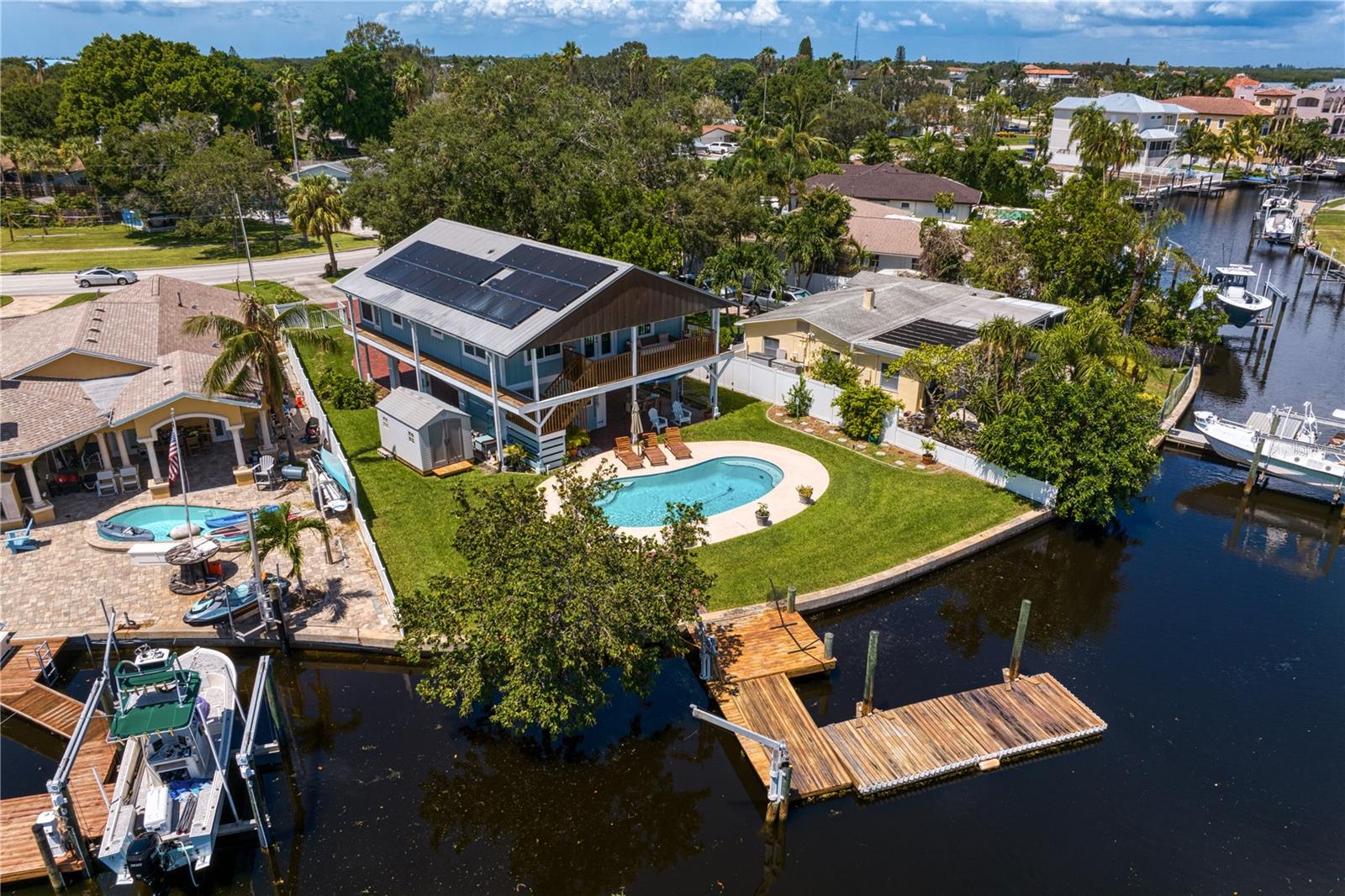 This home withstood both Hurricane Helene and Hurricane Milton with very minimal damage to the storage room on first floor. The main living floor of the home was undamaged in either storm….one more benefit of being built up above most of their neighbors in Shore Acres. What an amazing opportunity to make that dream of waterfront living a reality! This prime Shore Acres location provides a perfect launch for boating enthusiasts with 85 feet of waterfront footage on a wide canal that gives you direct access to Tampa Bay. The uniqueness of this property is what makes it so special. The home is wisely built 12 feet above base flood elevation, giving you endless views and eliminating the worry of flooding. You’ll love waking up to sunrises to the East and sunsets that will drench your home with that magic hour glow. Two bedrooms and two full baths give you everything you may be looking for in a lower maintenance property with all the amenities that come with large waterfront living. The sunny and inviting pool is the ideal backdrop for friends and family to gather on one of Shore Acres best lots. The situation on the canal provides added distance from your neighbors and an increased level of privacy. Open living spaces indoors make the efficient square footage feel even larger than it is. You’ll be charmed by the warmth of the home and the ease of lifestyle that comes with it. Warm knotty hardwood floors throughout, and stunning paneled ceilings contribute to the ambiance within. The newer renovated kitchen features solid wood cabinetry, upgraded stainless appliances, a gorgeous tile backsplash and stunning granite counters. The first level of the home includes a recently remodeled office or utility room with great storage space. Solar panels on the newer roof make monthly bills a breeze. Pull up to your home, put your toes in the water, and get ready to fall in love.