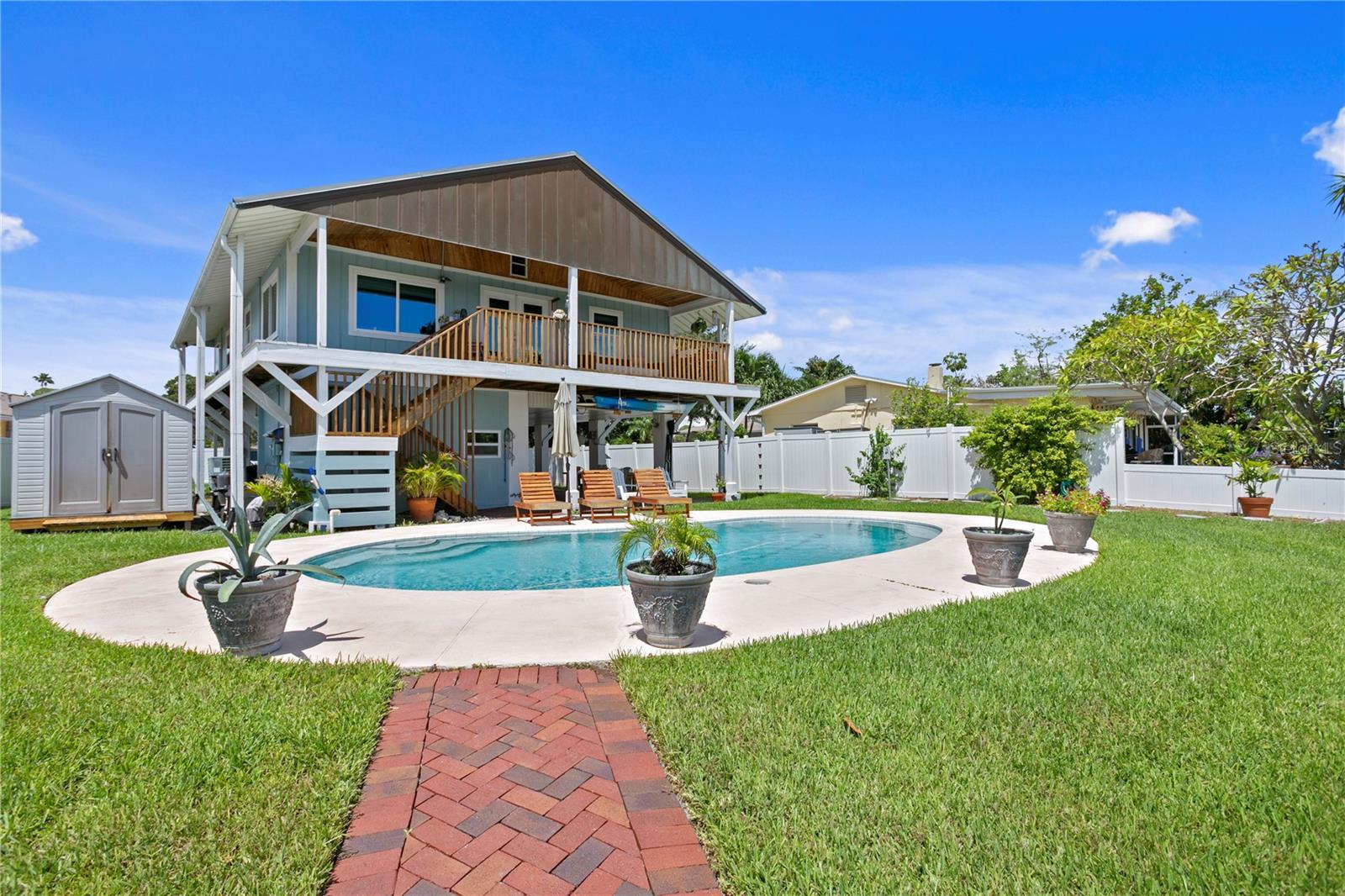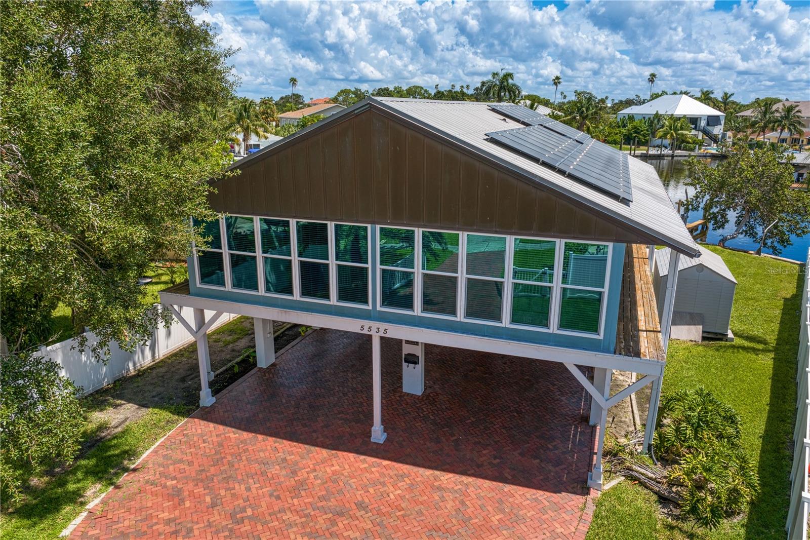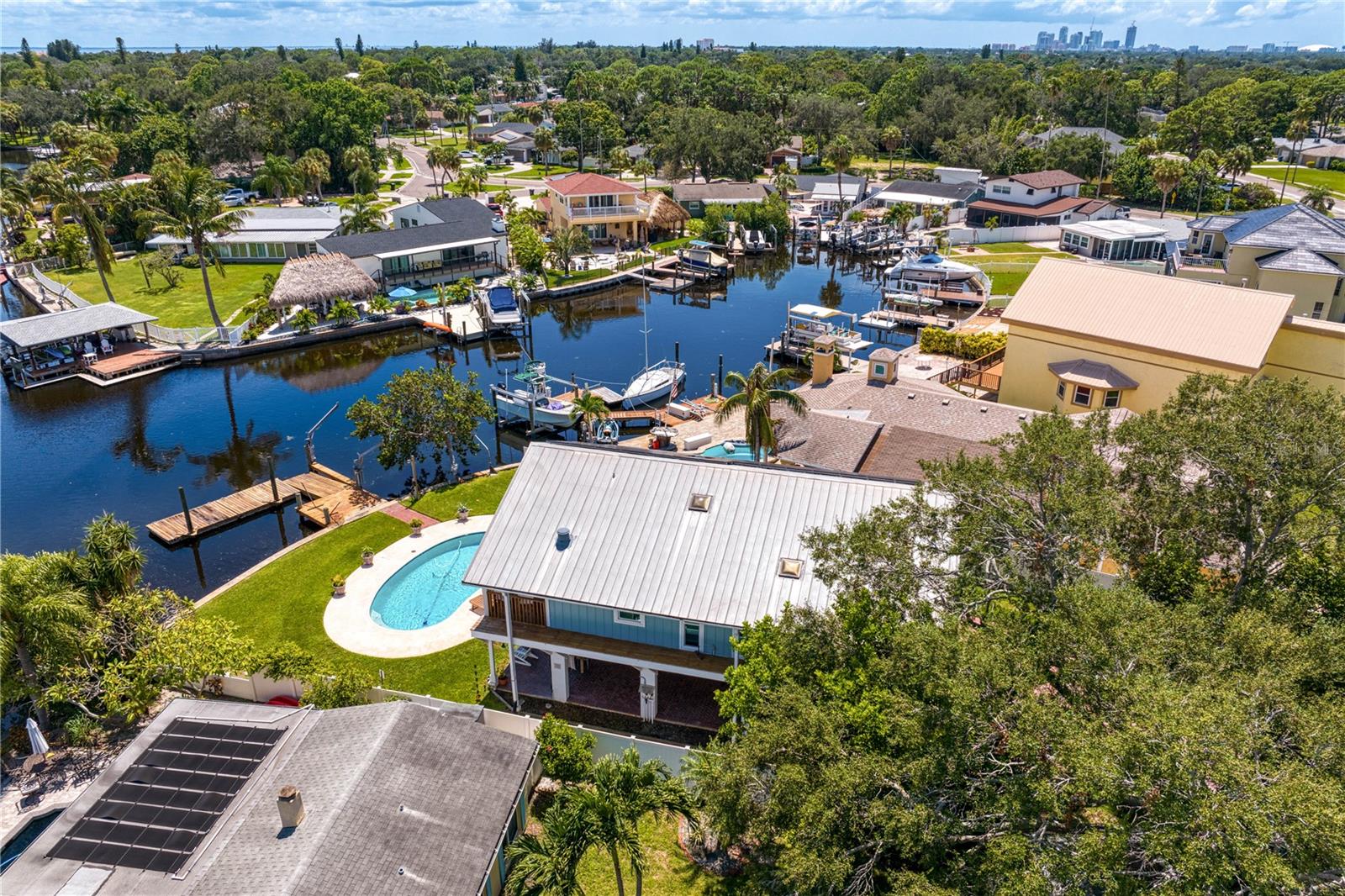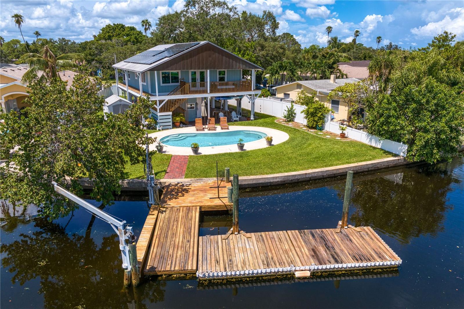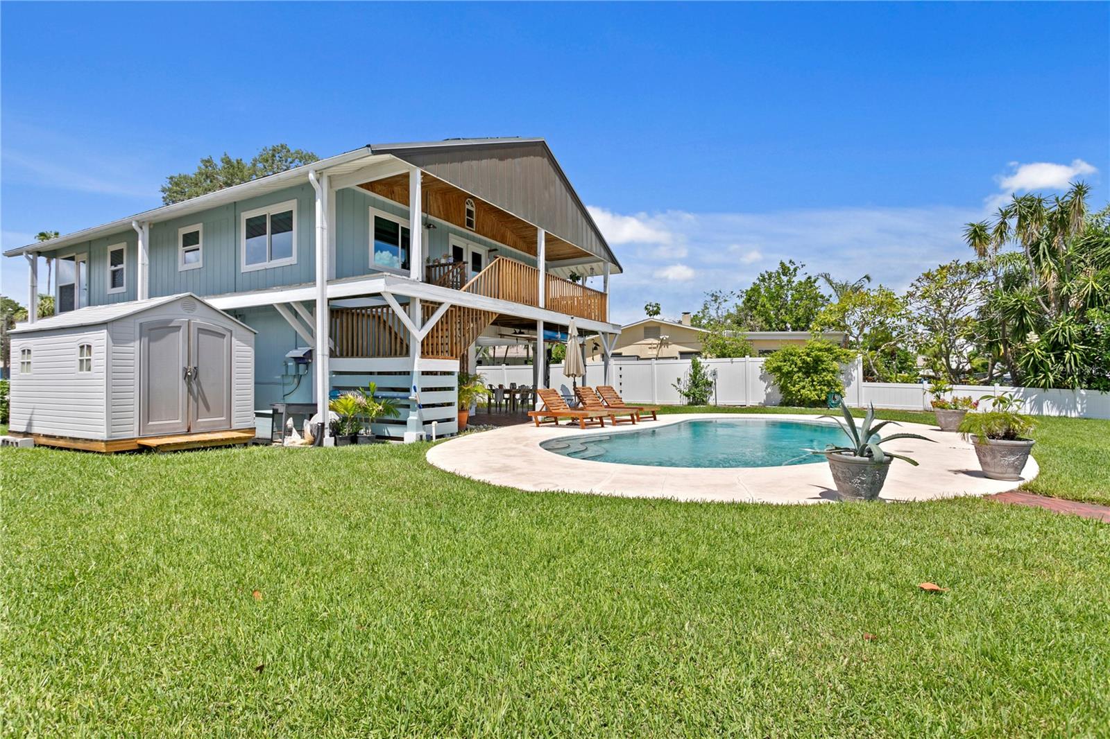 This home withstood both Hurricane Helene and Hurricane Milton with very minimal damage to the storage room on first floor. The main living floor of the home was undamaged in either storm….one more benefit of being built up above most of their neighbors in Shore Acres. What an amazing opportunity to make that dream of waterfront living a reality! This prime Shore Acres location provides a perfect launch for boating enthusiasts with 85 feet of waterfront footage on a wide canal that gives you direct access to Tampa Bay. The uniqueness of this property is what makes it so special. The home is wisely built 12 feet above base flood elevation, giving you endless views and eliminating the worry of flooding. You’ll love waking up to sunrises to the East and sunsets that will drench your home with that magic hour glow. Two bedrooms and two full baths give you everything you may be looking for in a lower maintenance property with all the amenities that come with large waterfront living. The sunny and inviting pool is the ideal backdrop for friends and family to gather on one of Shore Acres best lots. The situation on the canal provides added distance from your neighbors and an increased level of privacy. Open living spaces indoors make the efficient square footage feel even larger than it is. You’ll be charmed by the warmth of the home and the ease of lifestyle that comes with it. Warm knotty hardwood floors throughout, and stunning paneled ceilings contribute to the ambiance within. The newer renovated kitchen features solid wood cabinetry, upgraded stainless appliances, a gorgeous tile backsplash and stunning granite counters. The first level of the home includes a recently remodeled office or utility room with great storage space. Solar panels on the newer roof make monthly bills a breeze. Pull up to your home, put your toes in the water, and get ready to fall in love.