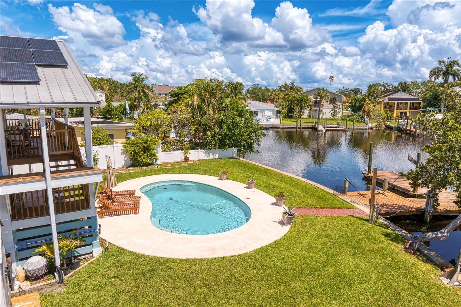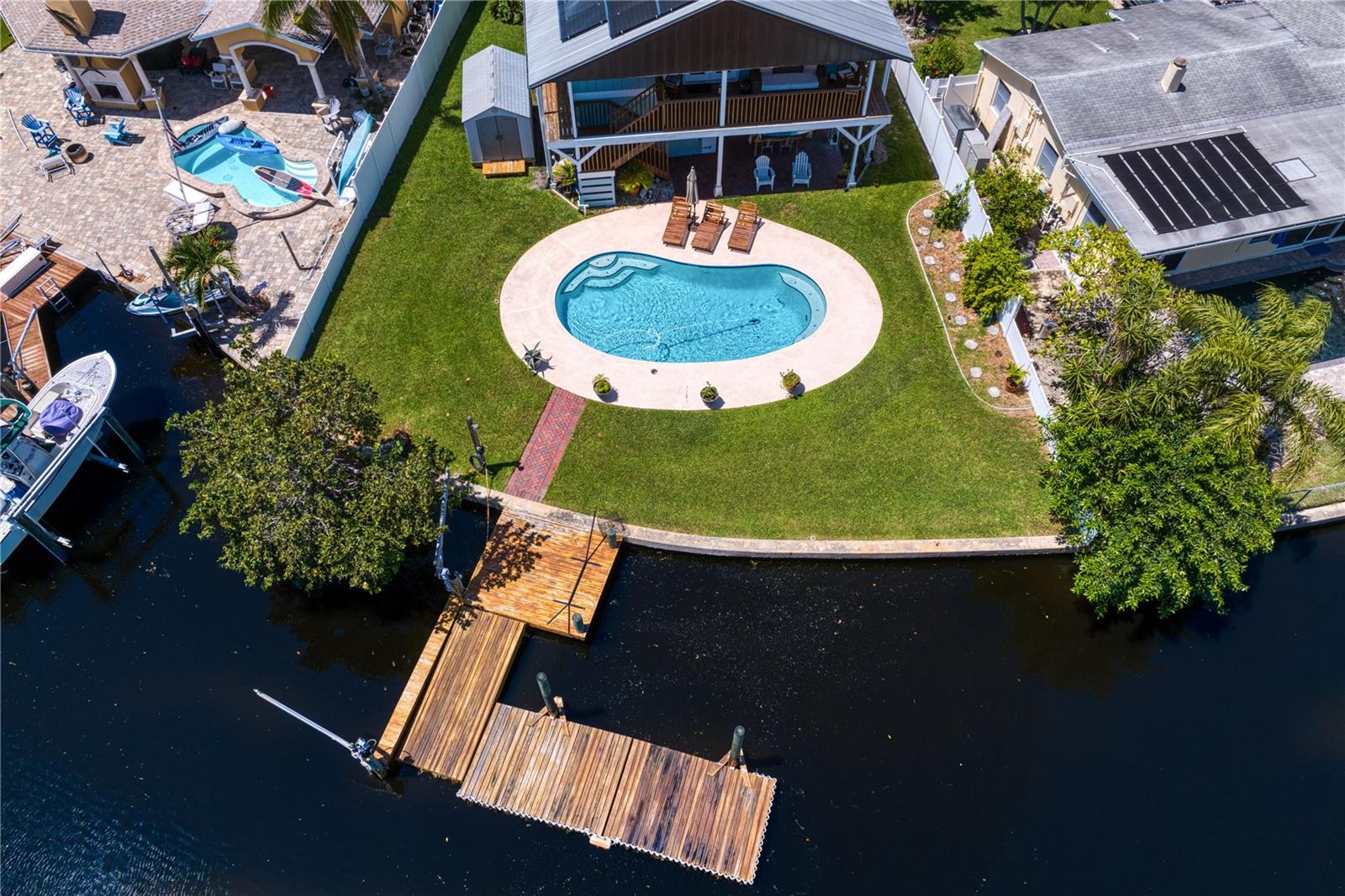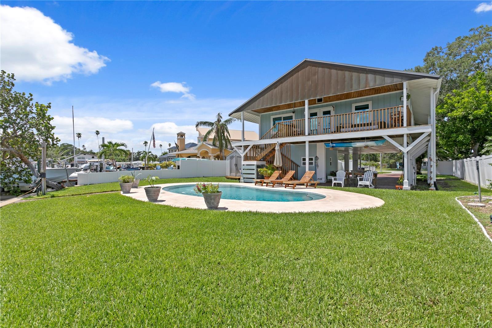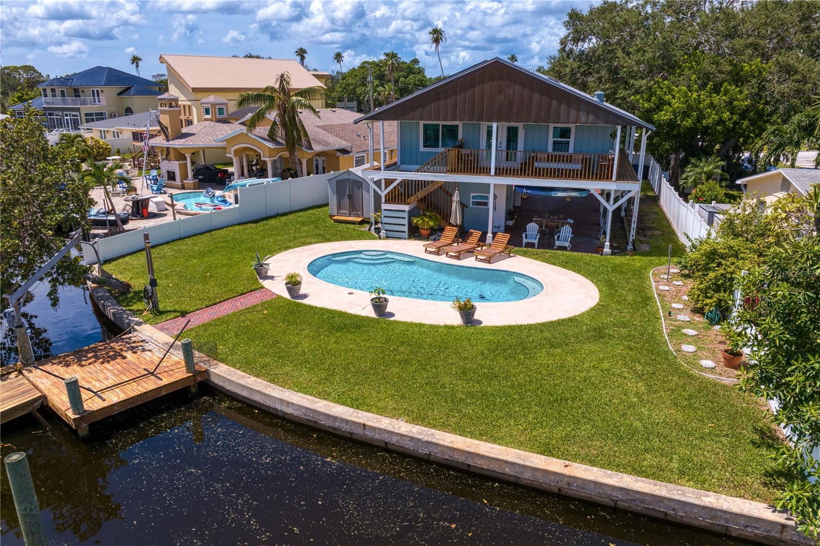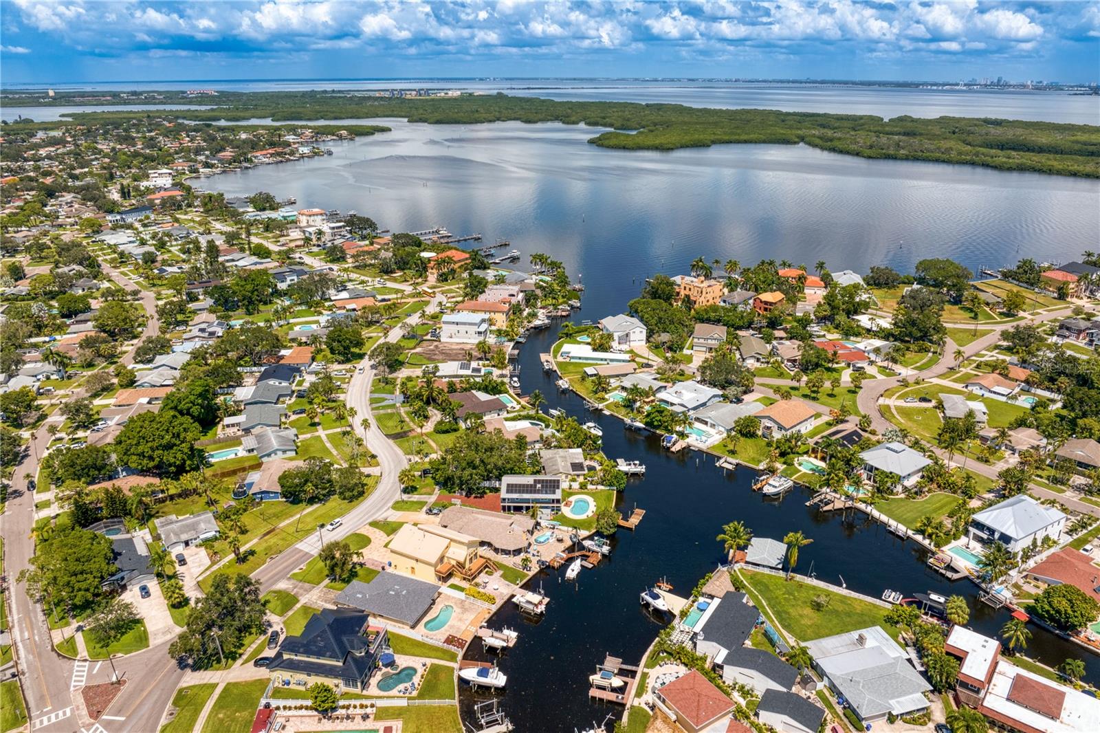 This home withstood both Hurricane Helene and Hurricane Milton with very minimal damage to the storage room on first floor. The main living floor of the home was undamaged in either storm….one more benefit of being built up above most of their neighbors in Shore Acres. What an amazing opportunity to make that dream of waterfront living a reality! This prime Shore Acres location provides a perfect launch for boating enthusiasts with 85 feet of waterfront footage on a wide canal that gives you direct access to Tampa Bay. The uniqueness of this property is what makes it so special. The home is wisely built 12 feet above base flood elevation, giving you endless views and eliminating the worry of flooding. You’ll love waking up to sunrises to the East and sunsets that will drench your home with that magic hour glow. Two bedrooms and two full baths give you everything you may be looking for in a lower maintenance property with all the amenities that come with large waterfront living. The sunny and inviting pool is the ideal backdrop for friends and family to gather on one of Shore Acres best lots. The situation on the canal provides added distance from your neighbors and an increased level of privacy. Open living spaces indoors make the efficient square footage feel even larger than it is. You’ll be charmed by the warmth of the home and the ease of lifestyle that comes with it. Warm knotty hardwood floors throughout, and stunning paneled ceilings contribute to the ambiance within. The newer renovated kitchen features solid wood cabinetry, upgraded stainless appliances, a gorgeous tile backsplash and stunning granite counters. The first level of the home includes a recently remodeled office or utility room with great storage space. Solar panels on the newer roof make monthly bills a breeze. Pull up to your home, put your toes in the water, and get ready to fall in love.