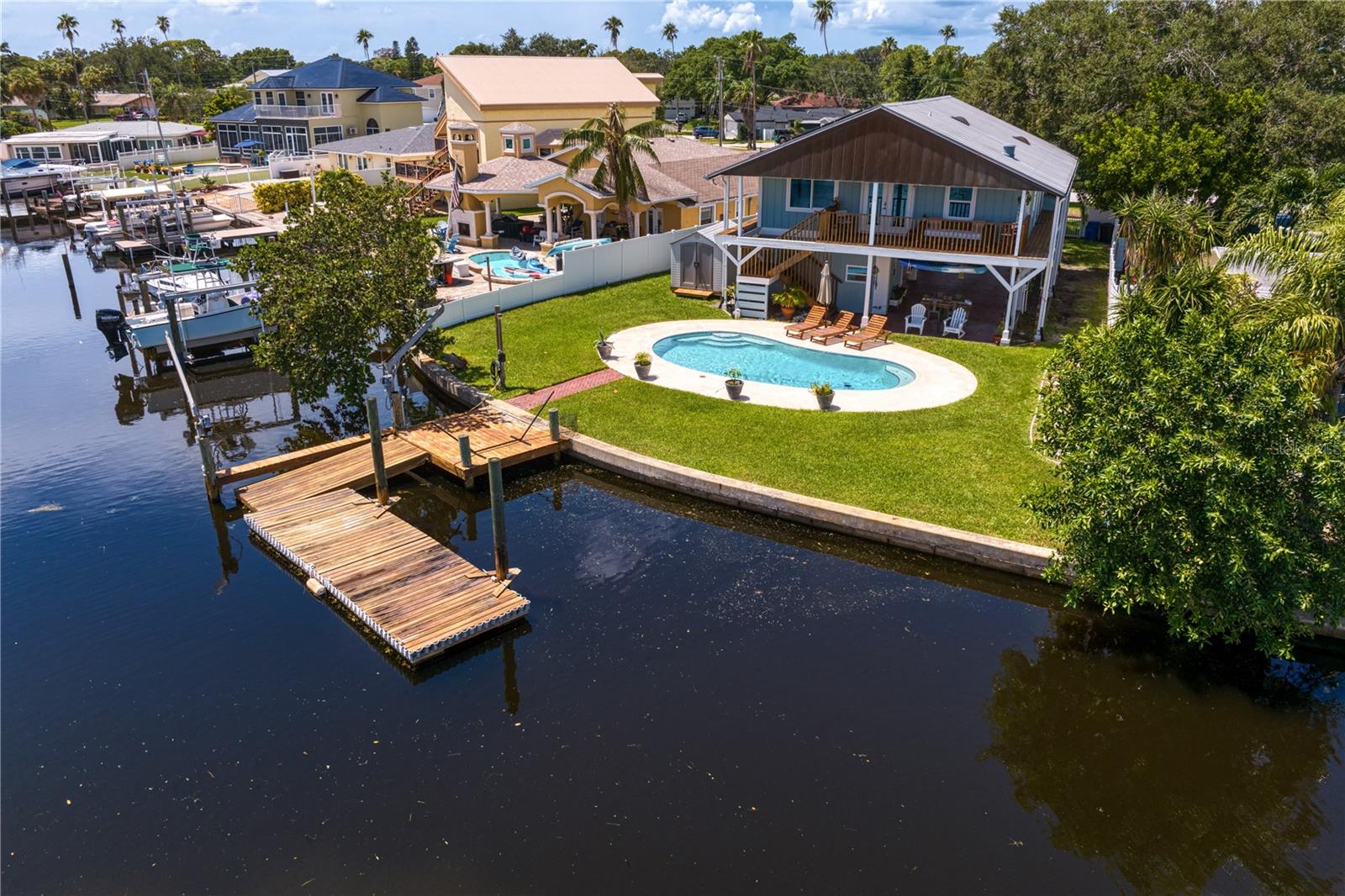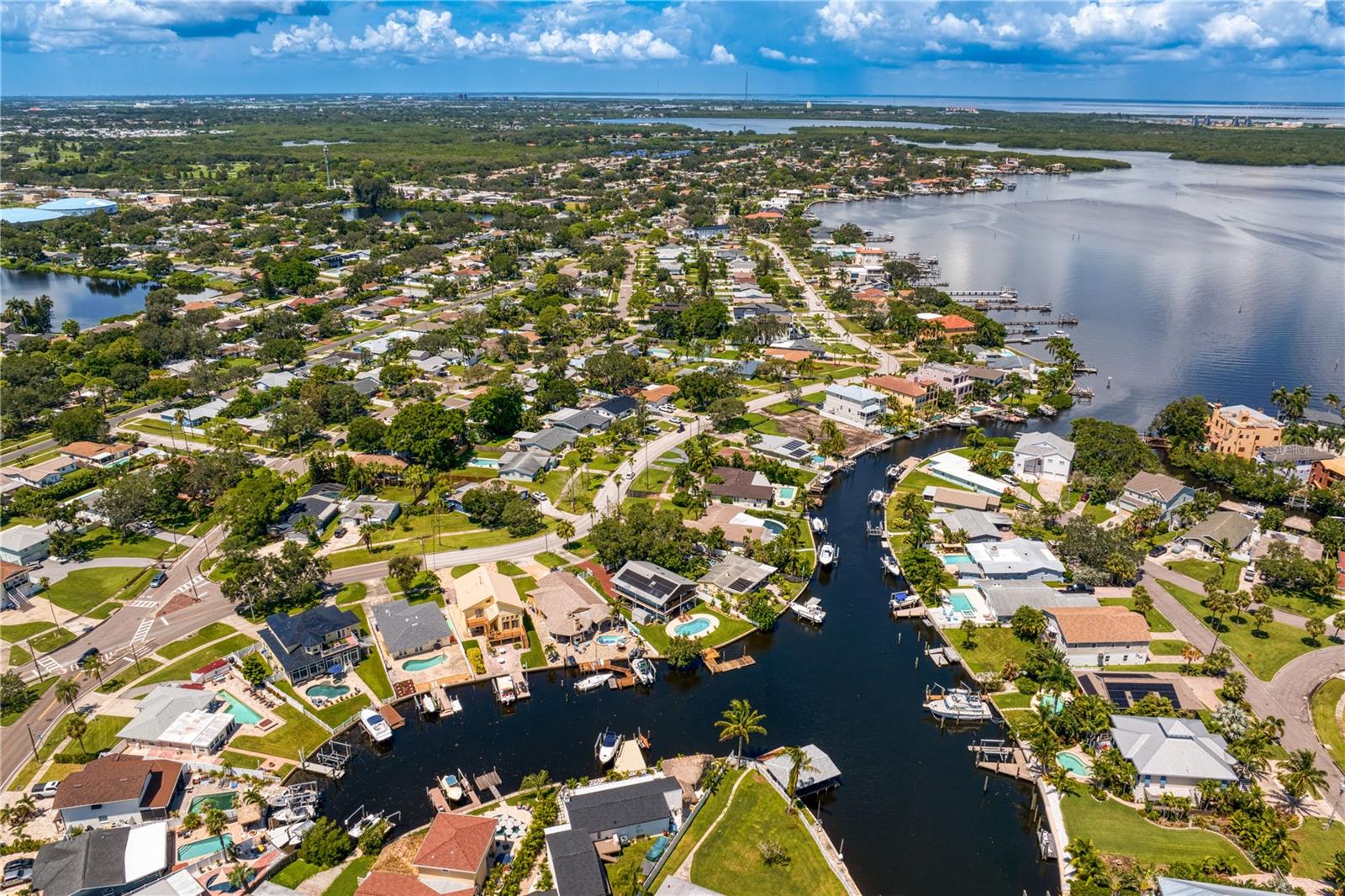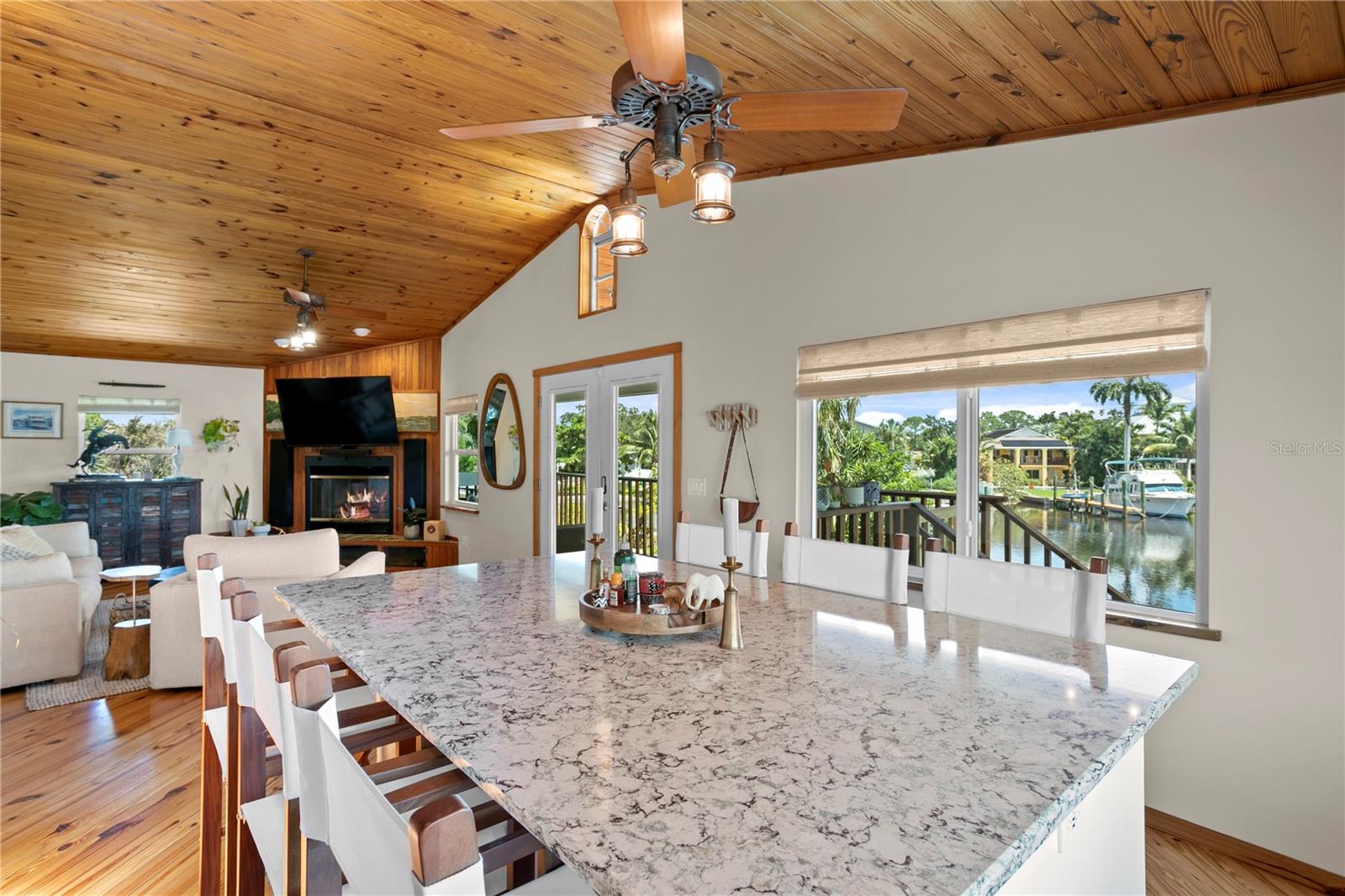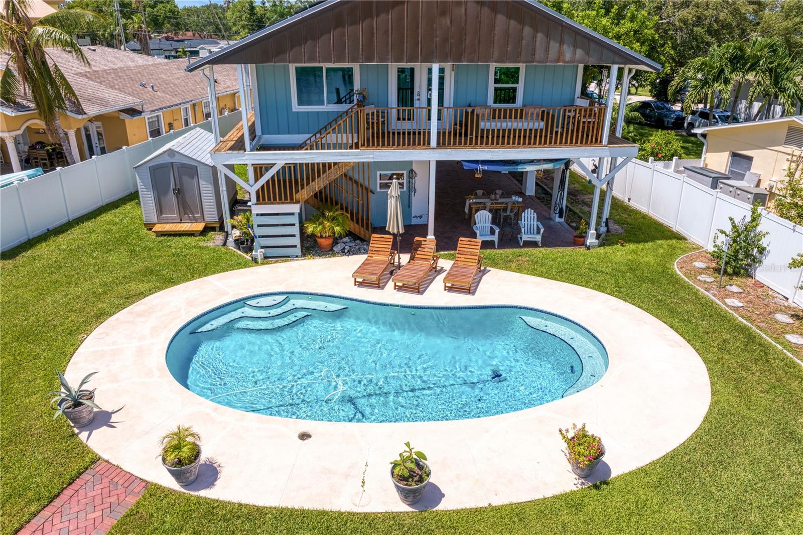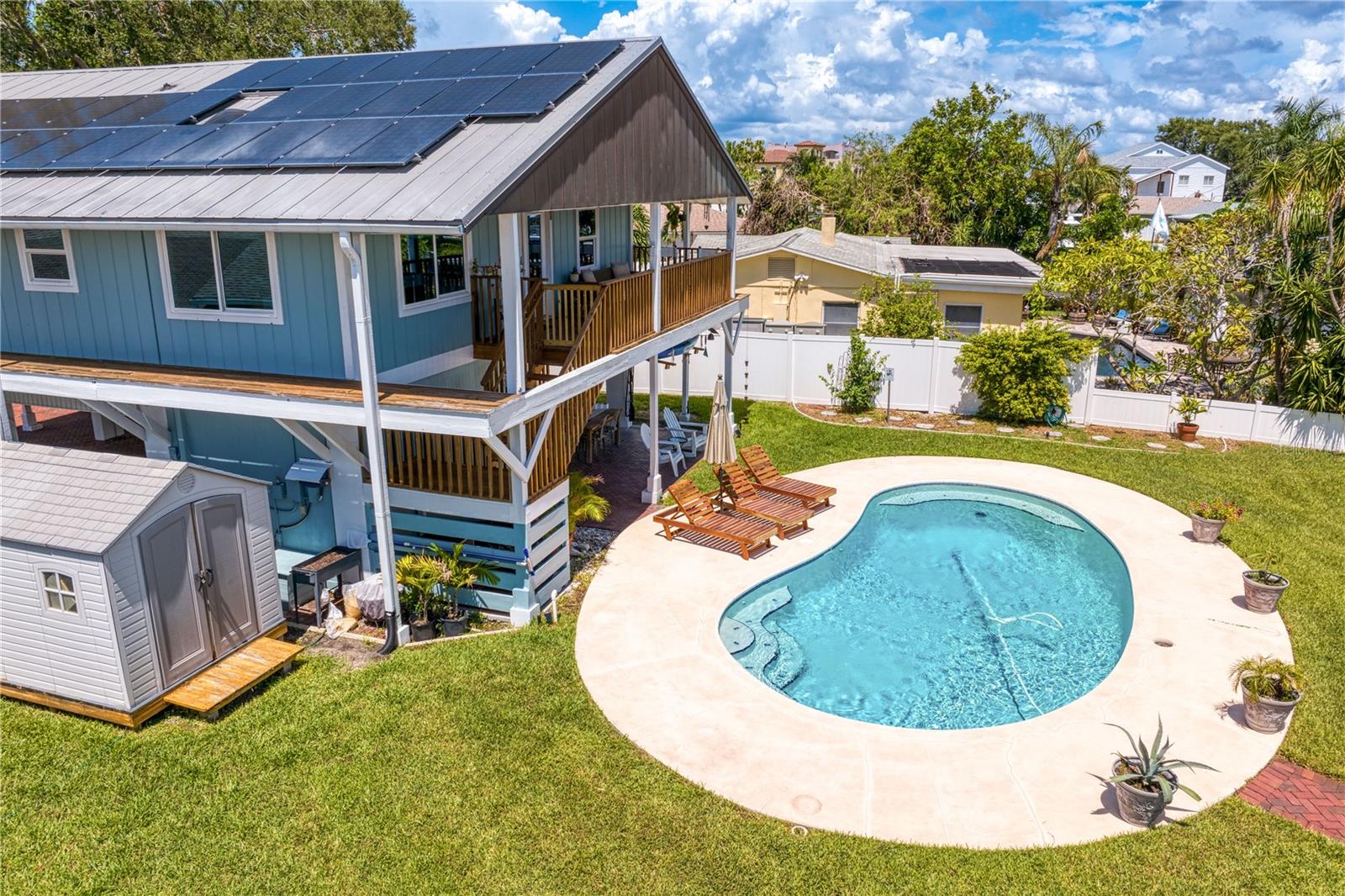 This home withstood both Hurricane Helene and Hurricane Milton with very minimal damage to the storage room on first floor. The main living floor of the home was undamaged in either storm….one more benefit of being built up above most of their neighbors in Shore Acres. What an amazing opportunity to make that dream of waterfront living a reality! This prime Shore Acres location provides a perfect launch for boating enthusiasts with 85 feet of waterfront footage on a wide canal that gives you direct access to Tampa Bay. The uniqueness of this property is what makes it so special. The home is wisely built 12 feet above base flood elevation, giving you endless views and eliminating the worry of flooding. You’ll love waking up to sunrises to the East and sunsets that will drench your home with that magic hour glow. Two bedrooms and two full baths give you everything you may be looking for in a lower maintenance property with all the amenities that come with large waterfront living. The sunny and inviting pool is the ideal backdrop for friends and family to gather on one of Shore Acres best lots. The situation on the canal provides added distance from your neighbors and an increased level of privacy. Open living spaces indoors make the efficient square footage feel even larger than it is. You’ll be charmed by the warmth of the home and the ease of lifestyle that comes with it. Warm knotty hardwood floors throughout, and stunning paneled ceilings contribute to the ambiance within. The newer renovated kitchen features solid wood cabinetry, upgraded stainless appliances, a gorgeous tile backsplash and stunning granite counters. The first level of the home includes a recently remodeled office or utility room with great storage space. Solar panels on the newer roof make monthly bills a breeze. Pull up to your home, put your toes in the water, and get ready to fall in love.