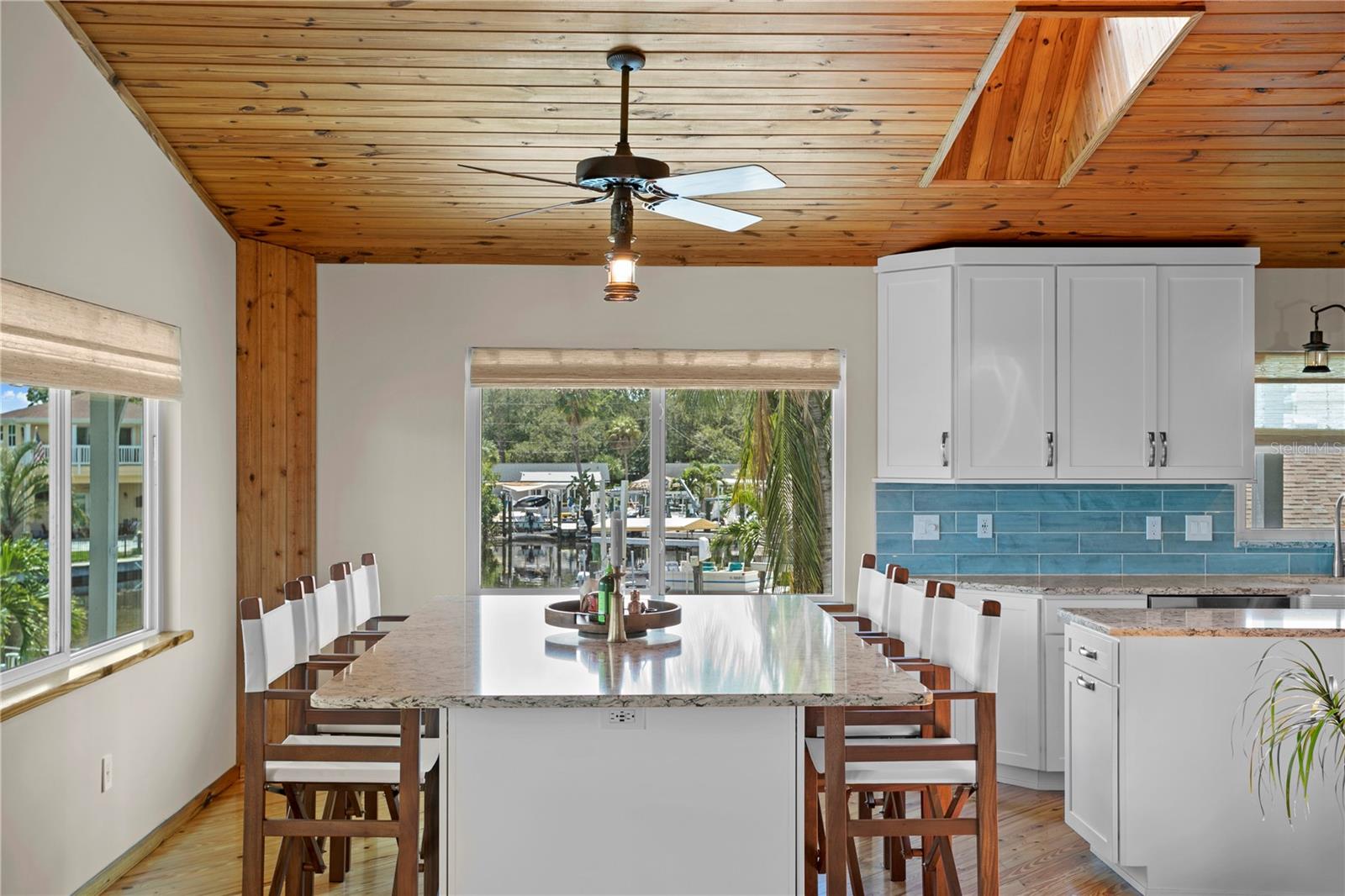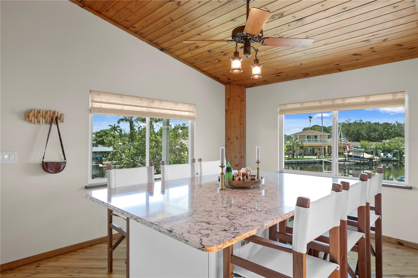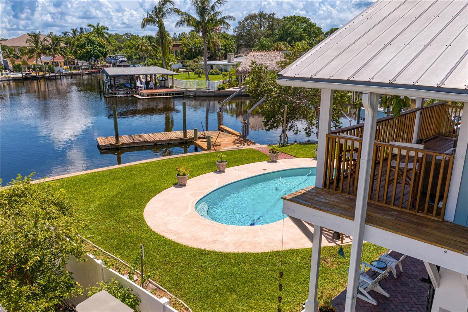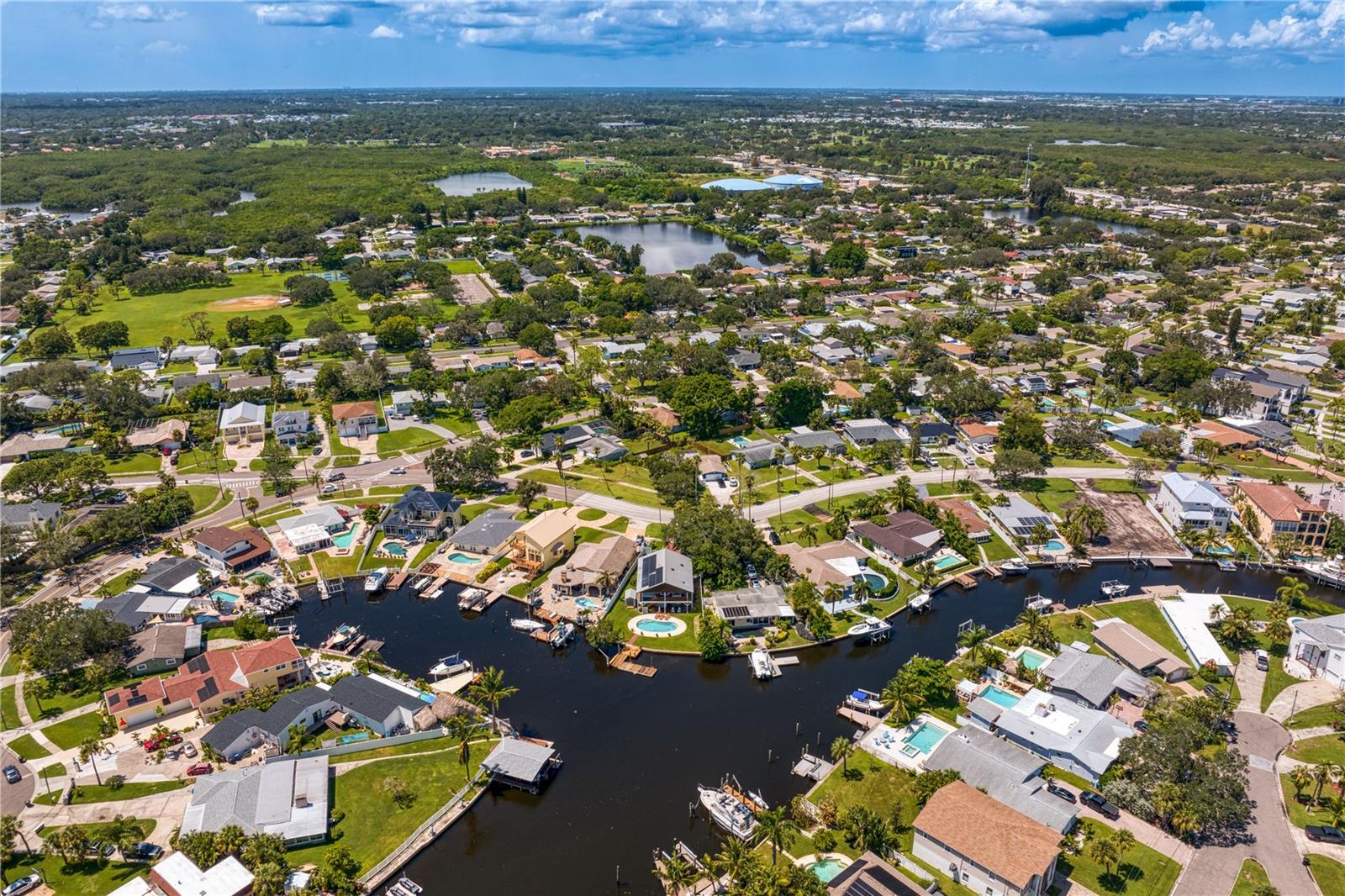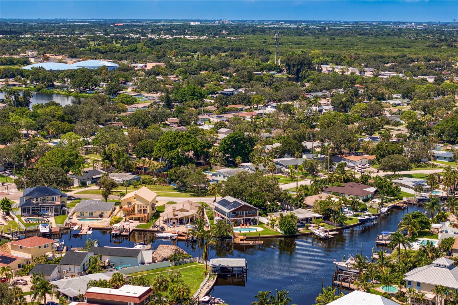 This home withstood both Hurricane Helene and Hurricane Milton with very minimal damage to the storage room on first floor. The main living floor of the home was undamaged in either storm….one more benefit of being built up above most of their neighbors in Shore Acres. What an amazing opportunity to make that dream of waterfront living a reality! This prime Shore Acres location provides a perfect launch for boating enthusiasts with 85 feet of waterfront footage on a wide canal that gives you direct access to Tampa Bay. The uniqueness of this property is what makes it so special. The home is wisely built 12 feet above base flood elevation, giving you endless views and eliminating the worry of flooding. You’ll love waking up to sunrises to the East and sunsets that will drench your home with that magic hour glow. Two bedrooms and two full baths give you everything you may be looking for in a lower maintenance property with all the amenities that come with large waterfront living. The sunny and inviting pool is the ideal backdrop for friends and family to gather on one of Shore Acres best lots. The situation on the canal provides added distance from your neighbors and an increased level of privacy. Open living spaces indoors make the efficient square footage feel even larger than it is. You’ll be charmed by the warmth of the home and the ease of lifestyle that comes with it. Warm knotty hardwood floors throughout, and stunning paneled ceilings contribute to the ambiance within. The newer renovated kitchen features solid wood cabinetry, upgraded stainless appliances, a gorgeous tile backsplash and stunning granite counters. The first level of the home includes a recently remodeled office or utility room with great storage space. Solar panels on the newer roof make monthly bills a breeze. Pull up to your home, put your toes in the water, and get ready to fall in love.