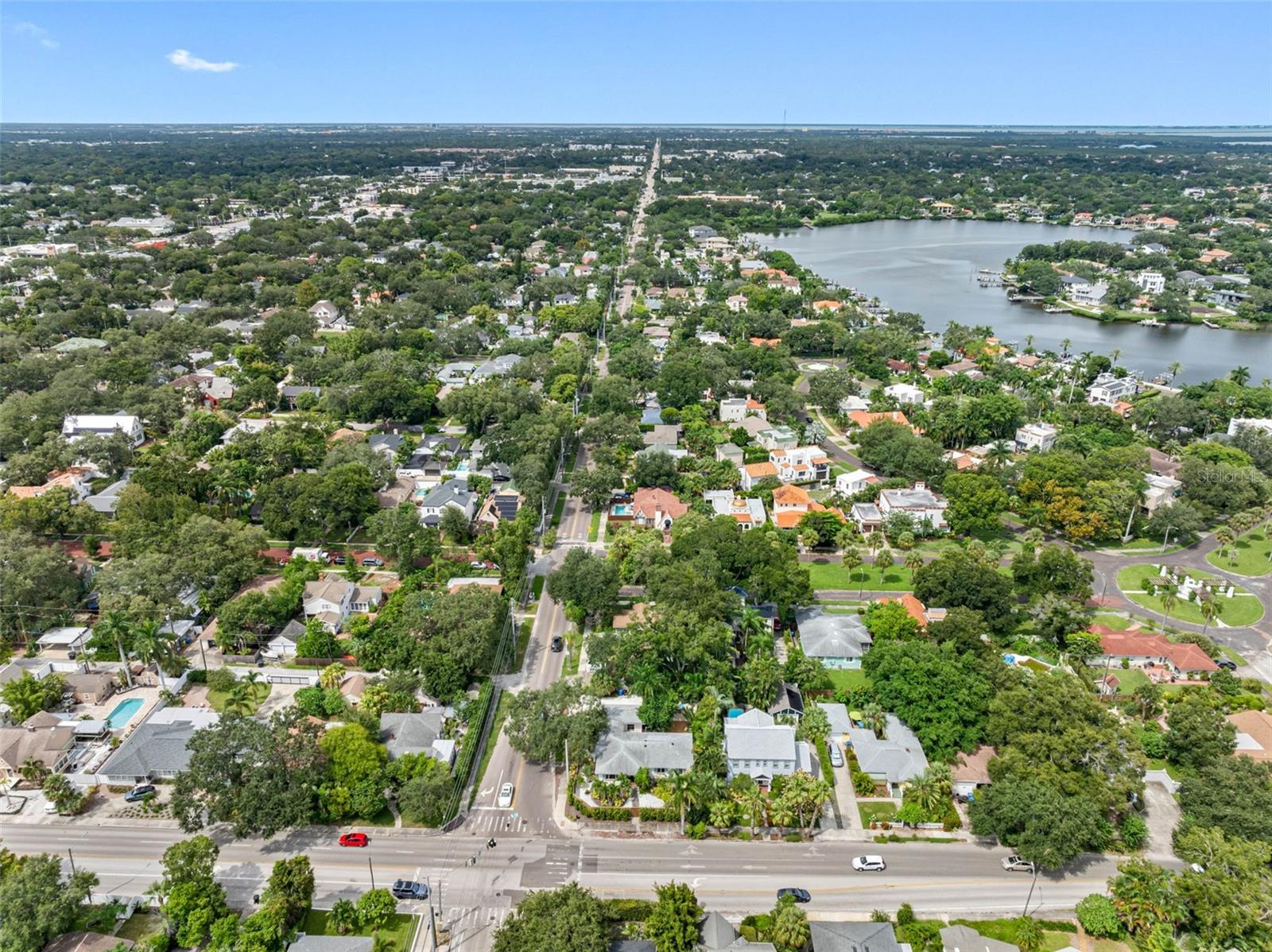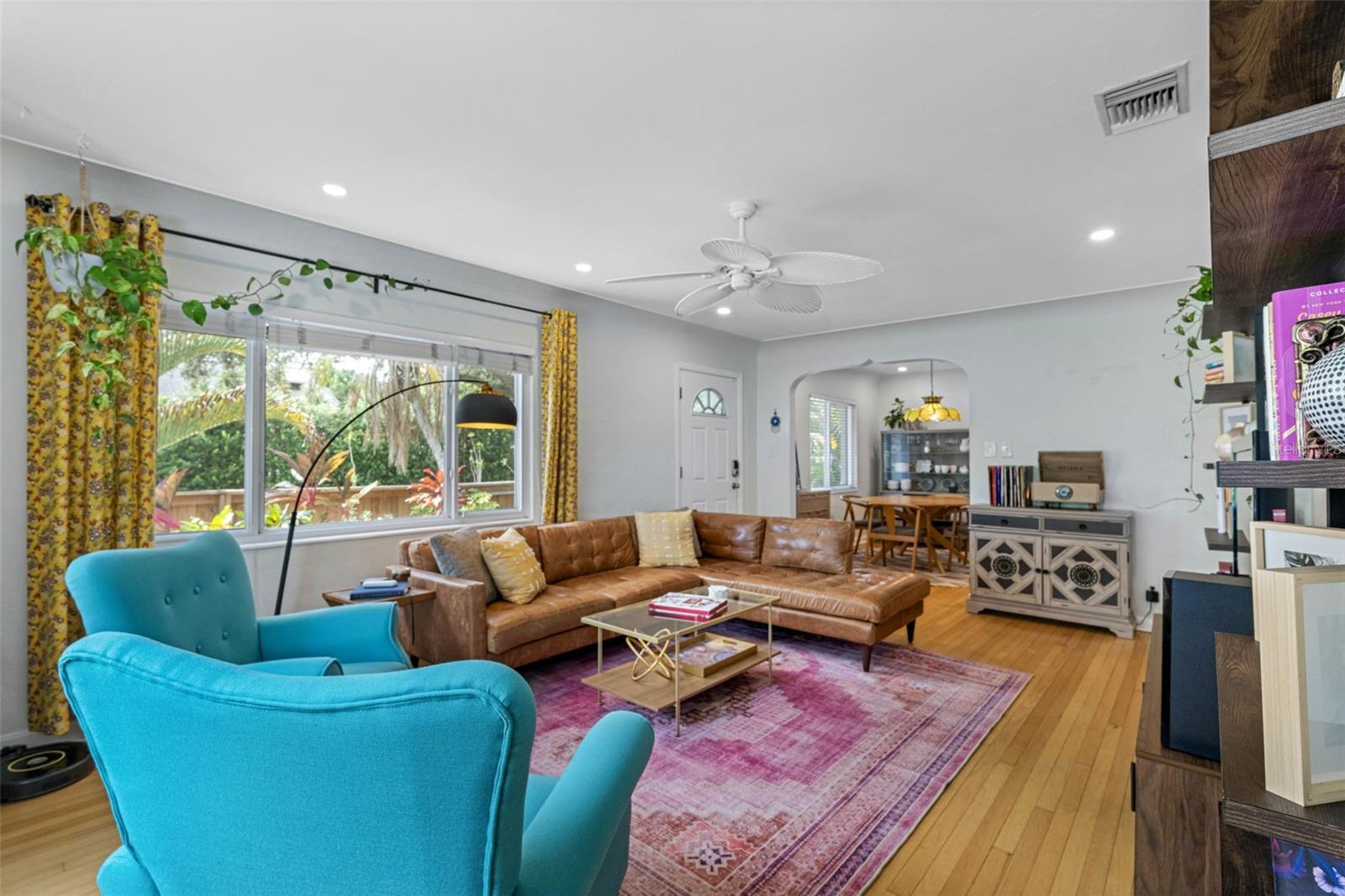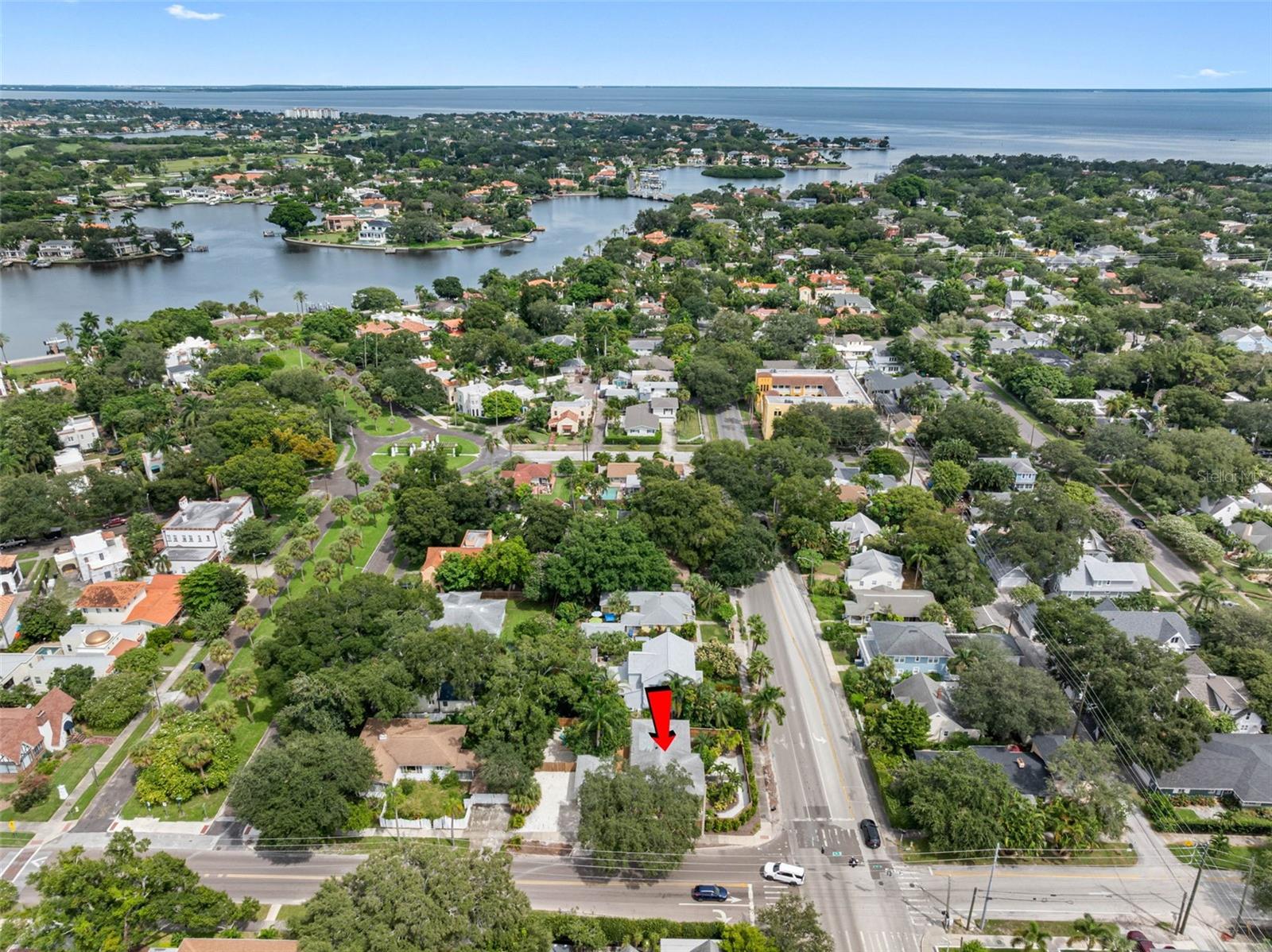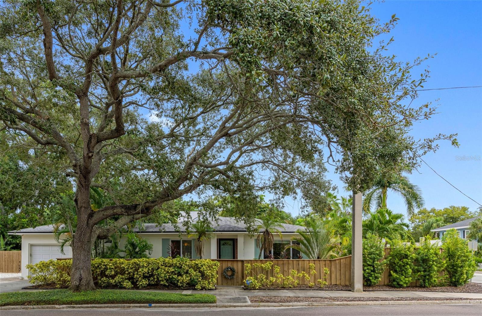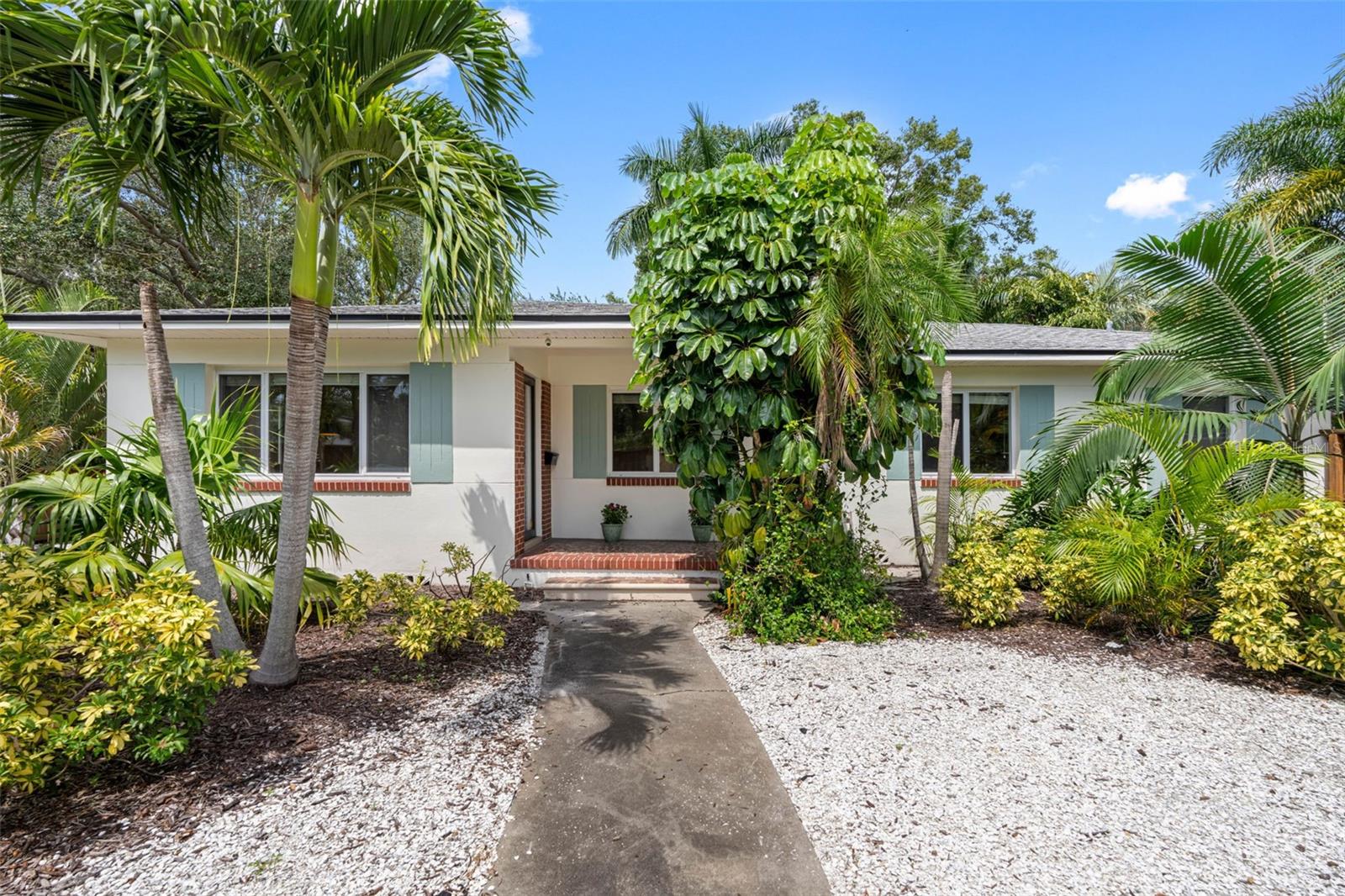 **HOUSE DID NOT FLOOD** Welcome to your mid-century modern home in Historic Old Northeast, St. Petersburg, FL, blending the historic charm of the 1950s with today's modern conveniences. This gorgeous 3-bedroom, 2-bathroom house is situated on a corner lot, enclosed by a wooden privacy fence, creating a private tropical oasis with lush landscaping, mature palm trees, and vibrant shrubbery. The property features terrazzo-tiled porches, a low-maintenance xeriscaped yard, and a versatile backyard with a large deck ideal for gatherings or a future pool. Inside, the home boasts hardwood flooring throughout, an open floor plan, and large windows adorned with custom drapery that illuminate the space with natural light. The updated kitchen is a cook’s dream with new quartz countertops, stylish backsplash, updated cabinets, a stainless steel dishwasher, and a gas four-burner range. The dining nook, featuring a charming blend of modern and vintage elements with an eye-catching new antique light fixture, leads directly into the sunroom, perfect for relaxing and offering access to the expansive deck for your morning coffee. The home’s unique character is highlighted by elegant arched openings that enhance the mid-century vibe, and striking botanical-themed wallpaper that adds sophistication to the hallway. The dinette area extends into a Florida room featuring a striking terrazzo floor and practical sliding doors that open to the backyard, enhancing the indoor-outdoor flow. The primary bedroom offers a walk-in closet, a remodeled ensuite with dual vanities and a walk-in shower, and private access to the patio, perfect for enjoying the outdoors. Recent renovations include all new interior custom shaker doors that enhance the clean, modern aesthetic. Significant upgrades to the home include a fully encapsulated crawl space with a dehumidifier and sump pump to ensure a clean and dry environment beneath the house. The garage boasts epoxy flooring and custom shelving, along with power for an electric car charger. Custom spot lighting has been installed in the front and backyard, beautifully illuminating the palm trees and landscaping at night, creating a stunning visual effect. Situated just blocks from Coffee Pot Bayou, the home is ideally located close to waterfront parks, downtown St. Petersburg, museums, restaurants, and shopping areas. The neighborhood is known for its preserved architecture and access to highly regarded schools, making it a prime location for both leisure and educational opportunities. Additional features include a one-car garage, driveway space for three vehicles, and a side gate to store a boat or RV. This mid-century home is move-in ready and located in a vibrant area perfect for enjoying Florida's lifestyle, with nearby access to kayaking, biking, and the Vinoy Resort Golf Club. Experience spectacular views from the St. Pete Pier and enjoy cultural outings like visiting The Dali Museum or watching a Rays game at Tropicana Field. A few minute's walk to Tampa Bay waterfront and 15 minutes drive to the Gulf of Mexico beaches. Call today to make this exceptional property your home!