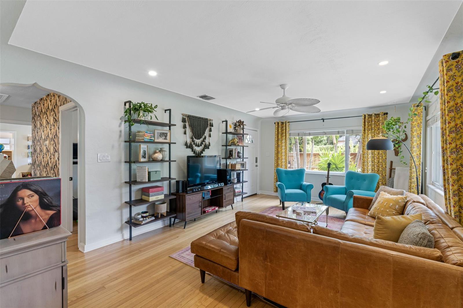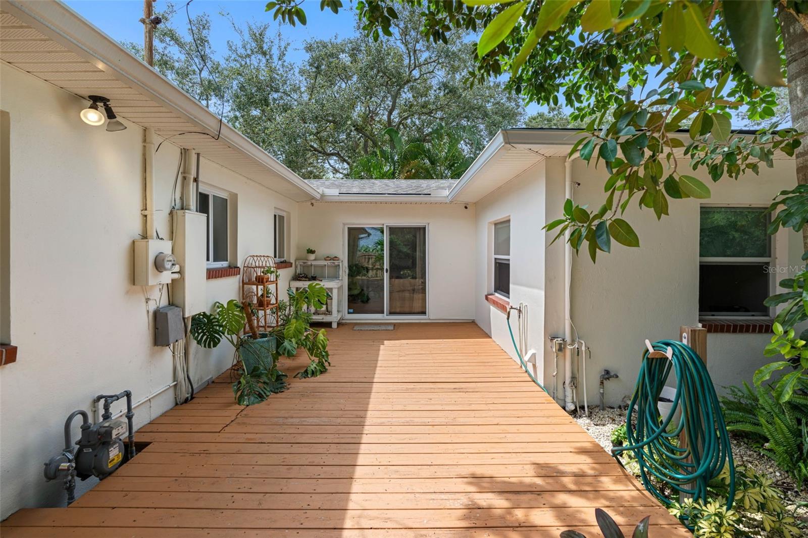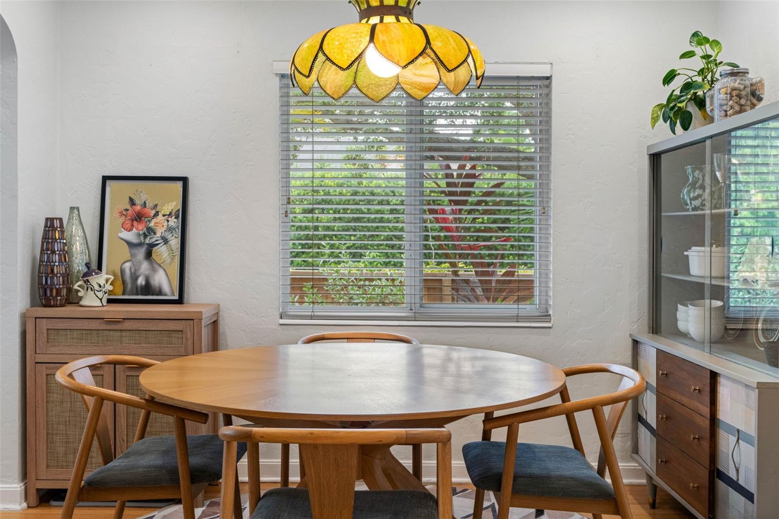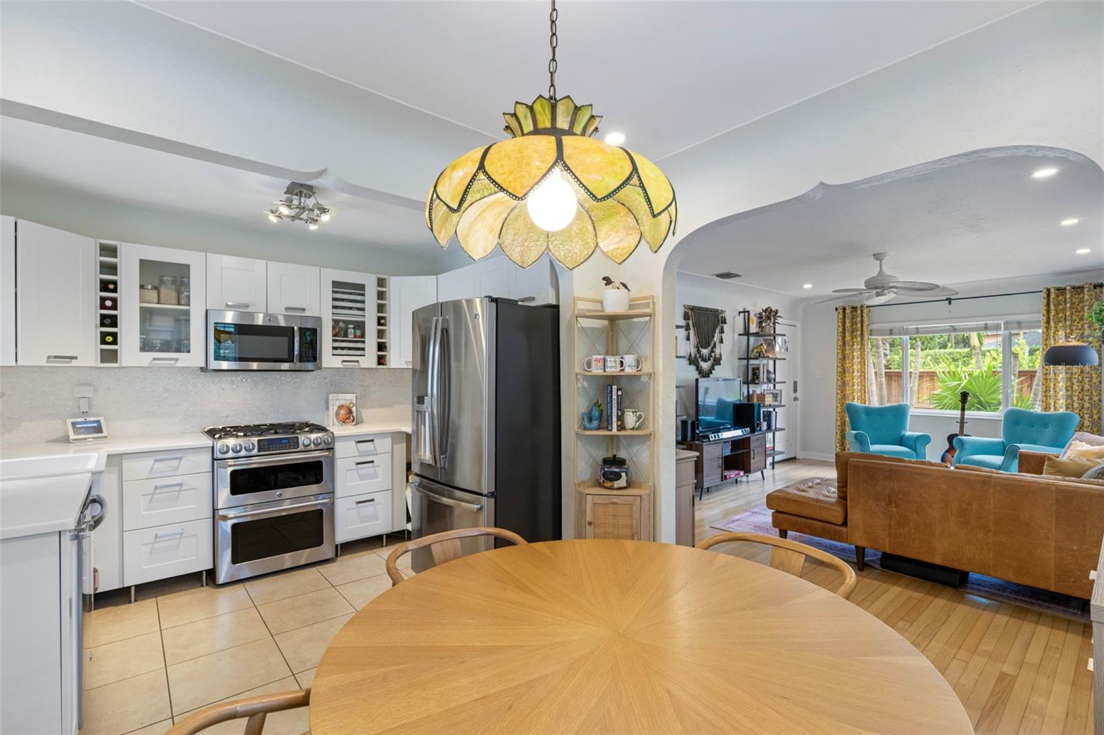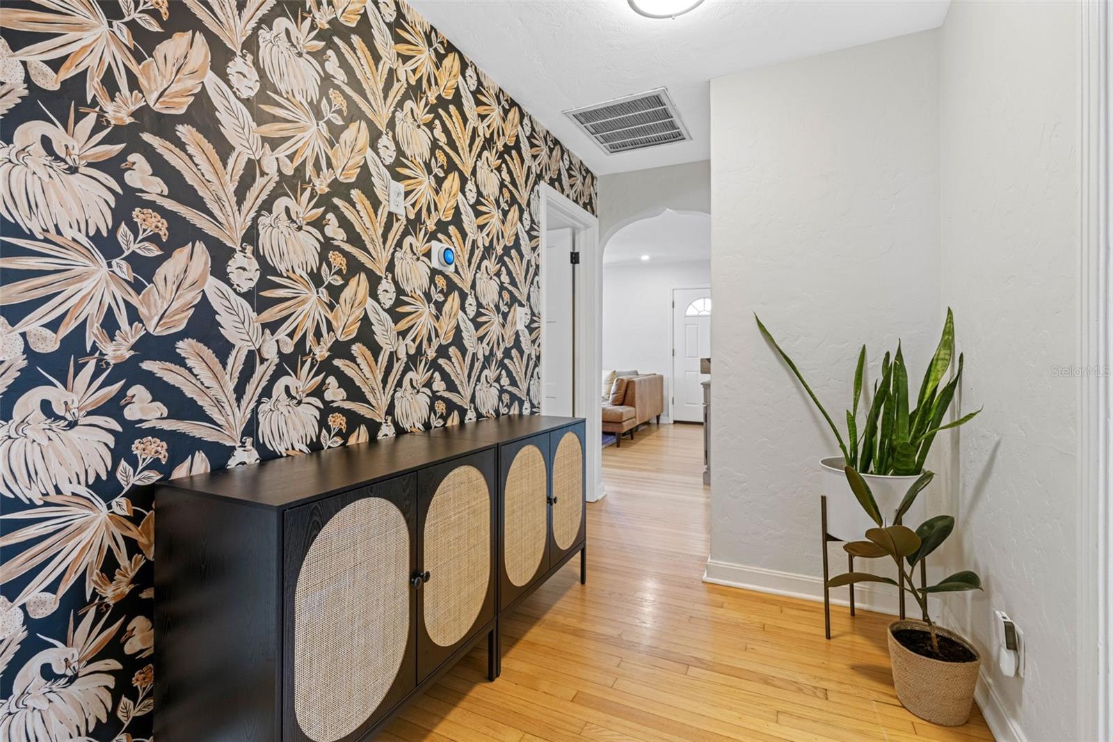 **HOUSE DID NOT FLOOD** Welcome to your mid-century modern home in Historic Old Northeast, St. Petersburg, FL, blending the historic charm of the 1950s with today's modern conveniences. This gorgeous 3-bedroom, 2-bathroom house is situated on a corner lot, enclosed by a wooden privacy fence, creating a private tropical oasis with lush landscaping, mature palm trees, and vibrant shrubbery. The property features terrazzo-tiled porches, a low-maintenance xeriscaped yard, and a versatile backyard with a large deck ideal for gatherings or a future pool. Inside, the home boasts hardwood flooring throughout, an open floor plan, and large windows adorned with custom drapery that illuminate the space with natural light. The updated kitchen is a cook’s dream with new quartz countertops, stylish backsplash, updated cabinets, a stainless steel dishwasher, and a gas four-burner range. The dining nook, featuring a charming blend of modern and vintage elements with an eye-catching new antique light fixture, leads directly into the sunroom, perfect for relaxing and offering access to the expansive deck for your morning coffee. The home’s unique character is highlighted by elegant arched openings that enhance the mid-century vibe, and striking botanical-themed wallpaper that adds sophistication to the hallway. The dinette area extends into a Florida room featuring a striking terrazzo floor and practical sliding doors that open to the backyard, enhancing the indoor-outdoor flow. The primary bedroom offers a walk-in closet, a remodeled ensuite with dual vanities and a walk-in shower, and private access to the patio, perfect for enjoying the outdoors. Recent renovations include all new interior custom shaker doors that enhance the clean, modern aesthetic. Significant upgrades to the home include a fully encapsulated crawl space with a dehumidifier and sump pump to ensure a clean and dry environment beneath the house. The garage boasts epoxy flooring and custom shelving, along with power for an electric car charger. Custom spot lighting has been installed in the front and backyard, beautifully illuminating the palm trees and landscaping at night, creating a stunning visual effect. Situated just blocks from Coffee Pot Bayou, the home is ideally located close to waterfront parks, downtown St. Petersburg, museums, restaurants, and shopping areas. The neighborhood is known for its preserved architecture and access to highly regarded schools, making it a prime location for both leisure and educational opportunities. Additional features include a one-car garage, driveway space for three vehicles, and a side gate to store a boat or RV. This mid-century home is move-in ready and located in a vibrant area perfect for enjoying Florida's lifestyle, with nearby access to kayaking, biking, and the Vinoy Resort Golf Club. Experience spectacular views from the St. Pete Pier and enjoy cultural outings like visiting The Dali Museum or watching a Rays game at Tropicana Field. A few minute's walk to Tampa Bay waterfront and 15 minutes drive to the Gulf of Mexico beaches. Call today to make this exceptional property your home!