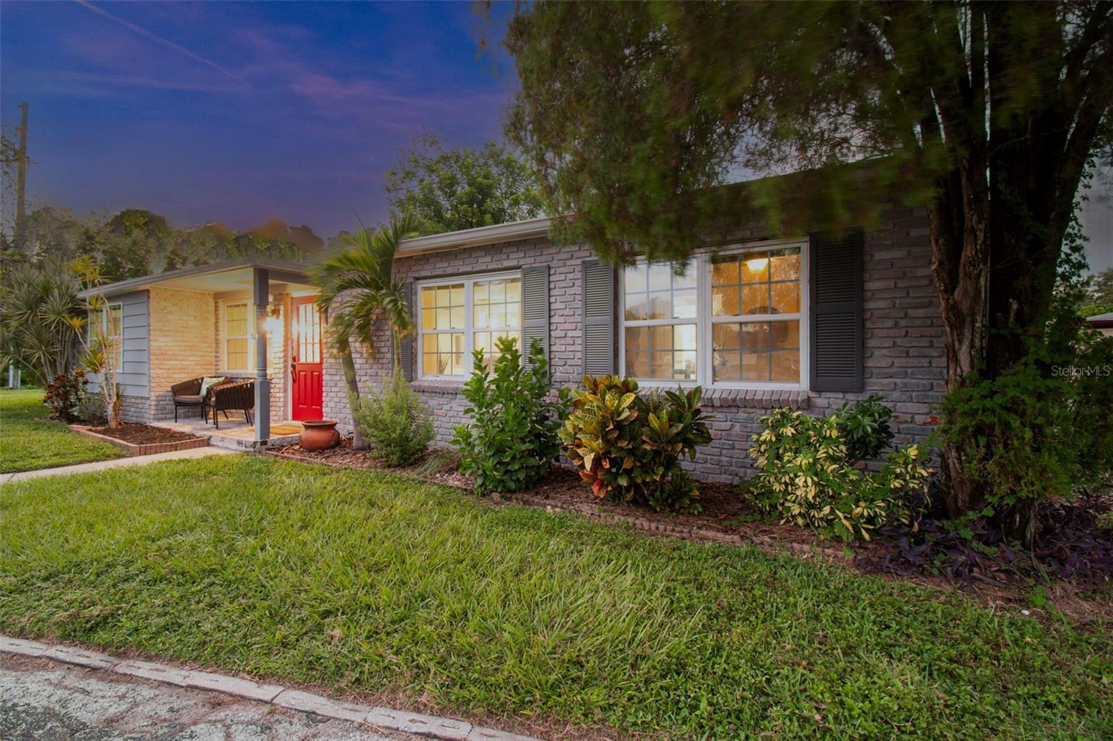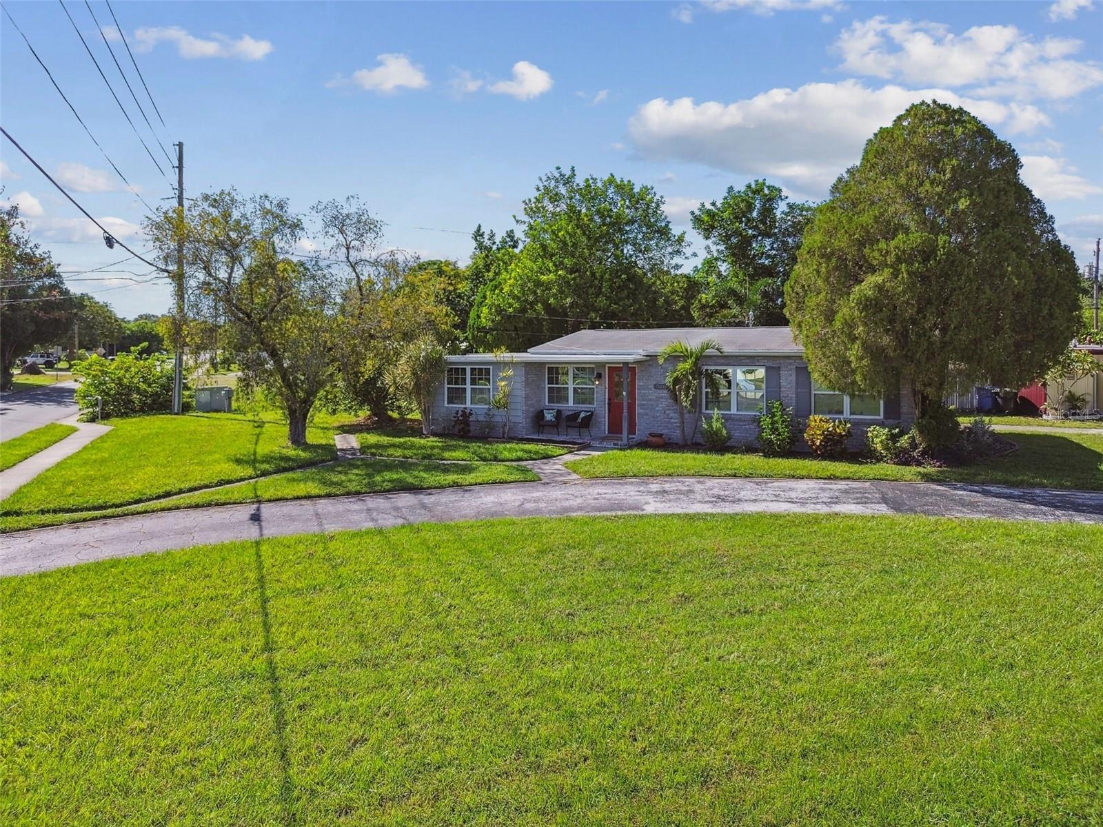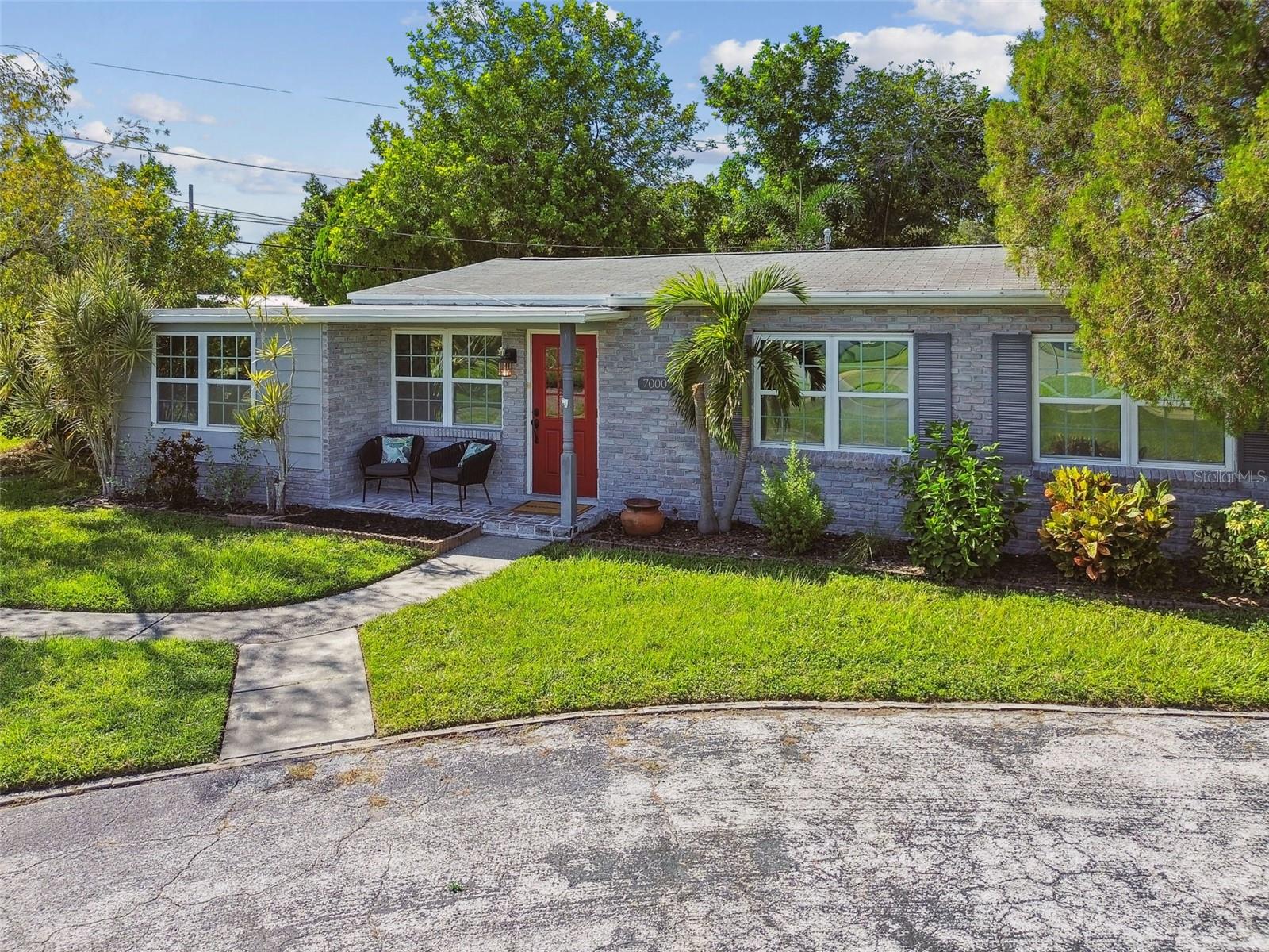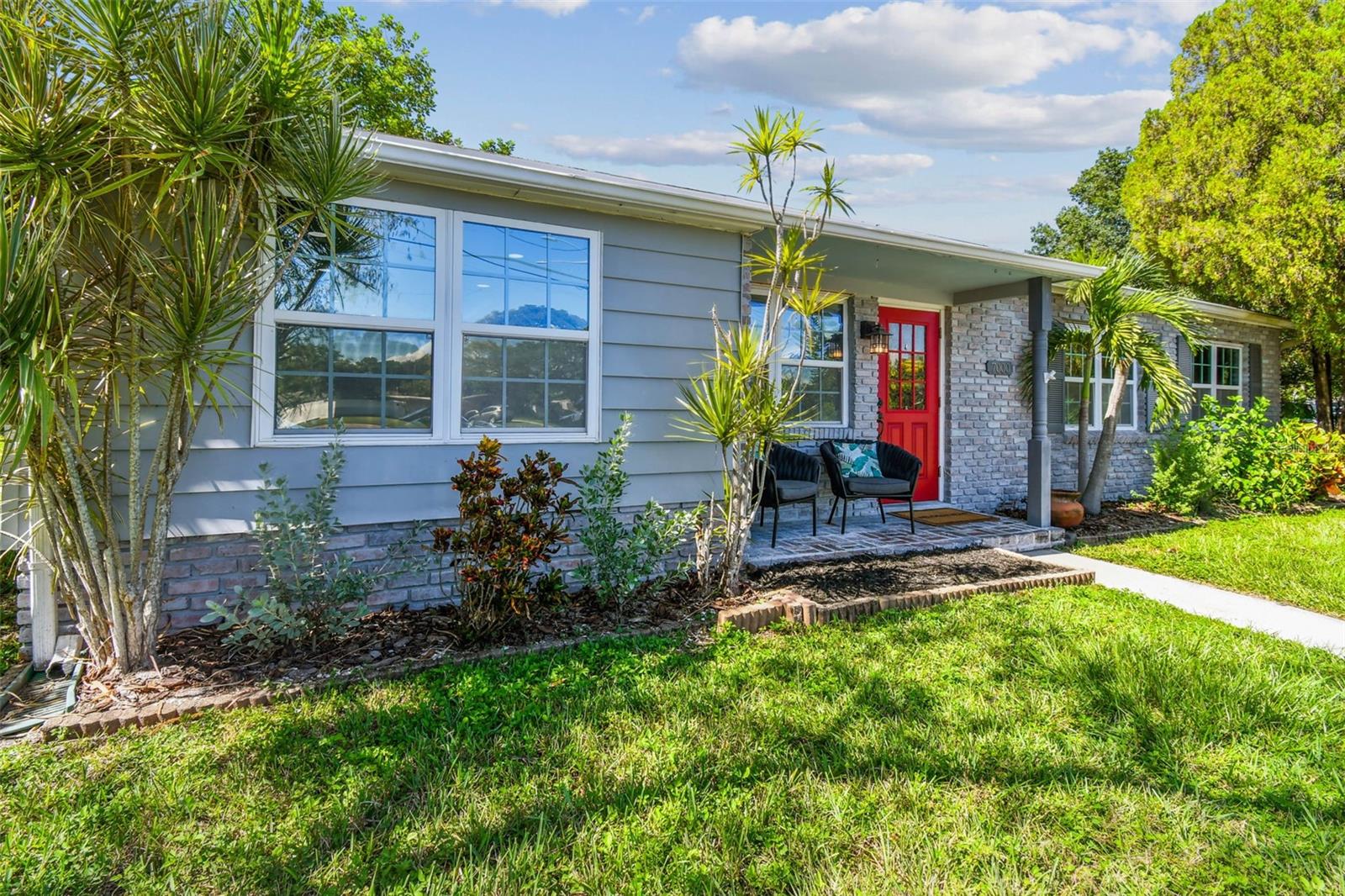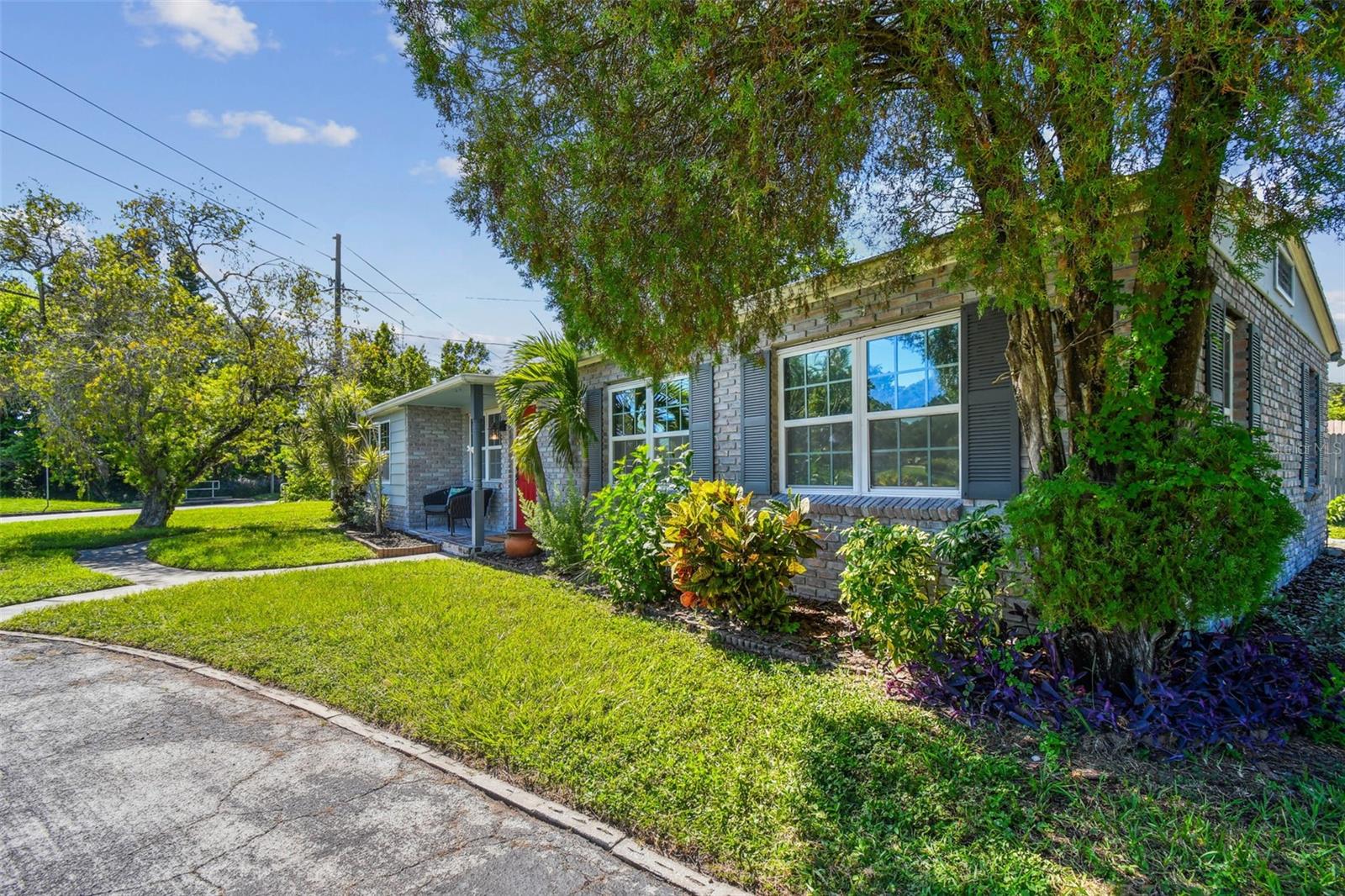 Tucked away on an expansive corner lot (96x100), this delightful home offers a blend of character and modern comfort. The charming brick exterior of this 1953 home invites you inside, where a bright and airy split/open floor plan awaits. The open layout includes a cozy living room perfect for intimate gatherings along with a sprawling, multi-purpose family room that can be used as a second living area, office space, or can be converted into a 4th bedroom/guest space. The kitchen is designed for function and style, with quartz countertops and plenty of counter space and storage space for all your cooking needs. The dining area is conveniently situated between the kitchen and living room. The primary bedroom sits quietly on the left side of the split floorplan offering a peaceful retreat with plenty of closet space along with a private updated bathroom, while the two additional bedrooms and guest bath are positioned on the other side of the home for added privacy. The colonial-style windows bring in even more charm and highlight the natural light in the open living space. The enclosed porch in the back can be used for multiple purposes such as an inside/outside hangout space, home gym, workshop, additional storage, or a combination of all of these. You could even convert this space back into a carport. As you head into the backyard you'll be greeted by your own tropical retreat that offers plenty of shade with thriving palm palm trees and lush landscaping. The backyard also features a brick patio that sits right off the TV nook, perfect for enjoying outdoor entertainment under the shade—only a 15-minute drive to downtown St. Pete and within walking distance to Meadowlawn Park. Additional features include 2018 A/C system, a 2014 water heater, and a 2022 flat roof/2012 main roof. Schedule your showing today!