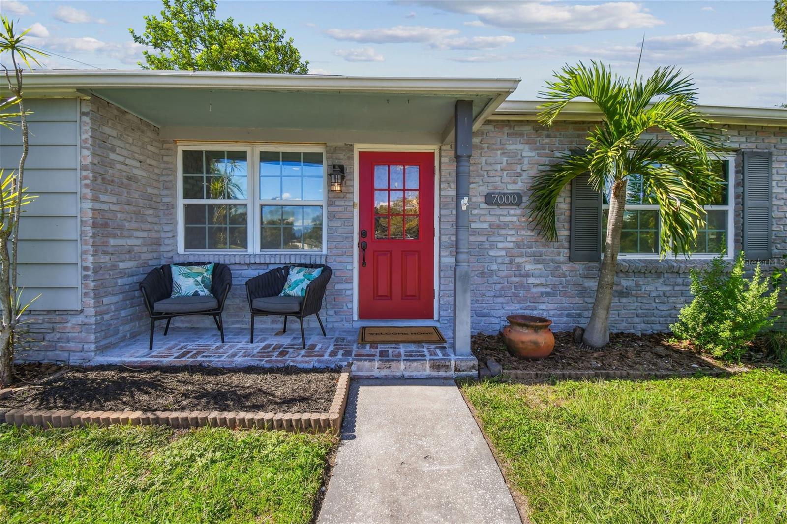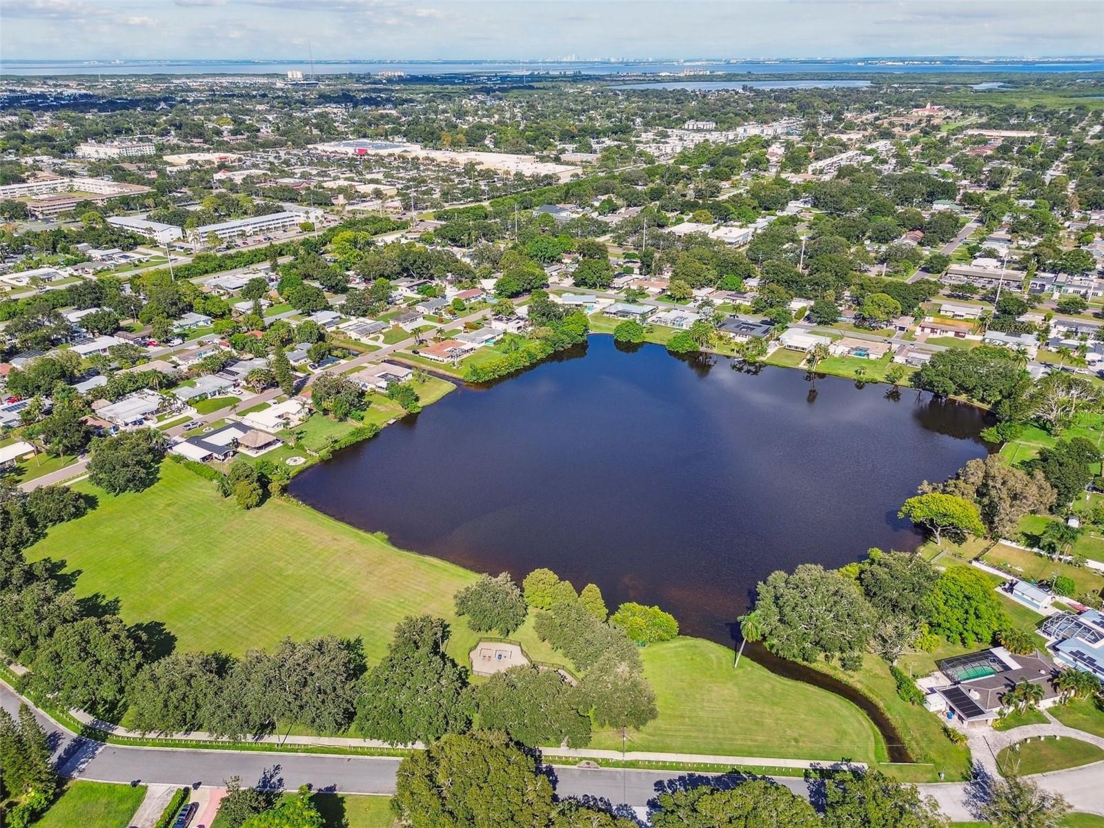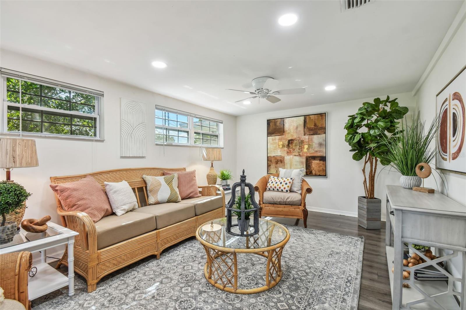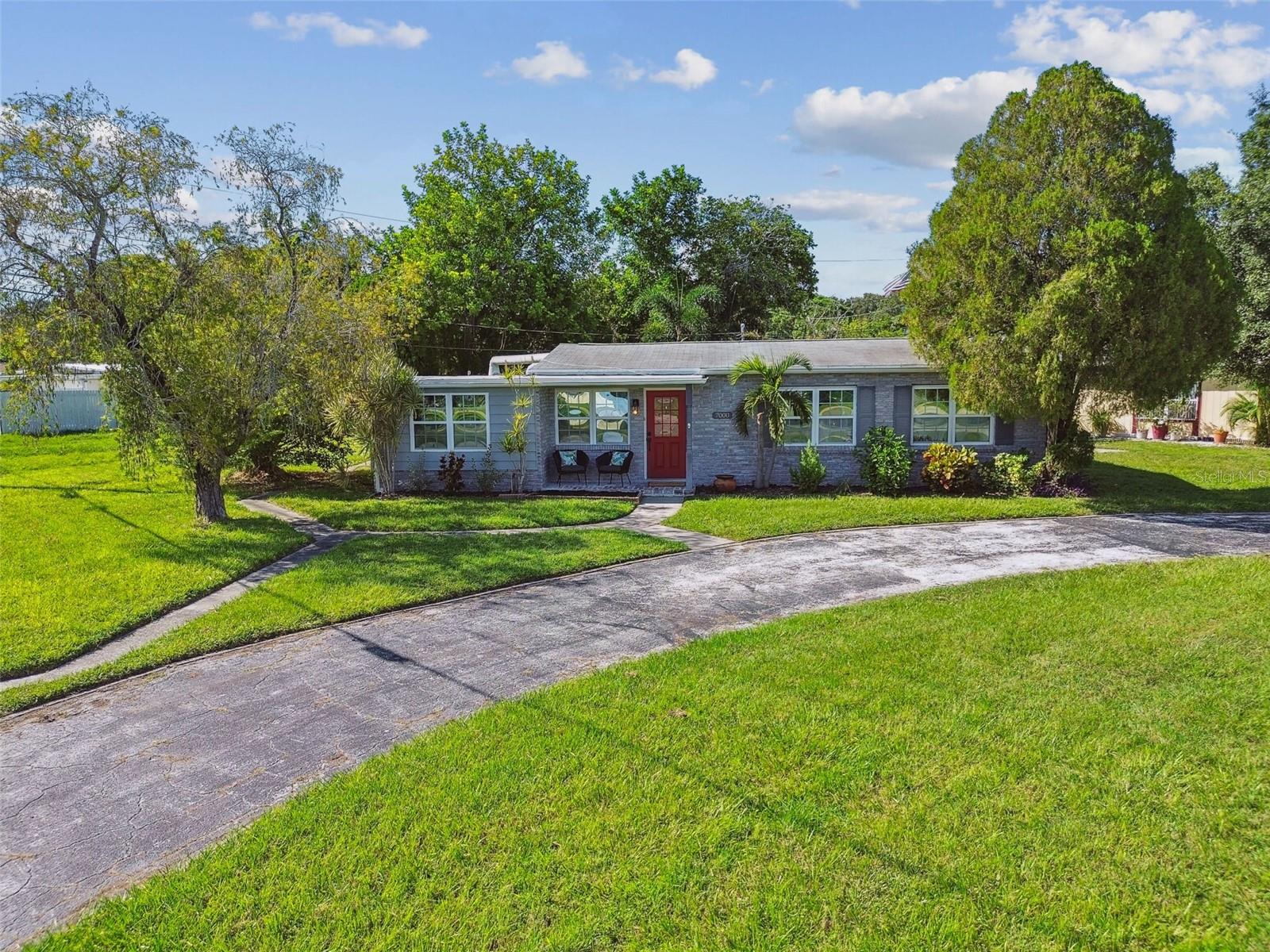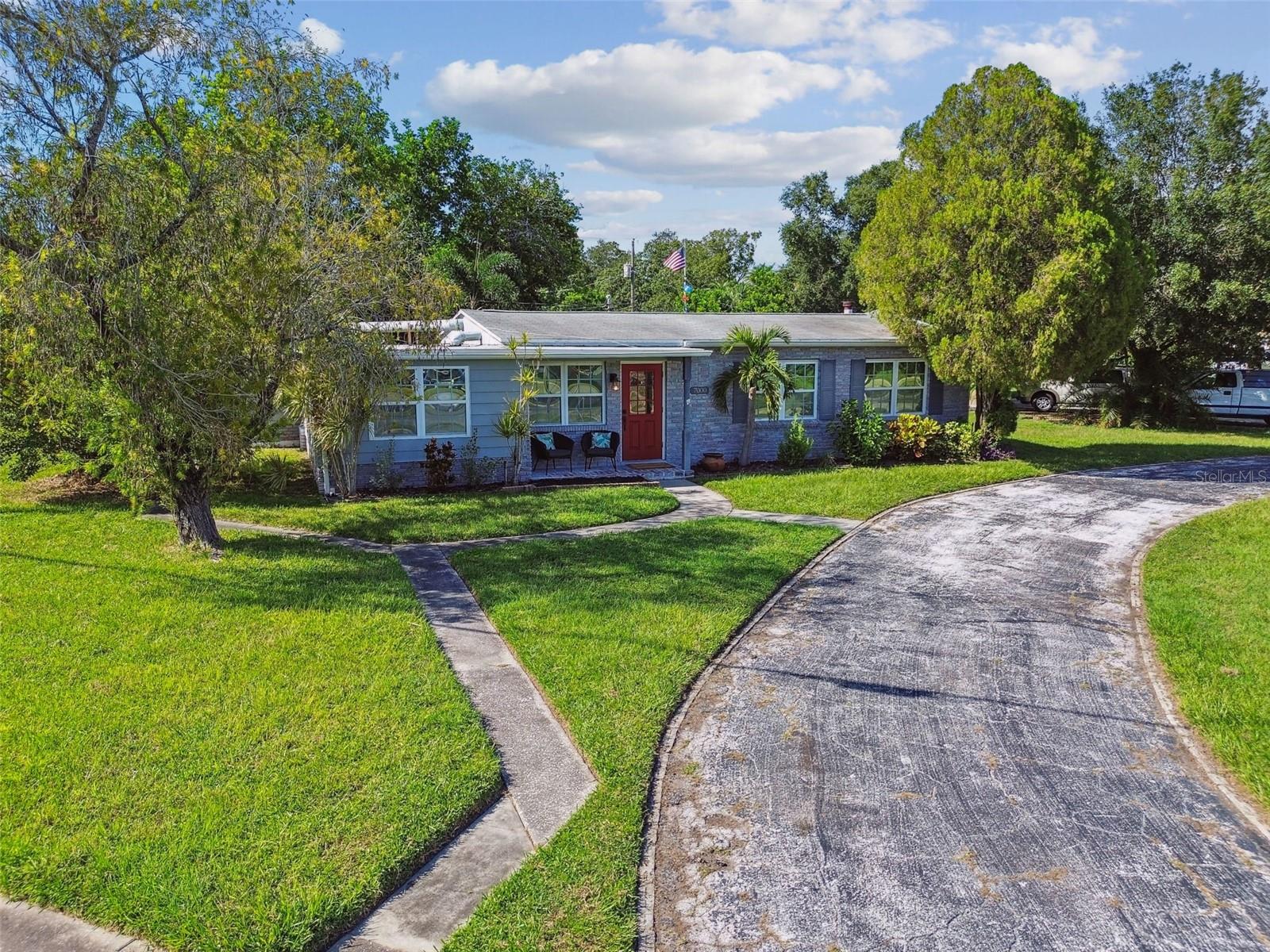 Tucked away on an expansive corner lot (96x100), this delightful home offers a blend of character and modern comfort. The charming brick exterior of this 1953 home invites you inside, where a bright and airy split/open floor plan awaits. The open layout includes a cozy living room perfect for intimate gatherings along with a sprawling, multi-purpose family room that can be used as a second living area, office space, or can be converted into a 4th bedroom/guest space. The kitchen is designed for function and style, with quartz countertops and plenty of counter space and storage space for all your cooking needs. The dining area is conveniently situated between the kitchen and living room. The primary bedroom sits quietly on the left side of the split floorplan offering a peaceful retreat with plenty of closet space along with a private updated bathroom, while the two additional bedrooms and guest bath are positioned on the other side of the home for added privacy. The colonial-style windows bring in even more charm and highlight the natural light in the open living space. The enclosed porch in the back can be used for multiple purposes such as an inside/outside hangout space, home gym, workshop, additional storage, or a combination of all of these. You could even convert this space back into a carport. As you head into the backyard you'll be greeted by your own tropical retreat that offers plenty of shade with thriving palm palm trees and lush landscaping. The backyard also features a brick patio that sits right off the TV nook, perfect for enjoying outdoor entertainment under the shade—only a 15-minute drive to downtown St. Pete and within walking distance to Meadowlawn Park. Additional features include 2018 A/C system, a 2014 water heater, and a 2022 flat roof/2012 main roof. Schedule your showing today!