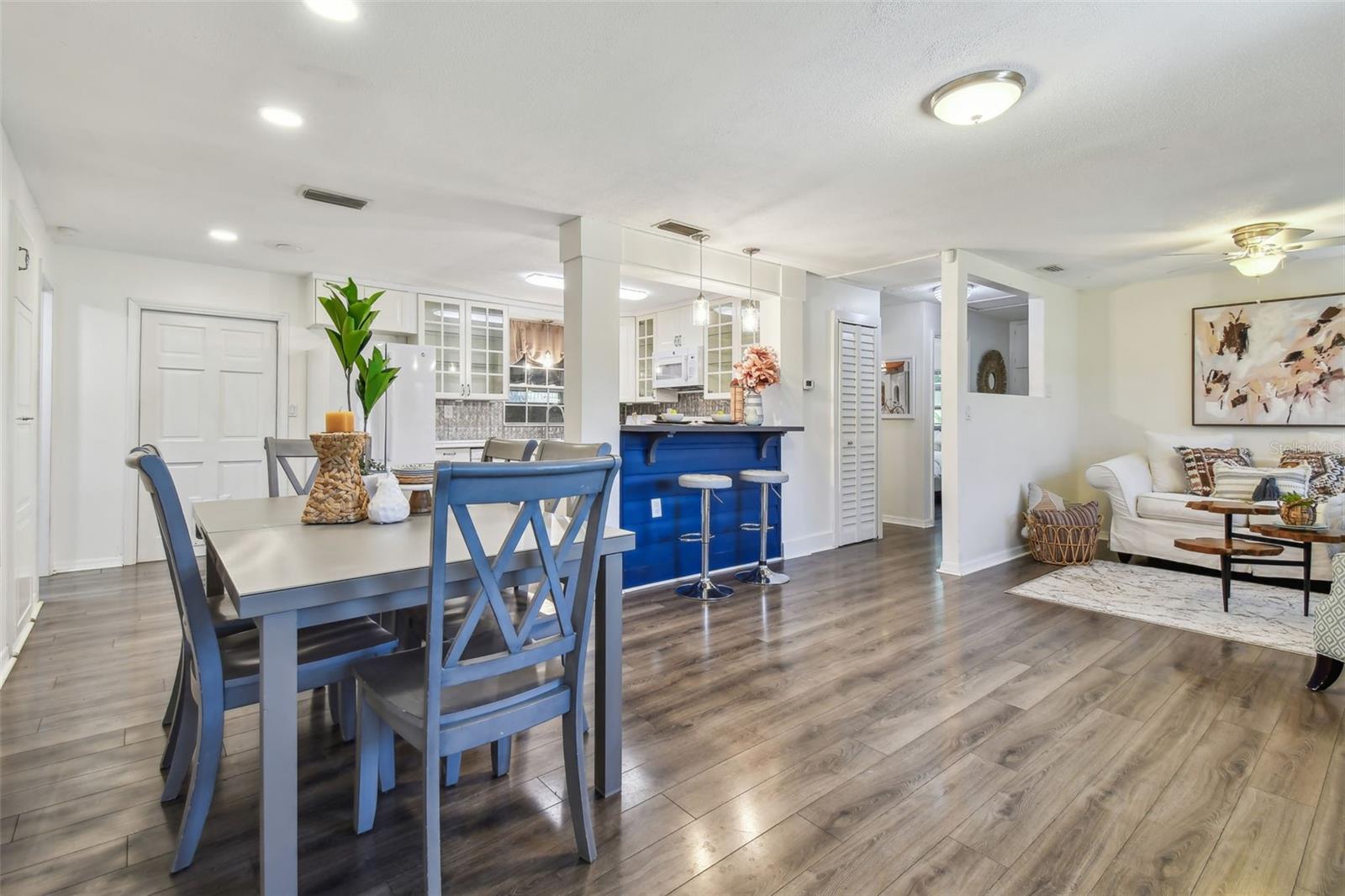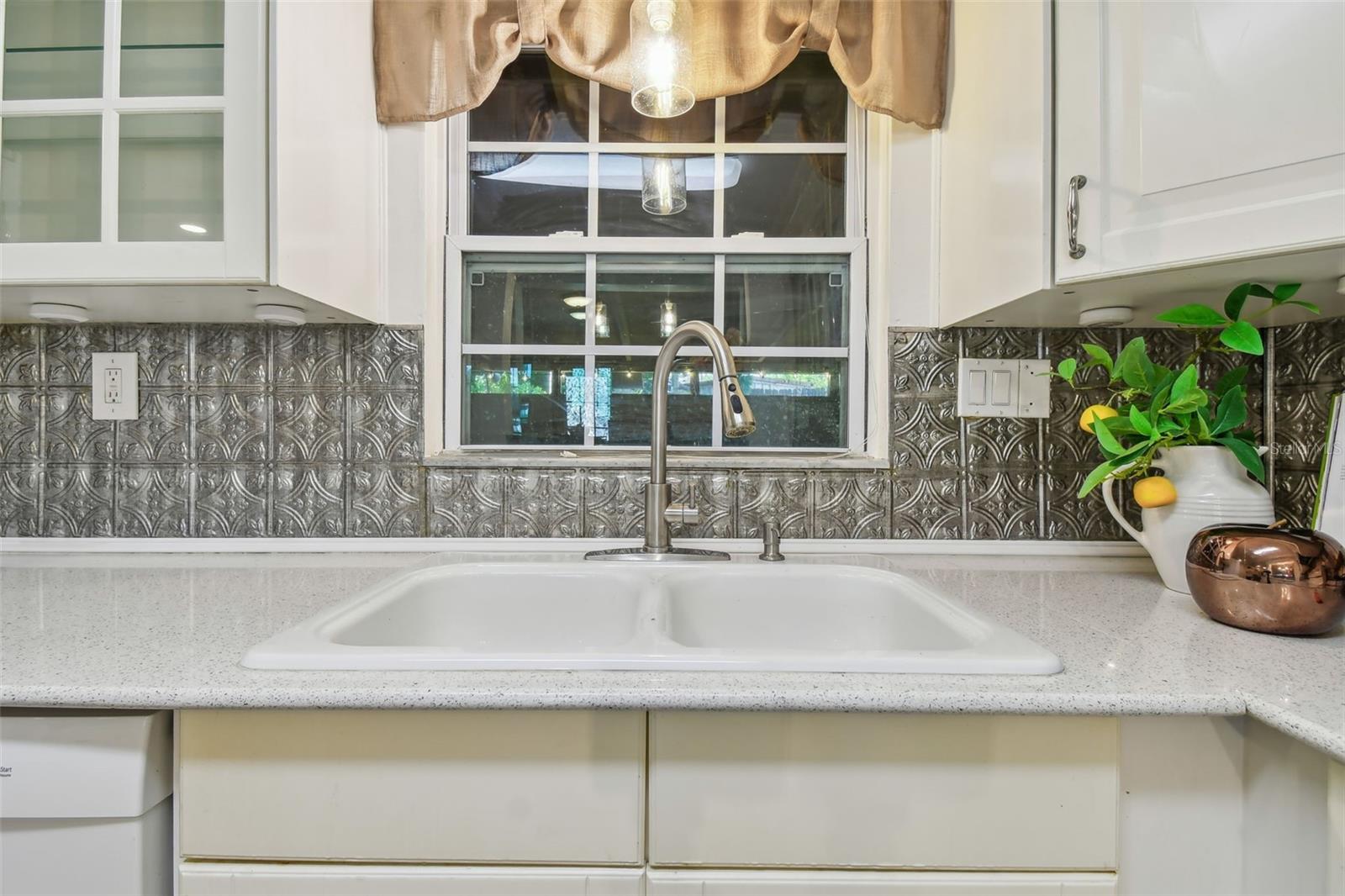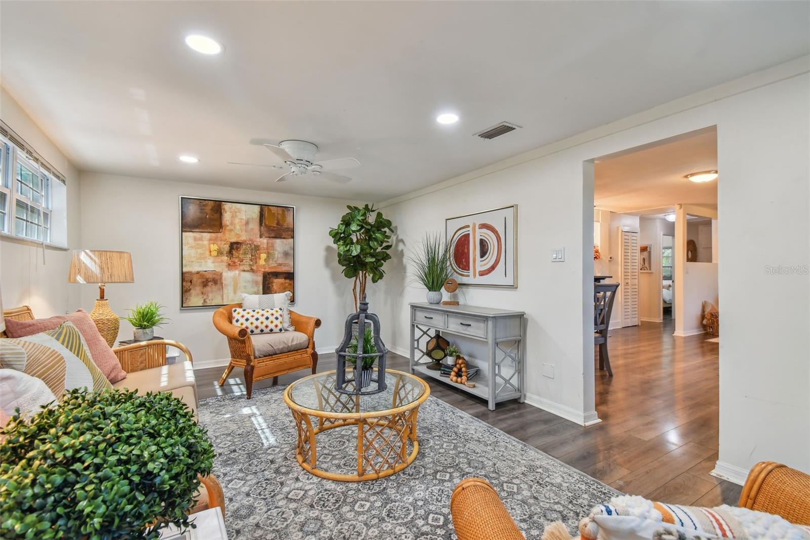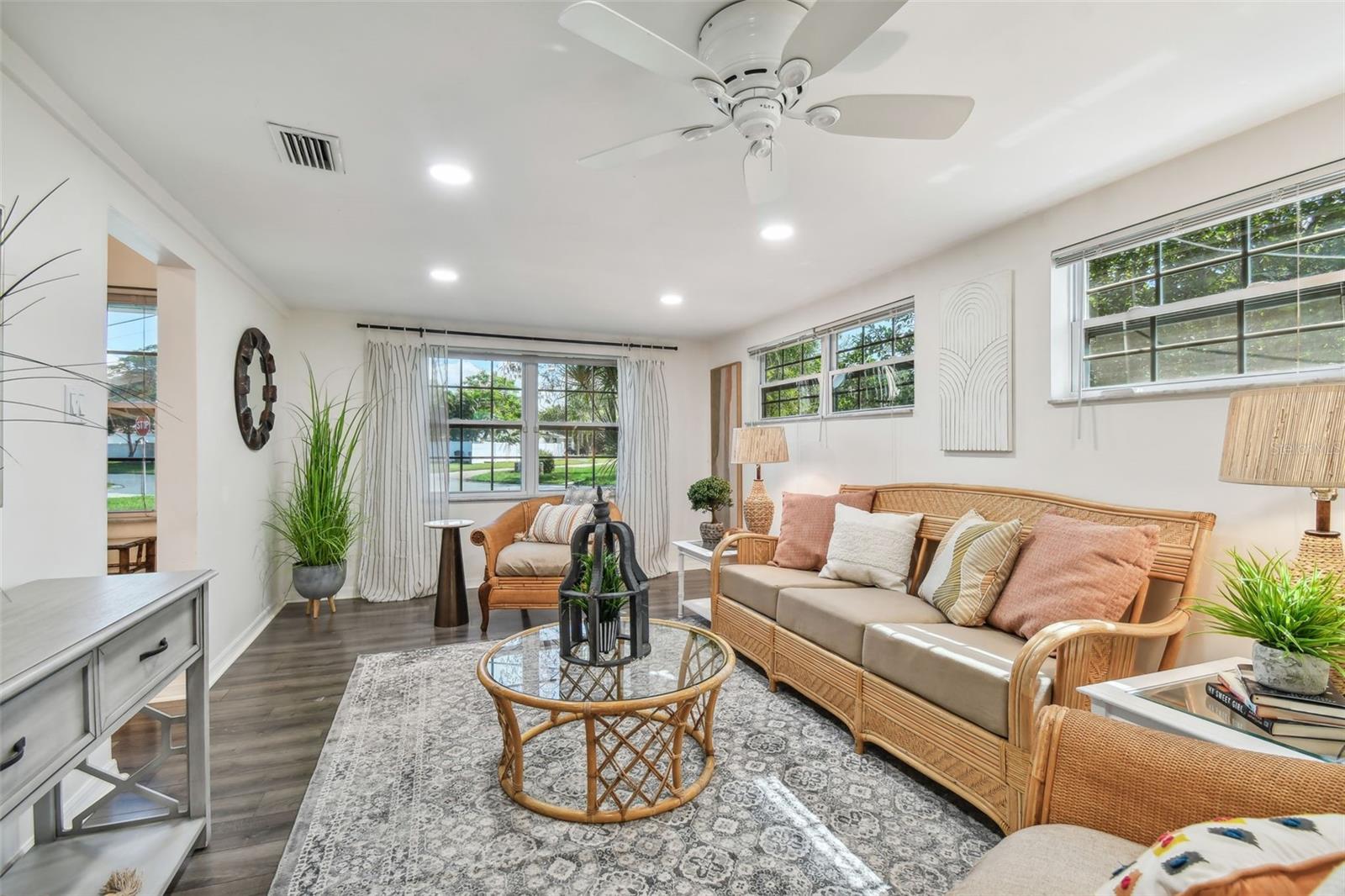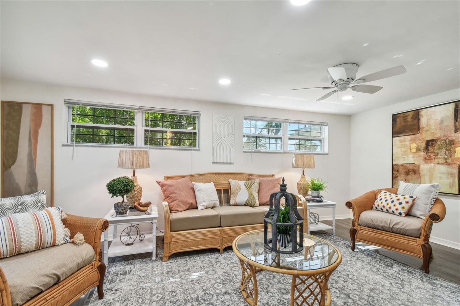 Tucked away on an expansive corner lot (96x100), this delightful home offers a blend of character and modern comfort. The charming brick exterior of this 1953 home invites you inside, where a bright and airy split/open floor plan awaits. The open layout includes a cozy living room perfect for intimate gatherings along with a sprawling, multi-purpose family room that can be used as a second living area, office space, or can be converted into a 4th bedroom/guest space. The kitchen is designed for function and style, with quartz countertops and plenty of counter space and storage space for all your cooking needs. The dining area is conveniently situated between the kitchen and living room. The primary bedroom sits quietly on the left side of the split floorplan offering a peaceful retreat with plenty of closet space along with a private updated bathroom, while the two additional bedrooms and guest bath are positioned on the other side of the home for added privacy. The colonial-style windows bring in even more charm and highlight the natural light in the open living space. The enclosed porch in the back can be used for multiple purposes such as an inside/outside hangout space, home gym, workshop, additional storage, or a combination of all of these. You could even convert this space back into a carport. As you head into the backyard you'll be greeted by your own tropical retreat that offers plenty of shade with thriving palm palm trees and lush landscaping. The backyard also features a brick patio that sits right off the TV nook, perfect for enjoying outdoor entertainment under the shade—only a 15-minute drive to downtown St. Pete and within walking distance to Meadowlawn Park. Additional features include 2018 A/C system, a 2014 water heater, and a 2022 flat roof/2012 main roof. Schedule your showing today!