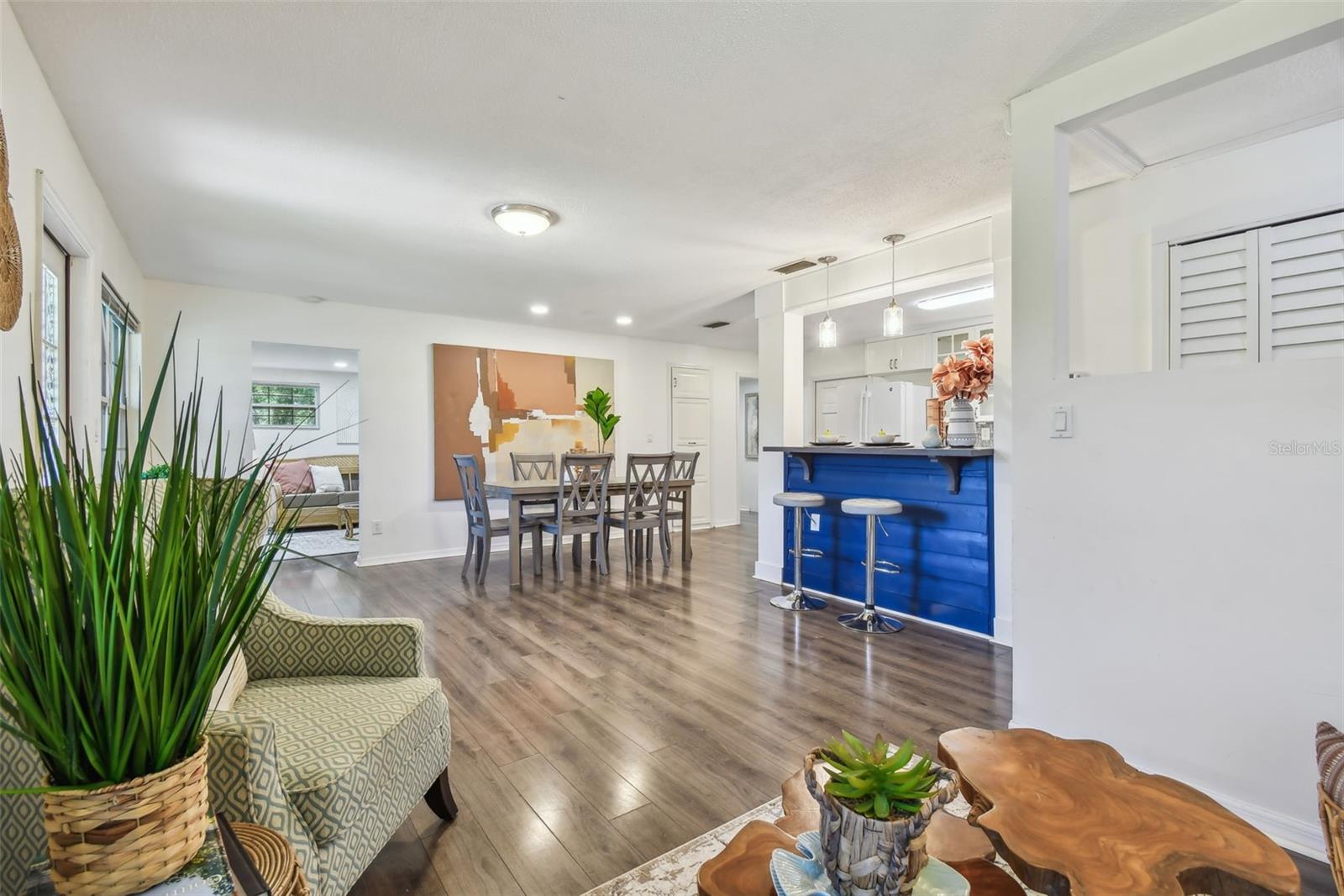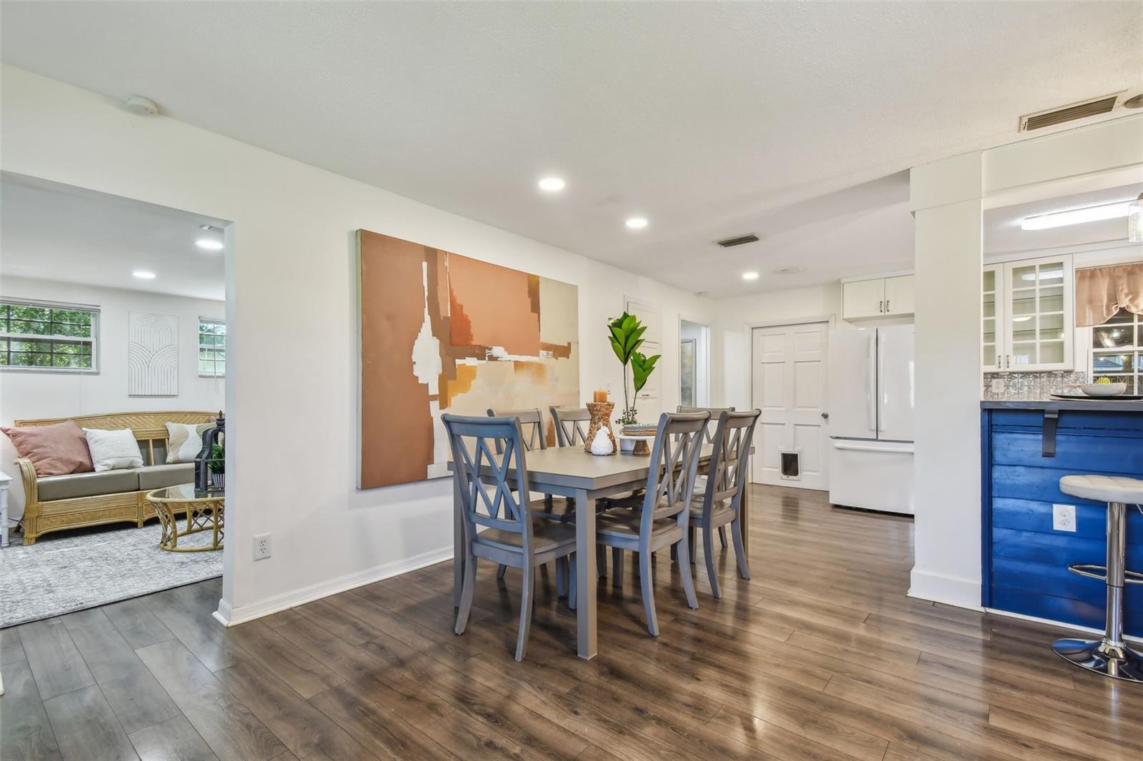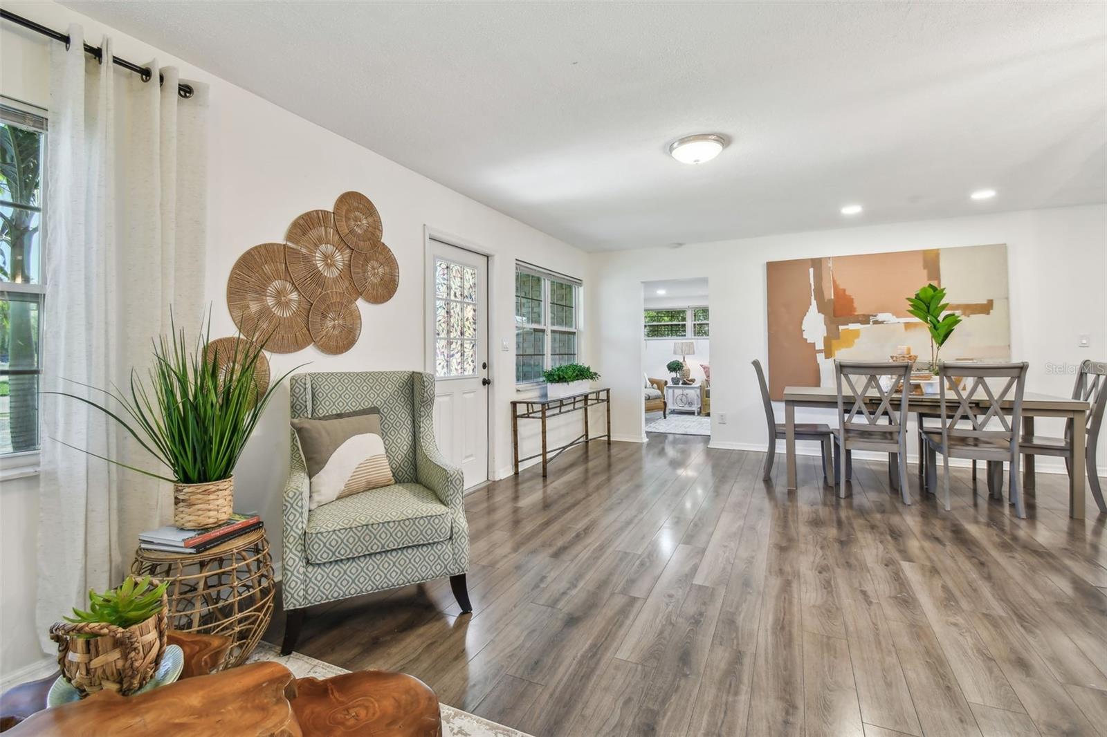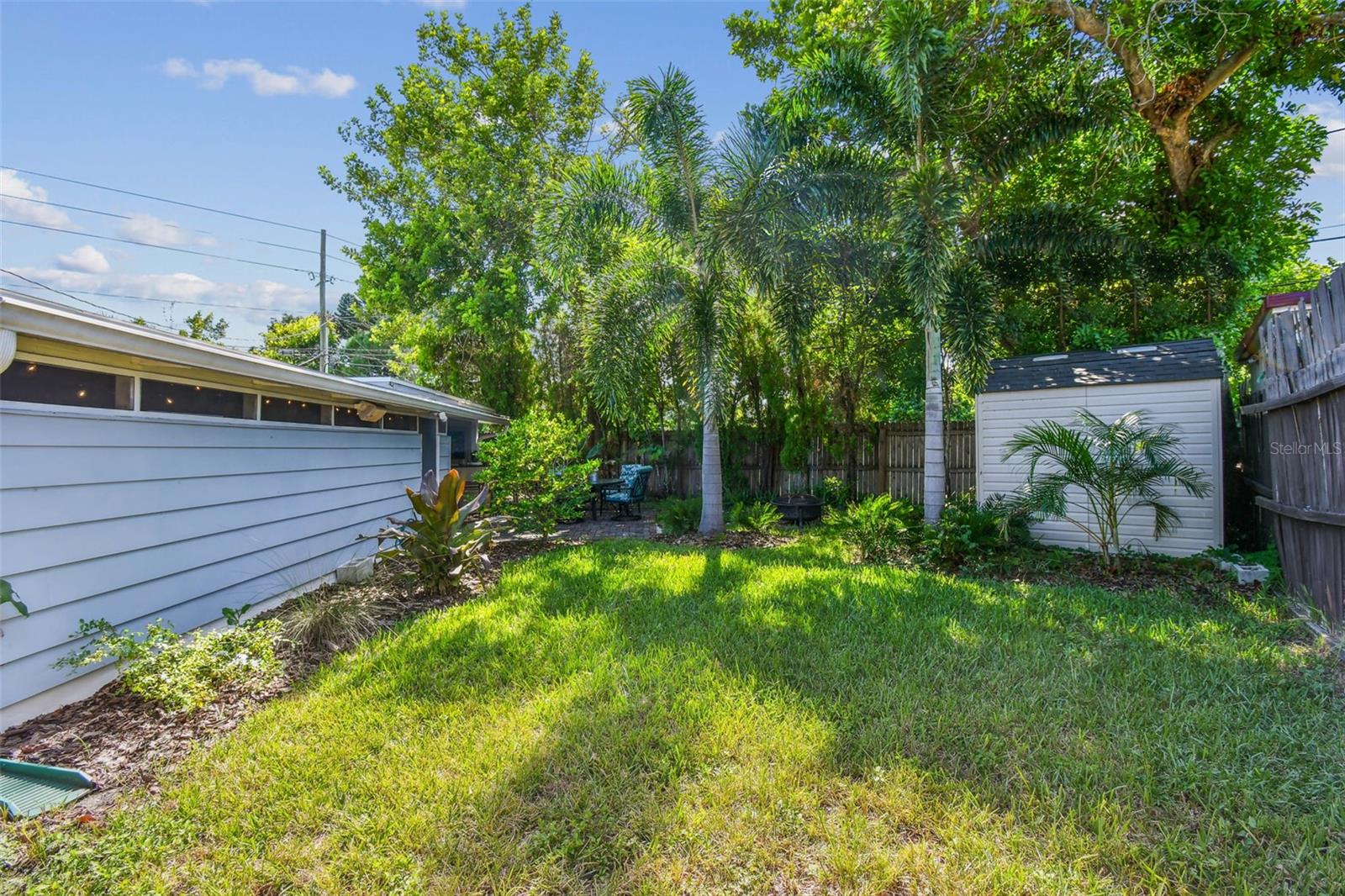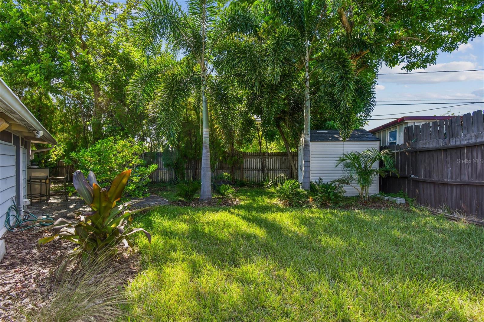Tucked away on an expansive corner lot (96x100), this delightful home offers a blend of character and modern comfort. The charming brick exterior of this 1953 home invites you inside, where a bright and airy split/open floor plan awaits. The open layout includes a cozy living room perfect for intimate gatherings along with a sprawling, multi-purpose family room that can be used as a second living area, office space, or can be converted into a 4th bedroom/guest space. The kitchen is designed for function and style, with quartz countertops and plenty of counter space and storage space for all your cooking needs. The dining area is conveniently situated between the kitchen and living room. The primary bedroom sits quietly on the left side of the split floorplan offering a peaceful retreat with plenty of closet space along with a private updated bathroom, while the two additional bedrooms and guest bath are positioned on the other side of the home for added privacy. The colonial-style windows bring in even more charm and highlight the natural light in the open living space. The enclosed porch in the back can be used for multiple purposes such as an inside/outside hangout space, home gym, workshop, additional storage, or a combination of all of these. You could even convert this space back into a carport. As you head into the backyard you'll be greeted by your own tropical retreat that offers plenty of shade with thriving palm palm trees and lush landscaping. The backyard also features a brick patio that sits right off the TV nook, perfect for enjoying outdoor entertainment under the shade—only a 15-minute drive to downtown St. Pete and within walking distance to Meadowlawn Park. Additional features include 2018 A/C system, a 2014 water heater, and a 2022 flat roof/2012 main roof. Schedule your showing today!