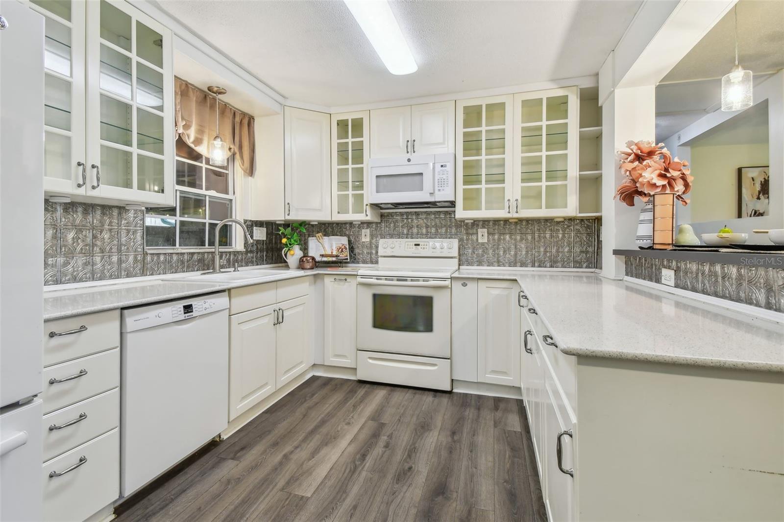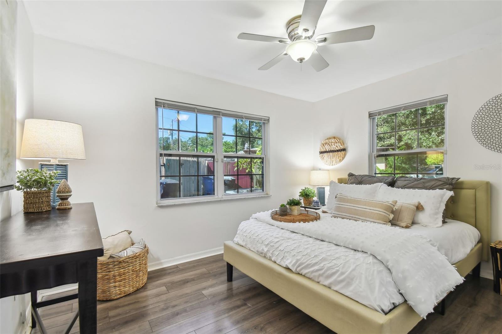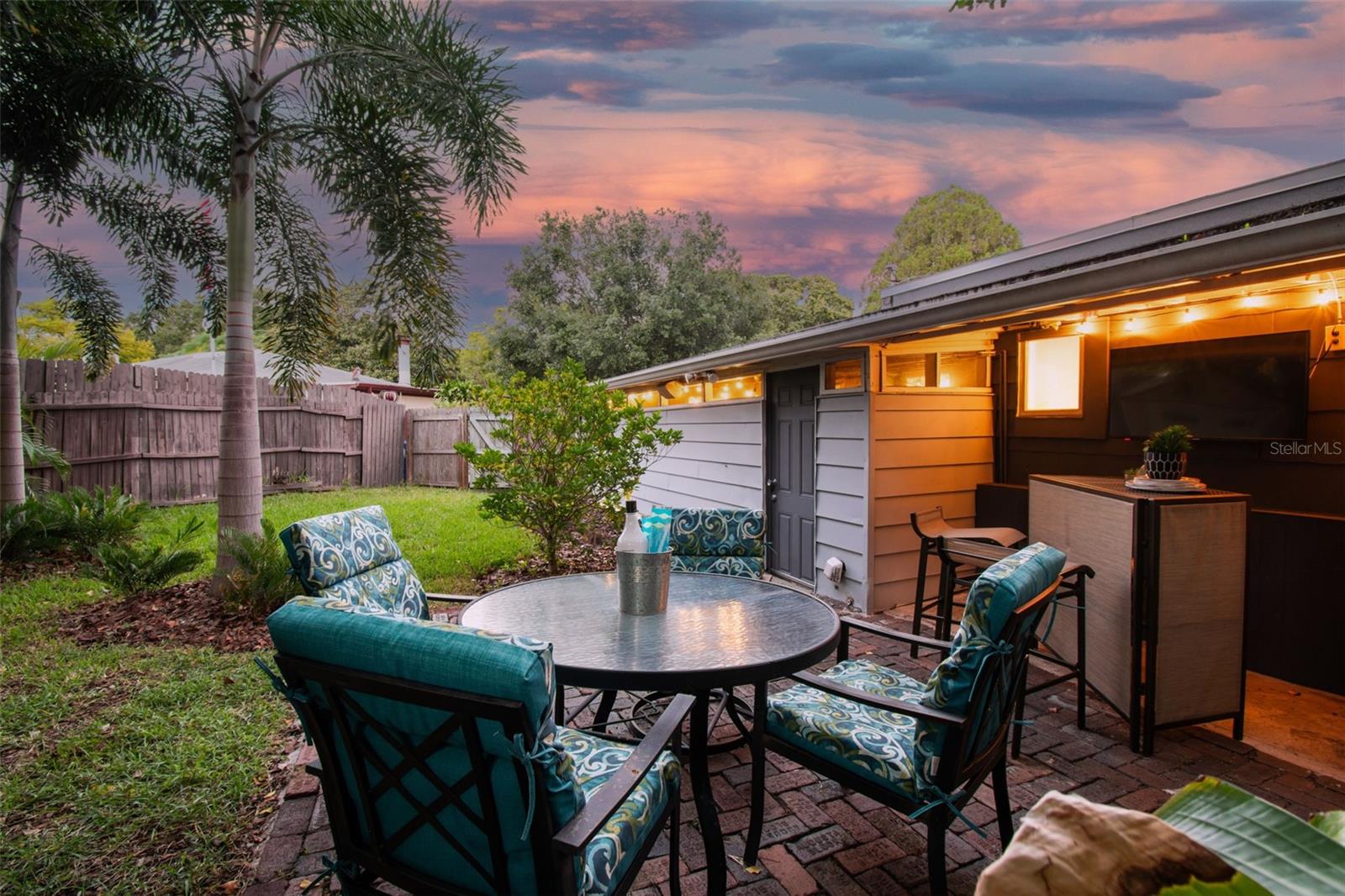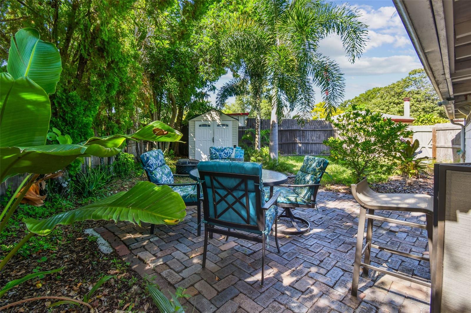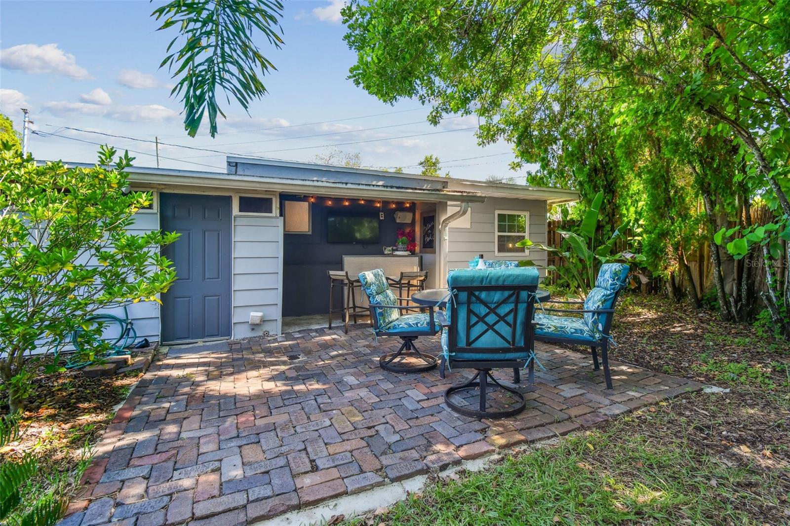 Tucked away on an expansive corner lot (96x100), this delightful home offers a blend of character and modern comfort. The charming brick exterior of this 1953 home invites you inside, where a bright and airy split/open floor plan awaits. The open layout includes a cozy living room perfect for intimate gatherings along with a sprawling, multi-purpose family room that can be used as a second living area, office space, or can be converted into a 4th bedroom/guest space. The kitchen is designed for function and style, with quartz countertops and plenty of counter space and storage space for all your cooking needs. The dining area is conveniently situated between the kitchen and living room. The primary bedroom sits quietly on the left side of the split floorplan offering a peaceful retreat with plenty of closet space along with a private updated bathroom, while the two additional bedrooms and guest bath are positioned on the other side of the home for added privacy. The colonial-style windows bring in even more charm and highlight the natural light in the open living space. The enclosed porch in the back can be used for multiple purposes such as an inside/outside hangout space, home gym, workshop, additional storage, or a combination of all of these. You could even convert this space back into a carport. As you head into the backyard you'll be greeted by your own tropical retreat that offers plenty of shade with thriving palm palm trees and lush landscaping. The backyard also features a brick patio that sits right off the TV nook, perfect for enjoying outdoor entertainment under the shade—only a 15-minute drive to downtown St. Pete and within walking distance to Meadowlawn Park. Additional features include 2018 A/C system, a 2014 water heater, and a 2022 flat roof/2012 main roof. Schedule your showing today!