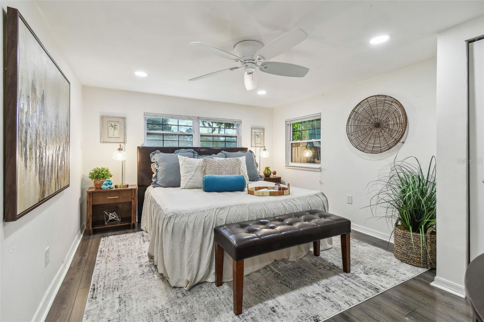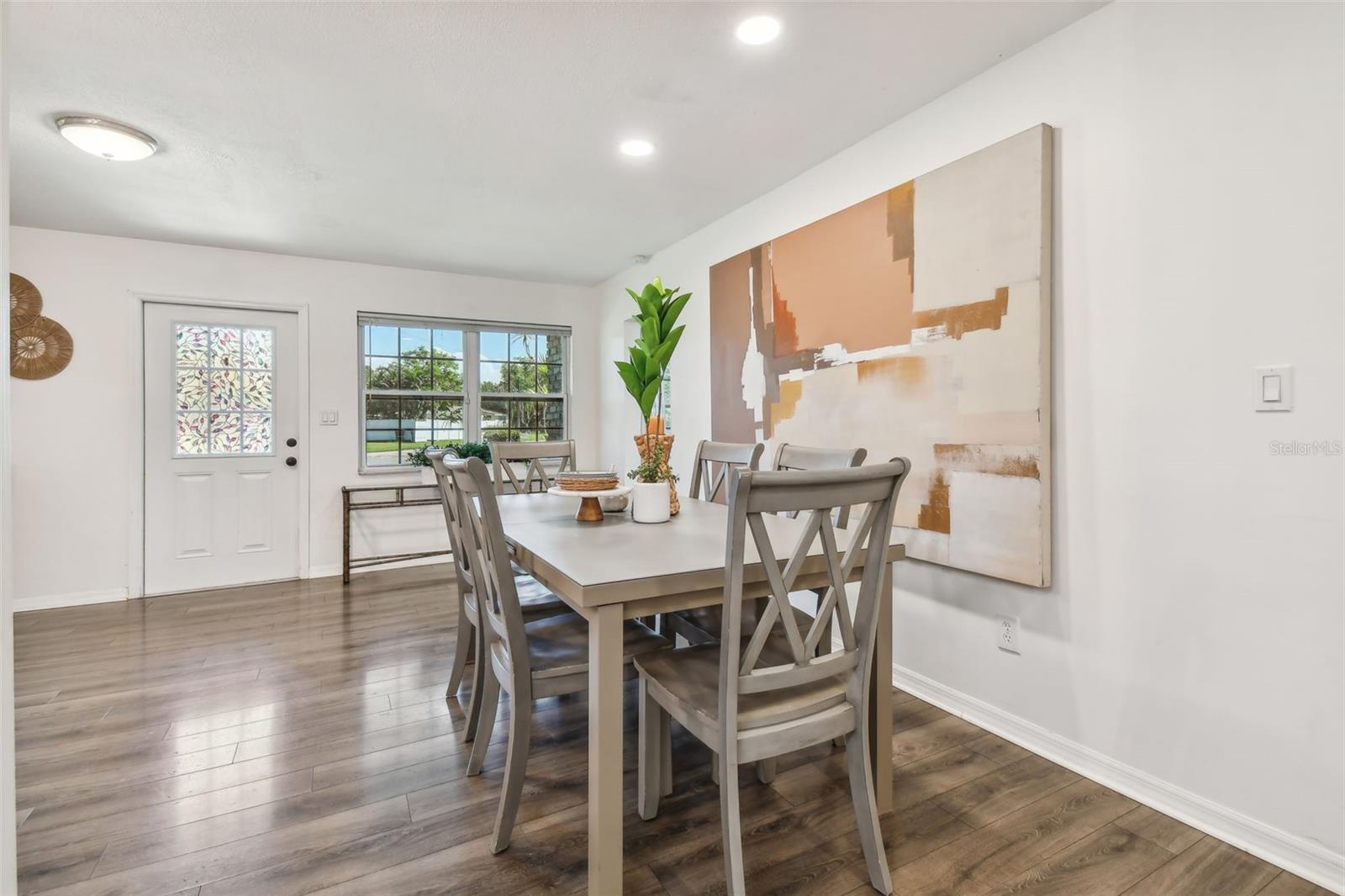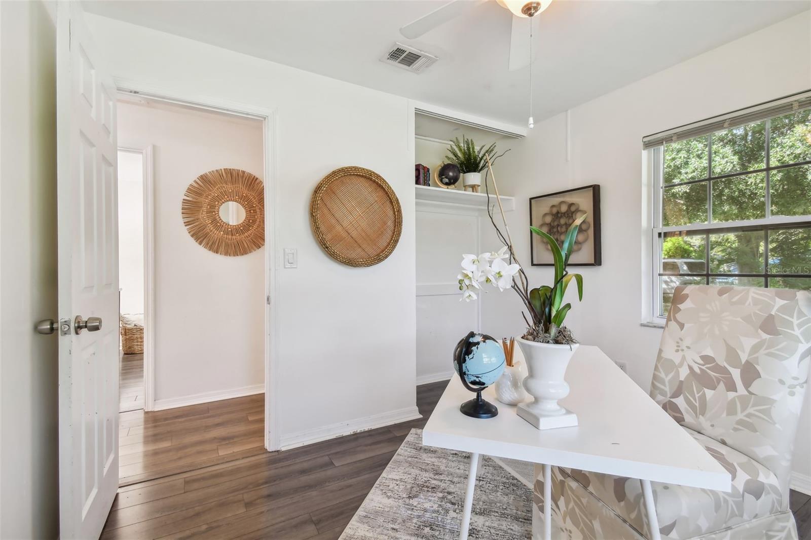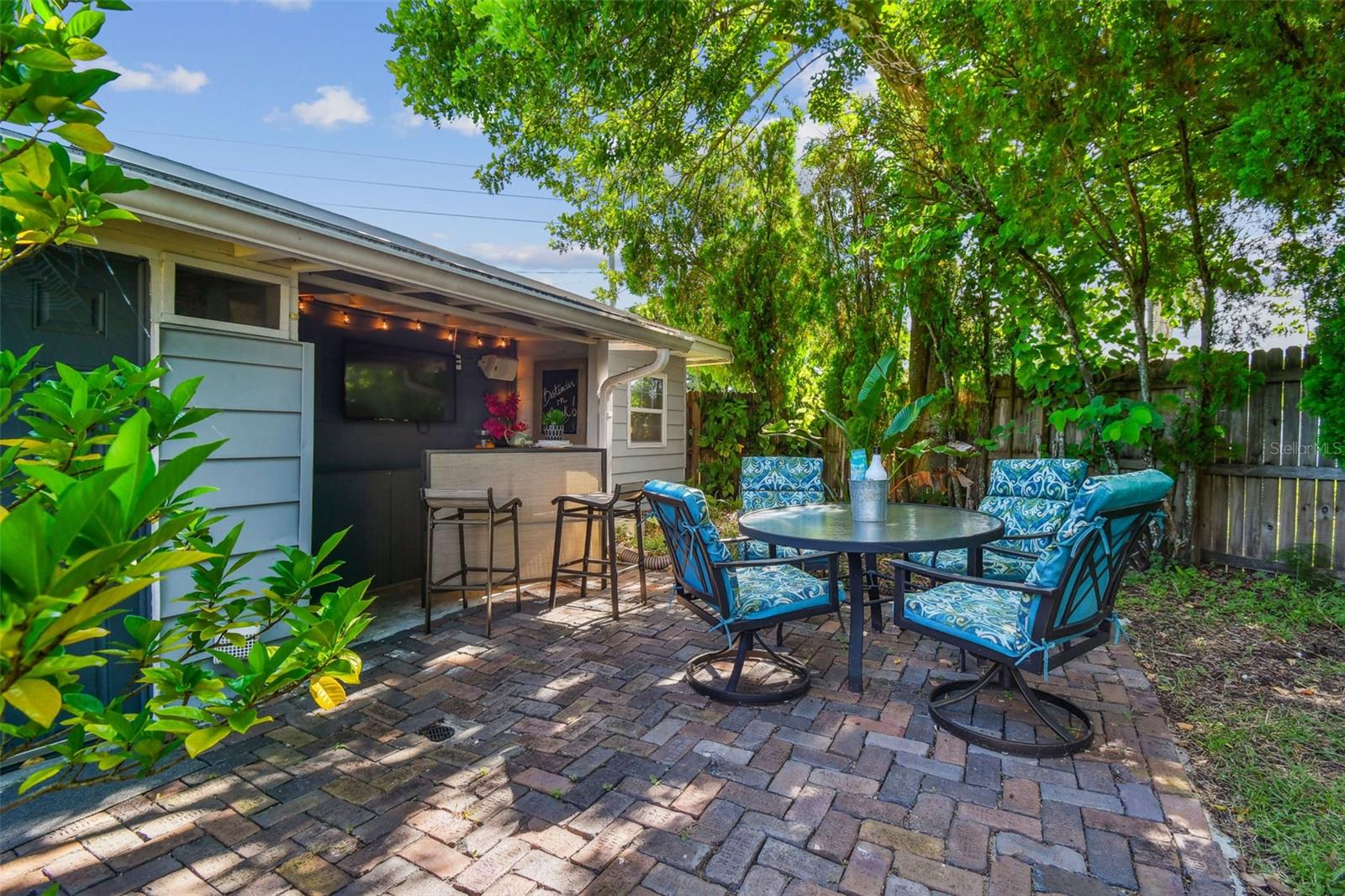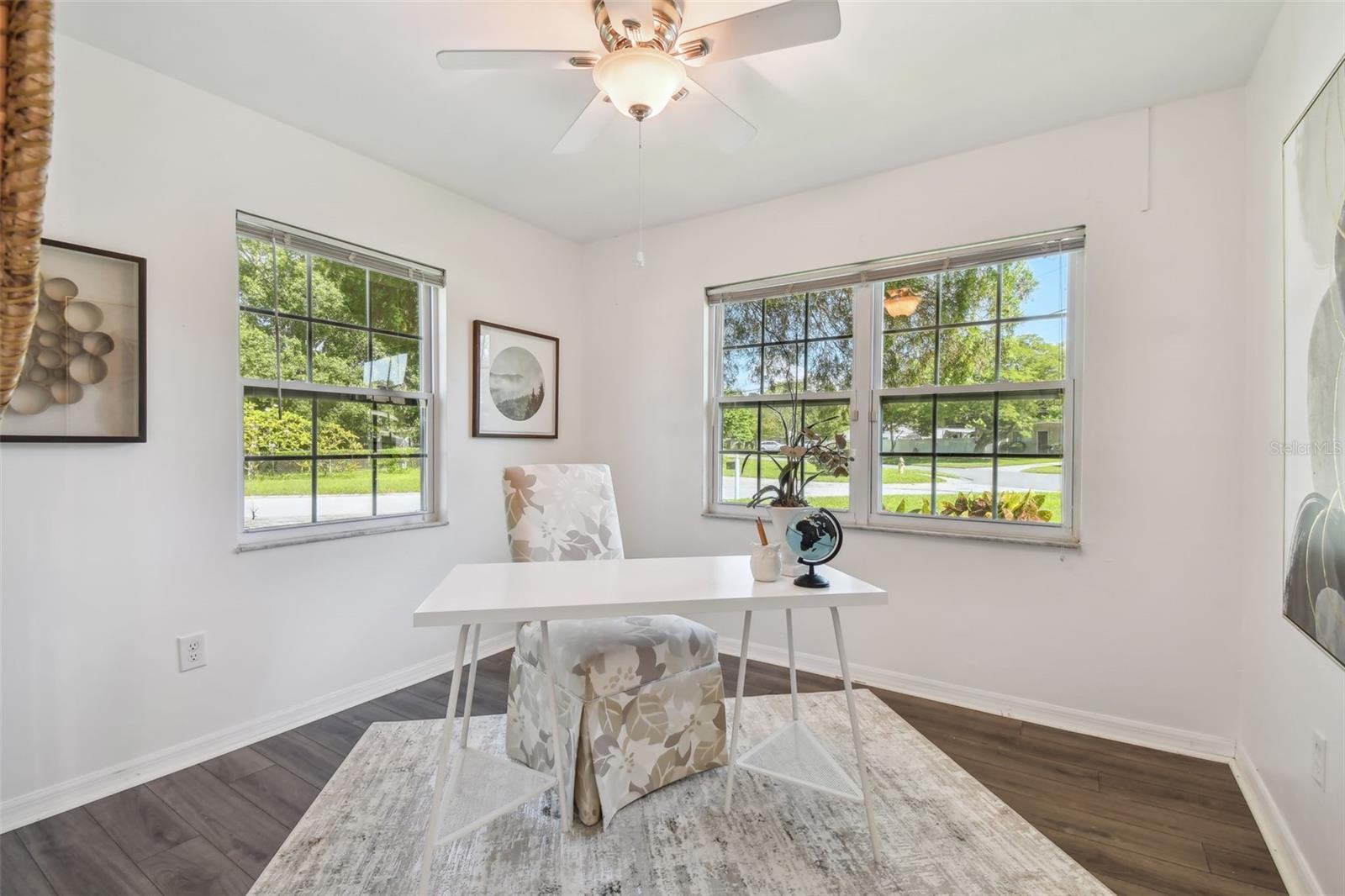 Tucked away on an expansive corner lot (96x100), this delightful home offers a blend of character and modern comfort. The charming brick exterior of this 1953 home invites you inside, where a bright and airy split/open floor plan awaits. The open layout includes a cozy living room perfect for intimate gatherings along with a sprawling, multi-purpose family room that can be used as a second living area, office space, or can be converted into a 4th bedroom/guest space. The kitchen is designed for function and style, with quartz countertops and plenty of counter space and storage space for all your cooking needs. The dining area is conveniently situated between the kitchen and living room. The primary bedroom sits quietly on the left side of the split floorplan offering a peaceful retreat with plenty of closet space along with a private updated bathroom, while the two additional bedrooms and guest bath are positioned on the other side of the home for added privacy. The colonial-style windows bring in even more charm and highlight the natural light in the open living space. The enclosed porch in the back can be used for multiple purposes such as an inside/outside hangout space, home gym, workshop, additional storage, or a combination of all of these. You could even convert this space back into a carport. As you head into the backyard you'll be greeted by your own tropical retreat that offers plenty of shade with thriving palm palm trees and lush landscaping. The backyard also features a brick patio that sits right off the TV nook, perfect for enjoying outdoor entertainment under the shade—only a 15-minute drive to downtown St. Pete and within walking distance to Meadowlawn Park. Additional features include 2018 A/C system, a 2014 water heater, and a 2022 flat roof/2012 main roof. Schedule your showing today!