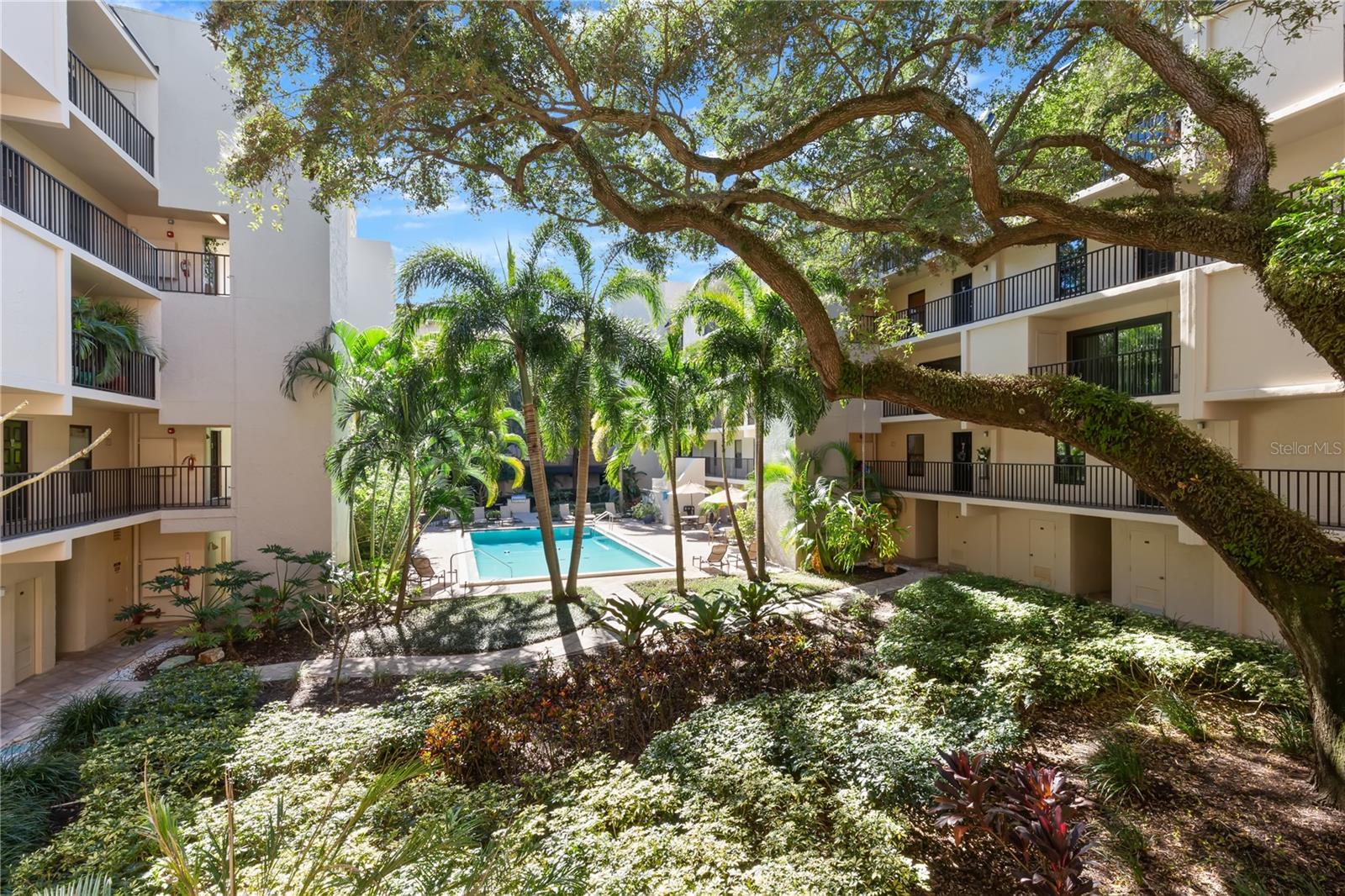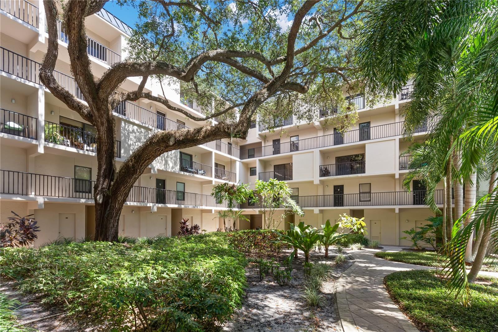 Welcome to one of the four largest units in Townview! This expansive two-level condo has undergone a complete transformation, boasting wood-style tile floors, custom framed mirrors, crown molding, baseboards, and a stunning custom built-in bookshelf, among other upgrades. As you enter, you're greeted by the two downstairs bedrooms, which share a beautifully appointed hall bathroom featuring marble hexagon flooring, marble herringbone tile extending up the wall to the walk-in shower, a double sink vanity, and a pocket door for added privacy. The master bedroom offers dual closets, a walk-in closet, and its own private balcony retreat. Ascend to the upper level and discover the generously sized living space, seamlessly integrating an updated kitchen with a sleek waterfall island, stainless steel appliances, and elegant quartz countertops. Perfect for entertaining, this open layout ensures your guests' comfort, with a conveniently located half bath upstairs to maintain your privacy. Step onto the upstairs balcony to enjoy breathtaking views of the Vinoy and partial water views. Additional features include a large storage closet on the upper balcony, ideal for seasonal decorations, as well as a separate storage unit on the main floor by the courtyard and a designated carport spot (119). AC 2011, water heater 2012, hurricane impact windows and sliders and a comprehensive renovation completed in 2018. The entire building has been re-wired to provide high speed internet through fiber optics to each unit. The building offers secure entry with a callbox and is ideally situated just one block off Beach Dr and the waterfront, providing a prime downtown location. Enjoy the tranquility of the quiet courtyard, complete with a pool, grill area, and majestic oak trees. Notably, the building has recently undergone over $1 million worth of upgrades and improvements. Take advantage of the convenience of nearby restaurants, bars, shopping, easy access to the interstate, beaches, and proximity to Tampa, Sarasota, and more!