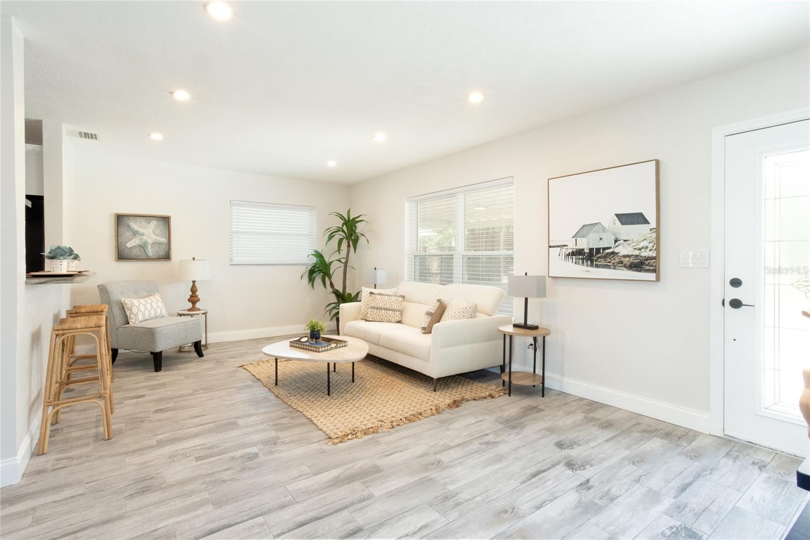 Welcome to this stunningly remodeled 3-bedroom, 3-bathroom waterfront home with a 1-carport and a brand-new seawall. From the moment you step inside, you'll be captivated by the open-concept design and modern finishes throughout. The kitchen is a chef's dream, featuring stainless steel appliances, granite countertops, and an island perfect for dining and entertaining. Adjacent to the kitchen, you'll find a convenient bathroom and a spacious laundry room for added functionality. The versatile back room, currently a dining area, offers breathtaking water views and can easily be transformed into a flex space to suit your needs. All bedrooms are located to the left of the living room, with a guest bathroom nearby. Each bedroom boasts updated windows that fill the rooms with natural light, creating a warm and inviting atmosphere. The primary bedroom is a true retreat, located at the rear of the home, with French doors leading to the serene backyard. It features a luxurious en-suite bathroom with dual vanity and a walk-in shower, perfect for unwinding after a long day. This remodeled home has been freshly painted inside and out, and the lush landscaping enhances its Florida charm and curb appeal. There is additional storage located off the backyard with a newer irrigation system. Situated just minutes from the newly developed Shore Acres Rec Center, parks, neighborhood schools, and the vibrant waterfront of downtown St. Petersburg, this home offers both convenience and a high-quality lifestyle. Don't miss out on this beautiful home that perfectly blends contemporary upgrades with the timeless charm of Florida living. Schedule your showing today and fall in love with your new home! The home has never flooded. Please check out the matterporthttps://my.matterport.com/show/?m=pcA8nTg7SwR