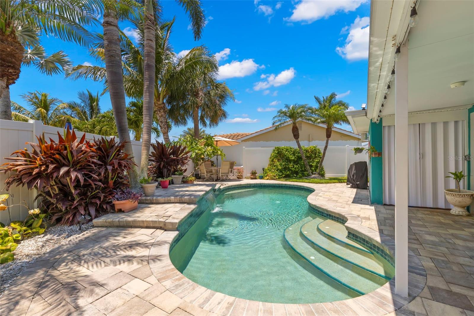 Big price adjustment! Adorable pool home located in Causeway Isles neighborhood in Saint Petersburg! The home is in an excellent location with quick access to Treasure Island Beach and Downtown Saint Pete. Such a cute house with curb appeal, a beautiful interior and an intimate, private resort sanctuary in the back yard. This beach home has tropical landscaping, Bahama Shutters and vinyl fencing. Featuring 1,100 square feet with cove ceilings, 2 bedrooms, 1 bathroom with Quartz counter-top and stunning Terrazzo floors throughout. The renovated kitchen has Maple cabinetry, Quartz counter-tops, and top of the line Stainless Steel GE Appliances. The fridge even has a built-in Keurig Coffee dispenser!! In the resort style, private backyard there is a self-cleaning, salt water pool with a Chiller/Heater combo to cool or heat the water!! The oversized garage has an additional workspace perfect for storage or you could add a pool bath. Plenty of upgrades with insulated windows, electric panel, garage door! Newer upgrades include: 2019- 6 foot privacy fence on left side of house, shutters in living room, replacement of all ceiling fans. 2020- Paved pool deck, new back door from garage to pool, landscaping. 2021- New AC unit. 2022- New water heater. 2023-New faucets in bathroom,kitchen and garage sinks. 2024- New pool pump motor. Here, you are just minutes to colorful sunsets on Treasure Island beach, great beachside dining, local shopping and entertainment. You’re centrally located close to Downtown St Pete for 5 Star dining, museums, local events and less than 10 minutes to Tyrone Mall!
