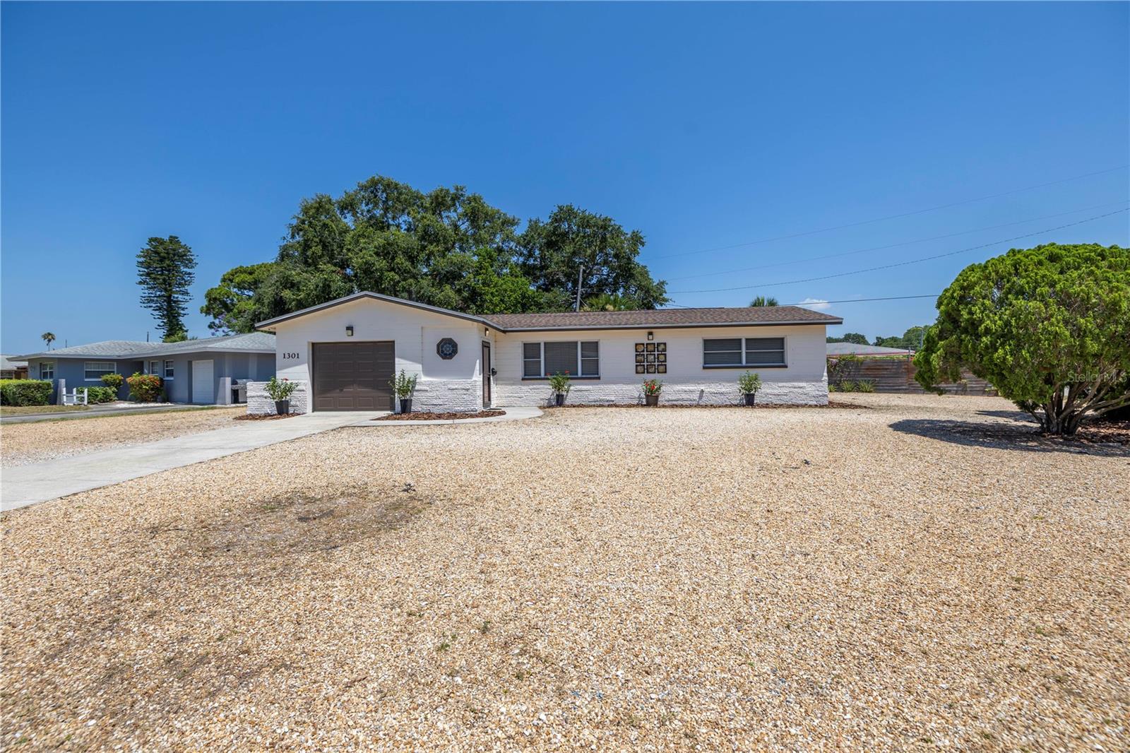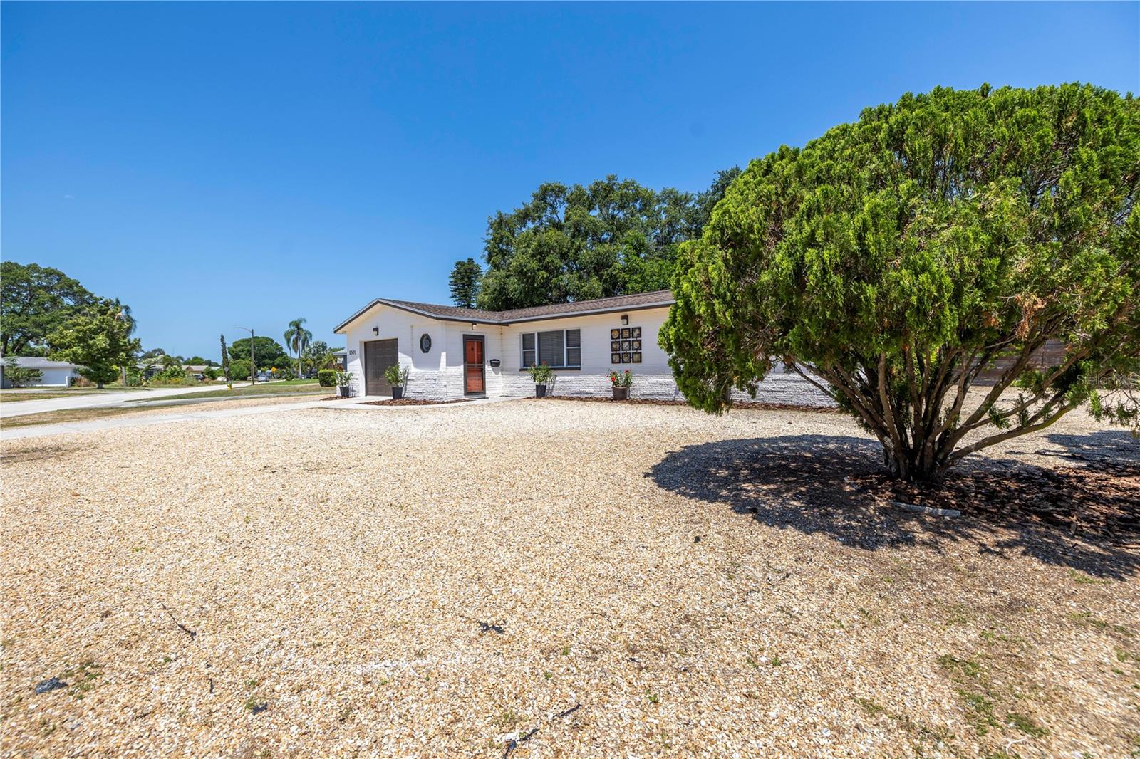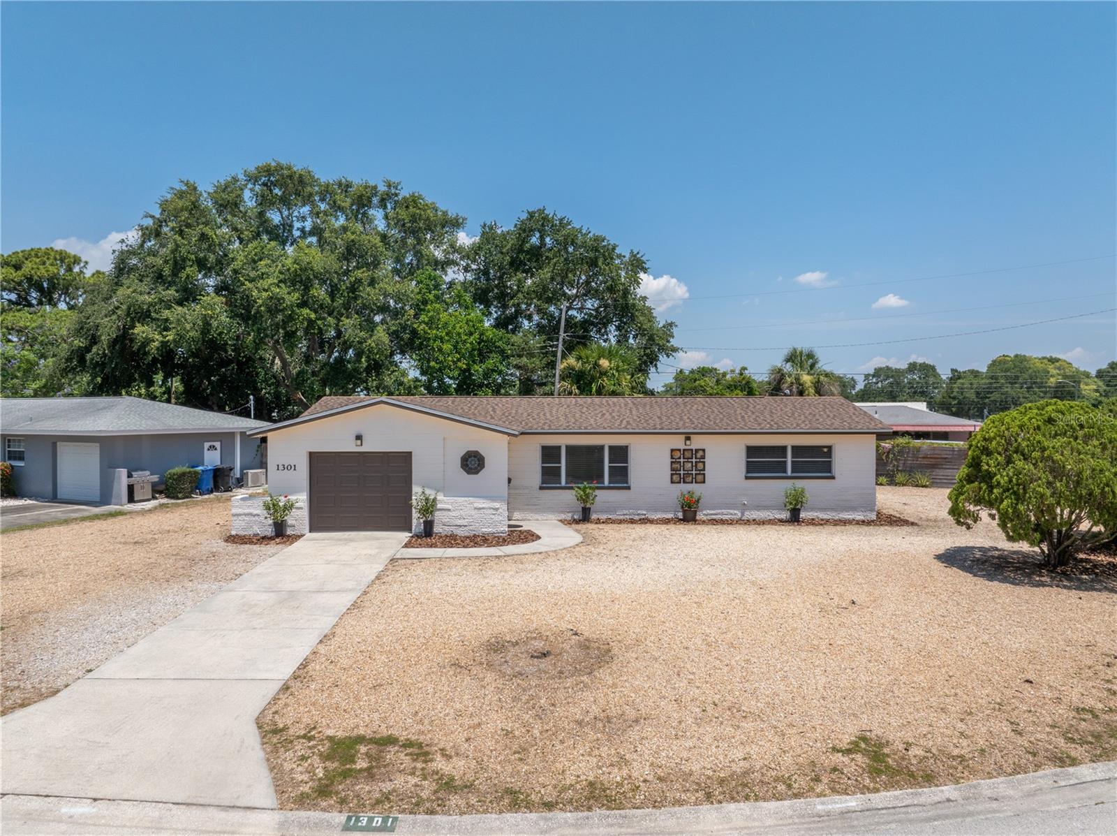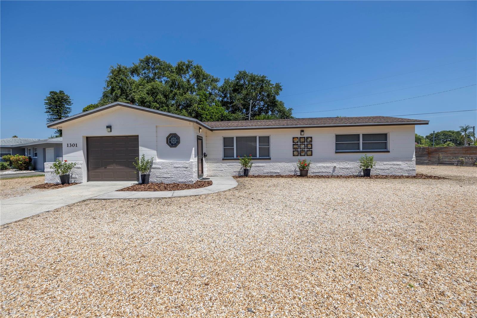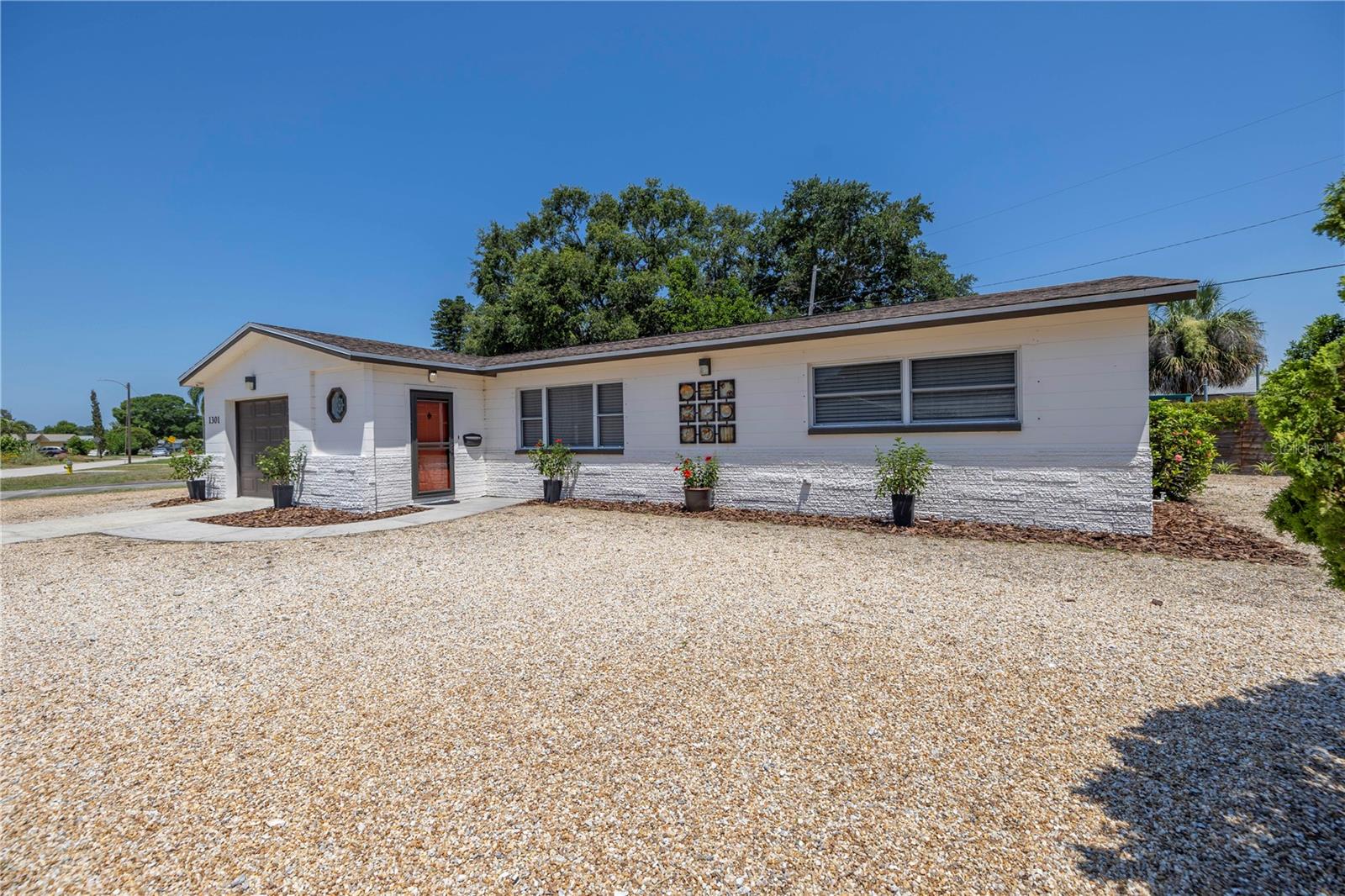 Come on home...move-in ready, mid-century block construction home positioned on a sizable corner lot in a wonderful neighborhood of the Greater Pinellas Point area in St. Petersburg. This updated, open and split floor plan offers 3 bedrooms, 2 bathrooms, and 1 car garage with over 1500 heated square feet of comfortable living. The interior features a beautiful updated kitchen, double pane windows, seamless tile flooring throughout the home, recessed lighting, prewiring for large screen television, custom coordinated window blinds, custom coordinated lighted ceiling fans, a newer roof, and a hurricane rated automatic garage door. The open kitchen is ideal for your gourmet creations or quick meals, and great for entertaining, boasting stainless steel appliances, modern built-in microwave drawer, quartz countertops, built in dishwasher, deep well double stainless steel sink, garbage disposal, window that overlooks the screened in back patio, and prewiring for optional pendant lighting. The split bedroom layout provides privacy with a back bedroom suite and an updated en-suite bathroom. This suite can easily be used as the primary or guest suite. Nice sized closets throughout and ample cabinets for storage in the garage as well. This spacious lot can accommodate your RV or other outdoor toys and activities. Automatic night security lighting on home exterior. Located in a non-flood zone, only minutes to Boyd Hill Nature Park, St. Petersburg Golf & Country Club, Bay Vista Park and Public Boat Ramp, Maximo Park and Public Boat Ramp and easy access to our award-winning Gulf Beaches, vibrant Downtown St. Petersburg, and several magnet and fundamental school choices. Come enjoy the sunshine and Florida lifestyle at 1301 62nd Place S.