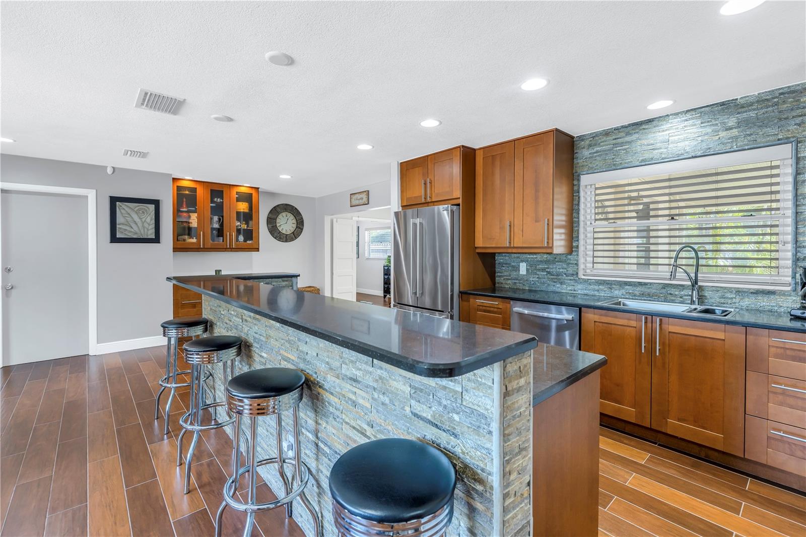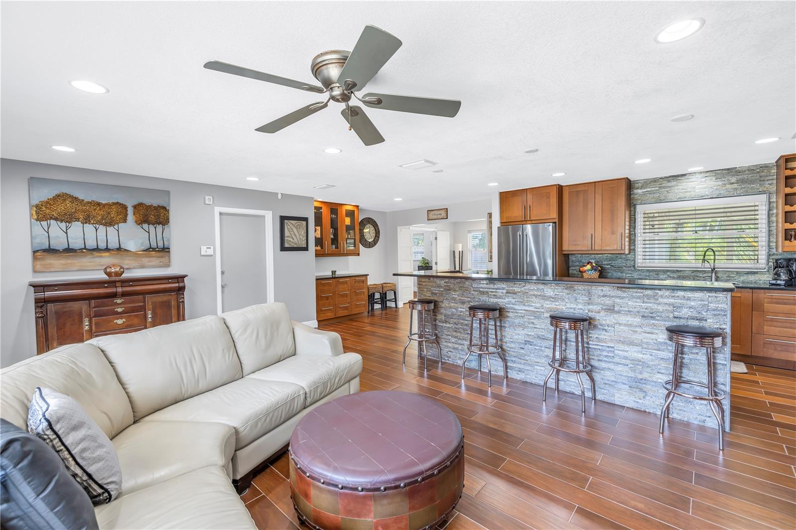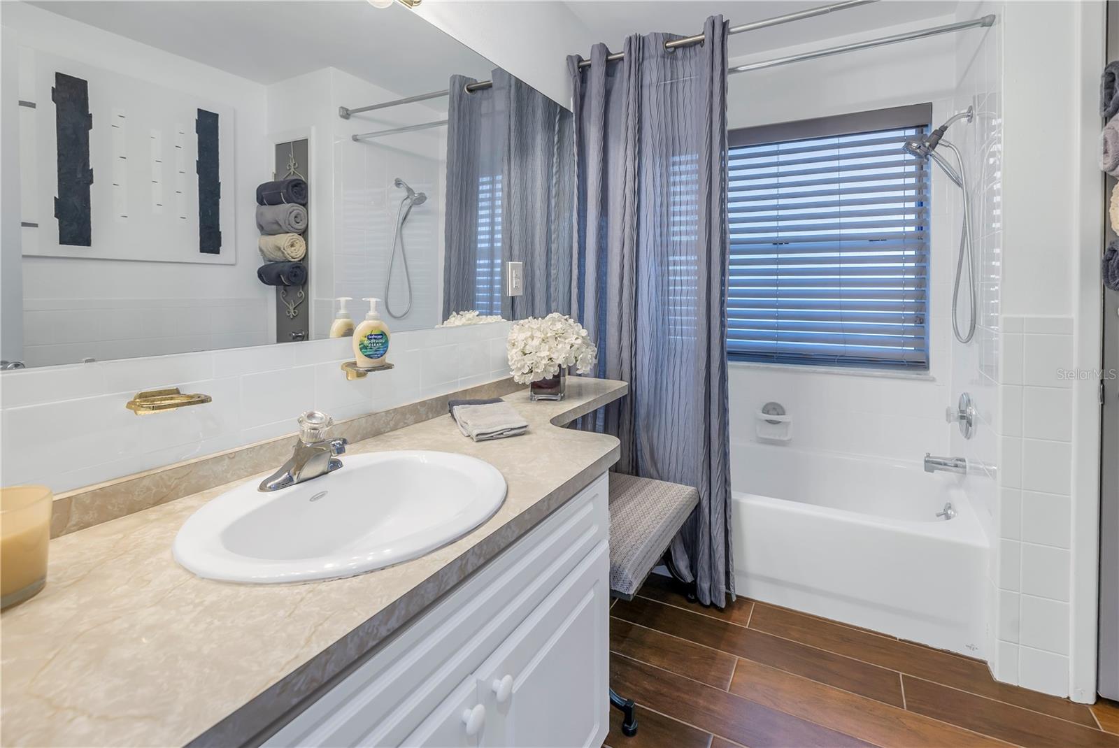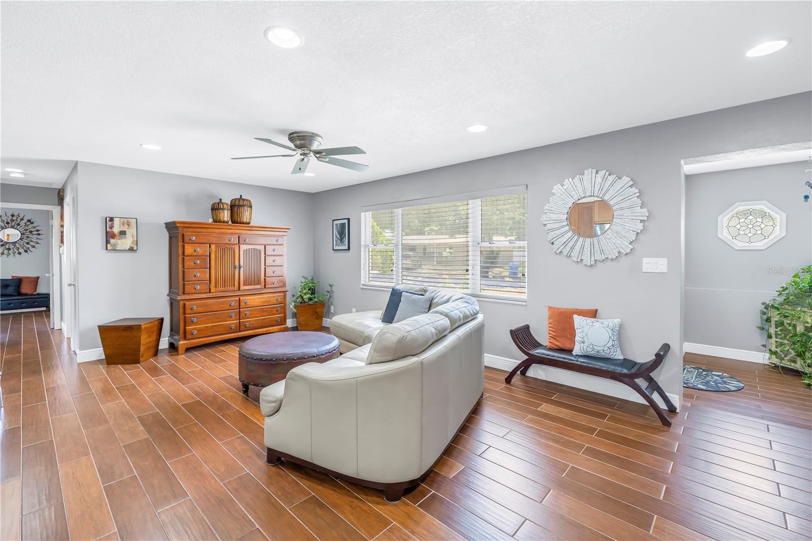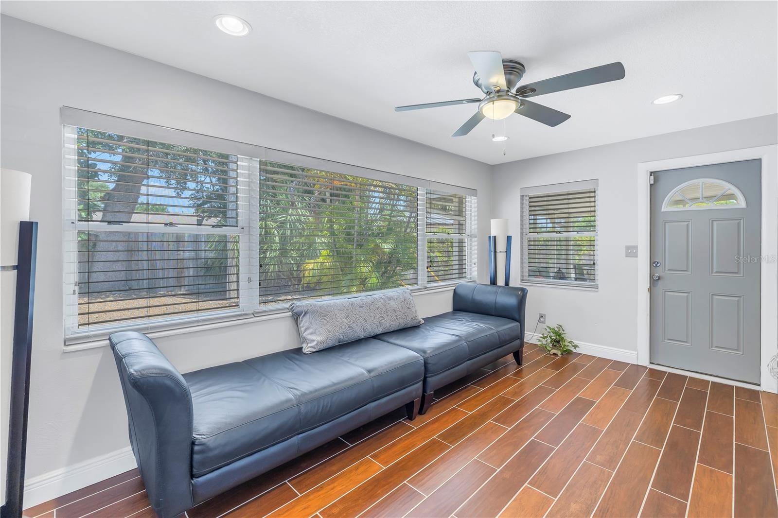 Come on home...move-in ready, mid-century block construction home positioned on a sizable corner lot in a wonderful neighborhood of the Greater Pinellas Point area in St. Petersburg. This updated, open and split floor plan offers 3 bedrooms, 2 bathrooms, and 1 car garage with over 1500 heated square feet of comfortable living. The interior features a beautiful updated kitchen, double pane windows, seamless tile flooring throughout the home, recessed lighting, prewiring for large screen television, custom coordinated window blinds, custom coordinated lighted ceiling fans, a newer roof, and a hurricane rated automatic garage door. The open kitchen is ideal for your gourmet creations or quick meals, and great for entertaining, boasting stainless steel appliances, modern built-in microwave drawer, quartz countertops, built in dishwasher, deep well double stainless steel sink, garbage disposal, window that overlooks the screened in back patio, and prewiring for optional pendant lighting. The split bedroom layout provides privacy with a back bedroom suite and an updated en-suite bathroom. This suite can easily be used as the primary or guest suite. Nice sized closets throughout and ample cabinets for storage in the garage as well. This spacious lot can accommodate your RV or other outdoor toys and activities. Automatic night security lighting on home exterior. Located in a non-flood zone, only minutes to Boyd Hill Nature Park, St. Petersburg Golf & Country Club, Bay Vista Park and Public Boat Ramp, Maximo Park and Public Boat Ramp and easy access to our award-winning Gulf Beaches, vibrant Downtown St. Petersburg, and several magnet and fundamental school choices. Come enjoy the sunshine and Florida lifestyle at 1301 62nd Place S.