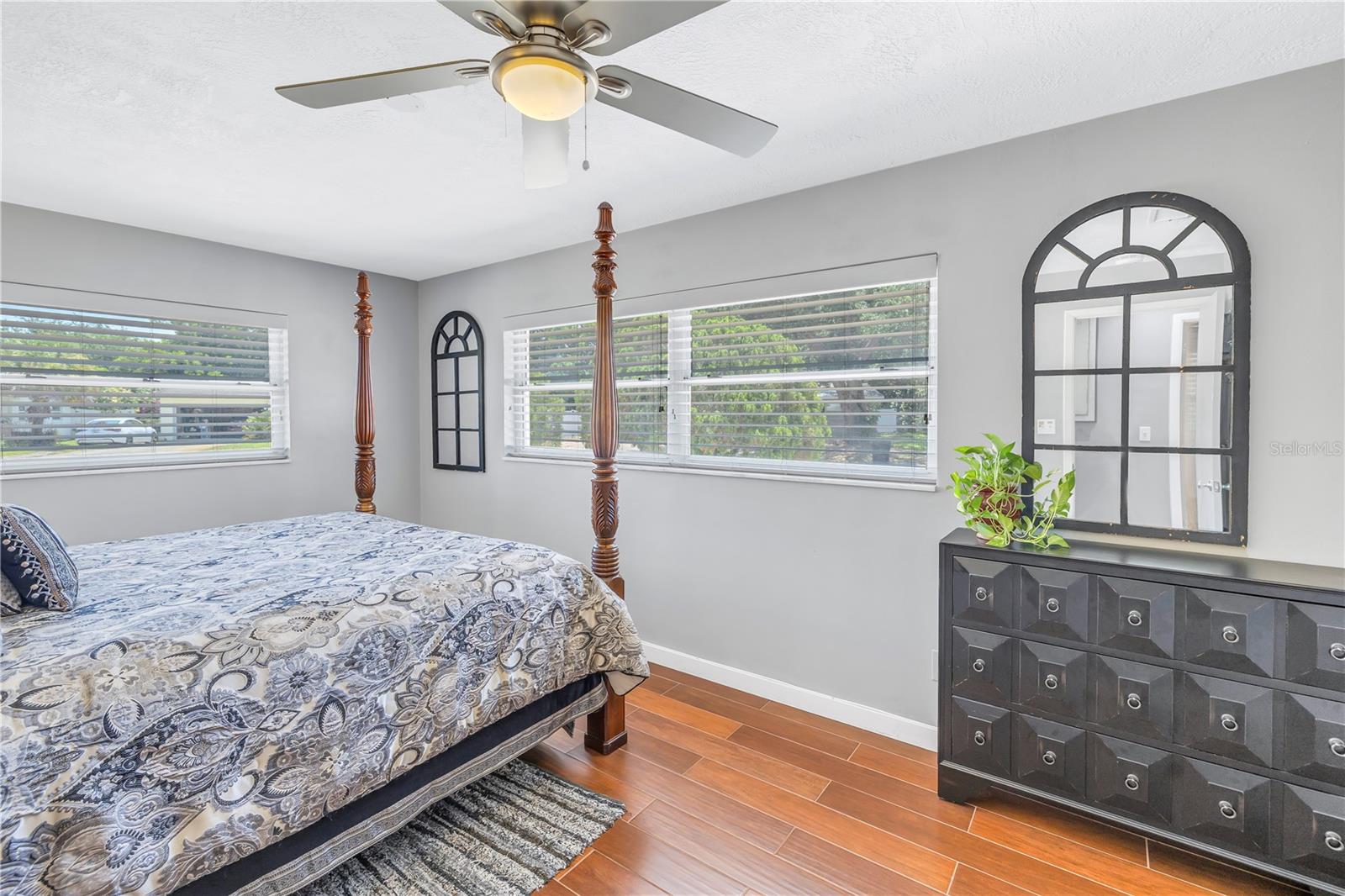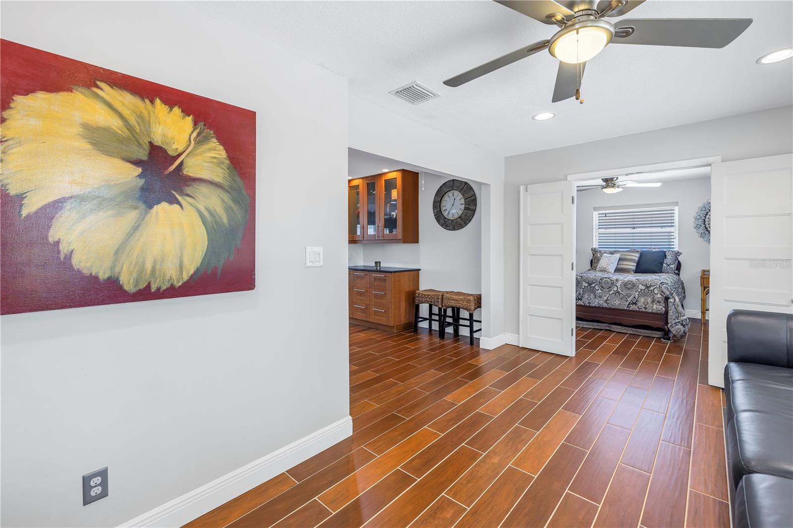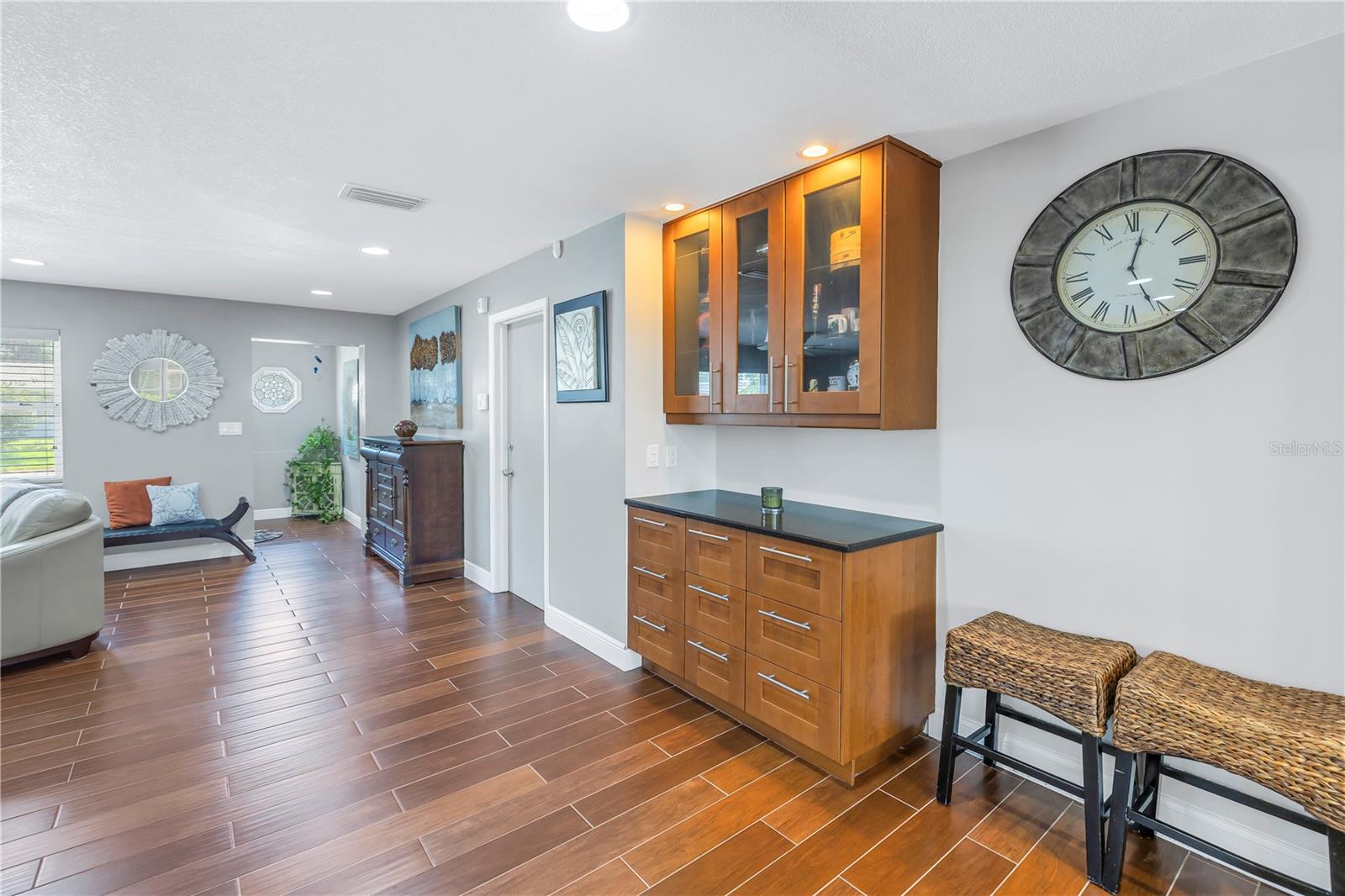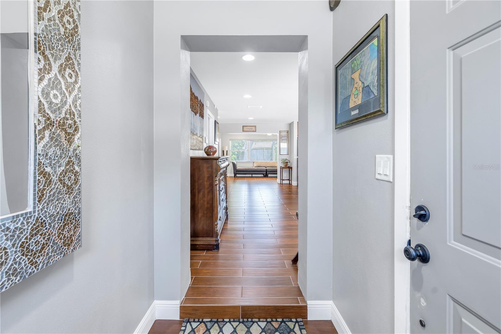 Come on home...move-in ready, mid-century block construction home positioned on a sizable corner lot in a wonderful neighborhood of the Greater Pinellas Point area in St. Petersburg. This updated, open and split floor plan offers 3 bedrooms, 2 bathrooms, and 1 car garage with over 1500 heated square feet of comfortable living. The interior features a beautiful updated kitchen, double pane windows, seamless tile flooring throughout the home, recessed lighting, prewiring for large screen television, custom coordinated window blinds, custom coordinated lighted ceiling fans, a newer roof, and a hurricane rated automatic garage door. The open kitchen is ideal for your gourmet creations or quick meals, and great for entertaining, boasting stainless steel appliances, modern built-in microwave drawer, quartz countertops, built in dishwasher, deep well double stainless steel sink, garbage disposal, window that overlooks the screened in back patio, and prewiring for optional pendant lighting. The split bedroom layout provides privacy with a back bedroom suite and an updated en-suite bathroom. This suite can easily be used as the primary or guest suite. Nice sized closets throughout and ample cabinets for storage in the garage as well. This spacious lot can accommodate your RV or other outdoor toys and activities. Automatic night security lighting on home exterior. Located in a non-flood zone, only minutes to Boyd Hill Nature Park, St. Petersburg Golf & Country Club, Bay Vista Park and Public Boat Ramp, Maximo Park and Public Boat Ramp and easy access to our award-winning Gulf Beaches, vibrant Downtown St. Petersburg, and several magnet and fundamental school choices. Come enjoy the sunshine and Florida lifestyle at 1301 62nd Place S.