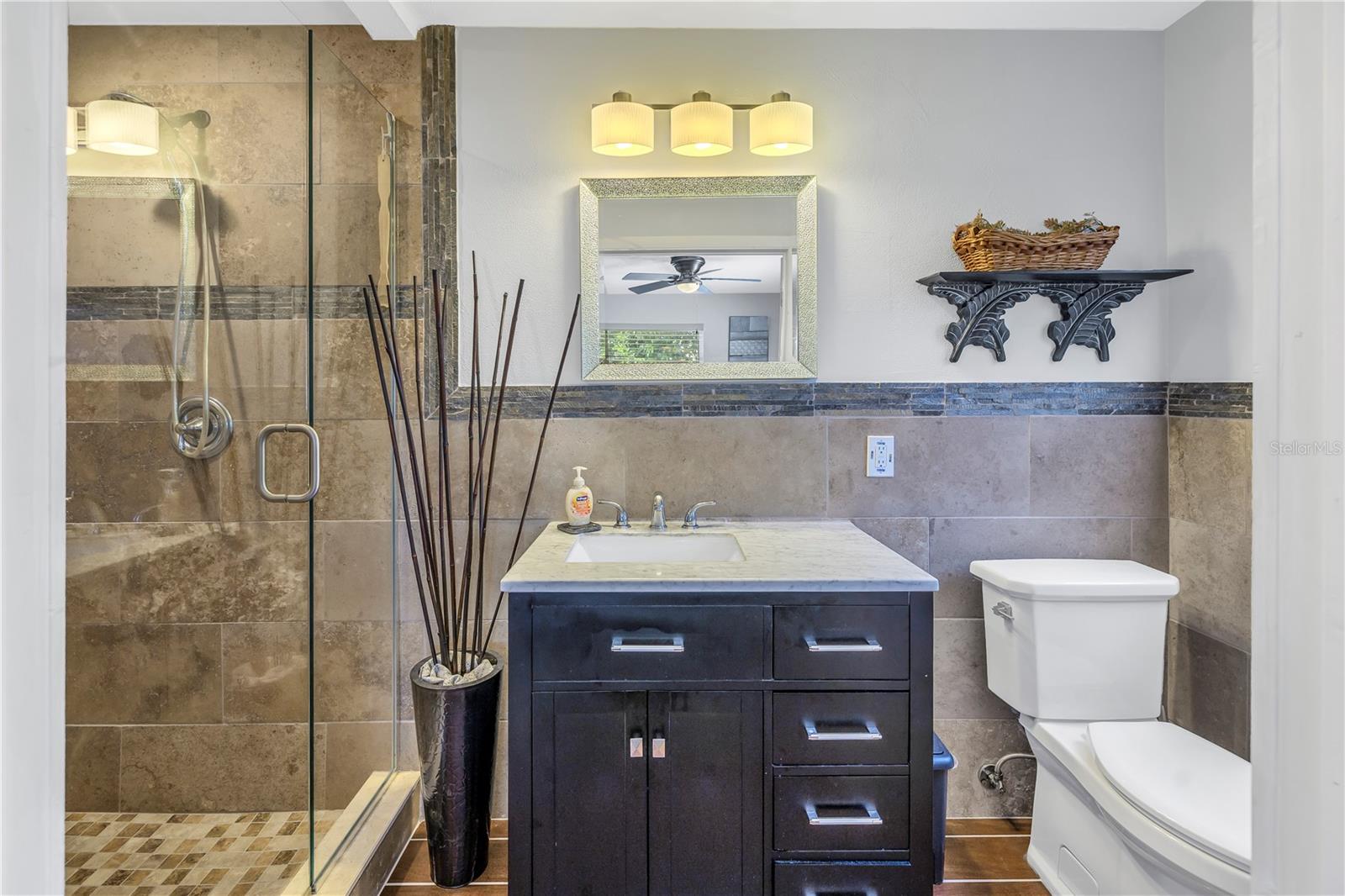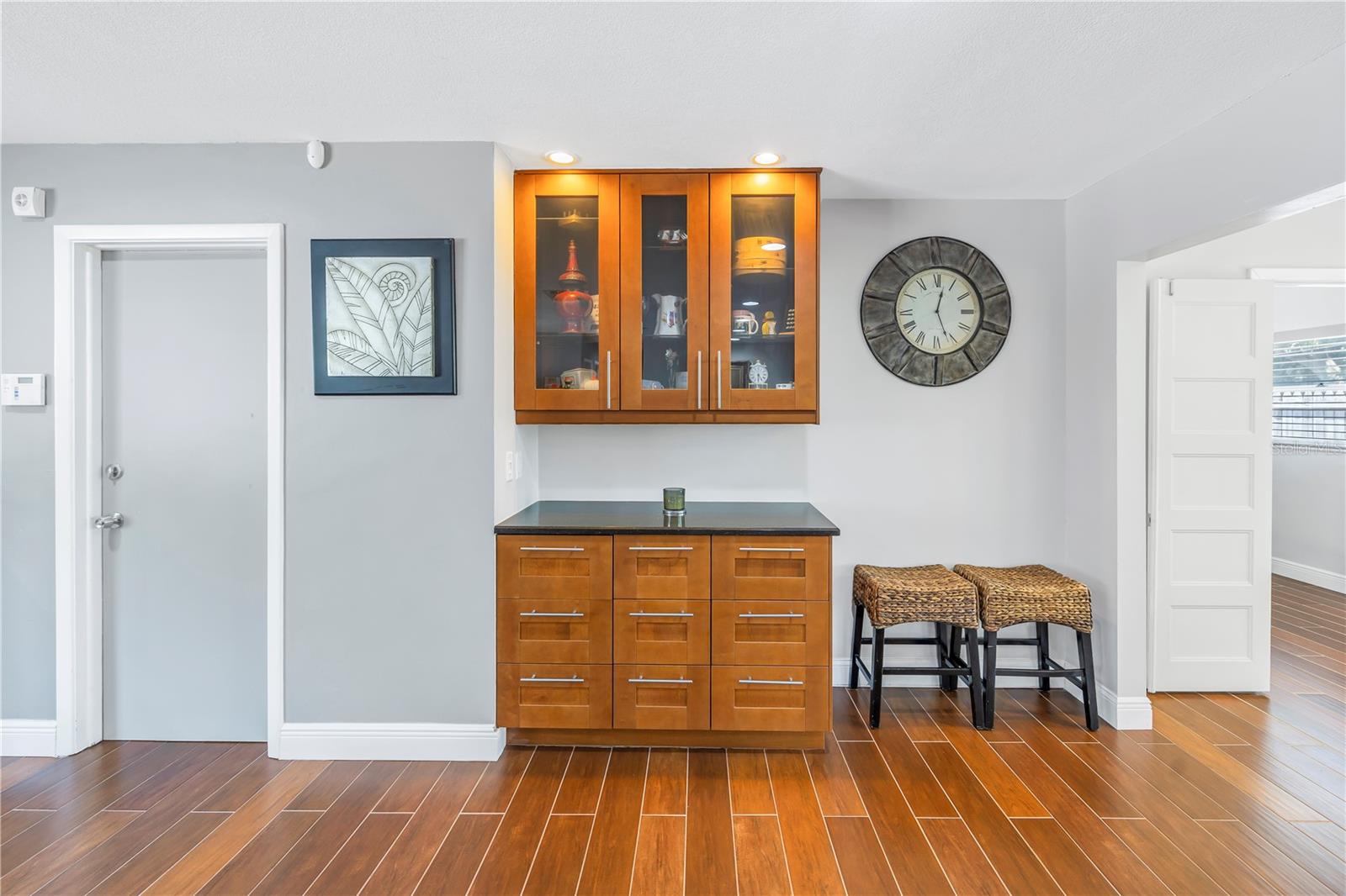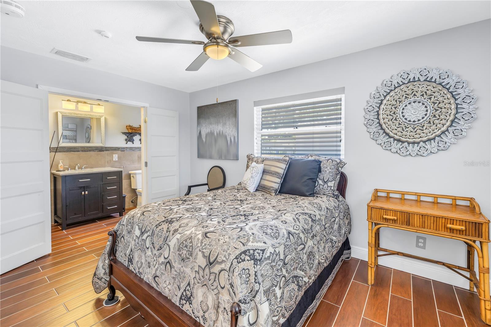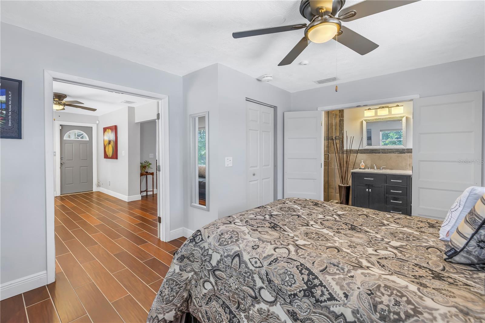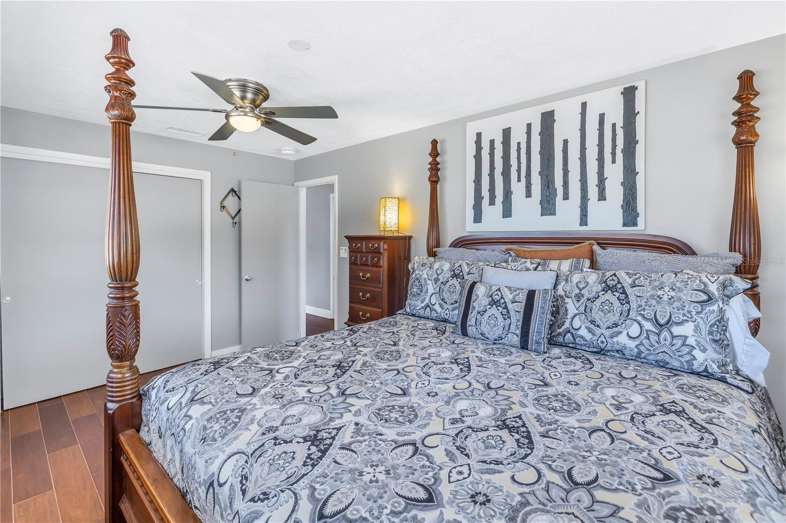Come on home...move-in ready, mid-century block construction home positioned on a sizable corner lot in a wonderful neighborhood of the Greater Pinellas Point area in St. Petersburg. This updated, open and split floor plan offers 3 bedrooms, 2 bathrooms, and 1 car garage with over 1500 heated square feet of comfortable living. The interior features a beautiful updated kitchen, double pane windows, seamless tile flooring throughout the home, recessed lighting, prewiring for large screen television, custom coordinated window blinds, custom coordinated lighted ceiling fans, a newer roof, and a hurricane rated automatic garage door. The open kitchen is ideal for your gourmet creations or quick meals, and great for entertaining, boasting stainless steel appliances, modern built-in microwave drawer, quartz countertops, built in dishwasher, deep well double stainless steel sink, garbage disposal, window that overlooks the screened in back patio, and prewiring for optional pendant lighting. The split bedroom layout provides privacy with a back bedroom suite and an updated en-suite bathroom. This suite can easily be used as the primary or guest suite. Nice sized closets throughout and ample cabinets for storage in the garage as well. This spacious lot can accommodate your RV or other outdoor toys and activities. Automatic night security lighting on home exterior. Located in a non-flood zone, only minutes to Boyd Hill Nature Park, St. Petersburg Golf & Country Club, Bay Vista Park and Public Boat Ramp, Maximo Park and Public Boat Ramp and easy access to our award-winning Gulf Beaches, vibrant Downtown St. Petersburg, and several magnet and fundamental school choices. Come enjoy the sunshine and Florida lifestyle at 1301 62nd Place S.