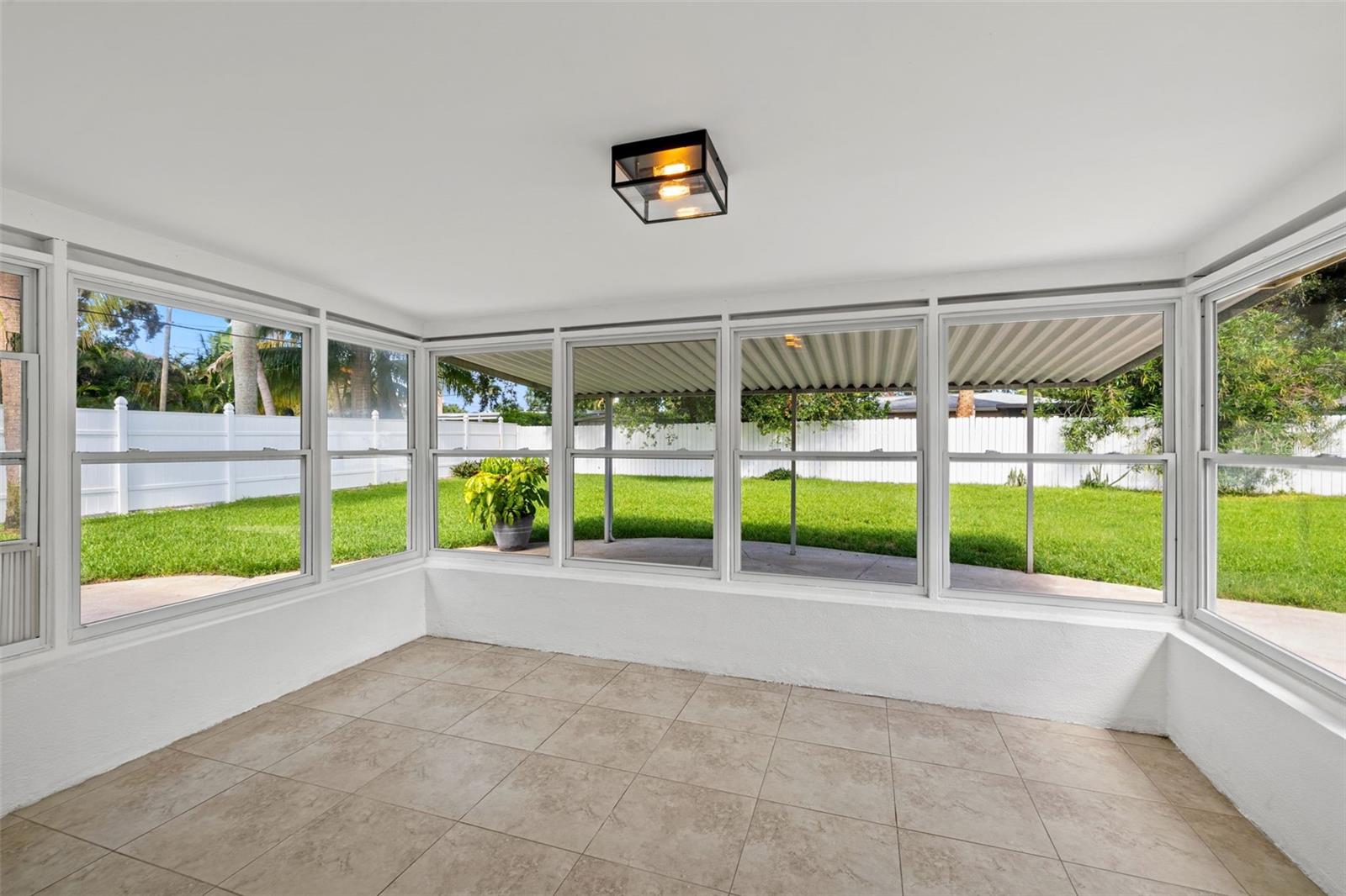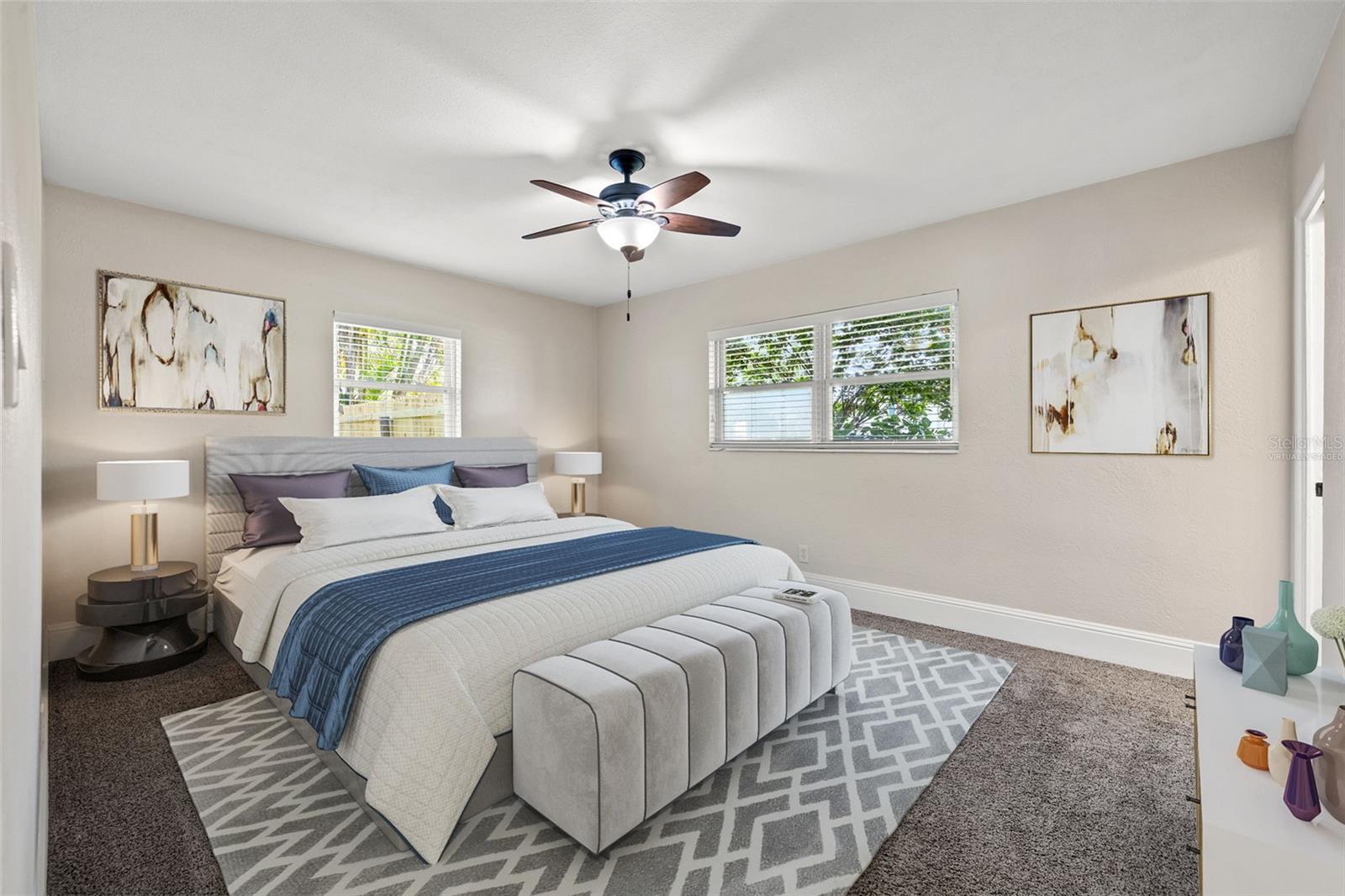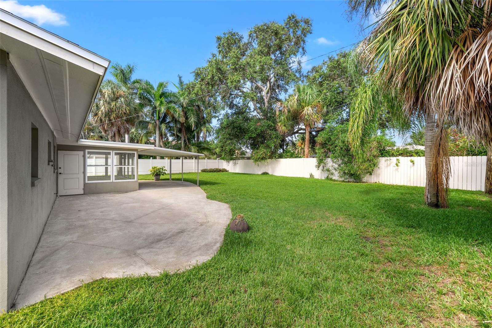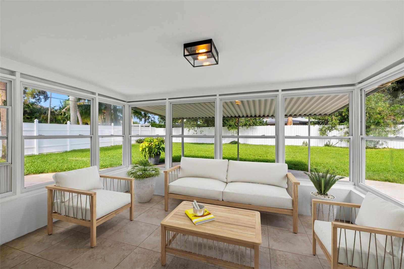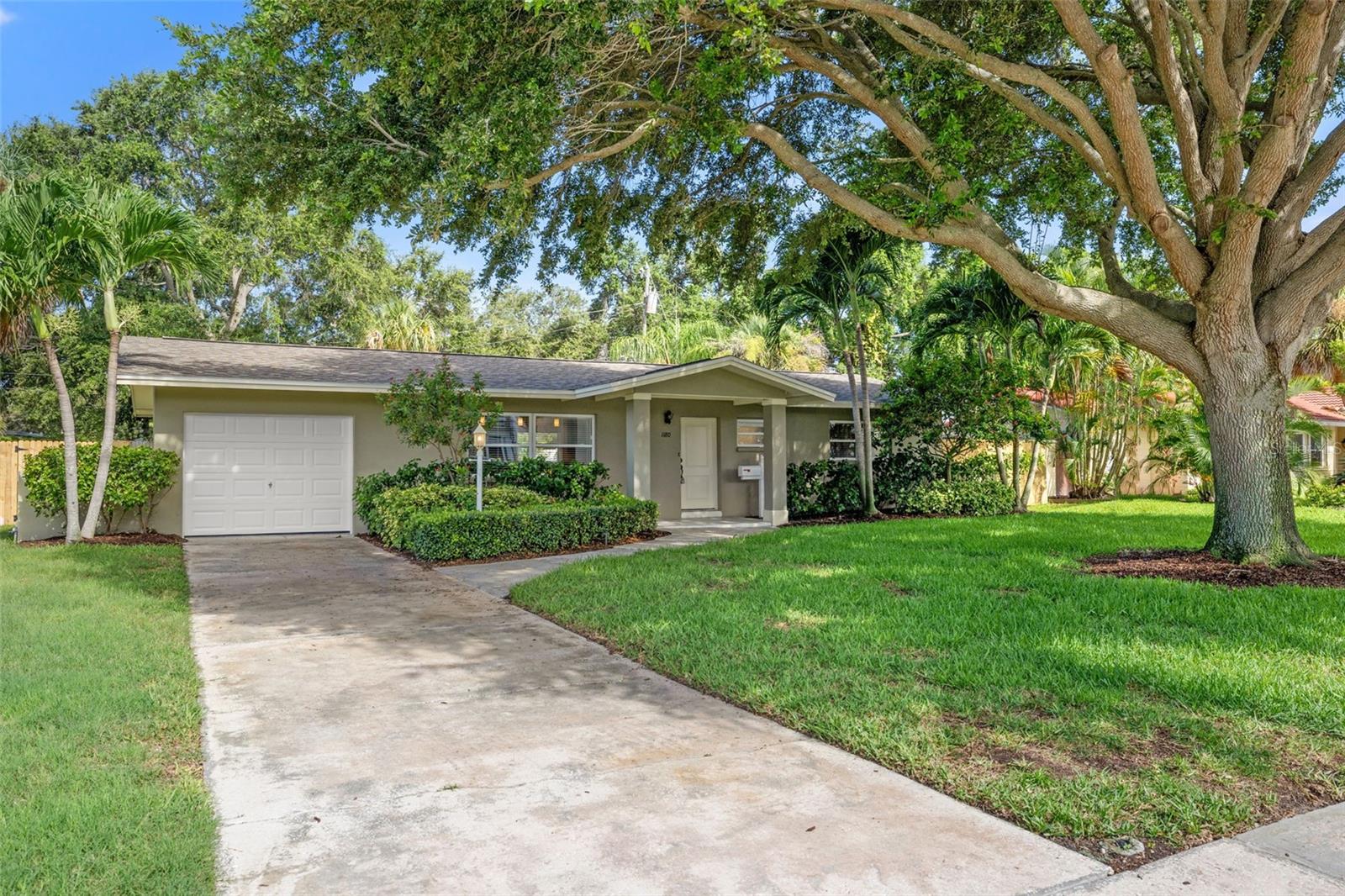 One or more photo(s) has been virtually staged. Welcome to your dream home! Nestled on a pristine lot you'll find this stunning 2-bedroom, 2-bathroom ranch-style home with 1,144 square feet and of living space and has been beautifully updated to feature an open floor plan that is perfect for modern living. Step inside to discover the easy-care ceramic tile floors throughout the main living area making maintenance a breeze. The spacious living area flows seamlessly into a dining area and gourmet kitchen, complete with a large island equipped with built-in electrical outlets. The kitchen is a chef's delight, boasting ceiling-length wood cabinets, a custom granite composite sink, gleaming Quartz countertops, and state-of-the-art stainless steel appliances. Both bedrooms are generously sized, offering plenty of space and comfort. The primary suite provides a serene retreat with its own private ensuite. Outside, the large fenced-in backyard (90x123) is an entertainer's paradise. Enjoy year-round gatherings on the covered patio or in the cozy 165 square foot Florida room with separate A/C and tons of natural lighting with direct access to the private backyard. There's ample space for outdoor activities, gardening, or simply soaking in the Florida sunshine in your own private oasis. Additional features included in this beautiful home is a brand new roof in July 2024, newer a/c in 2017, new carpet, newer double pane windows throughout and updated lighting & ceiling fans. The one car garage is perfect for your vehicle and has ample storage space. Located in a quiet neighborhood and close to downtown St. Pete, Vinoy Club, North Shore, and easy access to I-275. This beautiful home is perfectly situated near great schools, speciality waterfront restaurants, parks, and much more. Don’t miss out on this opportunity to own a beautiful, updated home in the sough after Eden Shores.
