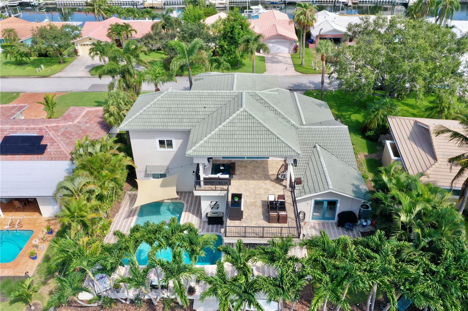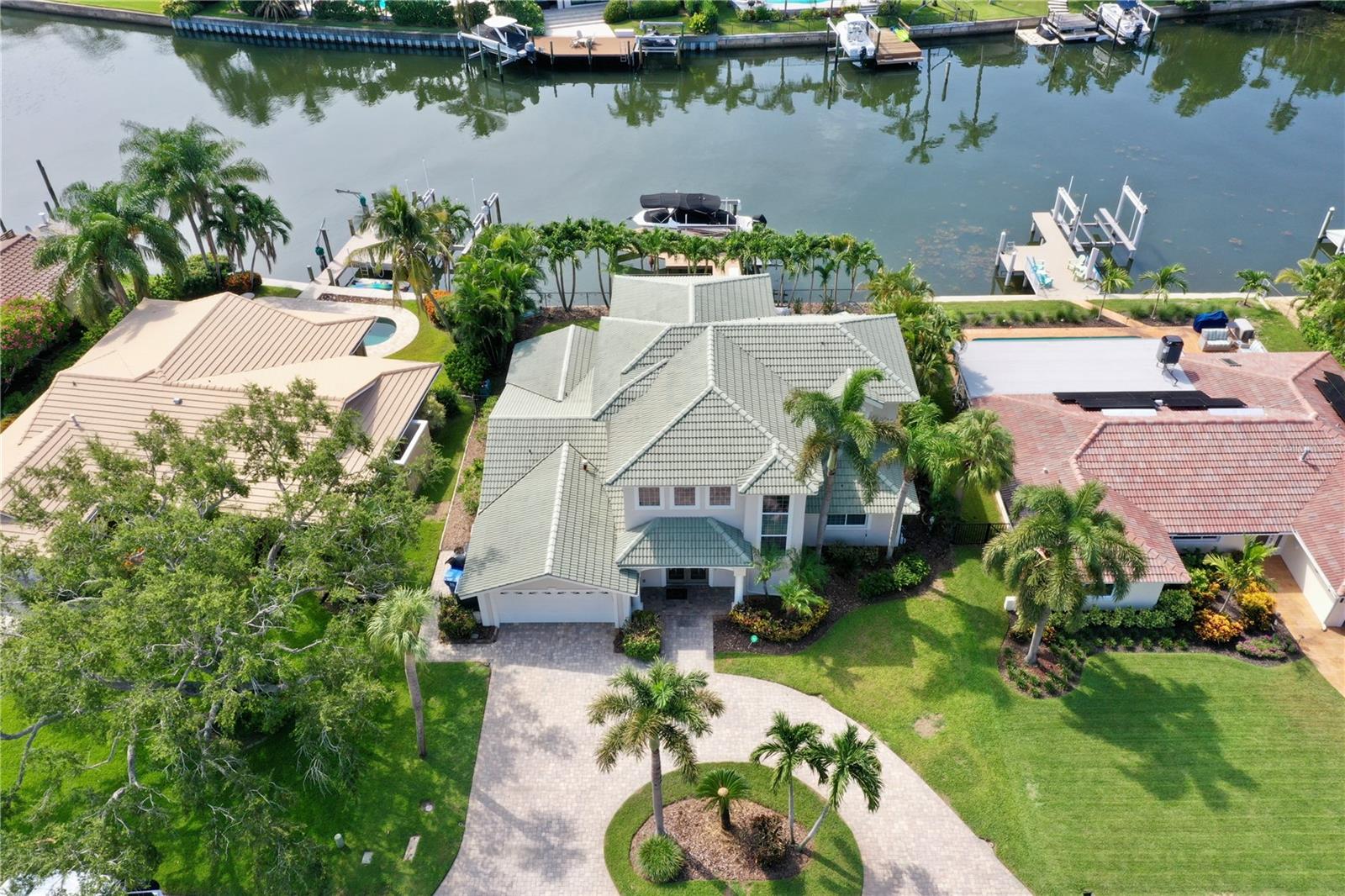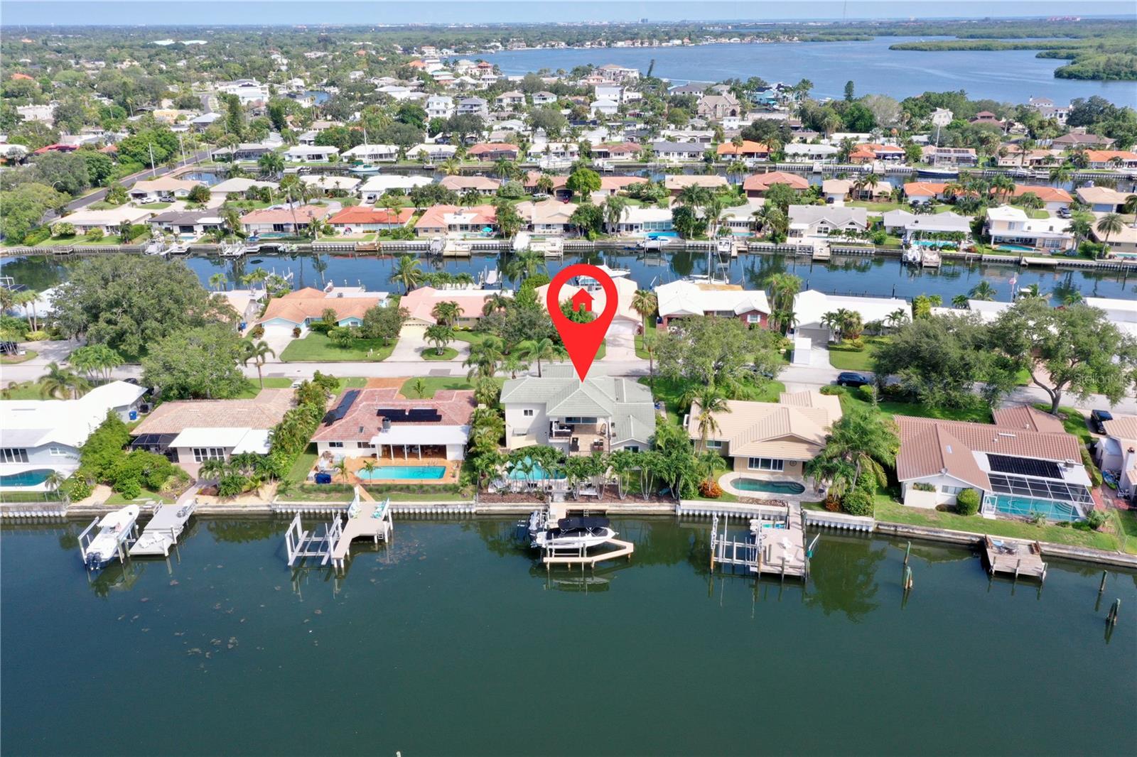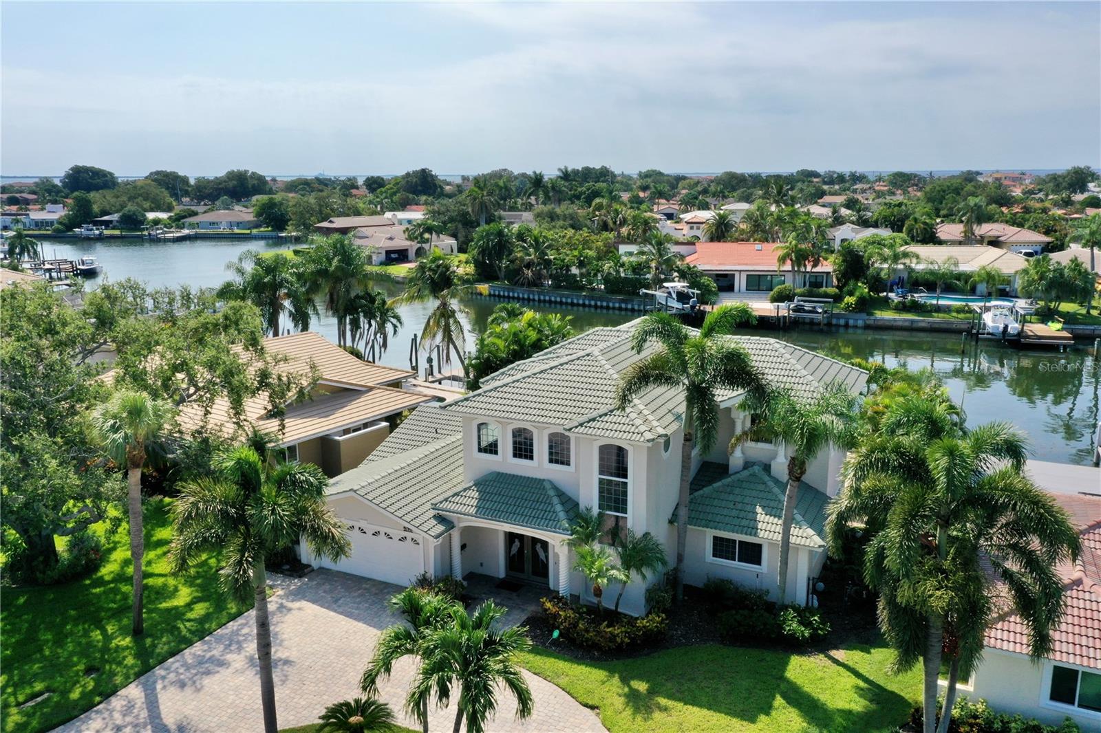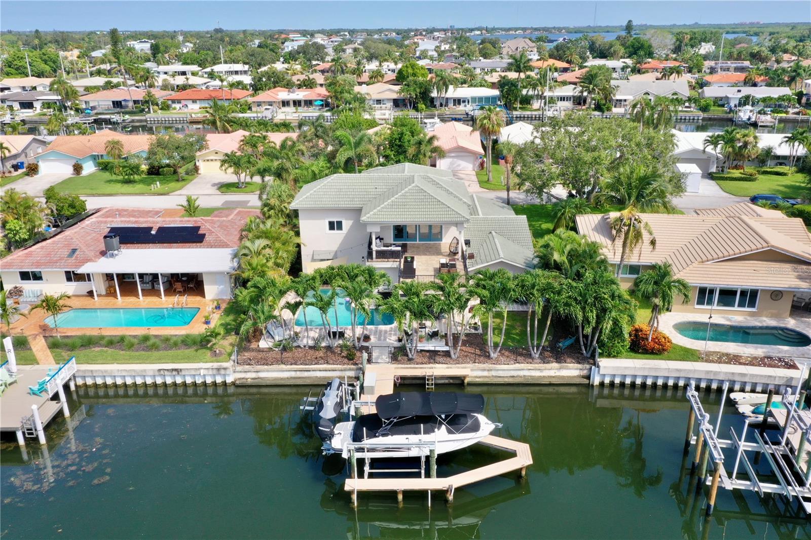 Welcome to your waterfront paradise in Venetian Isles! LIMITED TIME PRICE REDUCTION! The current price reflects the home being sold as-is. Minimal water intrusion from hurricane Helene. Home was dried out and remediated immediately. Remediation includes flooring and drywall removed as well as professionally dried. This stunning Mediterranean-style home is perfectly situated on 74.4 feet of deep sailboat water with no bridges to the Bay or Gulf, offering unparalleled access for boating enthusiasts. Enjoy breathtaking panoramic water views, downtown views, and stunning sunrise views from the large upstairs balcony and backyard living area. As you step into the home, you'll be greeted by the light-filled entrance with soaring ceilings creating a peaceful open and airy feel. The heart of this home is the centrally located kitchen, perfect for everyone to gather. It's a dream for anyone who loves to cook and create, with massive granite countertops, updated stainless steel appliances, and solid wood cabinets. There is plenty of space to cook and enjoy your favorite meals. The kitchen opens up to two large living areas and a breakfast nook, with amazing views of the water. Downstairs, the home has a smart split bedroom plan with 4 bedrooms and 2 full bathrooms. Two of the bedrooms have custom paint and one of them has a murphy bed. Upstairs, you’ll discover a tranquil loft space that seamlessly transitions into the primary suite. With plenty of natural light, Brazilian Cherry Hardwood floors and an open layout, this comfortable space offers a serene environment for any use, whether it’s for work, reading, or simply lounging. The private owner's suite is a truly luxurious retreat. It has two granite vanities, a two-person jetted spa tub, a seamless glass shower, separate toilet and two large walk-in closets. The owner's suite opens to a huge 600 sq ft balcony where you can enjoy both the sunrise and seasonal sunset looking out over your sanctuary. It’s the perfect space for entertaining and enjoying a beverage at the beginning and end of the day. The balcony has both covered and uncovered portions for versatile outdoor enjoyment. The backyard area is perfect for anyone who loves the water. The large dock features two lifts – one for a larger boat and a new jet-ski lift that holds two small watercraft. There's also a glistening, heated saltwater pool surrounded by beautiful pavers. The tropical backyard is great for entertaining with string lights, canopies for shade, and plenty of space to relax and dine outside. The home is situated on a cul-de-sac street and has a U-shaped driveway for extra convenience. Location is everything, and this home delivers. It’s a short boat or bike ride to downtown St. Pete, where you can enjoy all the city has to enjoy. Paddle or boat to Weedon Island for a day of adventure. You might even see dolphins and manatees in your backyard! Recent updates make this home even more special. There's fresh paint inside and out, new ceiling fans, smart locks and lighting systems, recessed lighting in all living areas, and a custom garage with epoxy flooring and cabinets, plus mirrors installed for working out. Additional features include tropical privacy landscaping, hard-wired security cameras, and both tubs in the house are jetted. This home is part of a voluntary HOA with deed restrictions, ensuring a well-maintained community. Elevation Certificate available.