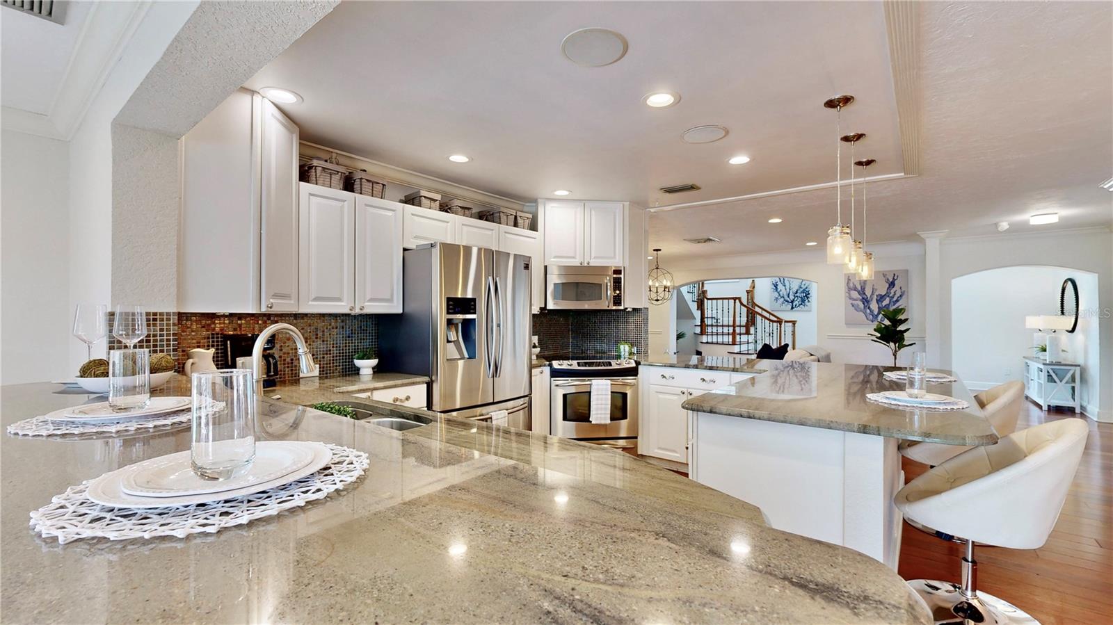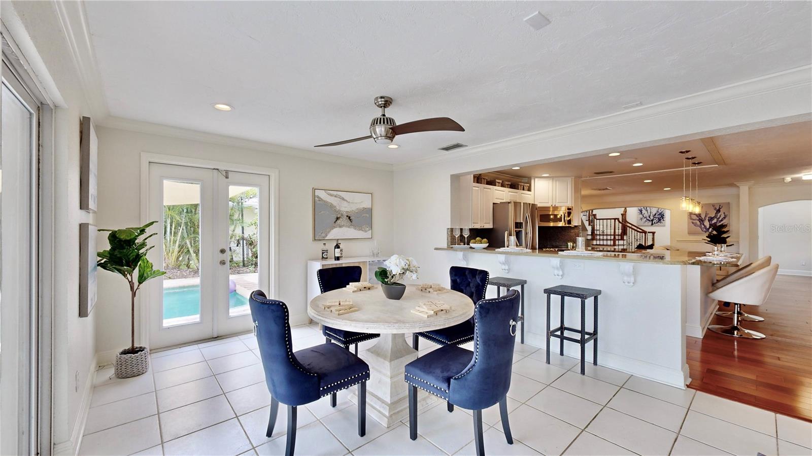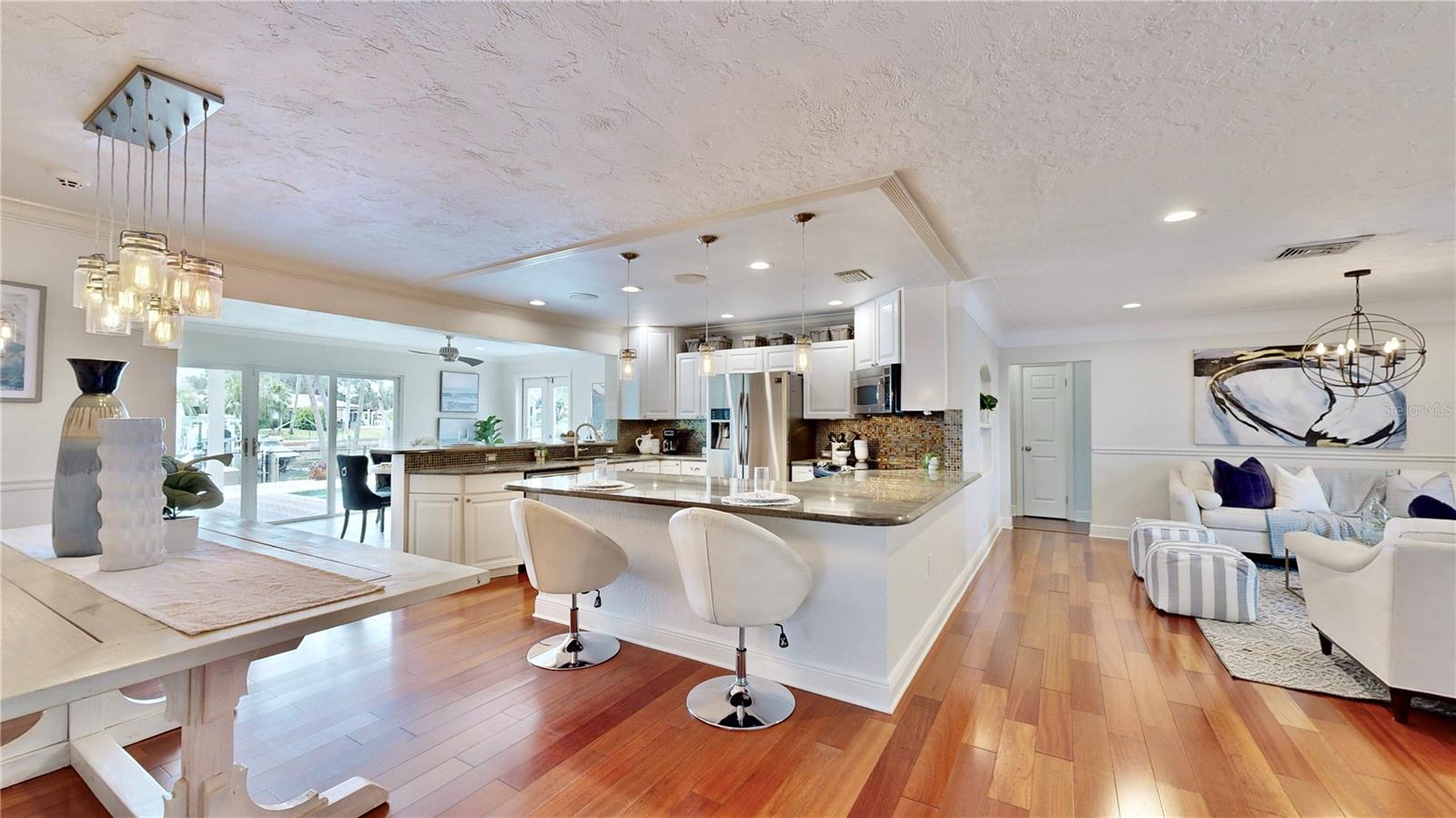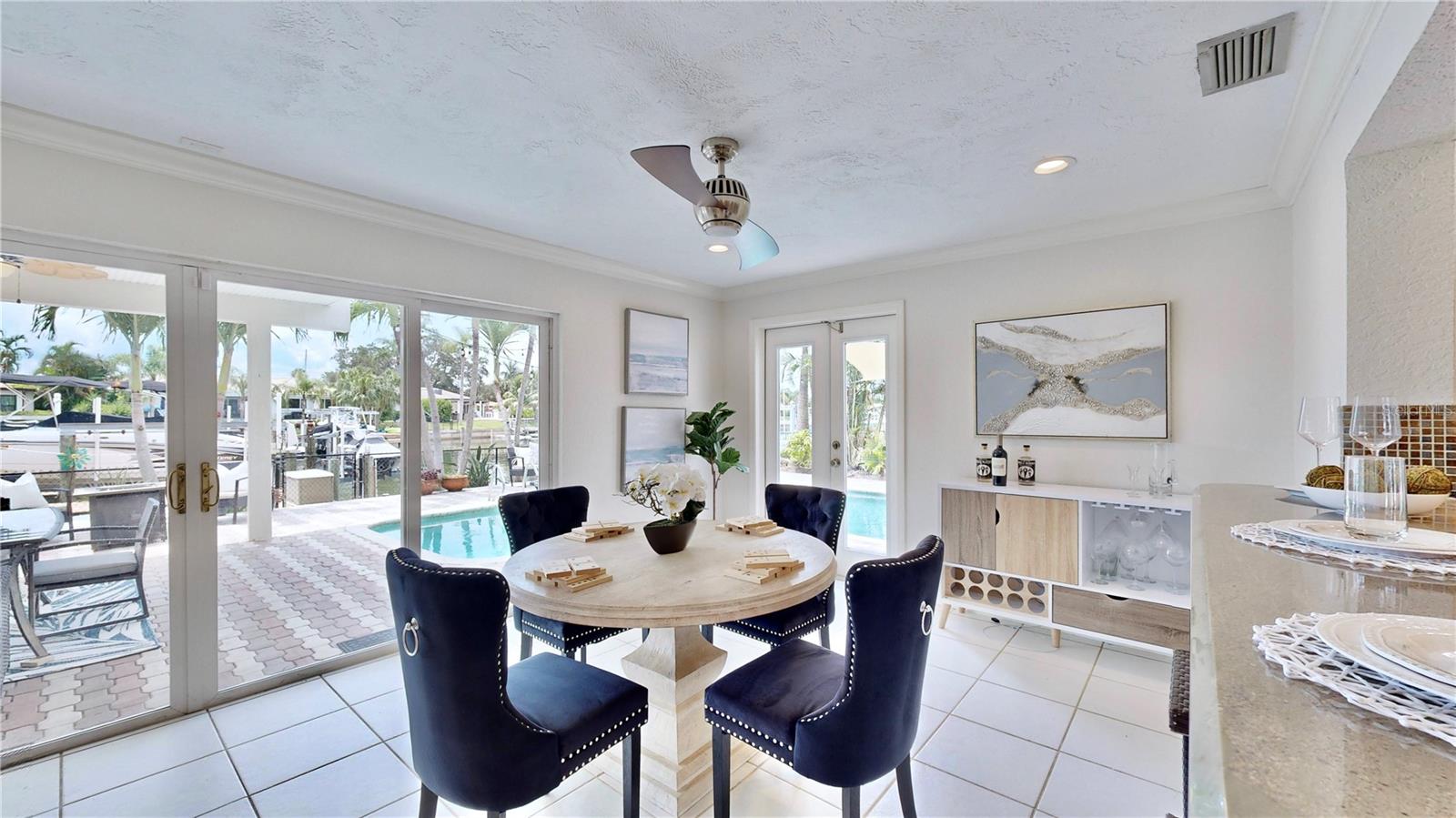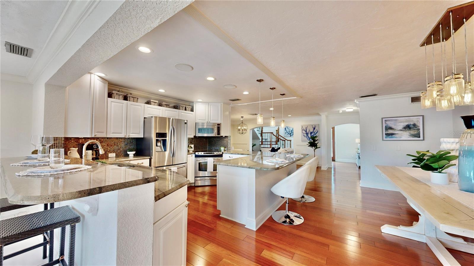 Welcome to your waterfront paradise in Venetian Isles! LIMITED TIME PRICE REDUCTION! The current price reflects the home being sold as-is. Minimal water intrusion from hurricane Helene. Home was dried out and remediated immediately. Remediation includes flooring and drywall removed as well as professionally dried. This stunning Mediterranean-style home is perfectly situated on 74.4 feet of deep sailboat water with no bridges to the Bay or Gulf, offering unparalleled access for boating enthusiasts. Enjoy breathtaking panoramic water views, downtown views, and stunning sunrise views from the large upstairs balcony and backyard living area. As you step into the home, you'll be greeted by the light-filled entrance with soaring ceilings creating a peaceful open and airy feel. The heart of this home is the centrally located kitchen, perfect for everyone to gather. It's a dream for anyone who loves to cook and create, with massive granite countertops, updated stainless steel appliances, and solid wood cabinets. There is plenty of space to cook and enjoy your favorite meals. The kitchen opens up to two large living areas and a breakfast nook, with amazing views of the water. Downstairs, the home has a smart split bedroom plan with 4 bedrooms and 2 full bathrooms. Two of the bedrooms have custom paint and one of them has a murphy bed. Upstairs, you’ll discover a tranquil loft space that seamlessly transitions into the primary suite. With plenty of natural light, Brazilian Cherry Hardwood floors and an open layout, this comfortable space offers a serene environment for any use, whether it’s for work, reading, or simply lounging. The private owner's suite is a truly luxurious retreat. It has two granite vanities, a two-person jetted spa tub, a seamless glass shower, separate toilet and two large walk-in closets. The owner's suite opens to a huge 600 sq ft balcony where you can enjoy both the sunrise and seasonal sunset looking out over your sanctuary. It’s the perfect space for entertaining and enjoying a beverage at the beginning and end of the day. The balcony has both covered and uncovered portions for versatile outdoor enjoyment. The backyard area is perfect for anyone who loves the water. The large dock features two lifts – one for a larger boat and a new jet-ski lift that holds two small watercraft. There's also a glistening, heated saltwater pool surrounded by beautiful pavers. The tropical backyard is great for entertaining with string lights, canopies for shade, and plenty of space to relax and dine outside. The home is situated on a cul-de-sac street and has a U-shaped driveway for extra convenience. Location is everything, and this home delivers. It’s a short boat or bike ride to downtown St. Pete, where you can enjoy all the city has to enjoy. Paddle or boat to Weedon Island for a day of adventure. You might even see dolphins and manatees in your backyard! Recent updates make this home even more special. There's fresh paint inside and out, new ceiling fans, smart locks and lighting systems, recessed lighting in all living areas, and a custom garage with epoxy flooring and cabinets, plus mirrors installed for working out. Additional features include tropical privacy landscaping, hard-wired security cameras, and both tubs in the house are jetted. This home is part of a voluntary HOA with deed restrictions, ensuring a well-maintained community. Elevation Certificate available.