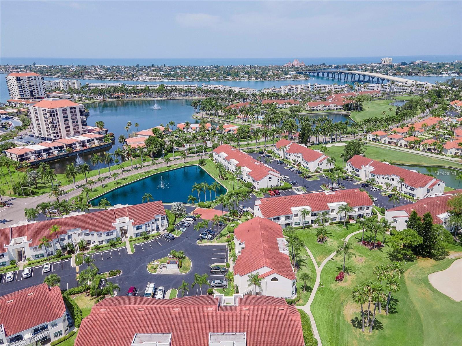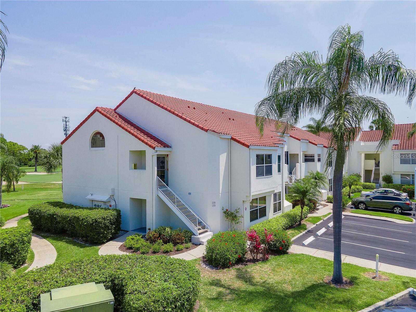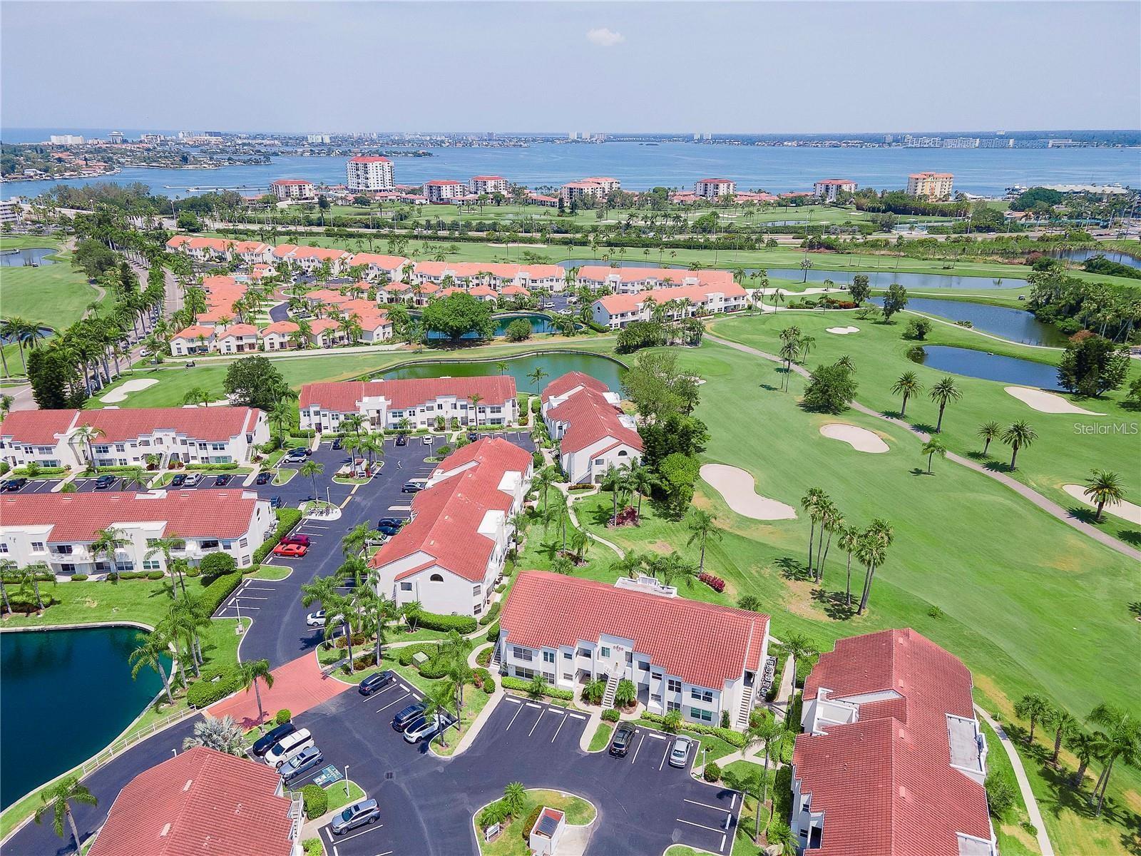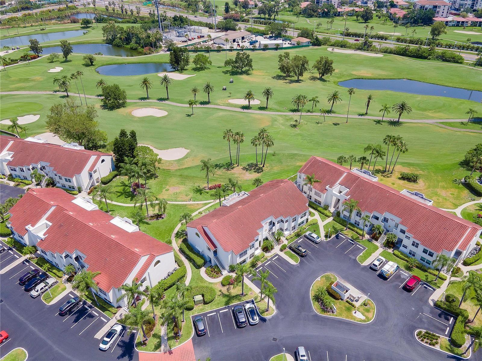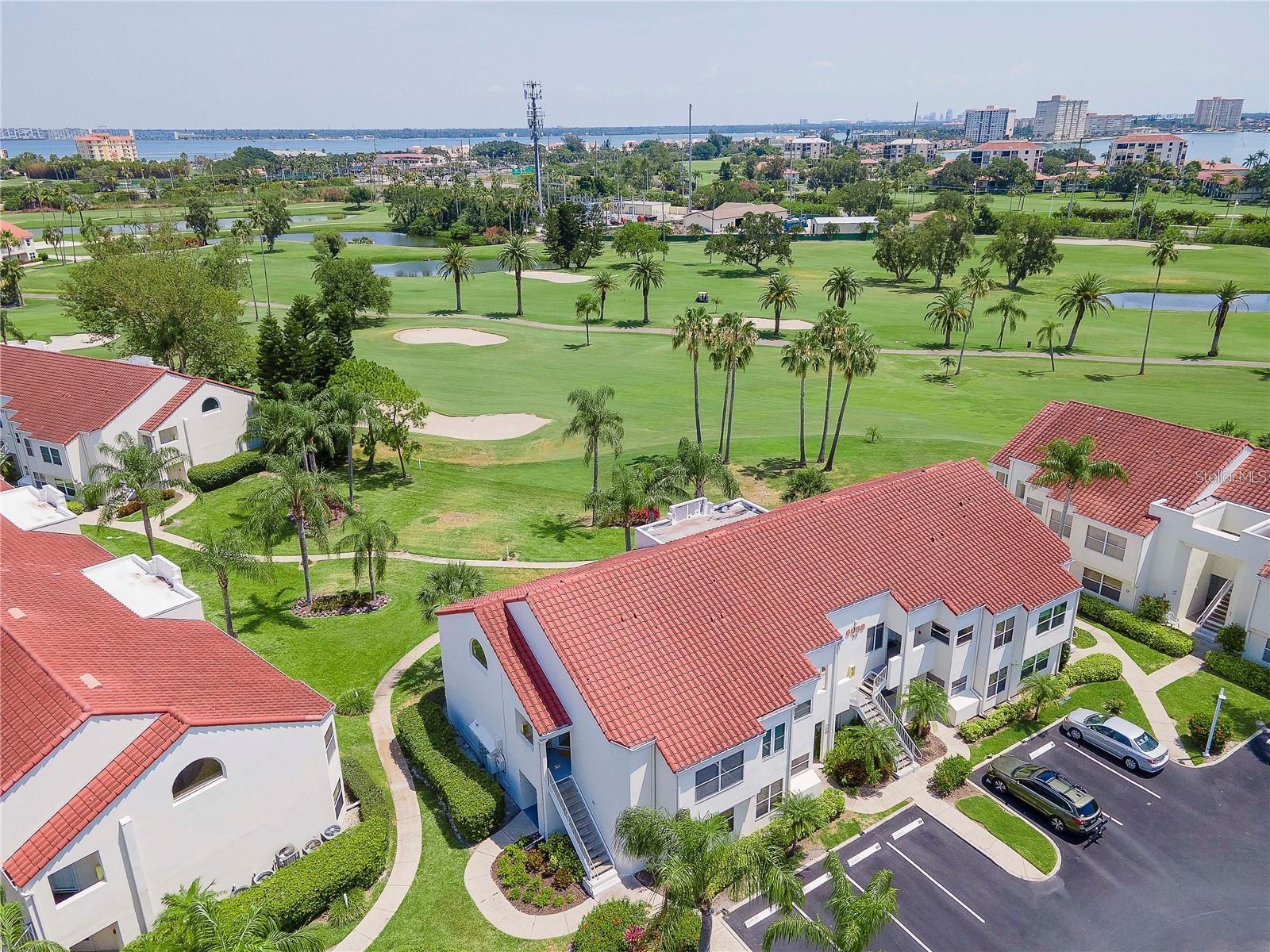 Welcome to Isla Del Sol. This community lives up to its name as an Island in the Sun! A planned development with tropical landscaping, winding paths and community pools - surrounded by a championship golf course. As soon as you enter this CORNER UNIT condominium, you are drawn to the incredible Golf Course Views! Soaring Vaulted ceilings create a large bright space in the open floor plan. The kitchen has newer appliances and plenty of pantry storage. Glass sliders from the living space lead you directly to your personal patio with fairway views, the perfect spot for sipping your morning coffee. Ideally located off the 18-hole golf course, the balcony is secluded among the lush landscape where you can maintain the entertaining views the golf course has to offer while staying out of the direct path of golf balls. Parquet flooring throughout the entire residence has a beachy blonde finish - easily maintain this elegant and elevated look. The primary suite has more golf course views, high ceilings and ensuite bath with walk-in closet. The primary bath has double vanity and a large tub with shower. The split bedroom plan offers privacy for hosts and guests with the second bedroom on the opposite side of the home. This spacious second bedroom has a full wall of built-in shelving, a walk-in closet and ensuite bath. Laundry and linen closets offer additional convenience and storage space. Take the winding walkway from your private staircase to the heated pool and spa. Become a member of Isla Del Sol Yacht and Country Club and enjoy the 18-hole championship golf course, 8 clay tennis courts, 6 pickleball courts, 76 slip yacht harbor, dining facilities, fitness center and the Club Pool overlooking Boca Ciega Bay. If this purchase is to be part of your investment portfolio, the weekly rental restrictions make this a very lucrative venture (7 day minimum). One reserved parking space, plenty of guest parking and an EV charging station. Located in the enclave called Vista Verde East, this area of Isla del Sol is just 10 minutes to anywhere! Over the Pinellas Bayway South to Tierra Verde and the pristine shoreline of Ft. Desoto Park, Pinellas Bayway West to the warm Gulf waters of St. Pete Beach, or East toward Downtown St. Petersburg with its fine dining, museums, micro-breweries and shops! Just a short 25-minute drive to Tampa International Airport or over the Skyway to Bradenton and Sarasota. Enjoy the entertainment of FIVE Professional Sports Teams – Tampa Bay Buccaneers Football, Tampa Bay Lightning Hockey, Tampa Bay Rays Baseball and The Rowdies and Suns Soccer.