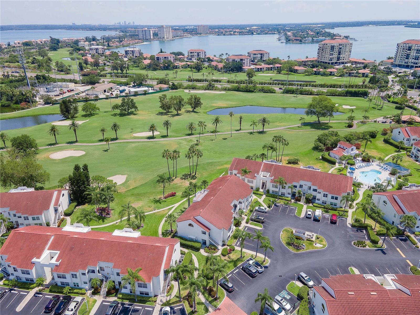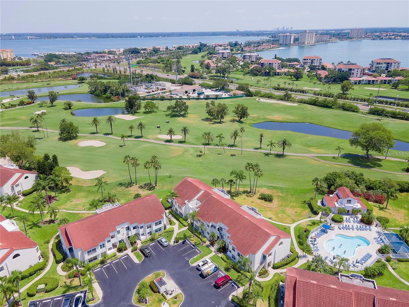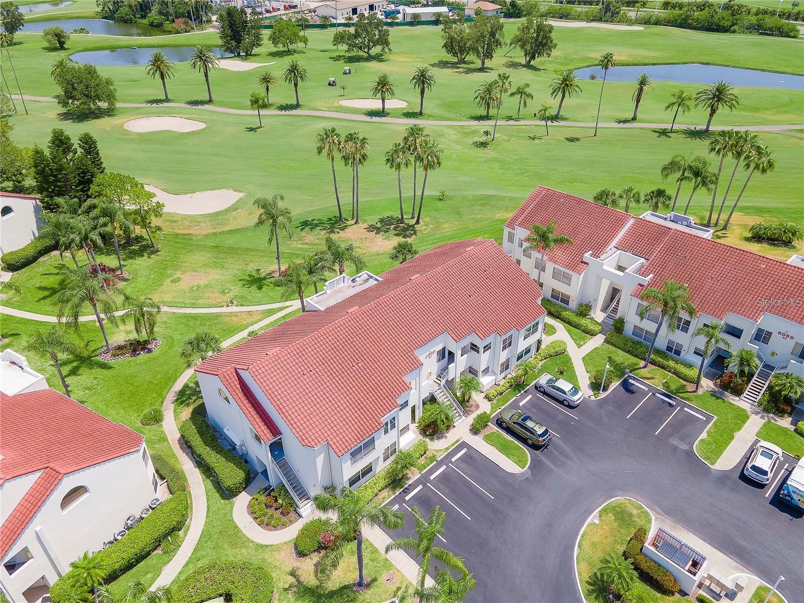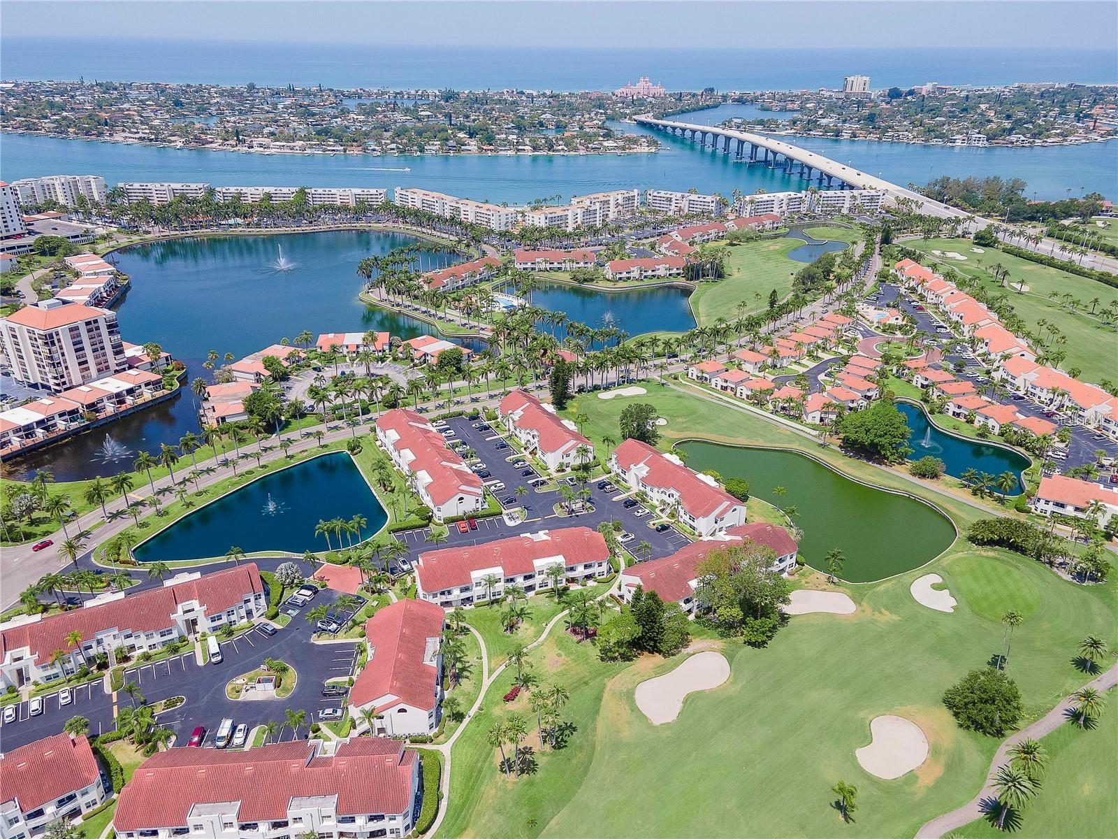 Welcome to Isla Del Sol. This community lives up to its name as an Island in the Sun! A planned development with tropical landscaping, winding paths and community pools - surrounded by a championship golf course. As soon as you enter this CORNER UNIT condominium, you are drawn to the incredible Golf Course Views! Soaring Vaulted ceilings create a large bright space in the open floor plan. The kitchen has newer appliances and plenty of pantry storage. Glass sliders from the living space lead you directly to your personal patio with fairway views, the perfect spot for sipping your morning coffee. Ideally located off the 18-hole golf course, the balcony is secluded among the lush landscape where you can maintain the entertaining views the golf course has to offer while staying out of the direct path of golf balls. Parquet flooring throughout the entire residence has a beachy blonde finish - easily maintain this elegant and elevated look. The primary suite has more golf course views, high ceilings and ensuite bath with walk-in closet. The primary bath has double vanity and a large tub with shower. The split bedroom plan offers privacy for hosts and guests with the second bedroom on the opposite side of the home. This spacious second bedroom has a full wall of built-in shelving, a walk-in closet and ensuite bath. Laundry and linen closets offer additional convenience and storage space. Take the winding walkway from your private staircase to the heated pool and spa. Become a member of Isla Del Sol Yacht and Country Club and enjoy the 18-hole championship golf course, 8 clay tennis courts, 6 pickleball courts, 76 slip yacht harbor, dining facilities, fitness center and the Club Pool overlooking Boca Ciega Bay. If this purchase is to be part of your investment portfolio, the weekly rental restrictions make this a very lucrative venture (7 day minimum). One reserved parking space, plenty of guest parking and an EV charging station. Located in the enclave called Vista Verde East, this area of Isla del Sol is just 10 minutes to anywhere! Over the Pinellas Bayway South to Tierra Verde and the pristine shoreline of Ft. Desoto Park, Pinellas Bayway West to the warm Gulf waters of St. Pete Beach, or East toward Downtown St. Petersburg with its fine dining, museums, micro-breweries and shops! Just a short 25-minute drive to Tampa International Airport or over the Skyway to Bradenton and Sarasota. Enjoy the entertainment of FIVE Professional Sports Teams – Tampa Bay Buccaneers Football, Tampa Bay Lightning Hockey, Tampa Bay Rays Baseball and The Rowdies and Suns Soccer.