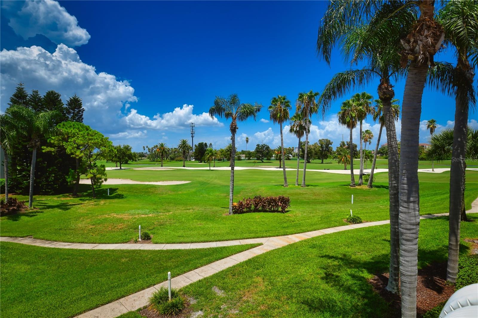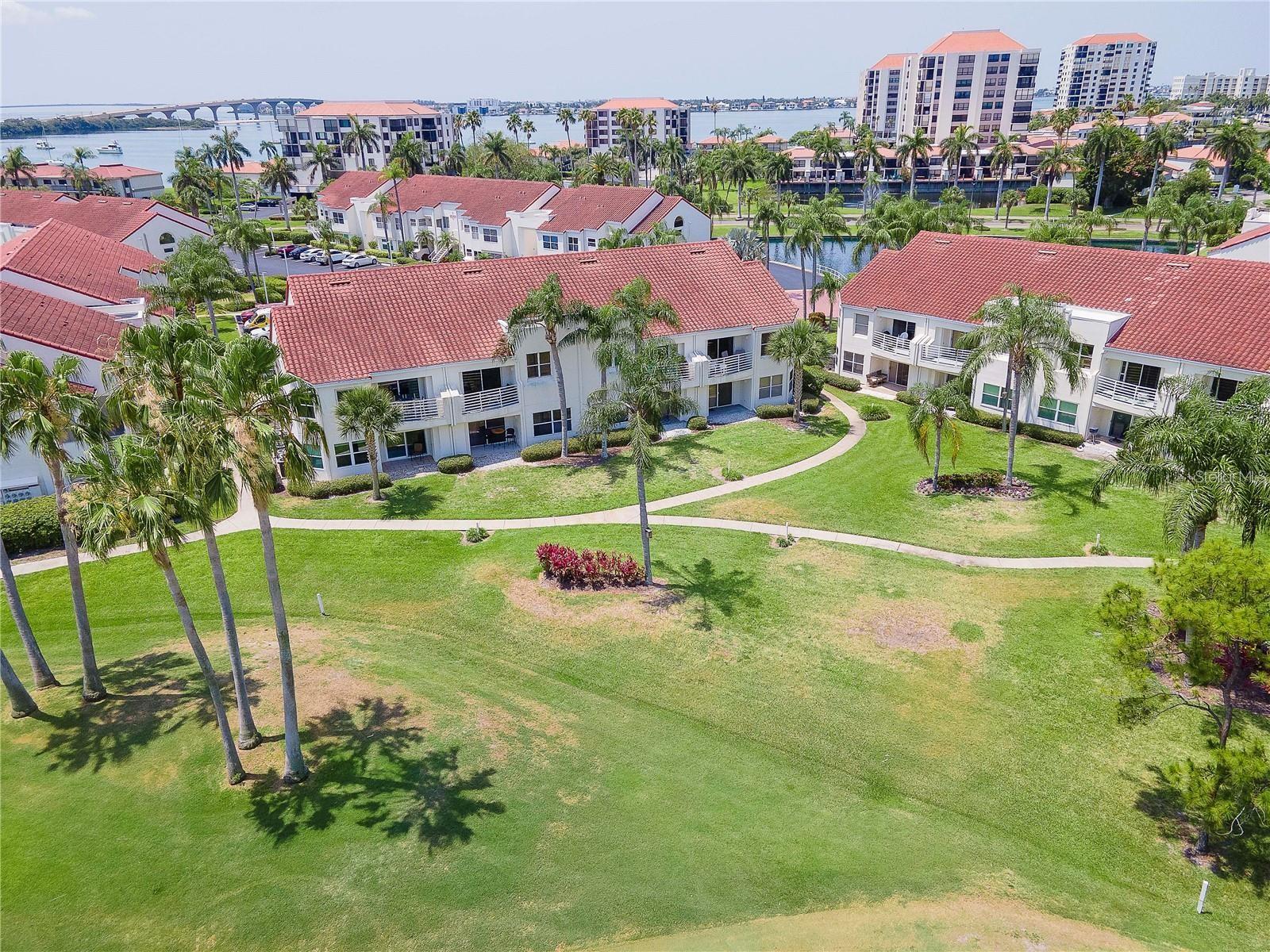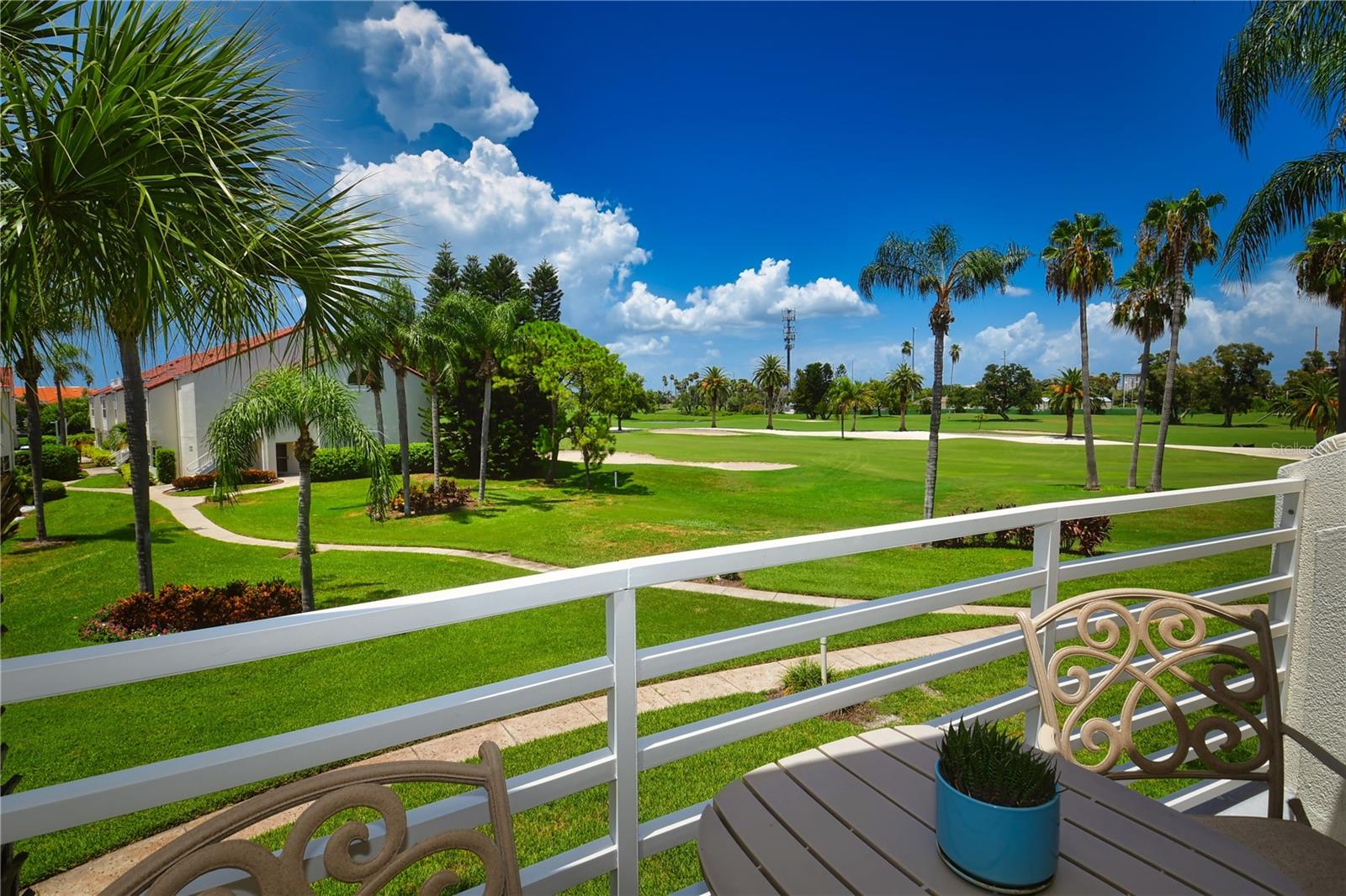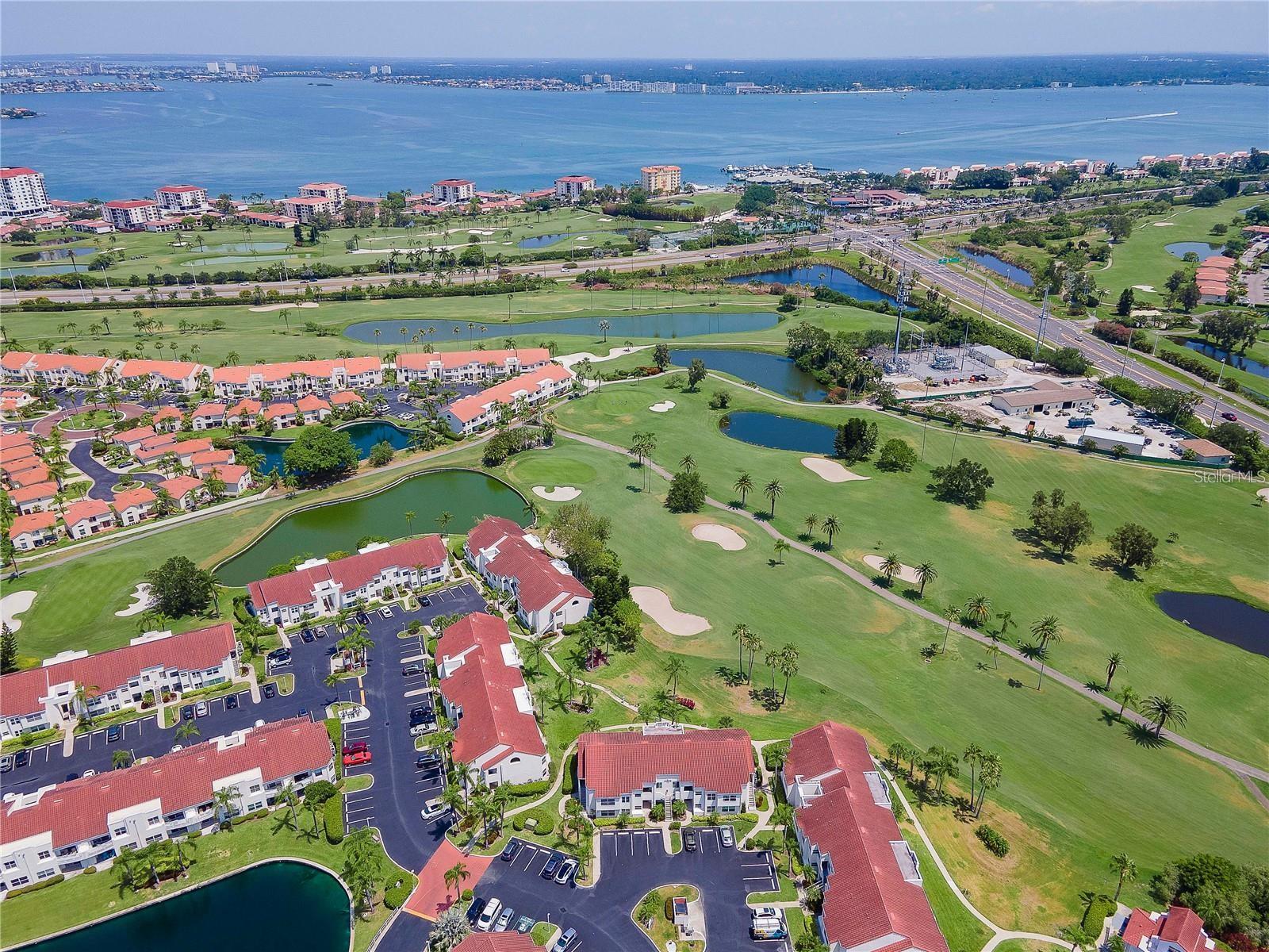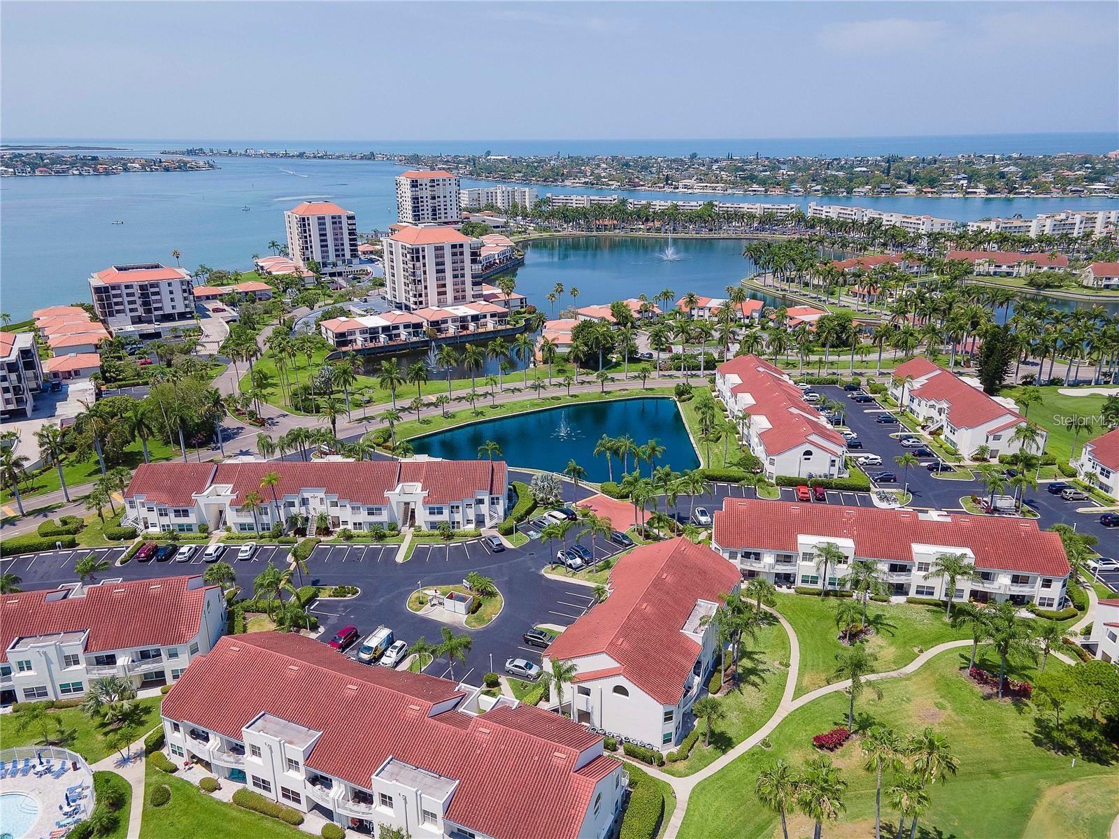 Welcome to Isla Del Sol. This community lives up to its name as an Island in the Sun! A planned development with tropical landscaping, winding paths and community pools - surrounded by a championship golf course. As soon as you enter this CORNER UNIT condominium, you are drawn to the incredible Golf Course Views! Soaring Vaulted ceilings create a large bright space in the open floor plan. The kitchen has newer appliances and plenty of pantry storage. Glass sliders from the living space lead you directly to your personal patio with fairway views, the perfect spot for sipping your morning coffee. Ideally located off the 18-hole golf course, the balcony is secluded among the lush landscape where you can maintain the entertaining views the golf course has to offer while staying out of the direct path of golf balls. Parquet flooring throughout the entire residence has a beachy blonde finish - easily maintain this elegant and elevated look. The primary suite has more golf course views, high ceilings and ensuite bath with walk-in closet. The primary bath has double vanity and a large tub with shower. The split bedroom plan offers privacy for hosts and guests with the second bedroom on the opposite side of the home. This spacious second bedroom has a full wall of built-in shelving, a walk-in closet and ensuite bath. Laundry and linen closets offer additional convenience and storage space. Take the winding walkway from your private staircase to the heated pool and spa. Become a member of Isla Del Sol Yacht and Country Club and enjoy the 18-hole championship golf course, 8 clay tennis courts, 6 pickleball courts, 76 slip yacht harbor, dining facilities, fitness center and the Club Pool overlooking Boca Ciega Bay. If this purchase is to be part of your investment portfolio, the weekly rental restrictions make this a very lucrative venture (7 day minimum). One reserved parking space, plenty of guest parking and an EV charging station. Located in the enclave called Vista Verde East, this area of Isla del Sol is just 10 minutes to anywhere! Over the Pinellas Bayway South to Tierra Verde and the pristine shoreline of Ft. Desoto Park, Pinellas Bayway West to the warm Gulf waters of St. Pete Beach, or East toward Downtown St. Petersburg with its fine dining, museums, micro-breweries and shops! Just a short 25-minute drive to Tampa International Airport or over the Skyway to Bradenton and Sarasota. Enjoy the entertainment of FIVE Professional Sports Teams – Tampa Bay Buccaneers Football, Tampa Bay Lightning Hockey, Tampa Bay Rays Baseball and The Rowdies and Suns Soccer.