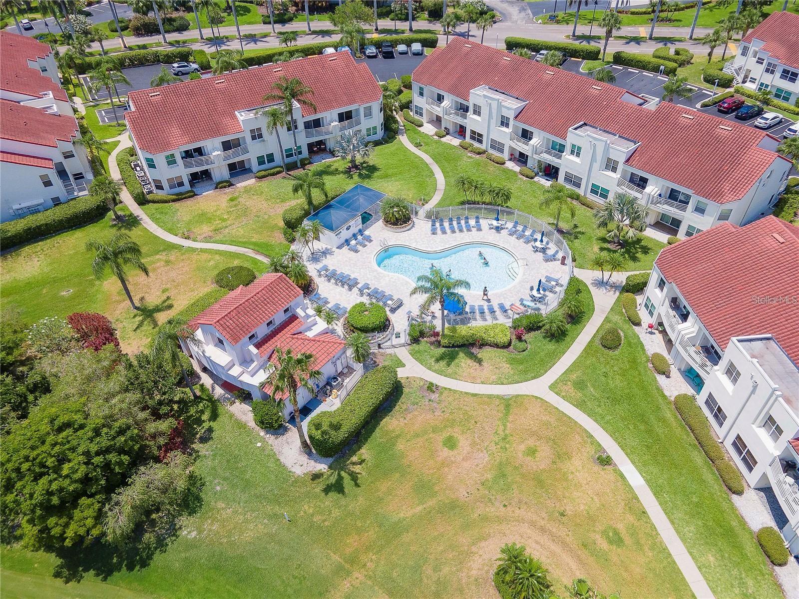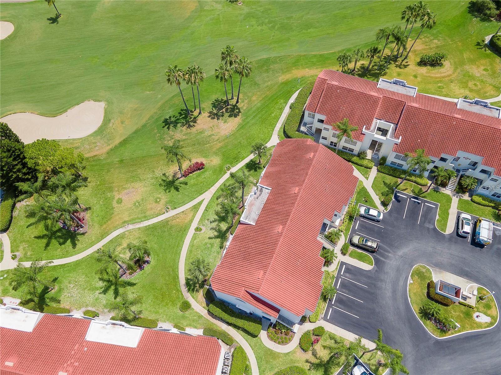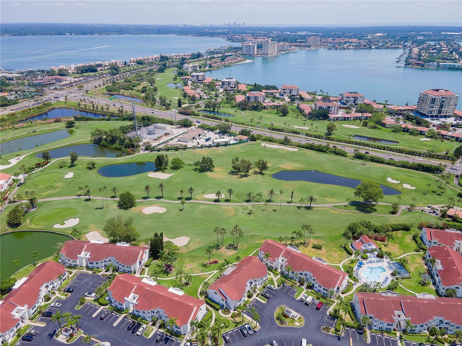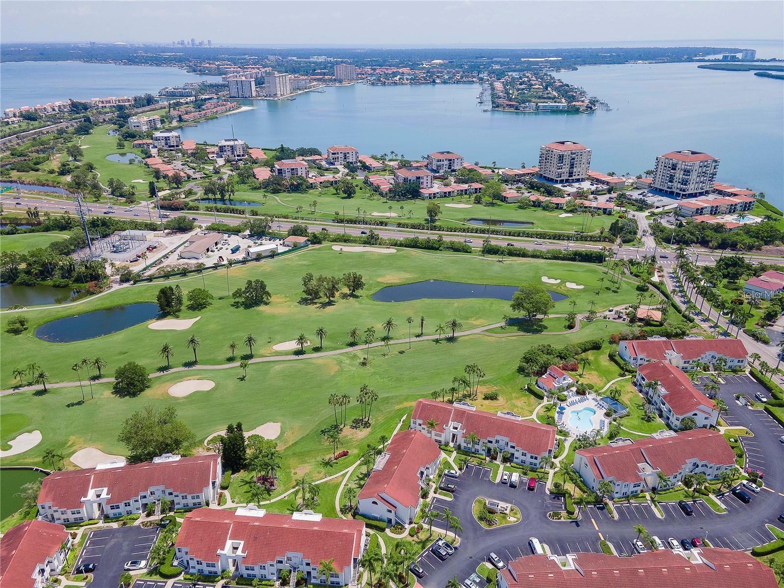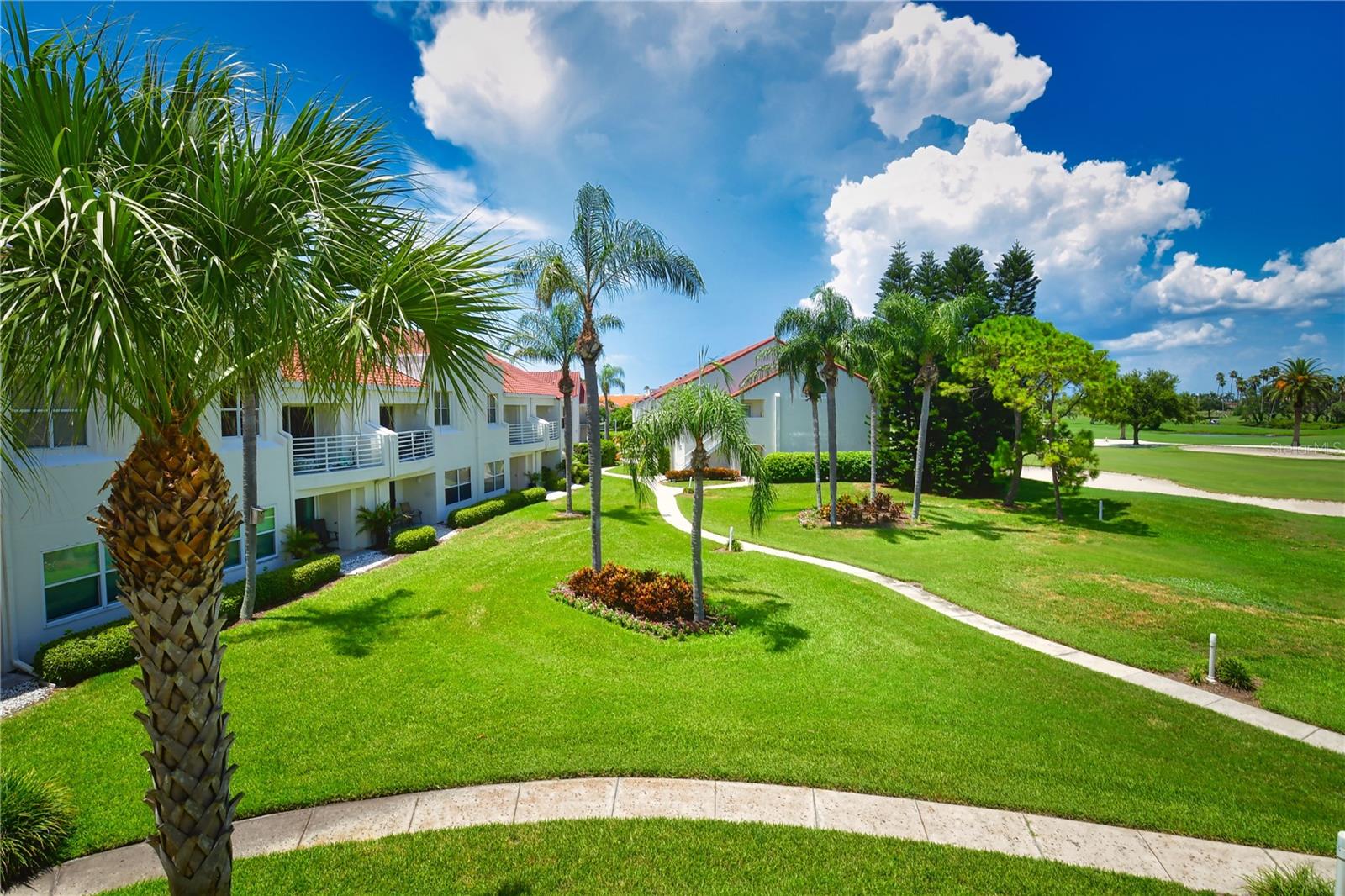 Welcome to Isla Del Sol. This community lives up to its name as an Island in the Sun! A planned development with tropical landscaping, winding paths and community pools - surrounded by a championship golf course. As soon as you enter this CORNER UNIT condominium, you are drawn to the incredible Golf Course Views! Soaring Vaulted ceilings create a large bright space in the open floor plan. The kitchen has newer appliances and plenty of pantry storage. Glass sliders from the living space lead you directly to your personal patio with fairway views, the perfect spot for sipping your morning coffee. Ideally located off the 18-hole golf course, the balcony is secluded among the lush landscape where you can maintain the entertaining views the golf course has to offer while staying out of the direct path of golf balls. Parquet flooring throughout the entire residence has a beachy blonde finish - easily maintain this elegant and elevated look. The primary suite has more golf course views, high ceilings and ensuite bath with walk-in closet. The primary bath has double vanity and a large tub with shower. The split bedroom plan offers privacy for hosts and guests with the second bedroom on the opposite side of the home. This spacious second bedroom has a full wall of built-in shelving, a walk-in closet and ensuite bath. Laundry and linen closets offer additional convenience and storage space. Take the winding walkway from your private staircase to the heated pool and spa. Become a member of Isla Del Sol Yacht and Country Club and enjoy the 18-hole championship golf course, 8 clay tennis courts, 6 pickleball courts, 76 slip yacht harbor, dining facilities, fitness center and the Club Pool overlooking Boca Ciega Bay. If this purchase is to be part of your investment portfolio, the weekly rental restrictions make this a very lucrative venture (7 day minimum). One reserved parking space, plenty of guest parking and an EV charging station. Located in the enclave called Vista Verde East, this area of Isla del Sol is just 10 minutes to anywhere! Over the Pinellas Bayway South to Tierra Verde and the pristine shoreline of Ft. Desoto Park, Pinellas Bayway West to the warm Gulf waters of St. Pete Beach, or East toward Downtown St. Petersburg with its fine dining, museums, micro-breweries and shops! Just a short 25-minute drive to Tampa International Airport or over the Skyway to Bradenton and Sarasota. Enjoy the entertainment of FIVE Professional Sports Teams – Tampa Bay Buccaneers Football, Tampa Bay Lightning Hockey, Tampa Bay Rays Baseball and The Rowdies and Suns Soccer.