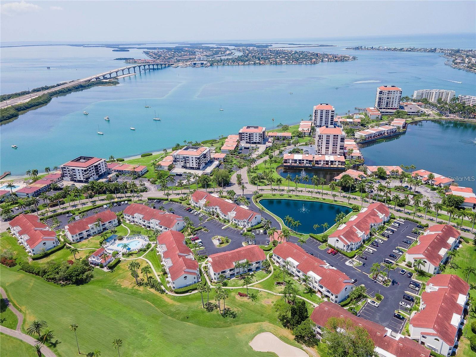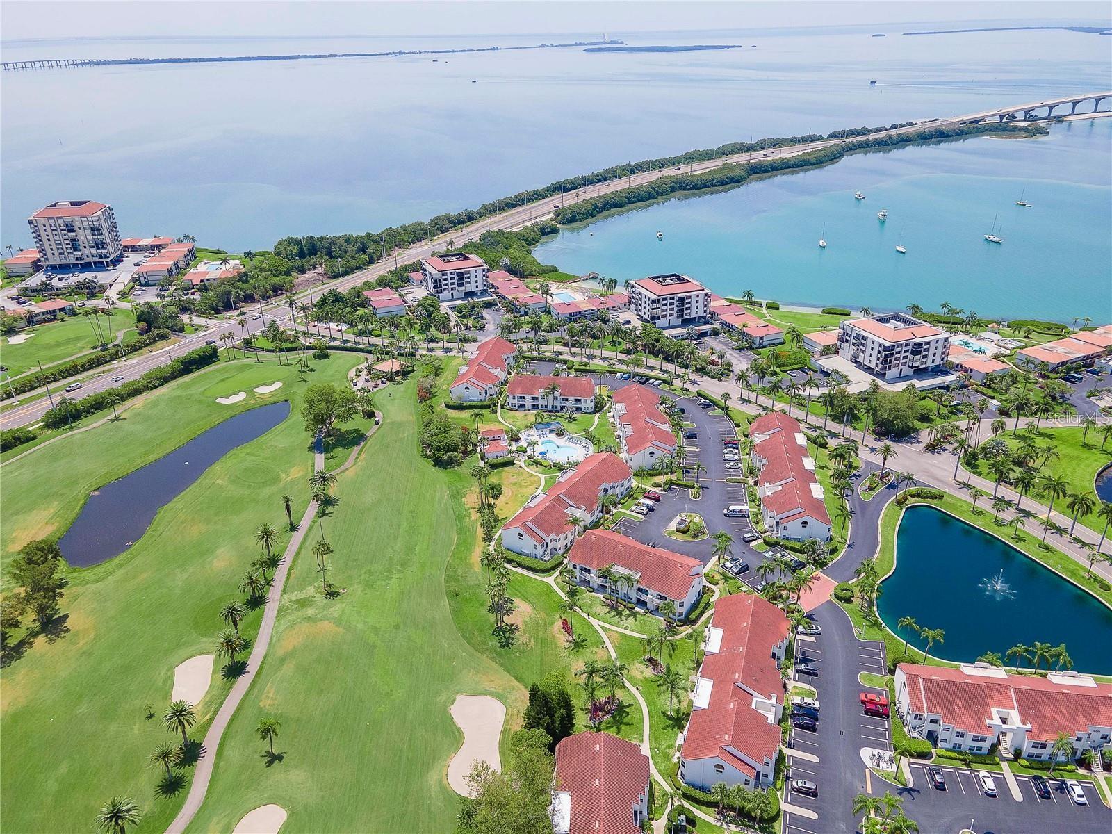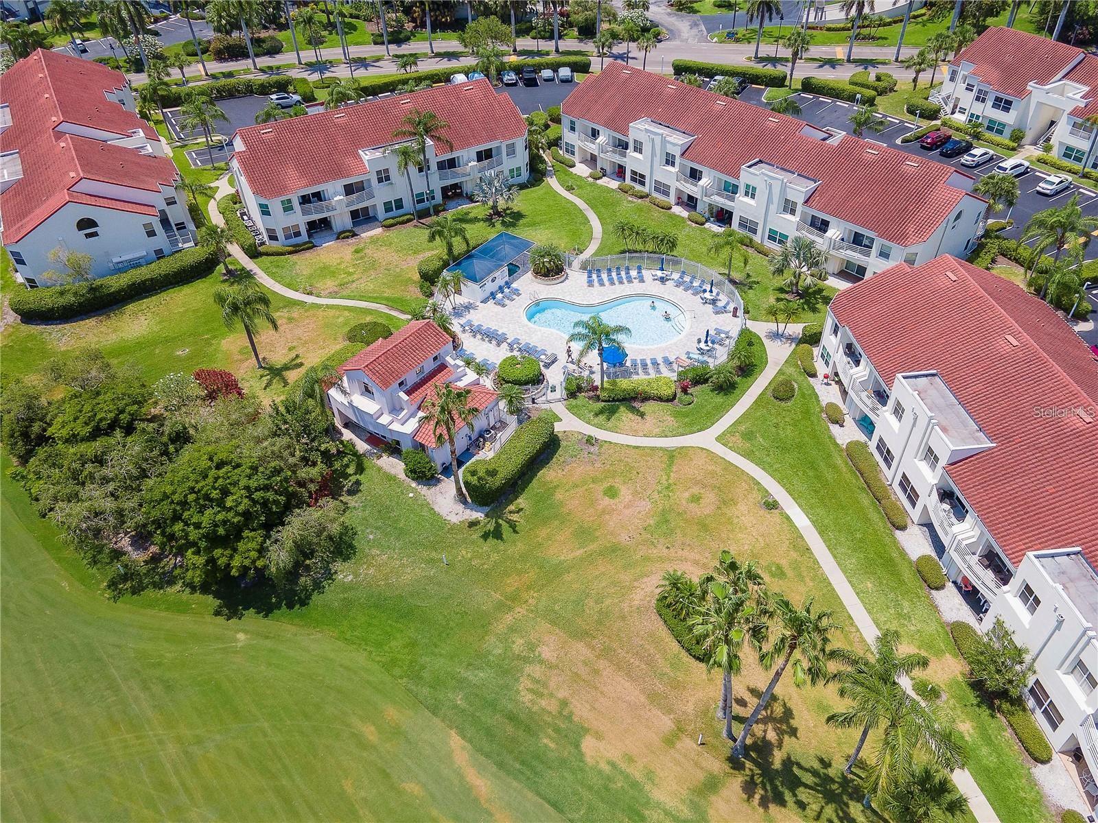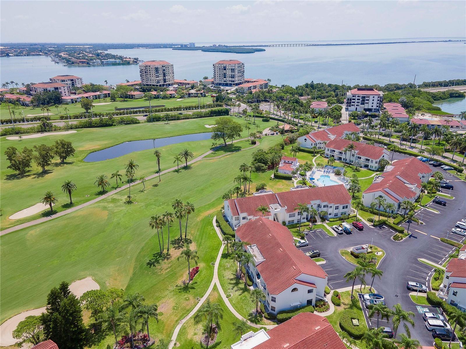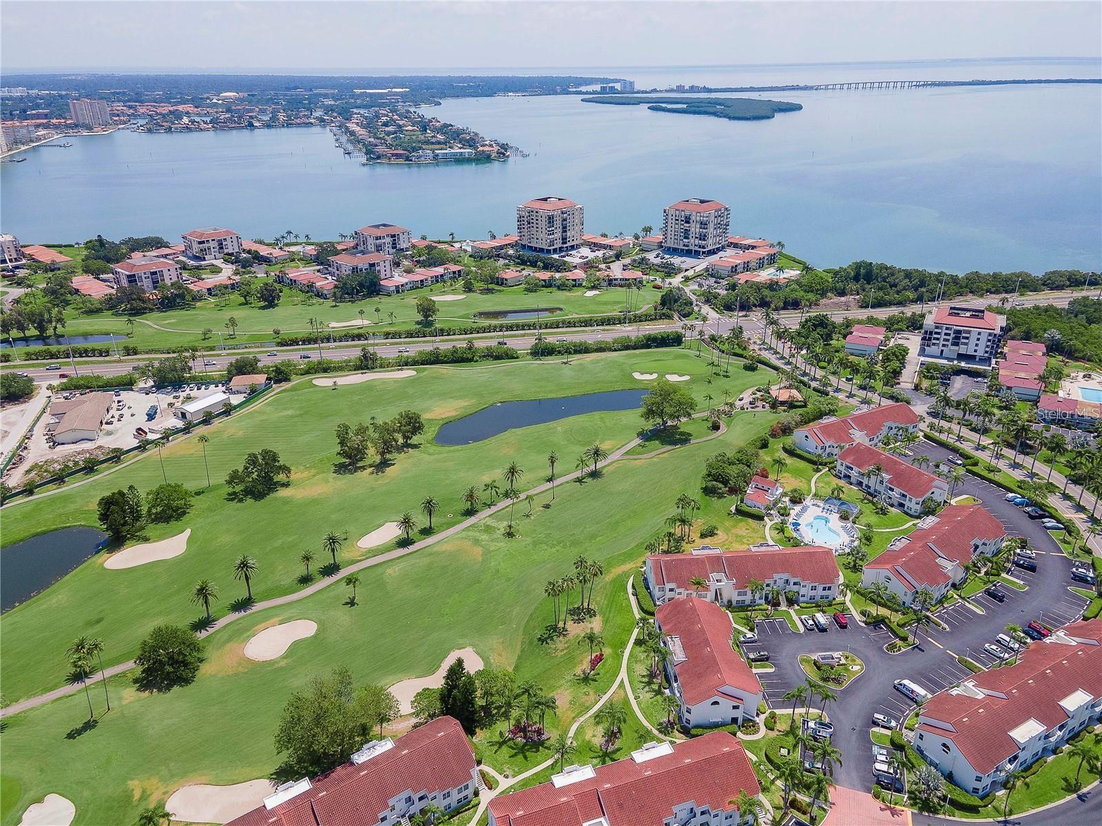 Welcome to Isla Del Sol. This community lives up to its name as an Island in the Sun! A planned development with tropical landscaping, winding paths and community pools - surrounded by a championship golf course. As soon as you enter this CORNER UNIT condominium, you are drawn to the incredible Golf Course Views! Soaring Vaulted ceilings create a large bright space in the open floor plan. The kitchen has newer appliances and plenty of pantry storage. Glass sliders from the living space lead you directly to your personal patio with fairway views, the perfect spot for sipping your morning coffee. Ideally located off the 18-hole golf course, the balcony is secluded among the lush landscape where you can maintain the entertaining views the golf course has to offer while staying out of the direct path of golf balls. Parquet flooring throughout the entire residence has a beachy blonde finish - easily maintain this elegant and elevated look. The primary suite has more golf course views, high ceilings and ensuite bath with walk-in closet. The primary bath has double vanity and a large tub with shower. The split bedroom plan offers privacy for hosts and guests with the second bedroom on the opposite side of the home. This spacious second bedroom has a full wall of built-in shelving, a walk-in closet and ensuite bath. Laundry and linen closets offer additional convenience and storage space. Take the winding walkway from your private staircase to the heated pool and spa. Become a member of Isla Del Sol Yacht and Country Club and enjoy the 18-hole championship golf course, 8 clay tennis courts, 6 pickleball courts, 76 slip yacht harbor, dining facilities, fitness center and the Club Pool overlooking Boca Ciega Bay. If this purchase is to be part of your investment portfolio, the weekly rental restrictions make this a very lucrative venture (7 day minimum). One reserved parking space, plenty of guest parking and an EV charging station. Located in the enclave called Vista Verde East, this area of Isla del Sol is just 10 minutes to anywhere! Over the Pinellas Bayway South to Tierra Verde and the pristine shoreline of Ft. Desoto Park, Pinellas Bayway West to the warm Gulf waters of St. Pete Beach, or East toward Downtown St. Petersburg with its fine dining, museums, micro-breweries and shops! Just a short 25-minute drive to Tampa International Airport or over the Skyway to Bradenton and Sarasota. Enjoy the entertainment of FIVE Professional Sports Teams – Tampa Bay Buccaneers Football, Tampa Bay Lightning Hockey, Tampa Bay Rays Baseball and The Rowdies and Suns Soccer.