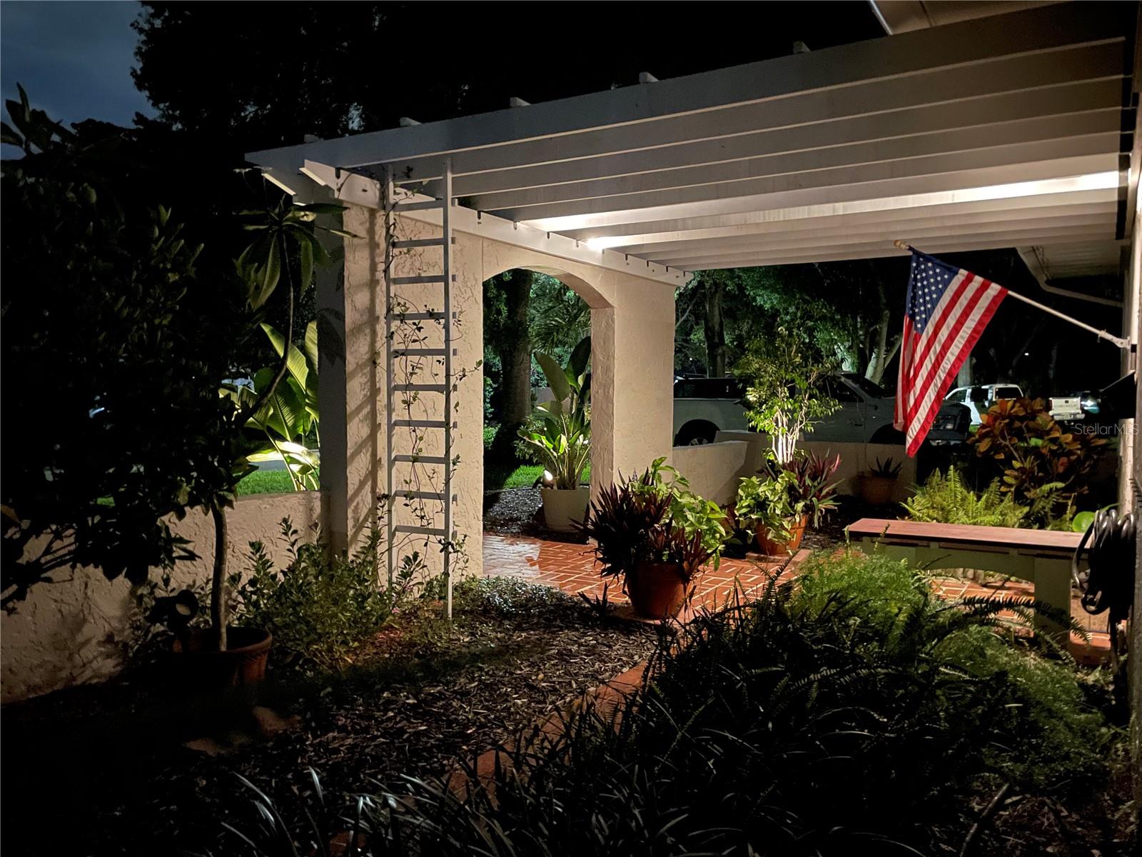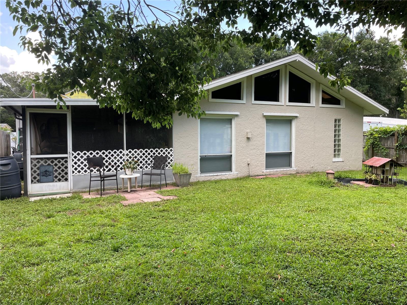 NO STORM DAMAGE. NO FLOOD ISSUES. HIGH AND DRY. Located in one of St. Petersburg's most desirable FLOOD ZONE X neighborhoods with several new high-end luxury homes being built nearby. This unique Mid-Century Spanish/Mission Style home blends traditional elements with modern upgrades. When you enter this one-of-a-kind home through the brick courtyard under the custom pergola, you will find two distinct living areas. One has a living room, two bedrooms and a full bath. The second area features an open family and dining room with dramatic cathedral ceilings, gable windows and skylights along with the huge primary suite including a jetted tub, skylights and plenty of closets. All of this is centered around the heart of the home, which is the modern upgraded kitchen. The split plan affords privacy and a multitude of uses to suit your lifestyle including dual zone air conditioning and separate entrances. With the addition of a kitchenette, the front area could easily be converted to a mother-in-law suite. Step outside the family room to a large screened porch and into a yard with room for a pool, garage, ADU or both. Outside amenities include a courtyard entrance, cozy side patio, built-in-closets on the side of the house and a 10x10 aluminum shed for your yard tools and/or toys. Recent upgrades include complete kitchen with all-wood cabinets, LG stainless smart appliances, custom Dolomite countertops, crown molding, easy-care Luxury Vinyl Plank flooring and 5 1/2" all-wood baseboards throughout the entire home, LED ceiling lighting with dimmers, new ceiling fans in primary bedroom and living room, interior/exterior paint, top down-bottom-up custom window treatments, roof 2016, one a/c system 2016. Second a/c is older, but well-maintained and frosty cold. While most of the home has been upgraded or freshened, the laundry room could use some attention and this is reflected in the price. Close to all that makes St. Petersburg special, it's a short drive to the vibrant downtown with restaurants, museums and galleries, the award winning, sparkling Gulf Beaches, Interstates, Tampa International and St. Pete/Clearwater airports. Porch photo has been virtually staged.