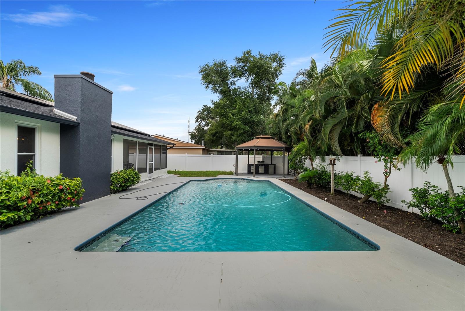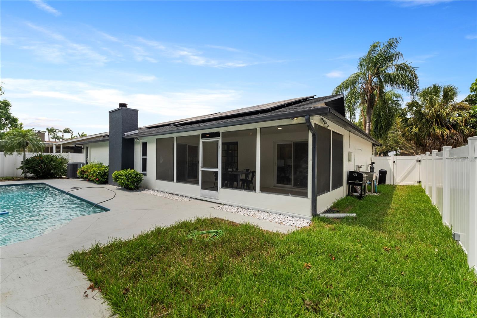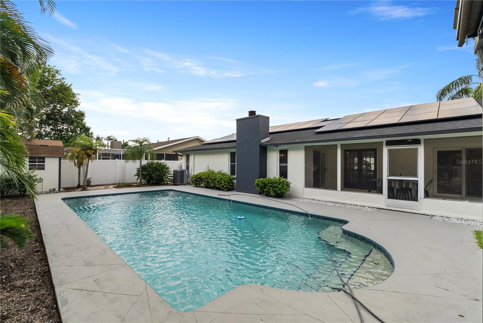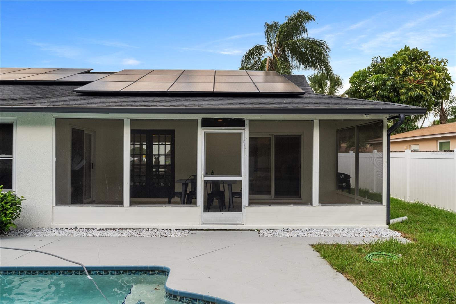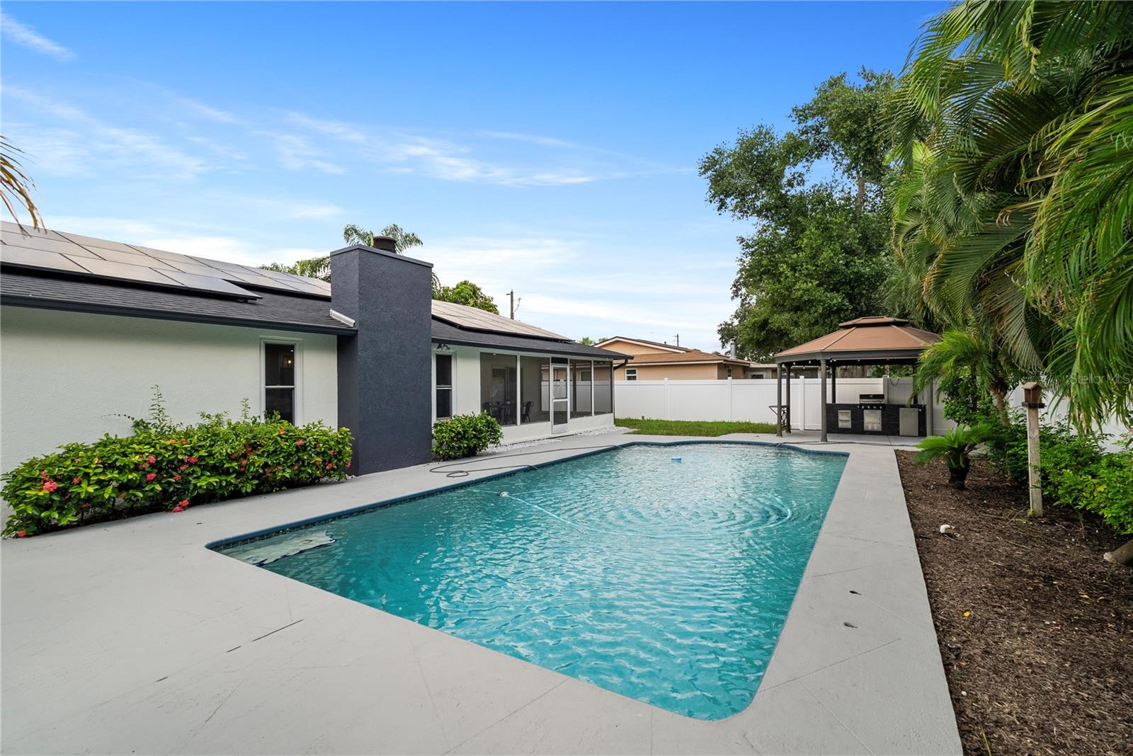 Welcome to this stunning, fully renovated home located in a serene and picturesque community. This spacious residence offers three generously sized bedrooms and two elegant bathrooms, providing a perfect blend of comfort and style. The heart of the home is a sprawling kitchen, complete with brand-new appliances and ample counter space, seamlessly flowing into a large dining room—ideal for family gatherings and entertaining. Step outside to discover your private paradise: a gorgeous pool surrounded by lush landscaping, creating a tranquil retreat right in your backyard. A brand new outdoor kitchen enhances your alfresco dining experience, making it effortless to enjoy meals and entertain guests in style. The property also features a well-maintained garage, adding convenience and additional storage space. The property also boasts brand-new flooring throughout, enhancing the fresh and modern feel. The bathrooms have been tastefully remodeled, and the windows have been replaced with brand-new double-glass, energy-efficient units. While the roof, renovated just seven years ago, promises durability and efficiency. In addition to these exceptional features, this home is equipped with a cutting-edge solar panel system, offering significant energy savings and environmental benefits. With its blend of modern updates, eco-friendly innovations, and serene surroundings, make this your new home and experience the perfect sanctuary for both luxury and relaxation.