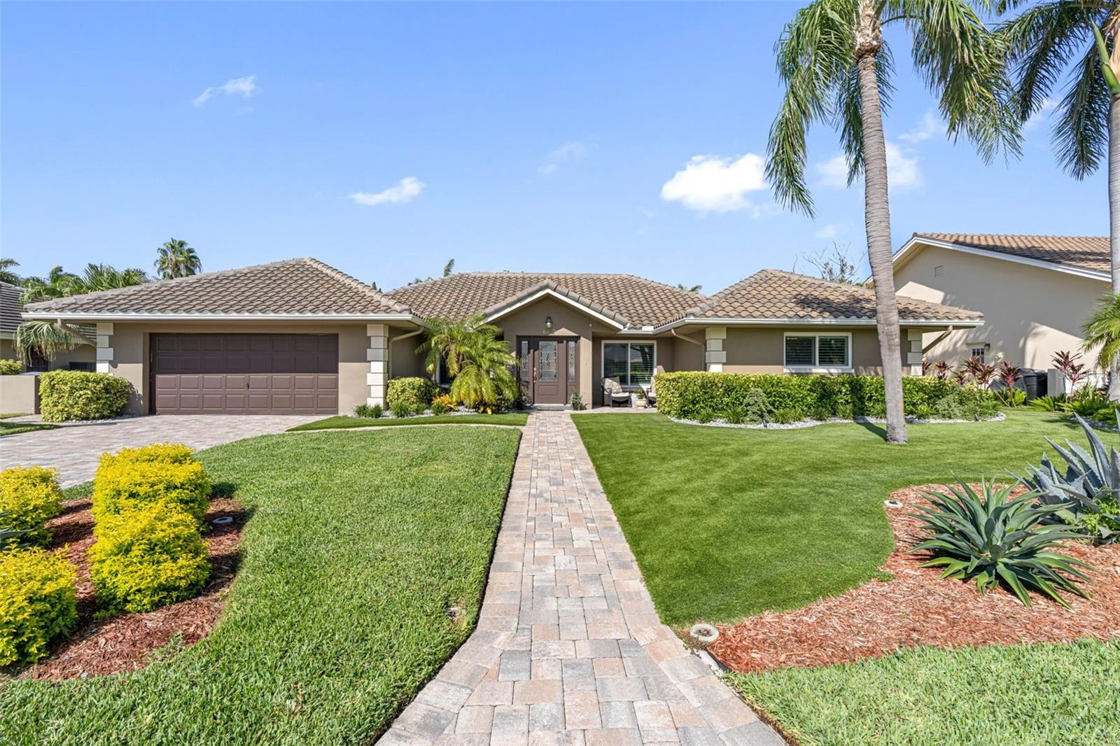 Welcome to Bayway Isles, a guard gated community where luxury meets coastal living. Nestled among multi-million-dollar homes, this residence offers unmatched elegance and comfort. As you arrive, lush landscaping and striking curb appeal warmly welcome you inside, where a seamless blend of indoor and outdoor living awaits, showcasing expansive views of your private BACKYARD OASIS. The open floor plan bathes every room in natural light. The great room offers stunning pool views and a modern FIREPLACE, creating a cozy gathering space. Wood plank TILE floors and crown molding throughout add a touch of elegance. The gourmet kitchen is a chef’s dream with stainless-steel appliances, granite counters, a breakfast island, and aquarium windows that bring the outdoors in. The office/den off the kitchen features a second fireplace with the exposed brick wall providing a perfect sanctuary for work or relaxation. The primary suite is a true retreat, positioned to capture views of the spa and lush surroundings. With direct outdoor access, this suite is designed for ultimate relaxation. The updated master bath is luxurious, featuring a doorless shower. Step outside to discover a backyard masterpiece. The heated saltwater pool and infinity-edge hot tub feature dramatic fire and water elements, creating a stunning contrast. A stone wall with a firepit and rain curtain forms a mesmerizing focal point. A metal fire bowl at the pool’s end, surrounded by steppingstones and a flowerbed, adds exotic flair. The backyard also includes a pergola with additional seating and a covered patio with a pass-through bar from the kitchen. The outdoor kitchen is fully equipped with a built-in Weber grill, beverage and wine cooler, ice maker, and more, all enhanced by four commercial-grade Bobe tiki torches and commercial grade electric heaters. This home boasts three bedrooms, two baths, and a coastal design connecting the family room, kitchen, and poolside. The oversized two-car garage includes an EV charger. Additional features include 2019 hurricane impact windows and doors, landscape lighting, 2021 HVAC, 2016 tile roof, plantation shutters, crushed grain stone under artificial turf, and full-yard irrigation to keep the lush landscaping pristine. Located in Bayway Isles, residents enjoy island tranquility with nearby St. Pete Beach, Fort DeSoto, and downtown St. Petersburg. This home offers the perfect balance of privacy, luxury, and convenience. If you're ready to elevate your lifestyle with an extraordinary backyard oasis, this home is your dream come true. Elevation 11.2 feet. This home had NO HURRICANE DAMAGE! Call for a showing today!