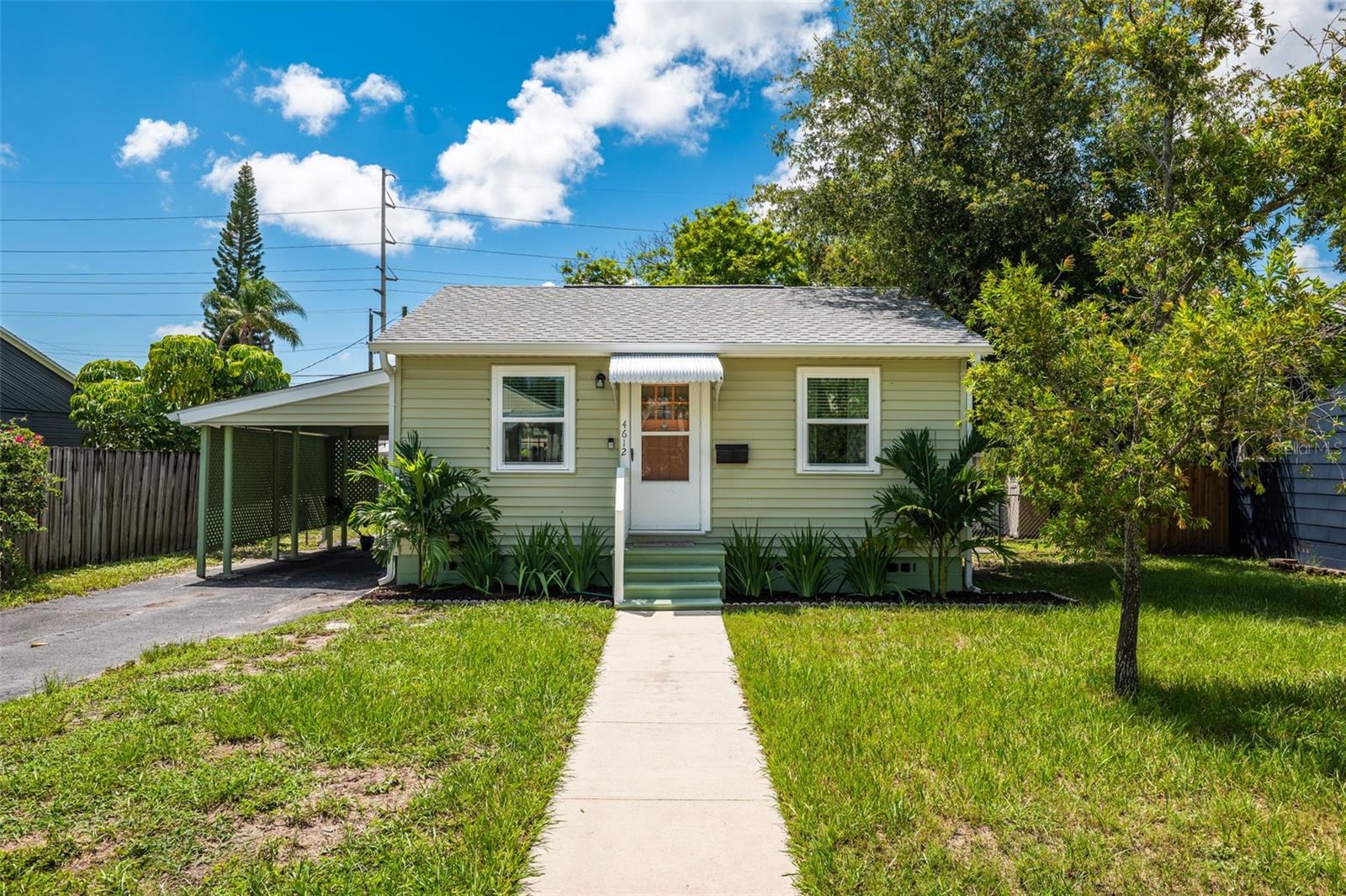 Charming Bungalow in the Heart of St. Pete! Discover the perfect blend of character and modern updates in this delightful 2-bedroom, 1-bathroom bungalow, centrally located in St. Pete. This home offers a welcoming atmosphere with its original wood floors and a spacious, open-concept layout. The kitchen features stainless steel appliances, a generous island, and recessed lighting that enhances the bright and airy feel. The kitchen seamlessly flows into the living room, creating an ideal space for entertaining and everyday living. Enjoy the flexibility of a sizable, fully fenced backyard with a shed and ample room for future expansion or landscaping projects. A front driveway leads to a convenient covered carport, adding to the home's appeal. Additionally, there's an option to reinstate a second bathroom, as the home previously had a toilet and sink in the laundry room. **RECENT UPGRADES: Hurricane Impact Windows 2022 | AC 2021 | Roof 2017 | Water Heater 2020 | Electrical Grounding Upgrades 2021 | Added Outside Electrical Outlet 2023 | Gutters 2021 | Washer/Dryer 2021 | Dishwasher 2021 | Gutters 2021 | Ventilation in Bathroom 2021 | Recessed Lighting in Kitchen 2021 | Main Water Shut Off Valve 2021 | Updated Bathroom Fixtures 2021 | New Laundry Room Exterior Door 2021 | New No-Cord Blinds 2022. Centrally located, this charming bungalow is just moments away from the interstate, offering quick access to restaurants, shopping, bars, breweries, Downtown St. Pete, Tampa, Sarasota, and airports. Enjoy the convenience of vibrant city life with the comfort of a cozy retreat. Assumable loan optional.