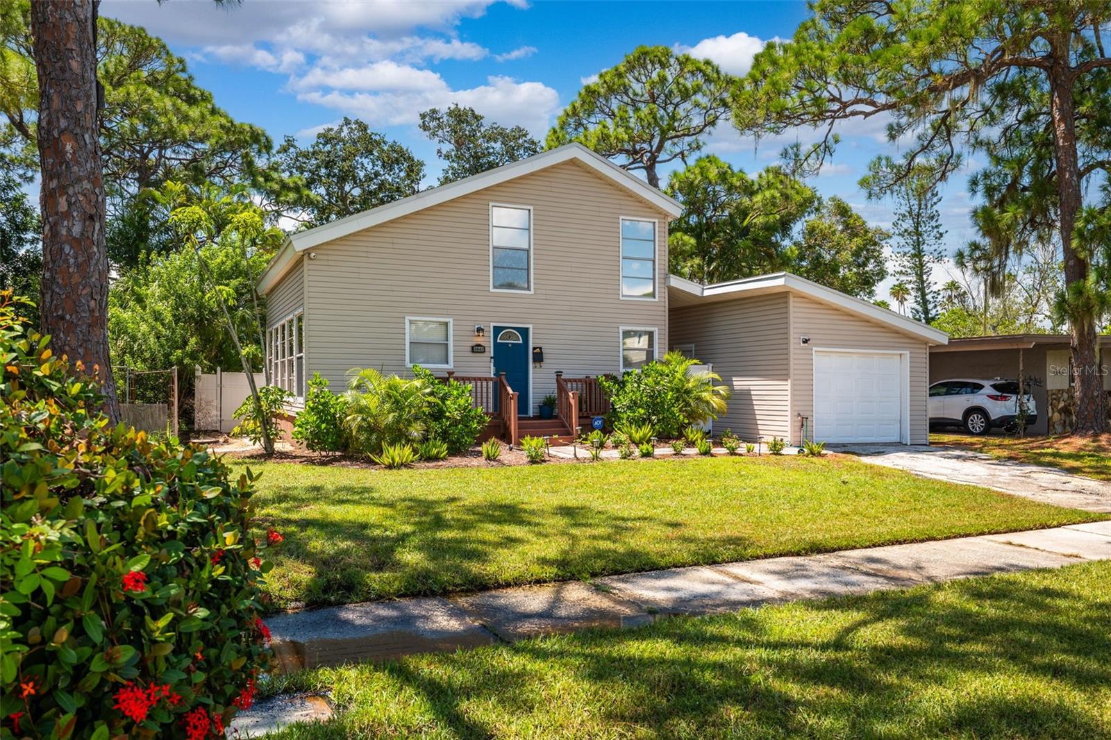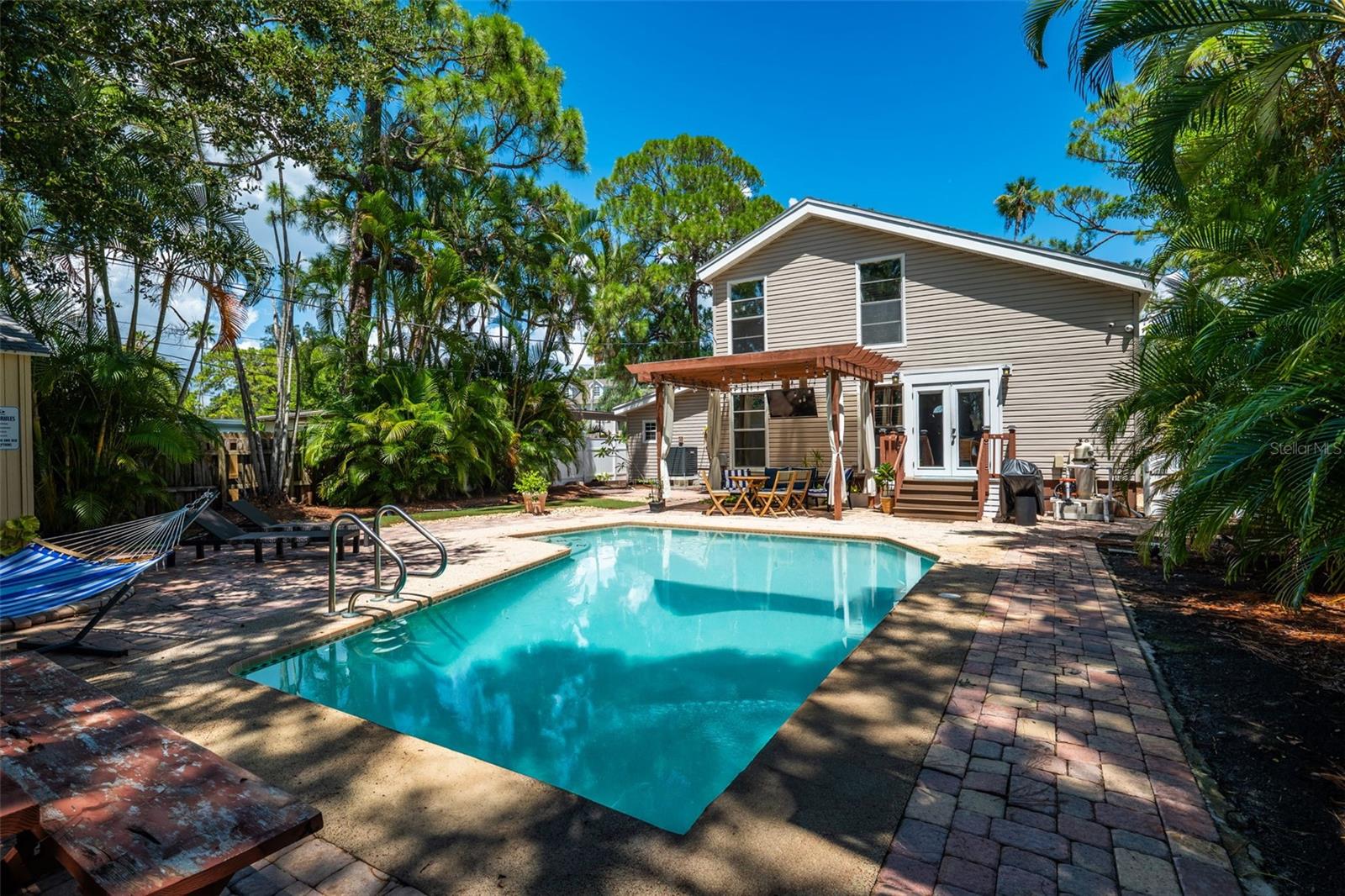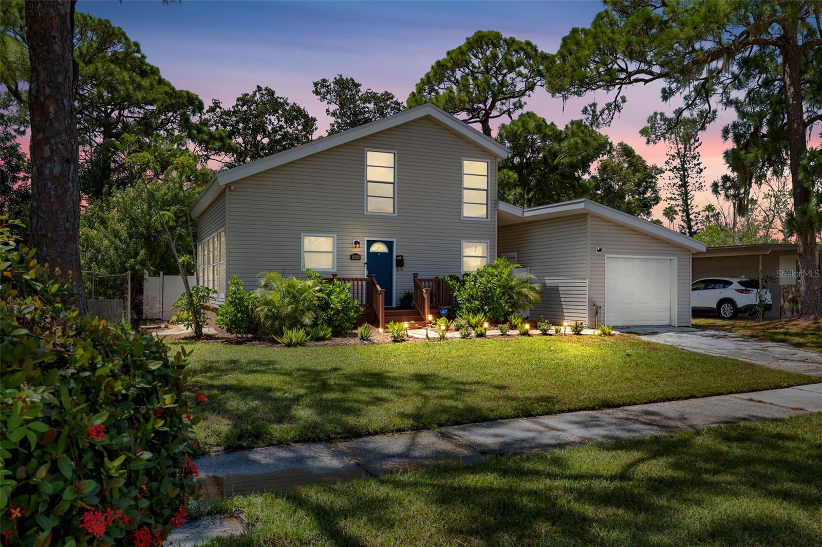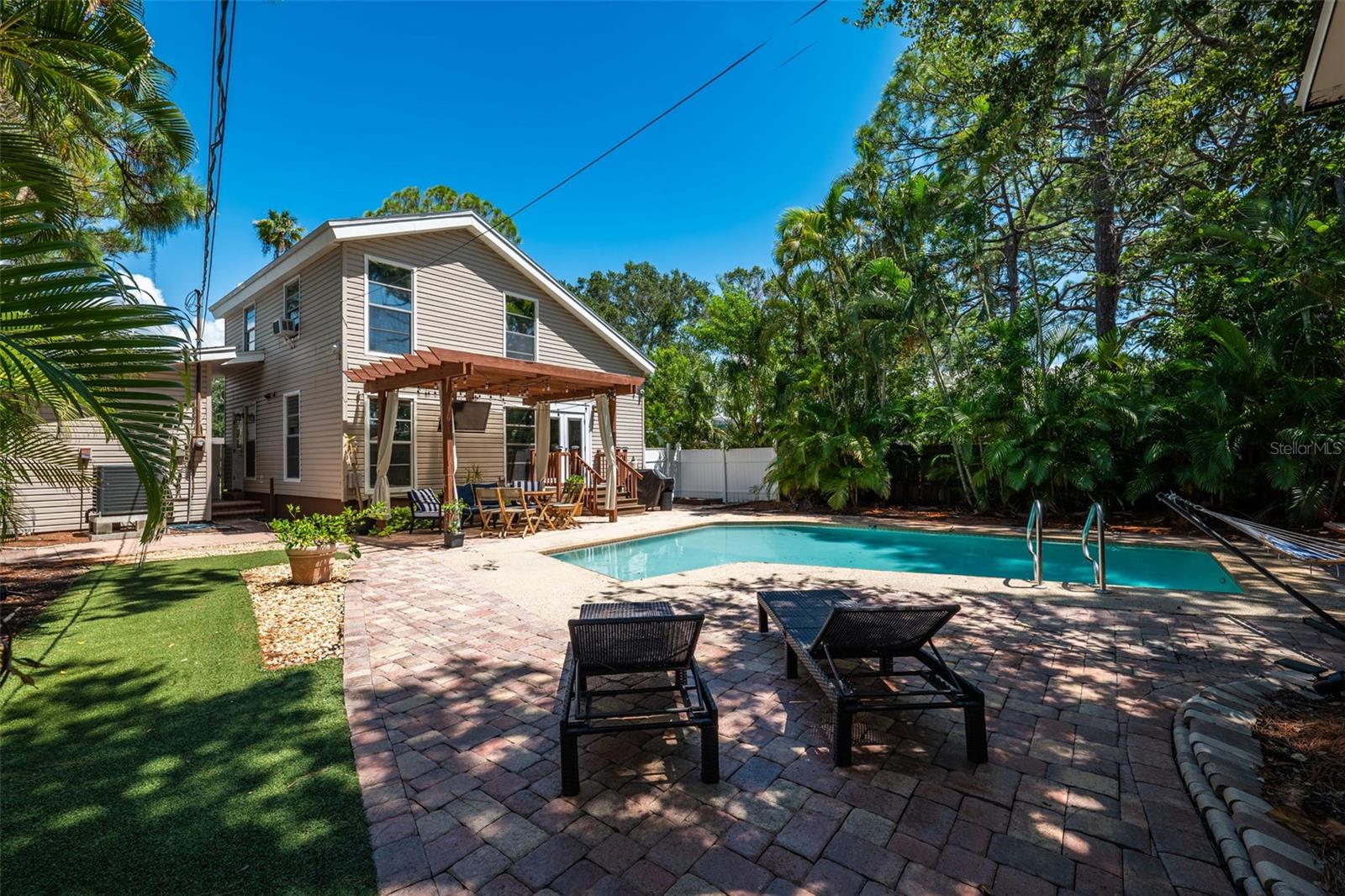 Welcome to this inviting Shore Acres home, now on the market! This beautifully maintained property offers 3 bedrooms, 2 bathrooms, and a spacious living area perfect for your lifestyle. The first floor boasts a modern kitchen with granite countertops and stainless-steel appliances, seamlessly blending style and function. The large living room is a true highlight, featuring vaulted ceilings with exposed wood beams, creating a warm and cozy atmosphere. Upstairs, you'll find a guest bedroom and a versatile loft space with a closet and window, which can easily be converted into a fully enclosed third bedroom to suit your needs. Step outside and you'll discover a backyard oasis, perfect for entertaining. Enjoy the pergola, already wired for a TV, or relax by the pool on the expansive patio, ideal for cookouts and gatherings with family and friends. There's also a spacious storage shed for your pool toys and lawn equipment. This home is located in a fantastic school zone, including Shore Acres Elementary, Meadowlawn Middle School, and Northeast High School. Despite the tall, privacy-providing palms surrounding the property, you're just minutes away from downtown and major highways, making it both a private retreat and a convenient location. Book your private tour today before this one is gone!!