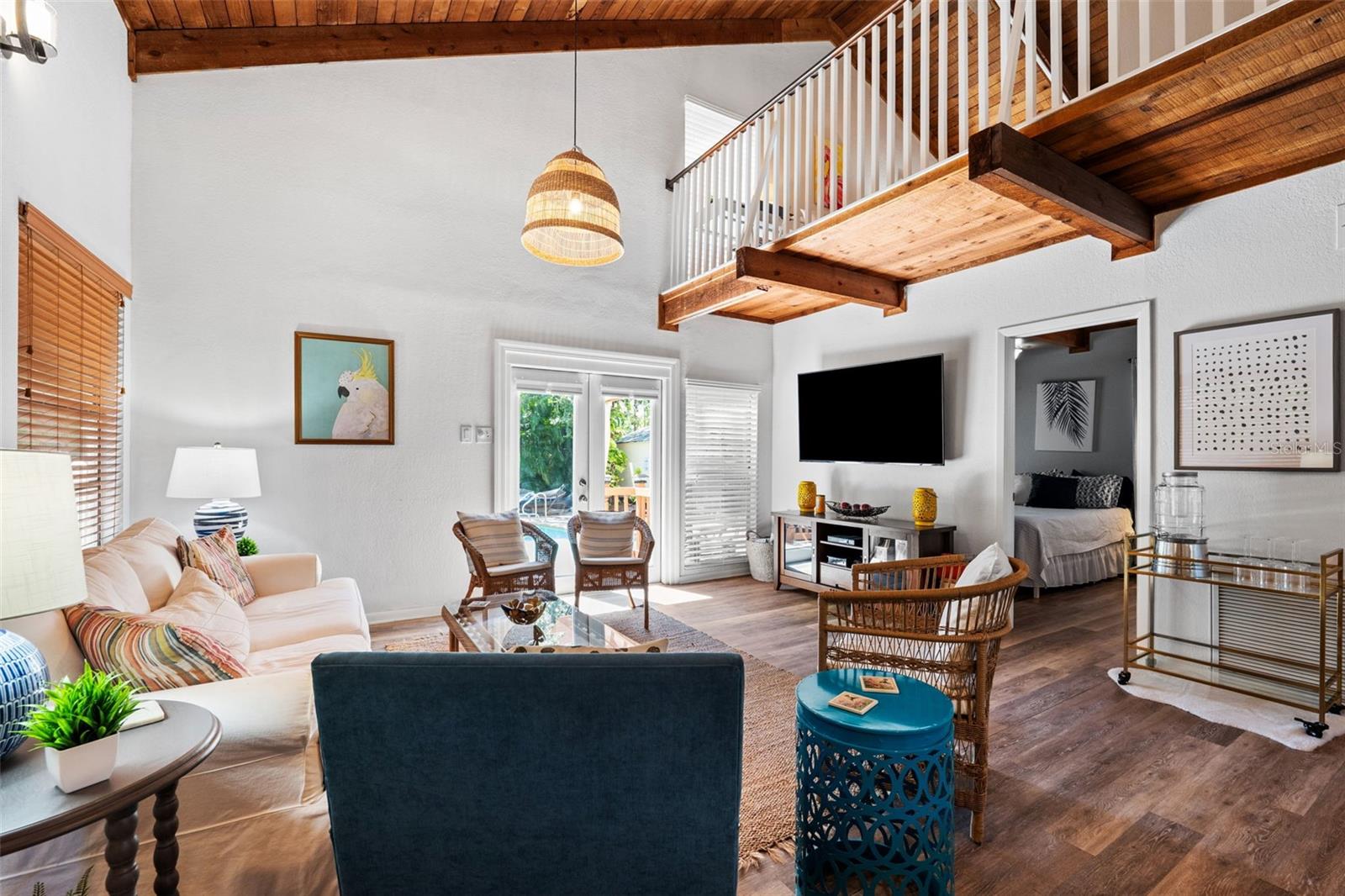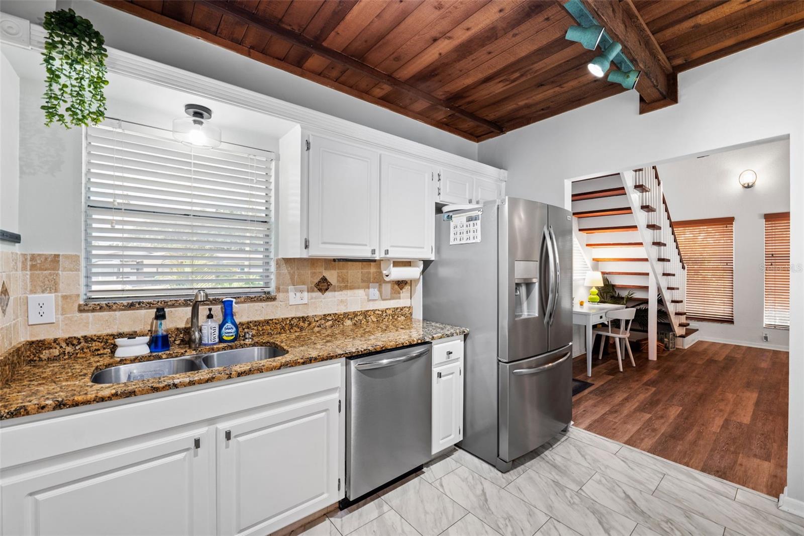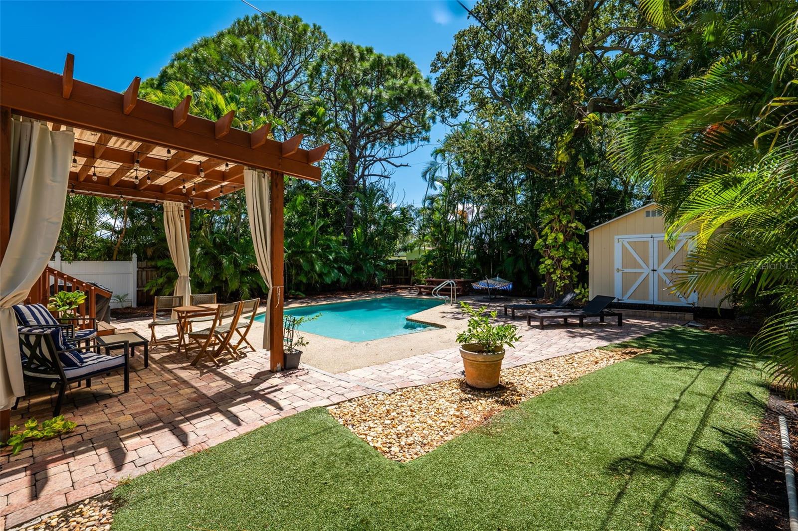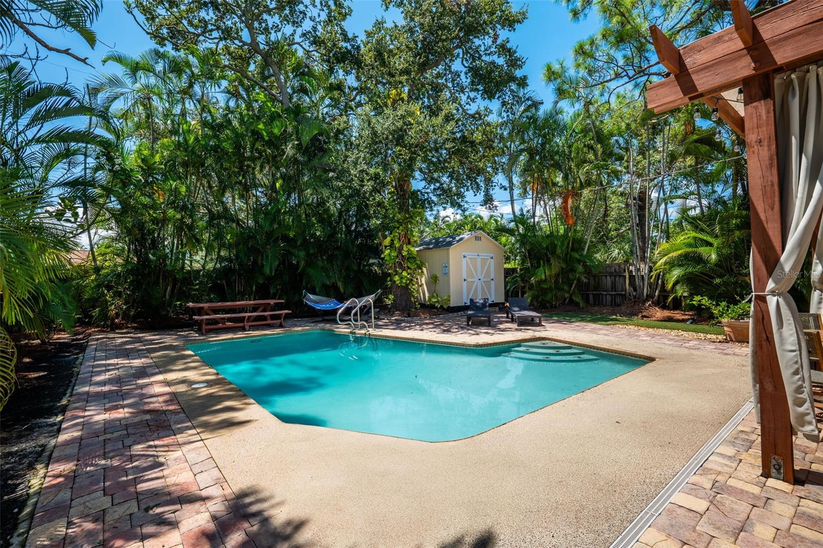 Welcome to this inviting Shore Acres home, now on the market! This beautifully maintained property offers 3 bedrooms, 2 bathrooms, and a spacious living area perfect for your lifestyle. The first floor boasts a modern kitchen with granite countertops and stainless-steel appliances, seamlessly blending style and function. The large living room is a true highlight, featuring vaulted ceilings with exposed wood beams, creating a warm and cozy atmosphere. Upstairs, you'll find a guest bedroom and a versatile loft space with a closet and window, which can easily be converted into a fully enclosed third bedroom to suit your needs. Step outside and you'll discover a backyard oasis, perfect for entertaining. Enjoy the pergola, already wired for a TV, or relax by the pool on the expansive patio, ideal for cookouts and gatherings with family and friends. There's also a spacious storage shed for your pool toys and lawn equipment. This home is located in a fantastic school zone, including Shore Acres Elementary, Meadowlawn Middle School, and Northeast High School. Despite the tall, privacy-providing palms surrounding the property, you're just minutes away from downtown and major highways, making it both a private retreat and a convenient location. Book your private tour today before this one is gone!!