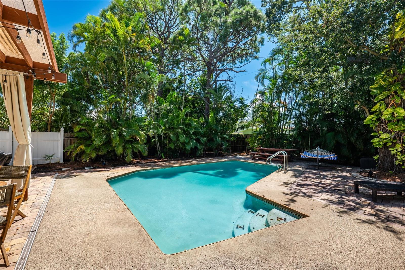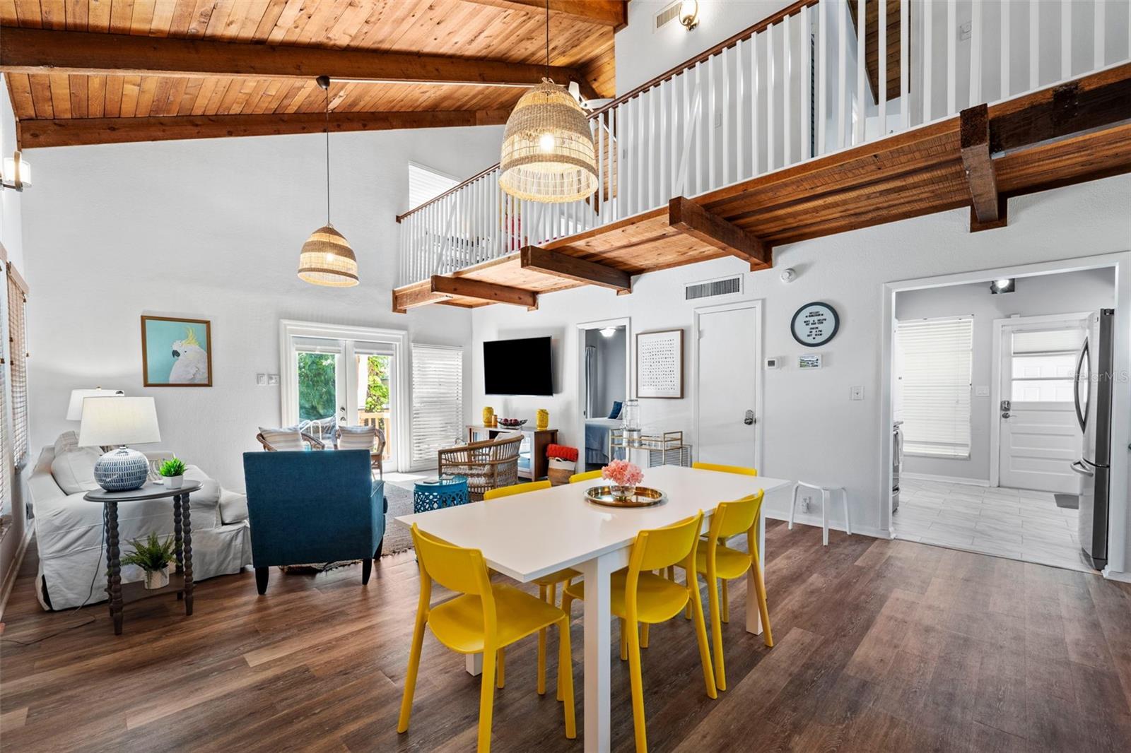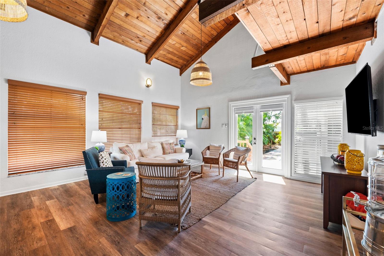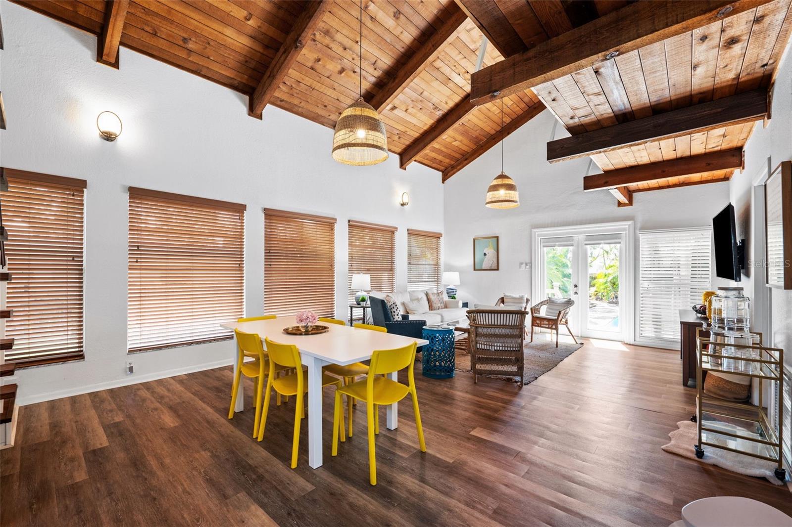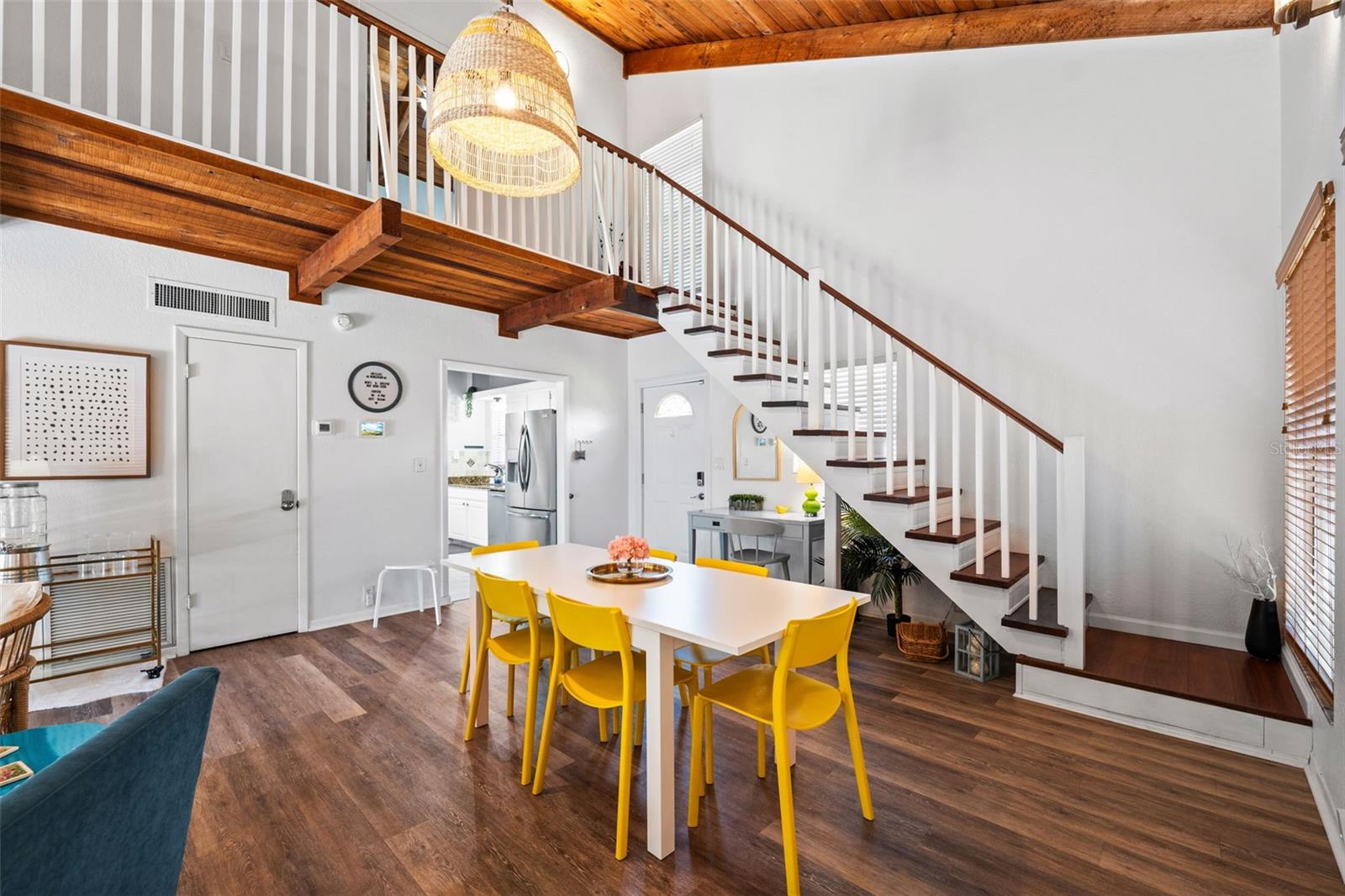 Welcome to this inviting Shore Acres home, now on the market! This beautifully maintained property offers 3 bedrooms, 2 bathrooms, and a spacious living area perfect for your lifestyle. The first floor boasts a modern kitchen with granite countertops and stainless-steel appliances, seamlessly blending style and function. The large living room is a true highlight, featuring vaulted ceilings with exposed wood beams, creating a warm and cozy atmosphere. Upstairs, you'll find a guest bedroom and a versatile loft space with a closet and window, which can easily be converted into a fully enclosed third bedroom to suit your needs. Step outside and you'll discover a backyard oasis, perfect for entertaining. Enjoy the pergola, already wired for a TV, or relax by the pool on the expansive patio, ideal for cookouts and gatherings with family and friends. There's also a spacious storage shed for your pool toys and lawn equipment. This home is located in a fantastic school zone, including Shore Acres Elementary, Meadowlawn Middle School, and Northeast High School. Despite the tall, privacy-providing palms surrounding the property, you're just minutes away from downtown and major highways, making it both a private retreat and a convenient location. Book your private tour today before this one is gone!!