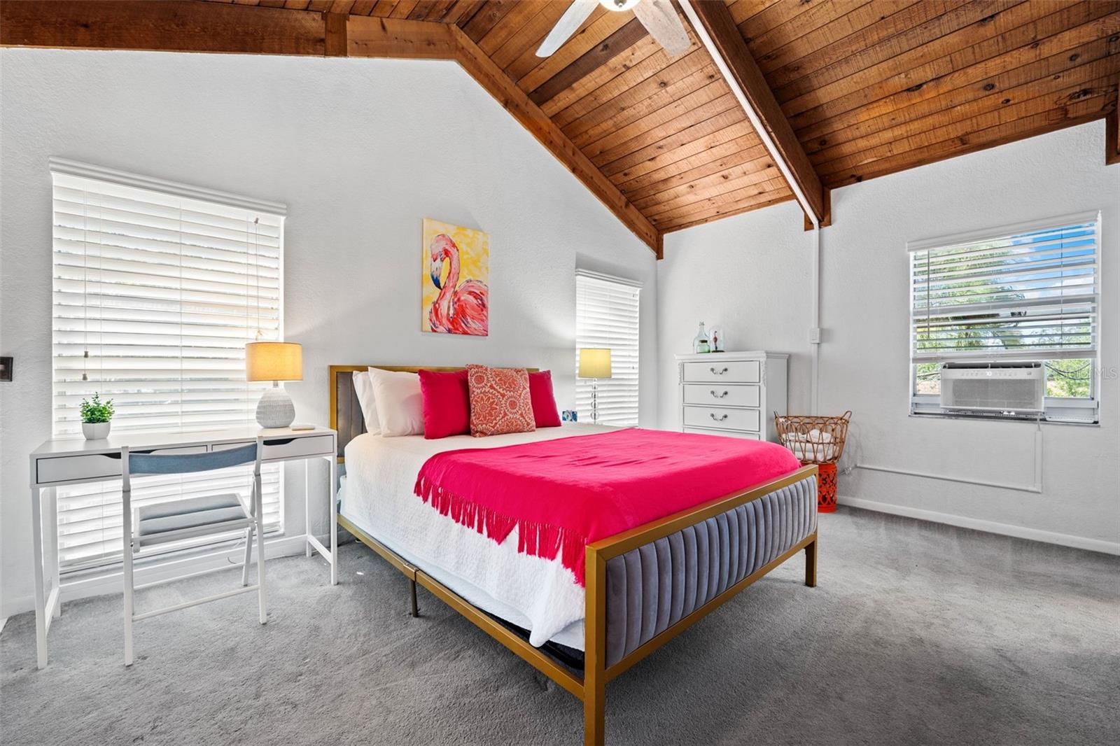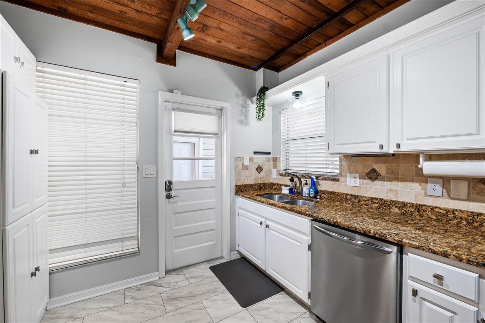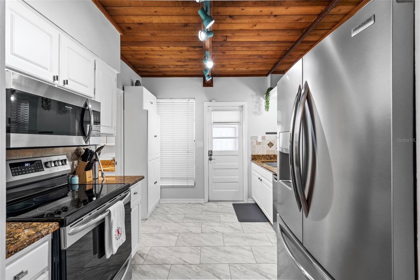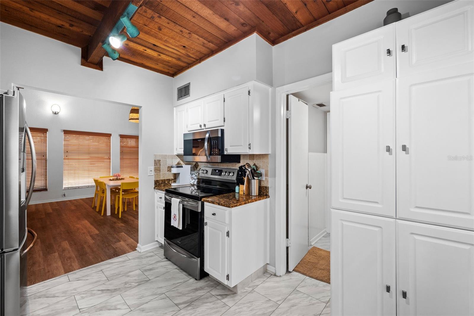 Welcome to this inviting Shore Acres home, now on the market! This beautifully maintained property offers 3 bedrooms, 2 bathrooms, and a spacious living area perfect for your lifestyle. The first floor boasts a modern kitchen with granite countertops and stainless-steel appliances, seamlessly blending style and function. The large living room is a true highlight, featuring vaulted ceilings with exposed wood beams, creating a warm and cozy atmosphere. Upstairs, you'll find a guest bedroom and a versatile loft space with a closet and window, which can easily be converted into a fully enclosed third bedroom to suit your needs. Step outside and you'll discover a backyard oasis, perfect for entertaining. Enjoy the pergola, already wired for a TV, or relax by the pool on the expansive patio, ideal for cookouts and gatherings with family and friends. There's also a spacious storage shed for your pool toys and lawn equipment. This home is located in a fantastic school zone, including Shore Acres Elementary, Meadowlawn Middle School, and Northeast High School. Despite the tall, privacy-providing palms surrounding the property, you're just minutes away from downtown and major highways, making it both a private retreat and a convenient location. Book your private tour today before this one is gone!!
