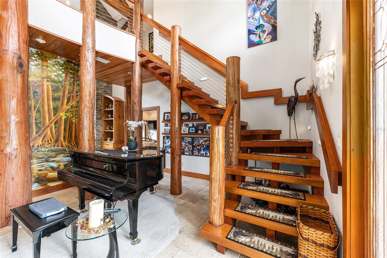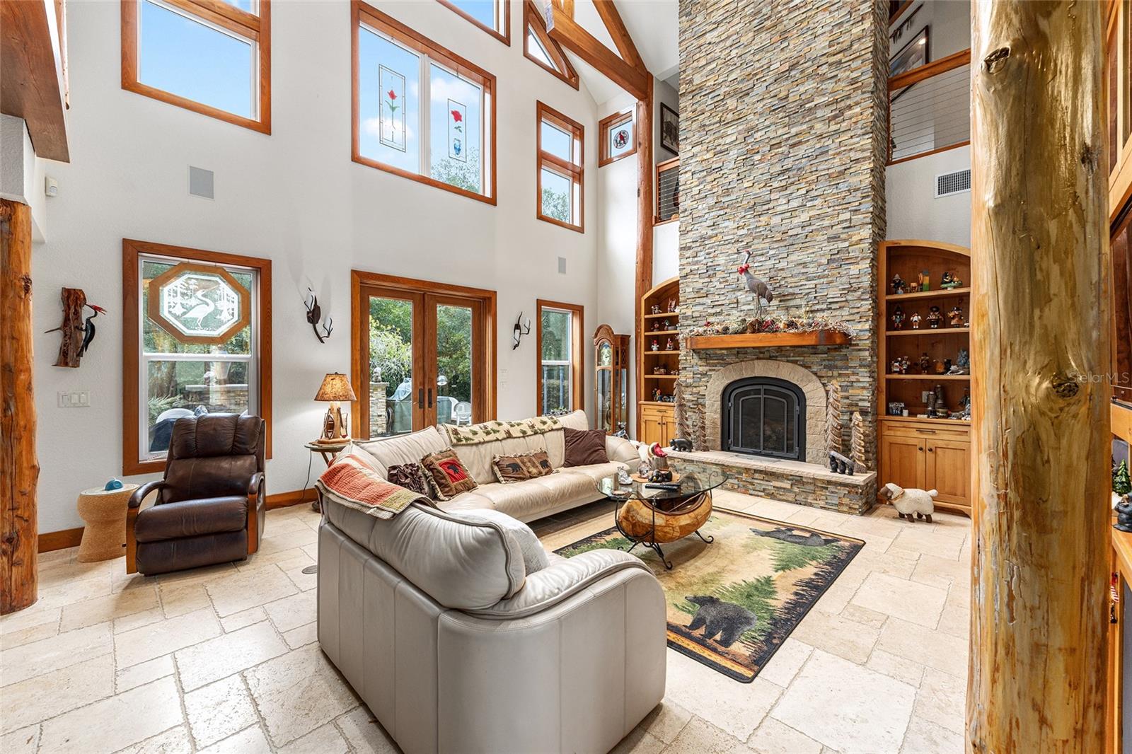 Assumable (approx $450k) VA loan at 2.25%… Welcome to the Manor House at Lake Kerr – a truly one-of-a-kind custom estate, artfully designed with exceptional craftsmanship, high-end finishes, and timeless architectural detail. From the grand entrance framed by dramatic cypress pillars to the intricate millwork and travertine flooring throughout, every element exudes quality and elegance. The main residence features 3 bedrooms—potentially 4—and 4.5 bathrooms. The expansive first-floor primary suite offers French doors opening to the rear terrace, a private sitting room with fireplace and dry bar with refrigerator, a spa-inspired bathroom with vanity area, and a generous dressing room. Upstairs, all bedrooms enjoy French doors that open to covered wood balconies. One spacious bedroom includes an ensuite bath, while another features an additional sleeping loft—ideal for extra guests. A charming upstairs sitting room with its own fireplace connects to a Jack and Jill bathroom and could easily be converted into a fourth bedroom. The formal entry is nothing short of spectacular, where soaring cypress log pillars and a hand-painted mural make a memorable first impression. The great room features cathedral ceilings, a dramatic two-story dry-laid stone fireplace, and custom built-ins. An open-concept kitchen anchors the living space with a center island, breakfast bar, and a large butler’s pantry—equipped with two additional refrigerators and ample storage. Just off the kitchen, a sunken bar opens seamlessly to the outdoor entertainment terrace, complete with built-in grill, fire pit, and an electrical hookup for a future spa. The three-bay tandem garage is ideal for storing watercraft, ATVs, or other recreational gear. Above the garage, a versatile bunkhouse includes a full bath and kitchenette—perfect for a gym, home theater, or guest suite. Set on 1.27 acres with panoramic views of Little Lake Kerr, (the main home recently appraised in July for $1m) the estate also includes two additional parcels: A 0.17-acre lot (parcel ID 10829-001-02) with approved plans for a guest house A 0.22-acre canal-front lot (parcel ID 10753-001-53)featuring a 2012 two-bedroom, two-bath manufactured home—ready for interior updates and boathouse improvements. The boat ramp is situated next to the property on 242nd Ave. This exceptional property is a rare opportunity to own a refined lakeside retreat with room to grow, entertain, and enjoy the very best of Florida living.