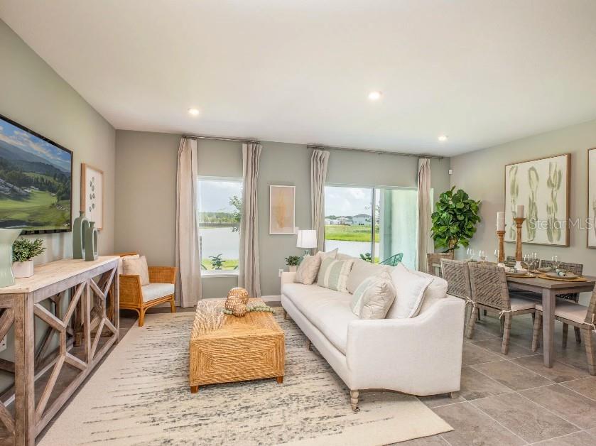 Discover modern living at Mirada Townhomes, a vibrant community near the stunning Mirada Lagoon. Residents enjoy outdoor recreation, top-tier amenities, and even a swim-up bar at the lagoon. This thoughtfully designed community blends comfort, convenience, and relaxation, all in a prime location. This spacious two-story townhome is designed with functionality and style in mind, featuring a loft and a one-car garage for versatile living. The open-concept main level is perfect for entertaining, showcasing a sleek kitchen with quartz countertops, a stylish backsplash, and a walk-in pantry for added storage. A refrigerator is included, making the kitchen move-in ready. Elegant EVP flooring flows throughout the kitchen, dining, and great room, which also features additional LED lighting, providing both durability and modern appeal. A covered lanai just off the great room extends the living space outdoors, ideal for relaxation or gatherings. Upstairs, the loft area provides additional space for work, play, or relaxation. The primary suite serves as a private retreat with a spa-inspired bath featuring dual vanities, a tiled shower enclosure, and a linen closet for added storage. Two additional bedrooms share a beautifully appointed second bath with a tiled shower/tub combo and upscale finishes, while carpet in the loft and bedrooms adds warmth and comfort. The laundry room includes a washer and dryer, plus two extra linen closets for maximum organization. Blinds are installed throughout the home, ensuring privacy and convenience from day one. Exterior features include architectural shingles for durability and curb appeal. Smart home upgrades like Keyless Entry, a Smart Home Panel, Video Doorbell, and Deako Switches enhance modern efficiency and security in daily living. The monthly HOA fee covers cable, internet, lagoon access with guest passes, lawn care, and building exterior maintenance, creating a truly low-maintenance lifestyle. Backed by a full builder warranty, this townhome combines style, comfort, and peace of mind—all just steps from the lagoon and everything Mirada has within the community.