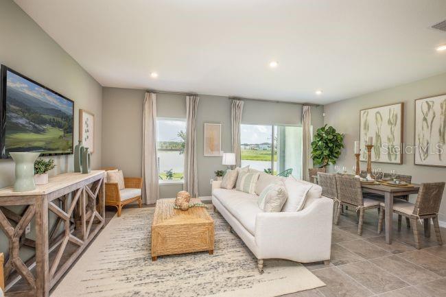 Under Construction. Discover modern living at Mirada Townhomes, a vibrant community near the stunning Mirada Lagoon. Residents enjoy outdoor recreation, top-tier amenities, and even a swim-up bar at the lagoon. This thoughtfully designed community blends comfort, convenience, and relaxation, all in a prime location. This spacious two-story townhome is designed with functionality and style in mind, featuring a loft and a one-car garage for versatile living. The open-concept main level is perfect for entertaining, showcasing a sleek kitchen with quartz countertops, a stylish backsplash, and a walk-in pantry for added storage. A refrigerator is included, making the kitchen move-in ready. Elegant EVP flooring flows throughout the kitchen, dining, and great room, which also features additional LED lighting, providing both durability and modern appeal. A covered lanai just off the great room extends the living space outdoors, ideal for relaxation or gatherings. Upstairs, the loft area provides additional space for work, play, or relaxation. The primary suite serves as a private retreat with a spa-inspired bath featuring dual vanities, a tiled shower enclosure, and a linen closet for added storage. Two additional bedrooms share a beautifully appointed second bath with a tiled shower/tub combo and upscale finishes, while carpet in the loft and bedrooms adds warmth and comfort. The laundry room includes a washer and dryer, plus two extra linen closets for maximum organization. Blinds are installed throughout the home, ensuring privacy and convenience from day one. Exterior features include architectural shingles for durability and curb appeal. Smart home upgrades like Keyless Entry, a Smart Home Panel, Video Doorbell, and Deako Switches enhance modern efficiency and security in daily living. The monthly HOA fee covers cable, internet, lagoon access with guest passes, lawn care, and building exterior maintenance, creating a truly low-maintenance lifestyle. Backed by a full builder warranty, this townhome combines style, comfort, and peace of mind—all just steps from the lagoon and everything Mirada provides within the community.