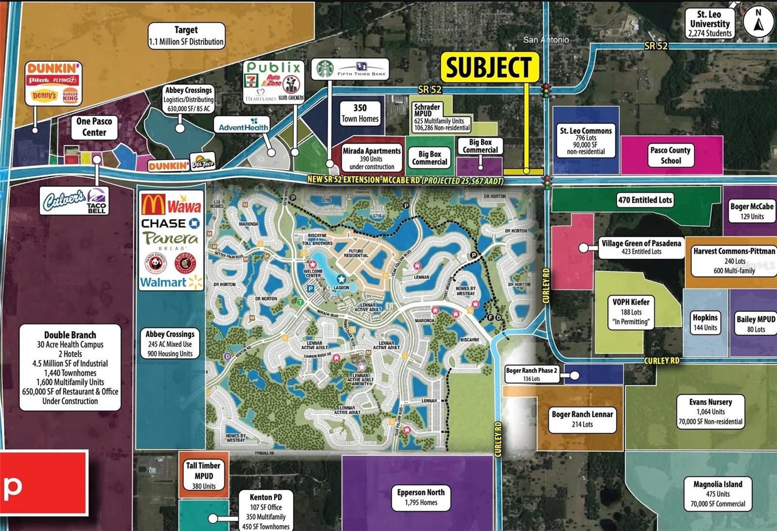 Discover Your Dream Home in Mirada! Upgraded 4-bedroom, 3-bath, 3-car garage Hawthorne model by DR Horton located in the highly desirable Mirada community. Built in 2020, this stunning residence boasts 2,537 sq ft of modern living space, featuring luxury vinyl plank flooring throughout (no carpet), and a spacious open-concept design that seamlessly combines comfort and style. The gourmet kitchen impresses with LG luxury appliances, a marble backsplash, and an oversized upgraded sink, perfect for culinary enthusiasts. The family room and dining area create an inviting space for gatherings, while the enormous master bedroom offers a peaceful retreat. Step outside to the oversized extended patio, where you'll find a fully equipped outdoor kitchen, a fire pit, and motorized shade—ideal for entertaining friends and family while overlooking a tranquil pond with a fountain. The backyard is designed for relaxation and outdoor fun, with features like gutters, an epoxy floor in the garage, fresh paint, and upgraded blinds for added privacy and style. Additional highlights include a laundry room with extra storage, utility sink, and included washer and dryer, along with upgraded fans and a ready alarm system for peace of mind. The roof, installed in 2020, provides durability and peace of mind, complemented by a modern A/C system upgraded in 2024, and a new water heater from 2020. While this home does not feature solar panels, its energy-efficient upgrades ensure comfort and savings. Located in the family-friendly Mirada community, residents enjoy resort-style amenities, walking and biking trails, dog parks, golf-cart-friendly streets, and lagoon-front recreation at the nation’s largest man-made lagoon. Situated in Pasco County, this prime location offers easy access to major highways like I-75 and State Road 54, making commutes to Tampa and Orlando a breeze. The community is within close proximity to top-rated schools, shopping centers, parks, healthcare facilities, and outdoor recreation options. Mirada is renowned for its safe, vibrant neighborhood atmosphere, active community events, and ongoing development, making it an ideal place for families, professionals, and retirees alike. Don’t miss this incredible opportunity—schedule your private showing today and step into the next chapter of your life in Mirada!
