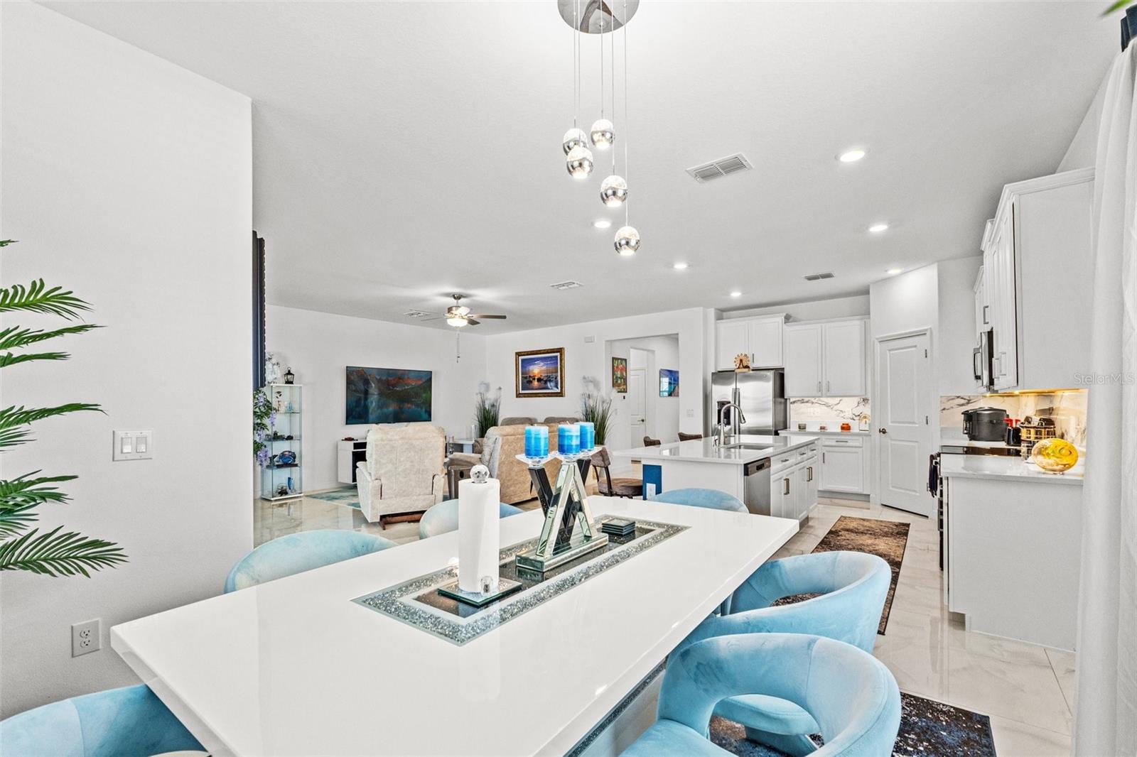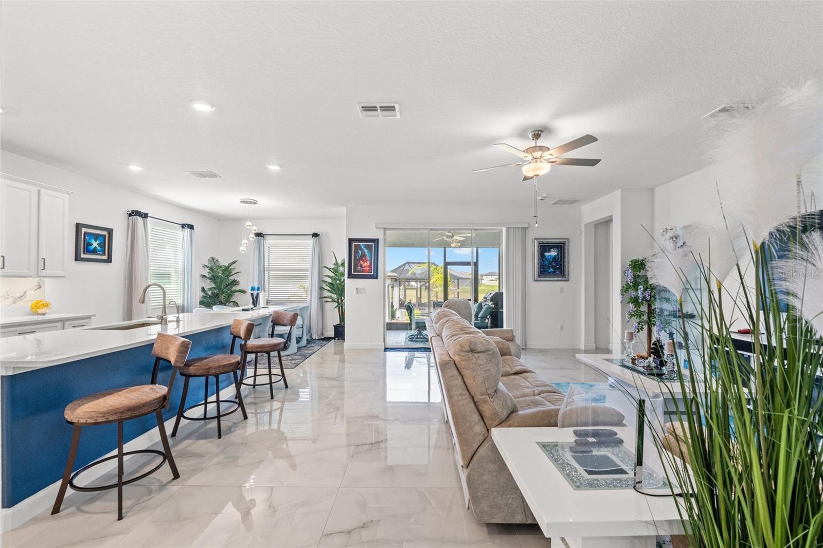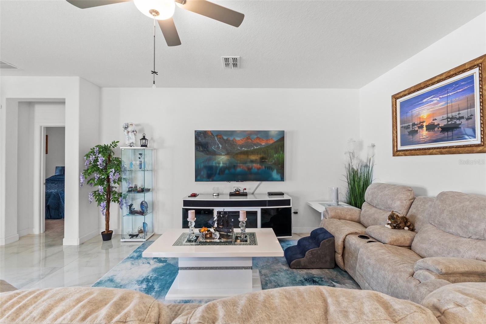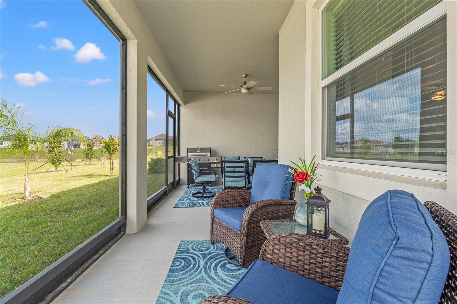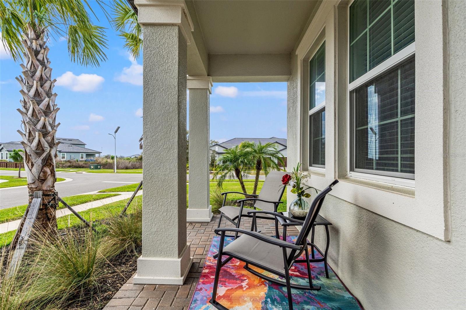 Home in Lagoon Community with Double Corner Lot, Screened Lanai and many upgrades! Welcome to 10381 Tupper Cay Dr, a beautifully maintained 2-bedroom, 2-bath home, with a multi-use flex room, situated on a generous 0.29-acre double corner lot. As you enter the home through the upgraded 8-foot glass panel entrance door, you encounter a beautiful tiled feature wall with a sitting/shoe storage bench and modern chandelier lighting. The guest bath has floor to ceiling custom tile with a LED Spa Shower Tower with a Rain and Waterfall head and four massage body jets. Talk about relaxation after a long day! All of the builder’s floor tile throughout the house has been replaced with a gorgeous large format marble-looking porcelain tile, giving the home an elegant look and feel. The kitchen features a custom backsplash and large pantry. The open concept living and dining areas create a welcoming atmosphere with plenty of natural light. Step outside to your screened-in lanai through the 3-panel glass sliding doors, the perfect spot for morning coffee or evening relaxation. The primary suite serves as a peaceful retreat, complete with a walk-in closet, en-suite bath which has been upgraded with dual vanities, and a custom-tiled walk-in shower. The laundry room is huge. Lighting has been upgraded throughout the house and a fan installed on the lanai. The front porch and driveway have been sealed. This home is in Medley at Mirada, a 55+ community. Medley has a clubhouse with a bar, restaurant, heated pool, billiard room, event room, tennis-pickle ball and bocce ball courts, fitness room and dog park. This sits inside of Mirada’s 15-acre crystal clear lagoon community that has a swim up bar, sandy beaches, tiki huts, kayaking and so much more. It is Resort living at its finest! This easy living neighborhood is a must see to appreciate. Furniture can be included in the sale with a competitive offer!!! Don’t miss out on this wonderful opportunity—schedule your private showing today!