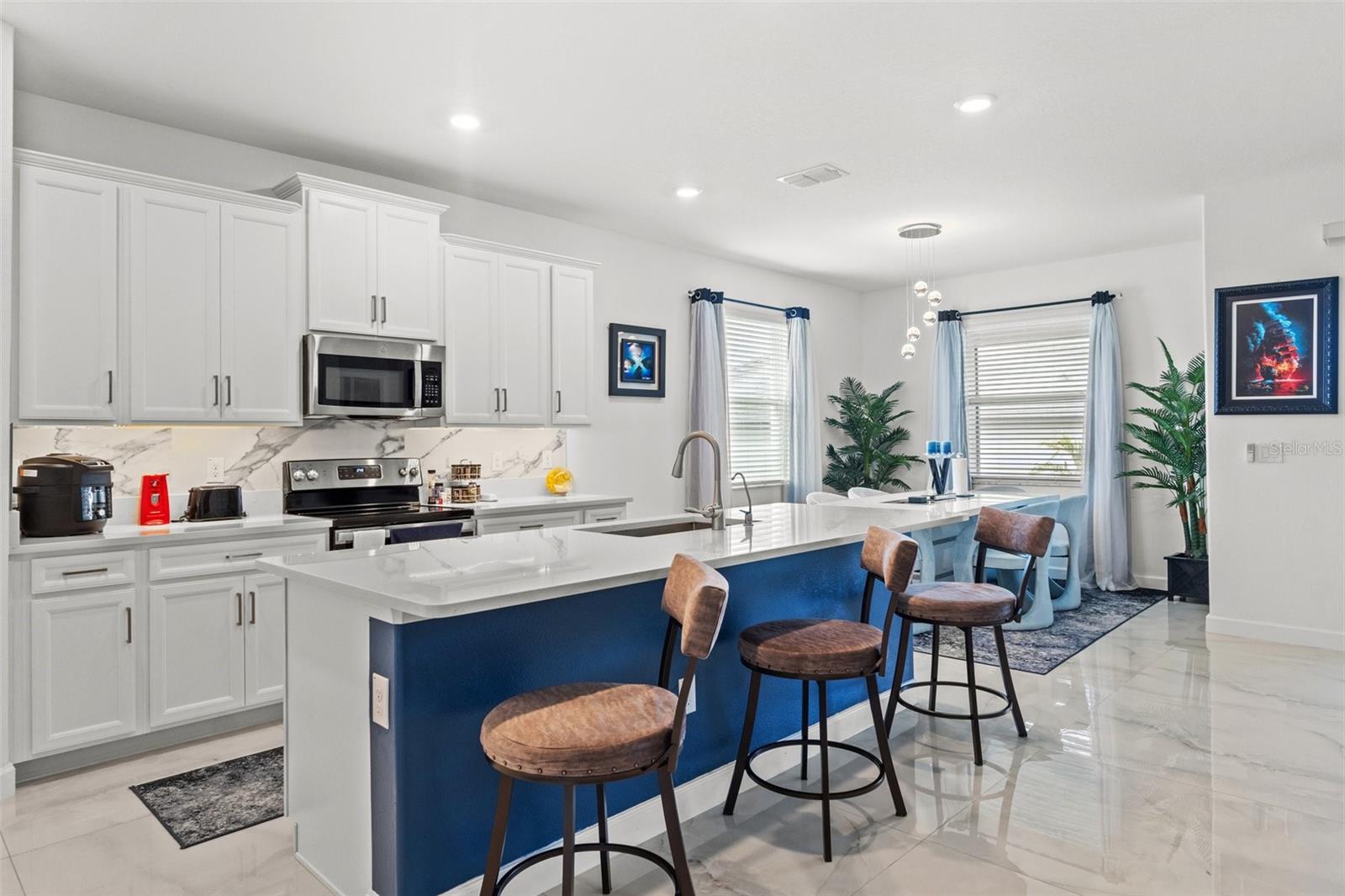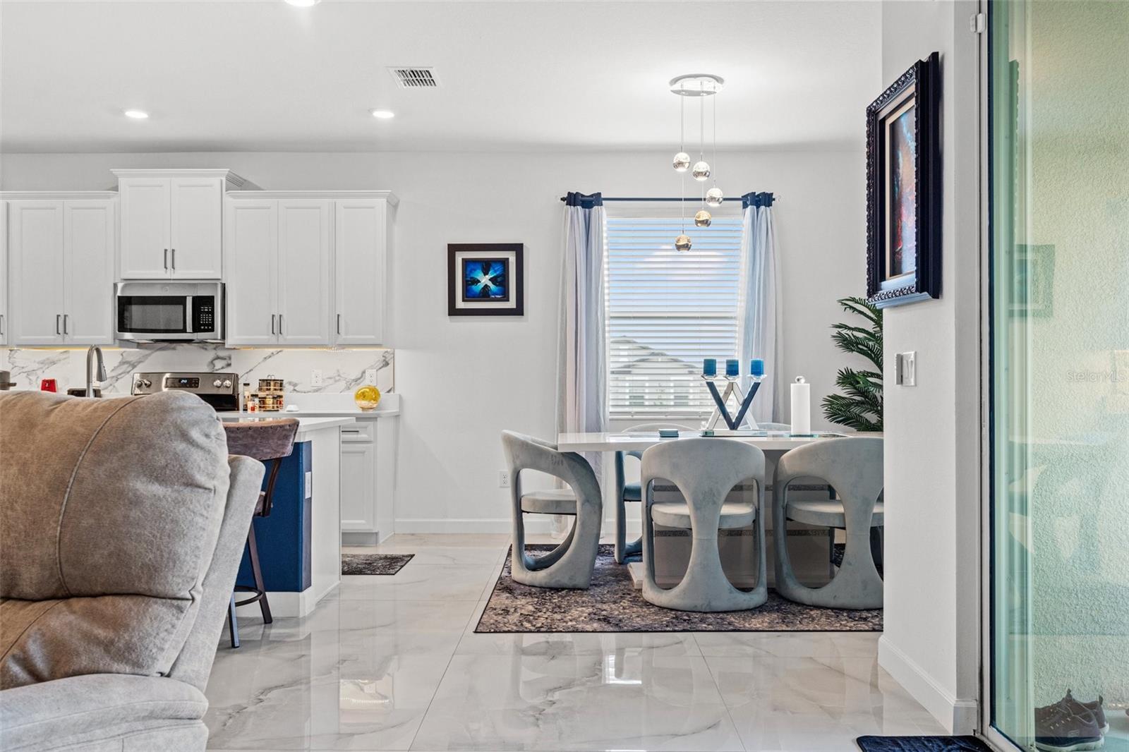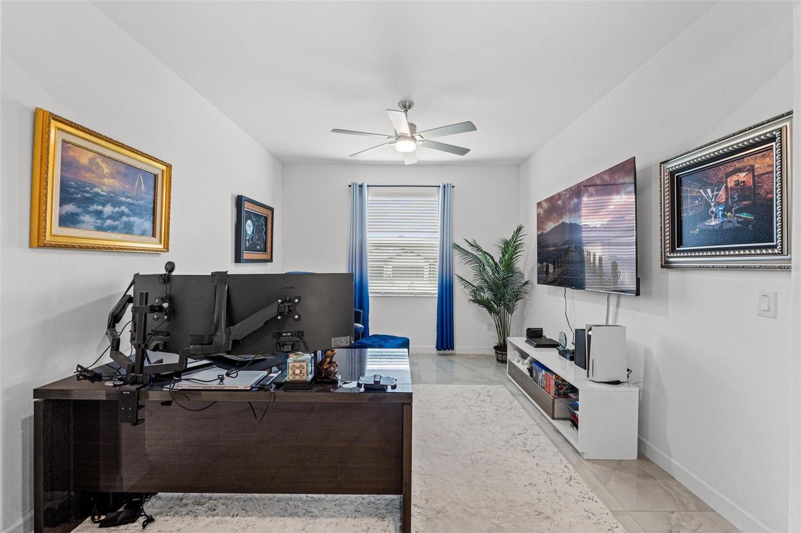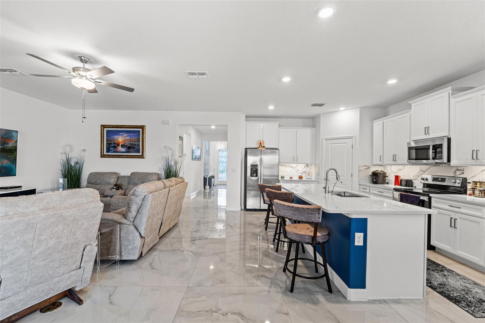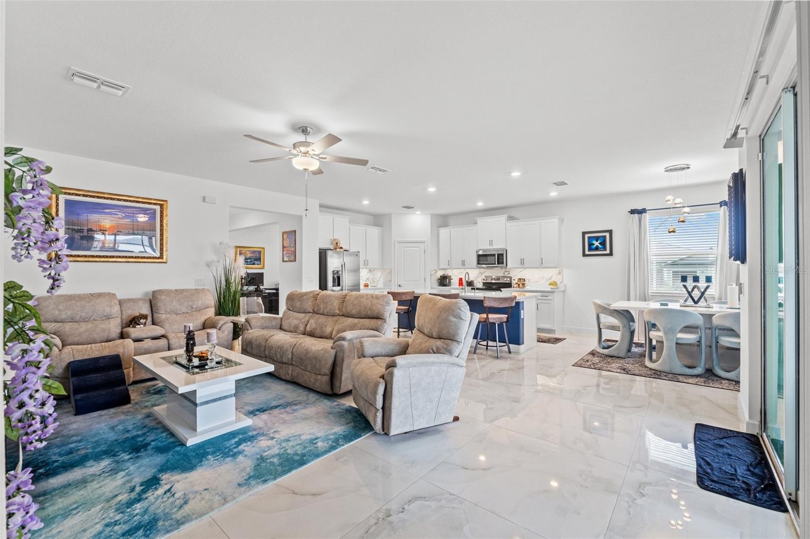 Home in Lagoon Community with Double Corner Lot, Screened Lanai and many upgrades! Welcome to 10381 Tupper Cay Dr, a beautifully maintained 2-bedroom, 2-bath home, with a multi-use flex room, situated on a generous 0.29-acre double corner lot. As you enter the home through the upgraded 8-foot glass panel entrance door, you encounter a beautiful tiled feature wall with a sitting/shoe storage bench and modern chandelier lighting. The guest bath has floor to ceiling custom tile with a LED Spa Shower Tower with a Rain and Waterfall head and four massage body jets. Talk about relaxation after a long day! All of the builder’s floor tile throughout the house has been replaced with a gorgeous large format marble-looking porcelain tile, giving the home an elegant look and feel. The kitchen features a custom backsplash and large pantry. The open concept living and dining areas create a welcoming atmosphere with plenty of natural light. Step outside to your screened-in lanai through the 3-panel glass sliding doors, the perfect spot for morning coffee or evening relaxation. The primary suite serves as a peaceful retreat, complete with a walk-in closet, en-suite bath which has been upgraded with dual vanities, and a custom-tiled walk-in shower. The laundry room is huge. Lighting has been upgraded throughout the house and a fan installed on the lanai. The front porch and driveway have been sealed. This home is in Medley at Mirada, a 55+ community. Medley has a clubhouse with a bar, restaurant, heated pool, billiard room, event room, tennis-pickle ball and bocce ball courts, fitness room and dog park. This sits inside of Mirada’s 15-acre crystal clear lagoon community that has a swim up bar, sandy beaches, tiki huts, kayaking and so much more. It is Resort living at its finest! This easy living neighborhood is a must see to appreciate. Furniture can be included in the sale with a competitive offer!!! Don’t miss out on this wonderful opportunity—schedule your private showing today!