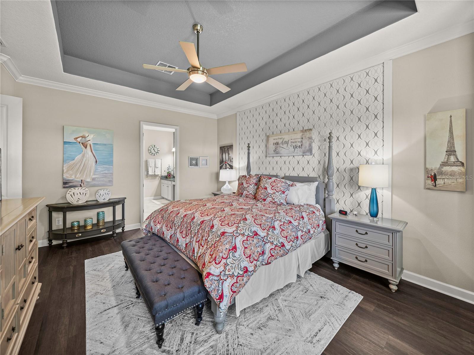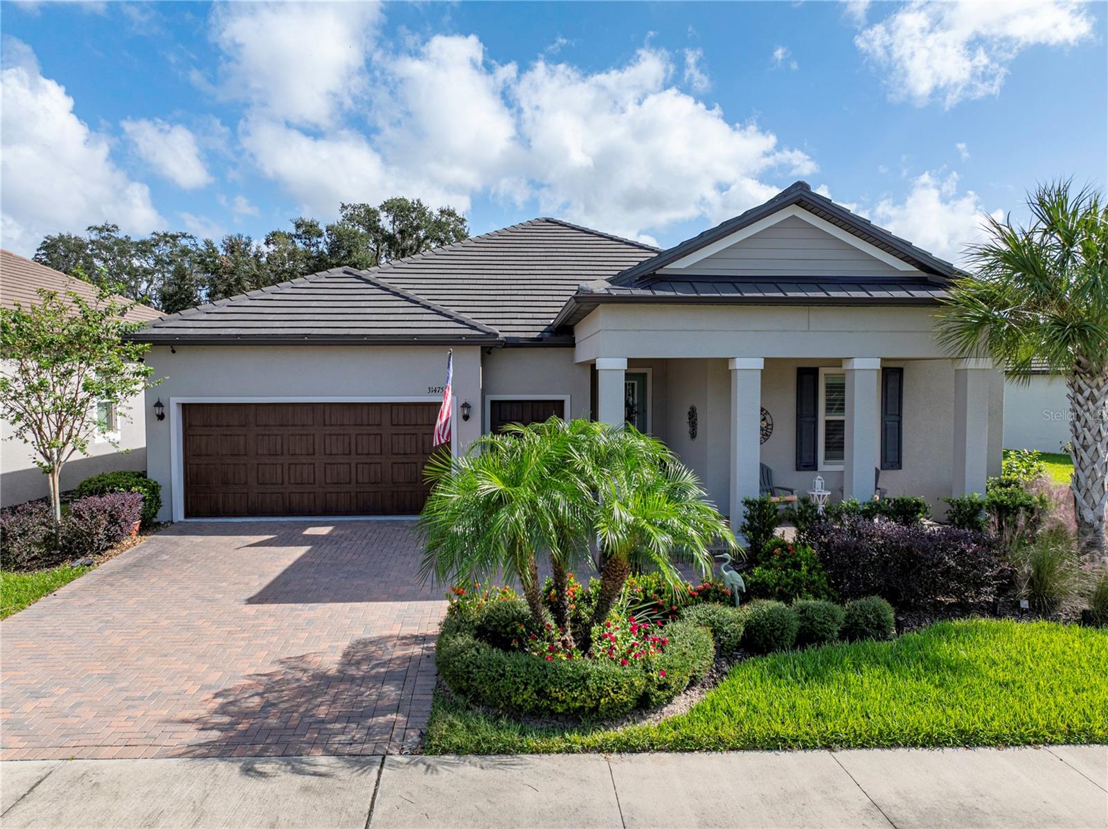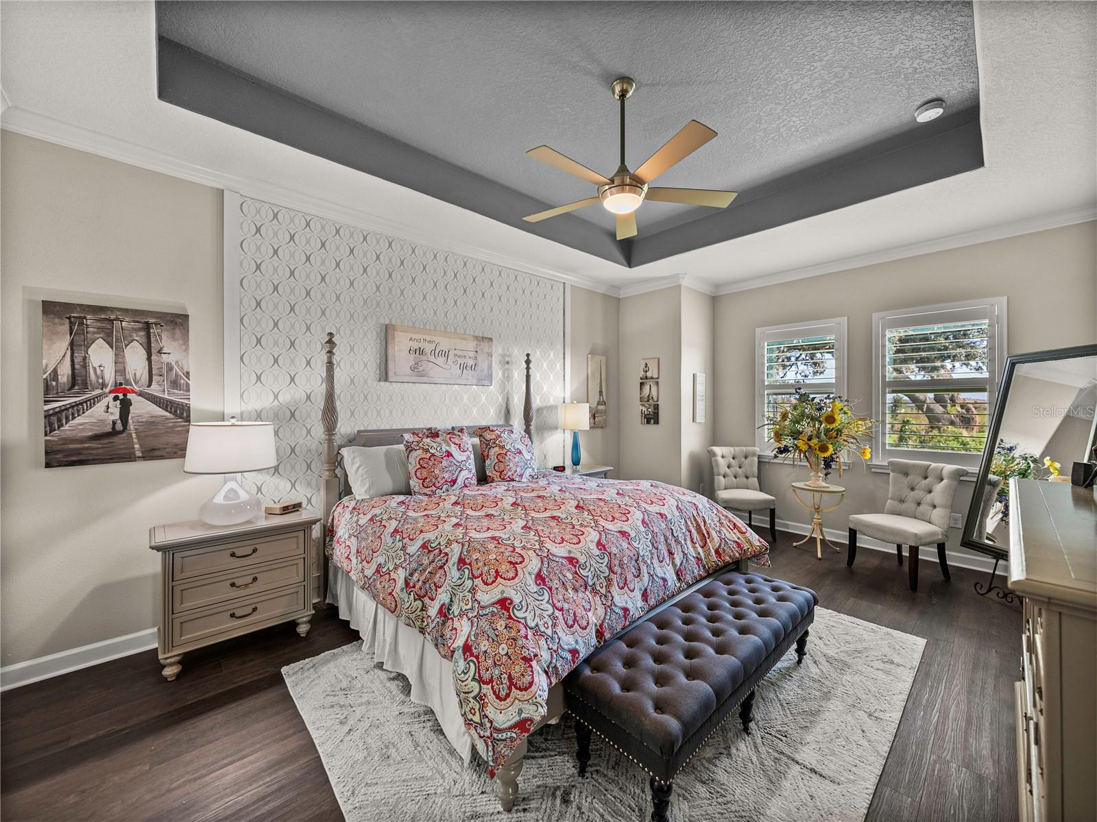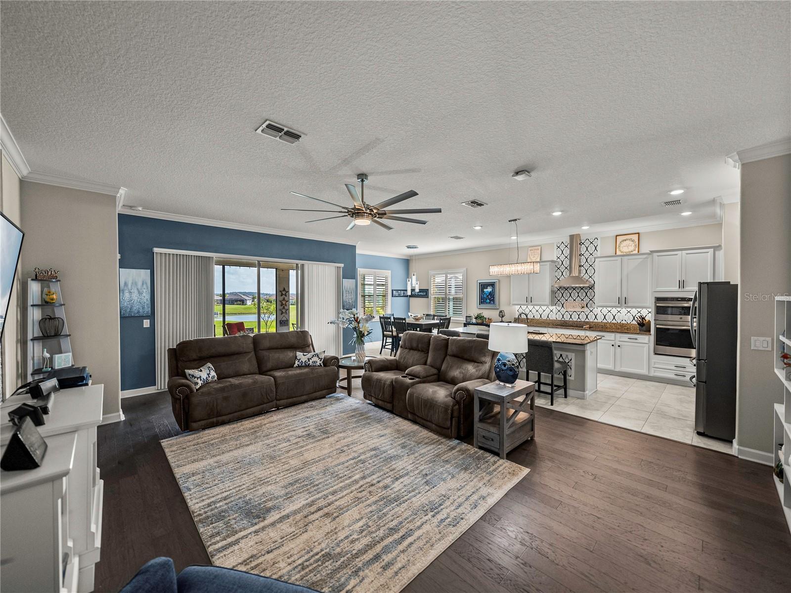 ASSUMABLE MORTGAGE OPTION AT 3.5%!! WHY WAIT TO BUILD? This home has it all including over $75,000 in upgrades. It's on a premium lot with a pond view and no rear neighbors. Your fun-filled future awaits within the gates of the 55+ community of Medley at Mirada! Enjoy the life of luxurious lagoon living where everyday feels like a vacation. Built in 2020, beautifully upgraded and designed residence exceeds all expectations with 3 spacious bedrooms + an office, 2.5 bathrooms, and a 2 car + golf cart garage. Arrive to sidewalk lined streets with convenient guest parking, a lush mature landscape, and a picturesque covered front porch. You will appreciate the stylish character this home exudes from the moment you enter. High ceilings, eye-catching light fixtures, plantation shutters, crown molding, engineered hardwood floors, and stunning wallpaper accent walls are a theme throughout the property. Entertain with pride and ease from the expansive great room that combines the oversized living room with quadruple sliding doors, to the formal dining room, and immaculate kitchen. This space is beautifully equipped to be every chef's dream! Features include granite countertops, a central island with breakfast bar seating, upgraded fixtures and lighting, a butler’s pantry/coffee bar, a large custom walk-in pantry, and stainless steel appliances including a built-in oven and microwave, a cooktop with a range hood, a dishwasher, and refrigerator. A convenient half bathroom for guests resides near the open office and primary suite. This luxurious main bedroom offers expansive sleeping quarters, with luxury vinyl flooring, a walk-in closet with custom organizers, and an ensuite bathroom with a ton of counter, sink, and vanity room along with a built in towel warmer, an oversized walk-in shower with bench seating, and a private water closet. On the opposite side of the home, adjacent to the second full bathroom, bedrooms 2 and 3 are generously sized and each have plush carpet flooring, ceiling fans, and walk-in closets! Near the epoxy floored garage is a mudroom and laundry room-washer and dryer are included. A HUGE bonus is the 120 sq ft finished attic storage space. Can you see a theme here? So much storage! Sip your coffee and enjoy the pond view from the extended screened porch with tile flooring, or utilize the abundant top notch amenities at your disposal. Residents here have access to both the private Medley Amenities (resort style pool, sports courts, clubhouse, ULTRAFi internet, lawn care), and to the spectacular Mirada Lagoon. It is a 15 acre lagoon that offers several water sports, swim up bars, beaches, cabanas, and so much more. Living in Mirada is not a lifestyle you want to pass up, call us today for your private tour!