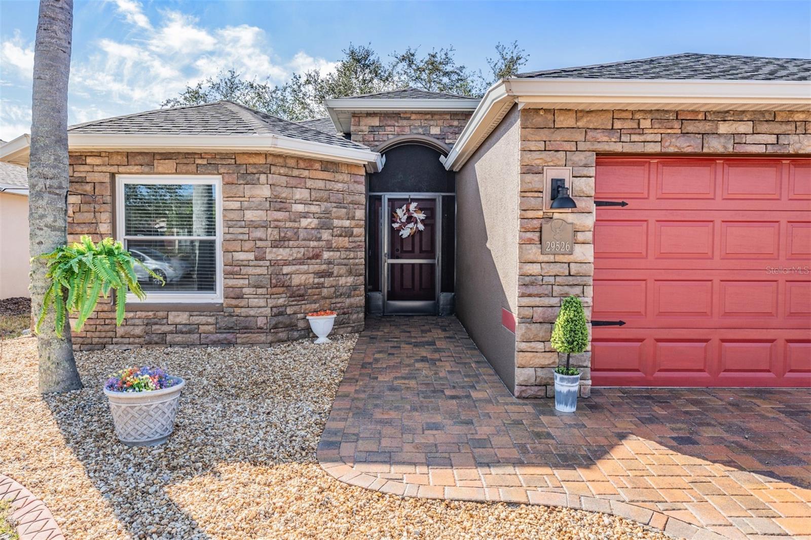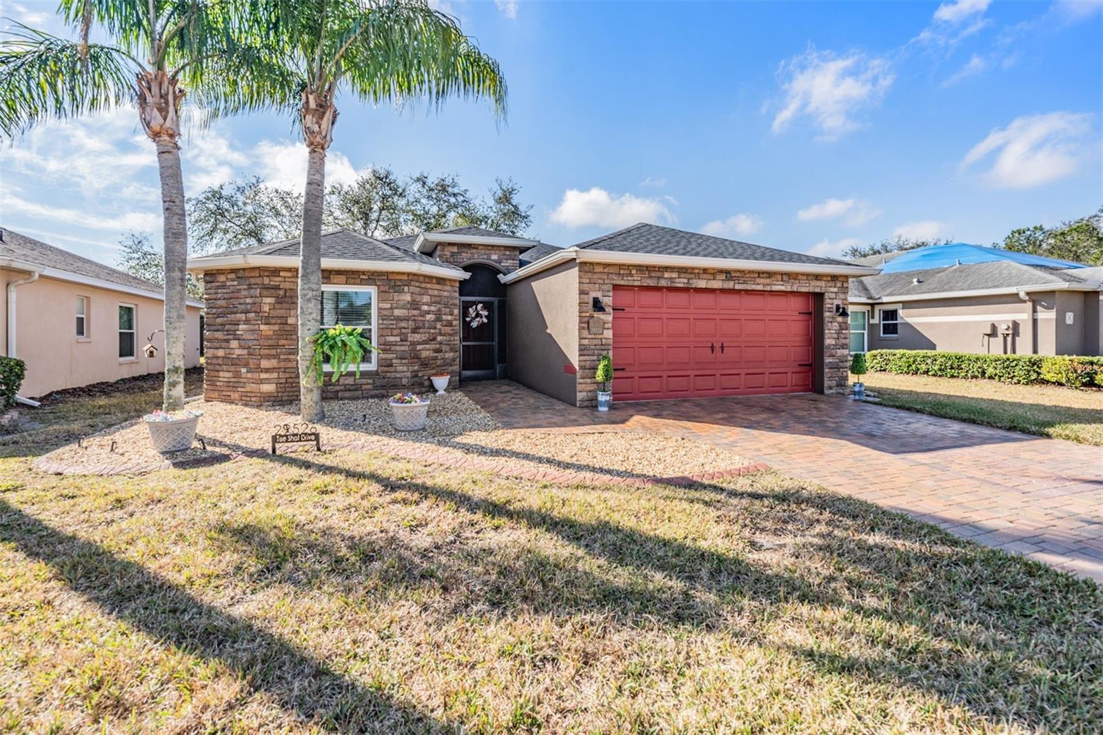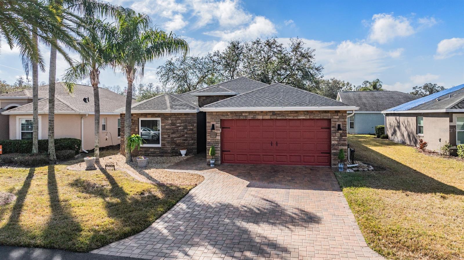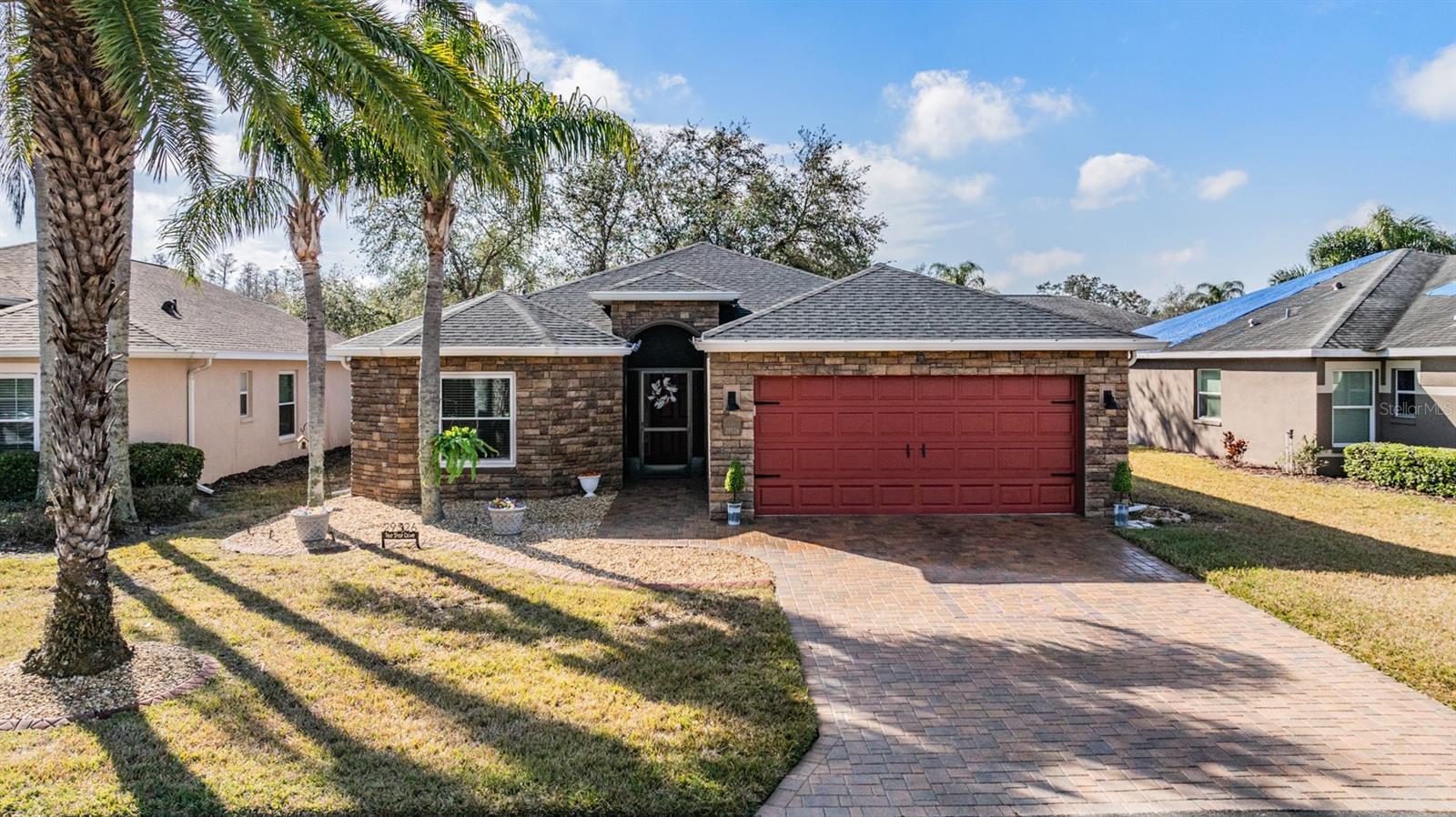 Welcome to this MOVE IN READY home with newer 2022 ROOF and UPDATED interior, located in the man guard GATED Tampa Bay Golf & Tennis Club, a 55+ community offering resort-style living at its finest! This well-maintained 2-bedroom, 2-bathroom home boasts a light, bright, OPEN feel with cathedral ceilings in the spacious great room. Sliding glass doors open to extend your entertaining space onto the lanai. Double doors from great room open to a Flex room, which makes an excellent home office, den or third bedroom! Stunning curb appeal with BRICK PAVER driveway & walkway, stack stone front, landscape lighting, coach lights, and a flagpole in the landscape bed greets you. Inside, the open floor plan features warm laminate flooring, newly painted neutral interior walls, and lighted plant shelves. The kitchen is open to the great room and has granite countertops with an eat-in space overlooking the backyard and screened lanai. Tile floor and vaulted ceiling make this space a nice place to unwind! Oversized backyard with other homes staggered in distance, gives great line of sight and visual appearance of more space between homes! Spacious owners retreat includes two closets and a large walk-in shower, dual sinks and tile floors in the bath ensuite. A second bedroom and bathroom are located at the front of the home in this split bedroom plan. This home also includes double-pane windows for energy efficiency, an interior laundry room with washer and dryer, plus a 2-car garage. Upgrades include 2023 Electrolux refrigerator and stainless whirlpool 2021 microwave, 2021 range, 2021 dishwasher, 2021 comfort height toilets, 2018 AC with UV light, 2022 painted interior, 2022 new Roof to name a few. This ACTIVE community offers an abundance of Resident owned amenities, including an 18-hole championship golf course, 9-hole executive course, pro shop, two swimming pools, hot tub, fitness center, shuffleboard, tennis courts, pickleball courts, library with computers, billiards room, card rooms with poker tables, lighted dog parks with coolers and natural ponds to fish. Enjoy activities like onsite entertainment shows, banquet facilities with dance floor, planned travel excursions, and events at the 15,000 sq ft clubhouse, which features a full-service restaurant and pub/grille. The HOA fee includes cable TV with 2 boxes, high-speed internet, lawn care, gated entrances, private streets and use of amenities and maintenance of the common areas. Located north of Tampa near shopping and dining with easy access to I-75, this home is high & dry and not in a flood zone. Take advantage of this Resort lifestyle and CALL TODAY to see why this IS the place to BE!
