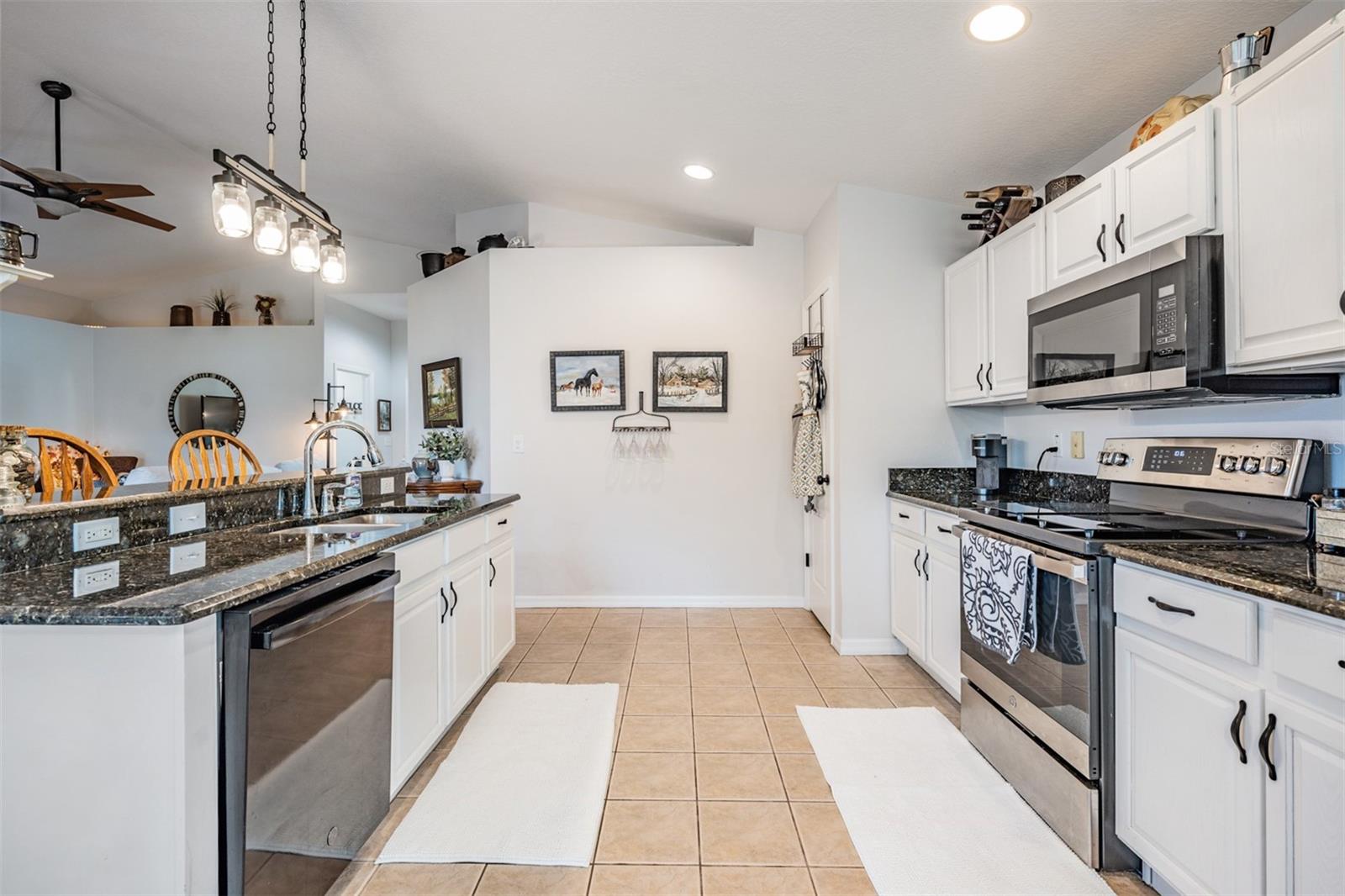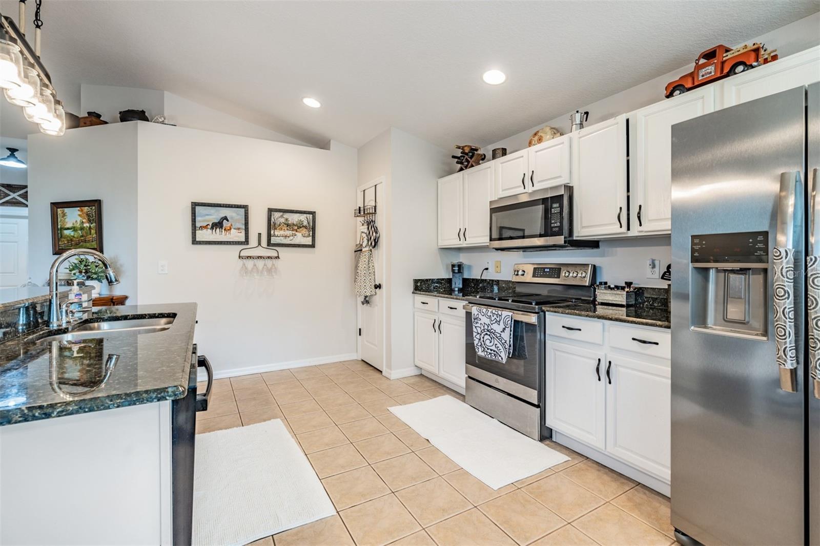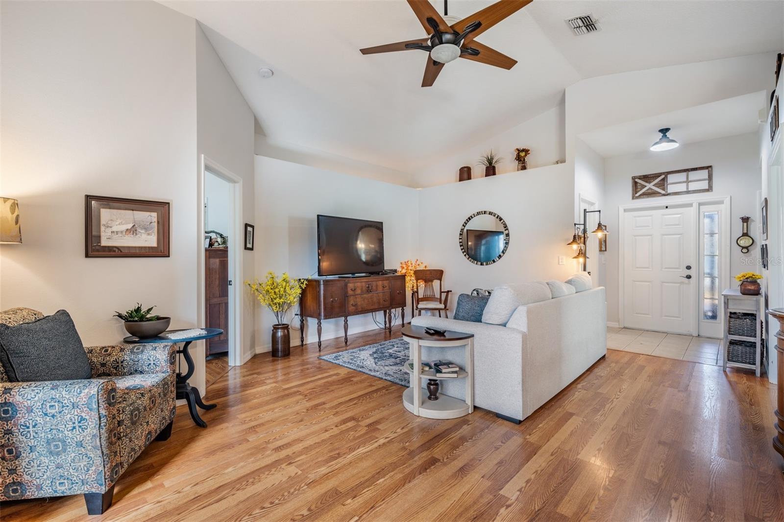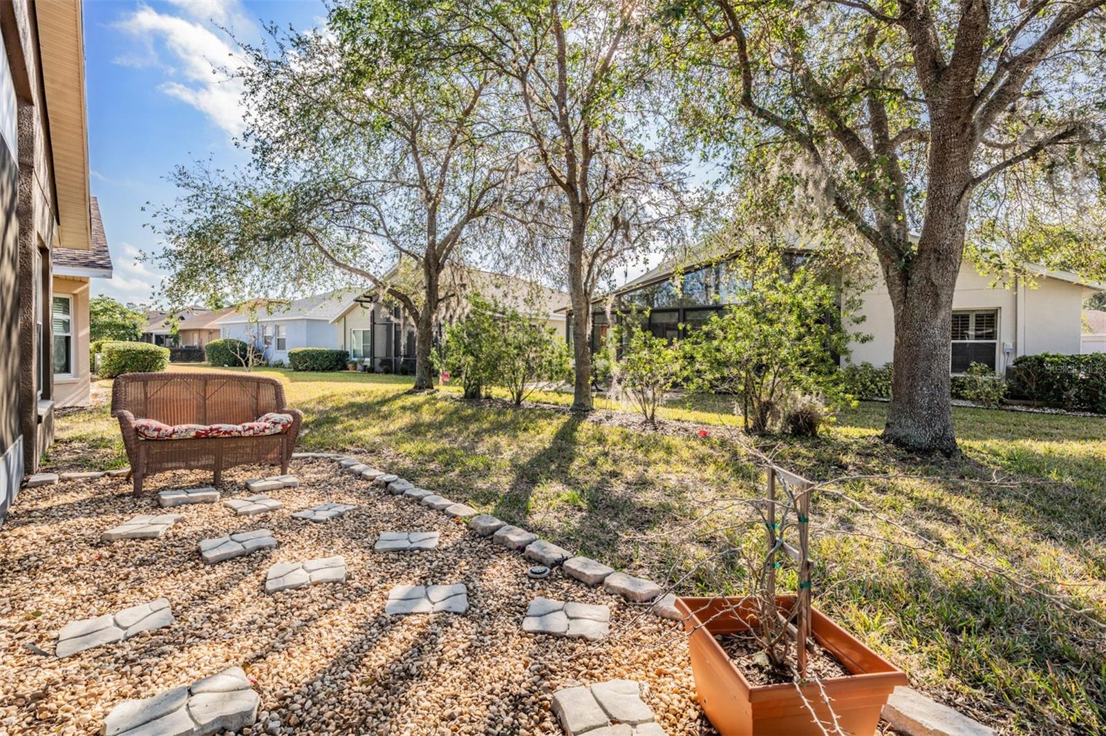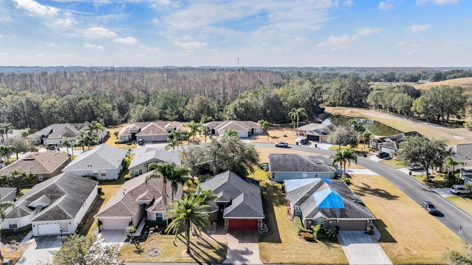 Welcome to this MOVE IN READY home with newer 2022 ROOF and UPDATED interior, located in the man guard GATED Tampa Bay Golf & Tennis Club, a 55+ community offering resort-style living at its finest! This well-maintained 2-bedroom, 2-bathroom home boasts a light, bright, OPEN feel with cathedral ceilings in the spacious great room. Sliding glass doors open to extend your entertaining space onto the lanai. Double doors from great room open to a Flex room, which makes an excellent home office, den or third bedroom! Stunning curb appeal with BRICK PAVER driveway & walkway, stack stone front, landscape lighting, coach lights, and a flagpole in the landscape bed greets you. Inside, the open floor plan features warm laminate flooring, newly painted neutral interior walls, and lighted plant shelves. The kitchen is open to the great room and has granite countertops with an eat-in space overlooking the backyard and screened lanai. Tile floor and vaulted ceiling make this space a nice place to unwind! Oversized backyard with other homes staggered in distance, gives great line of sight and visual appearance of more space between homes! Spacious owners retreat includes two closets and a large walk-in shower, dual sinks and tile floors in the bath ensuite. A second bedroom and bathroom are located at the front of the home in this split bedroom plan. This home also includes double-pane windows for energy efficiency, an interior laundry room with washer and dryer, plus a 2-car garage. Upgrades include 2023 Electrolux refrigerator and stainless whirlpool 2021 microwave, 2021 range, 2021 dishwasher, 2021 comfort height toilets, 2018 AC with UV light, 2022 painted interior, 2022 new Roof to name a few. This ACTIVE community offers an abundance of Resident owned amenities, including an 18-hole championship golf course, 9-hole executive course, pro shop, two swimming pools, hot tub, fitness center, shuffleboard, tennis courts, pickleball courts, library with computers, billiards room, card rooms with poker tables, lighted dog parks with coolers and natural ponds to fish. Enjoy activities like onsite entertainment shows, banquet facilities with dance floor, planned travel excursions, and events at the 15,000 sq ft clubhouse, which features a full-service restaurant and pub/grille. The HOA fee includes cable TV with 2 boxes, high-speed internet, lawn care, gated entrances, private streets and use of amenities and maintenance of the common areas. Located north of Tampa near shopping and dining with easy access to I-75, this home is high & dry and not in a flood zone. Take advantage of this Resort lifestyle and CALL TODAY to see why this IS the place to BE!