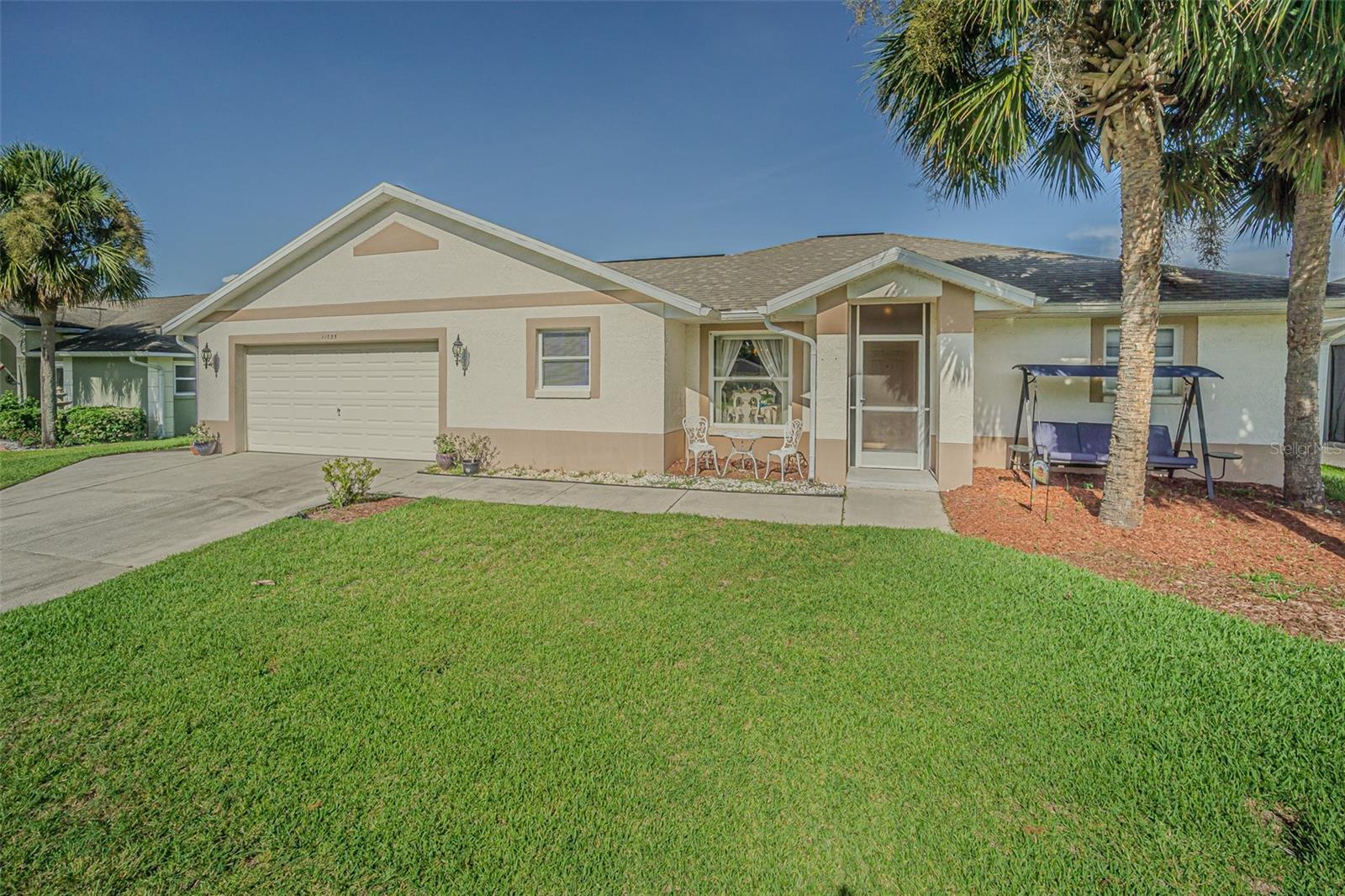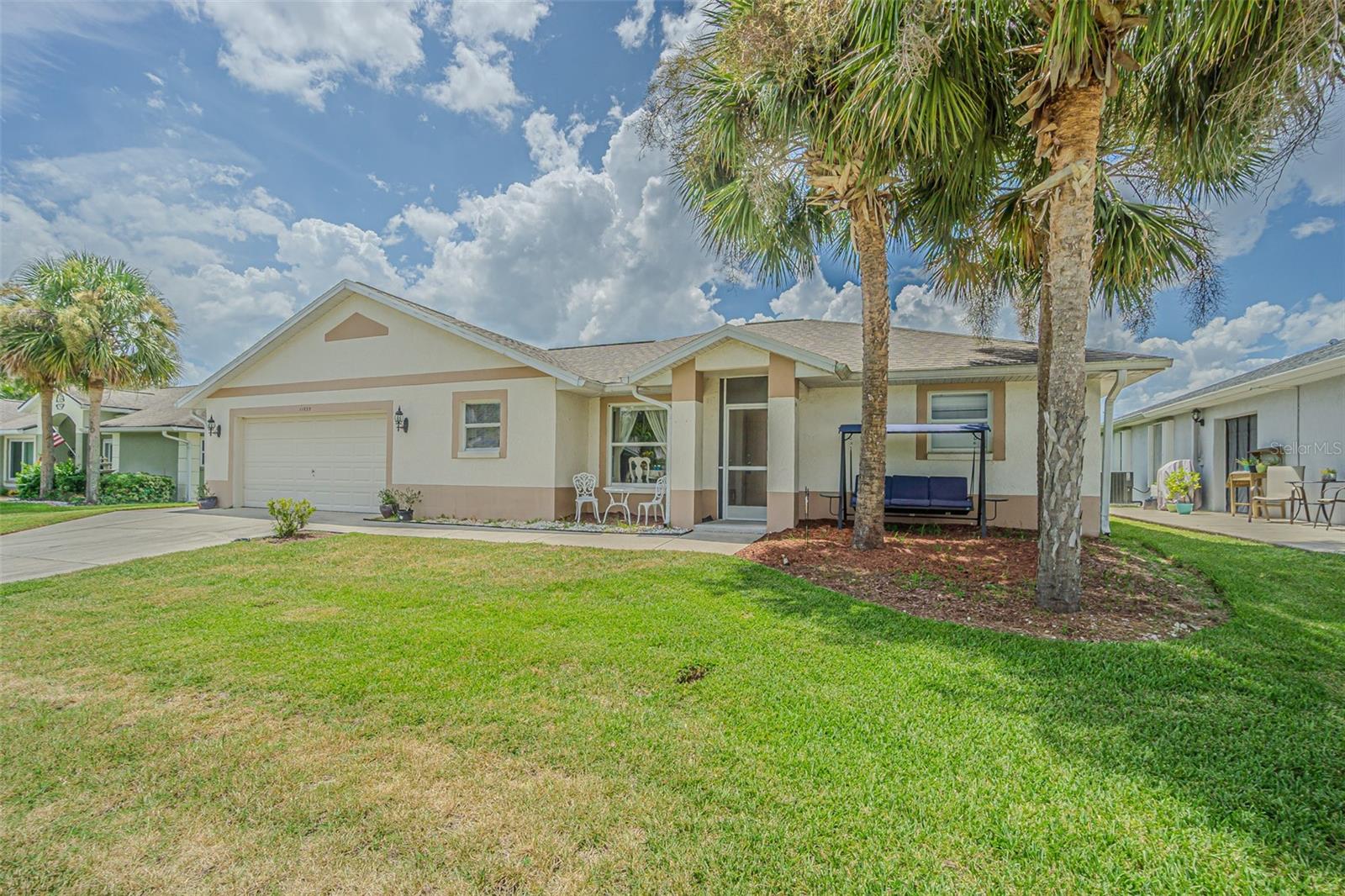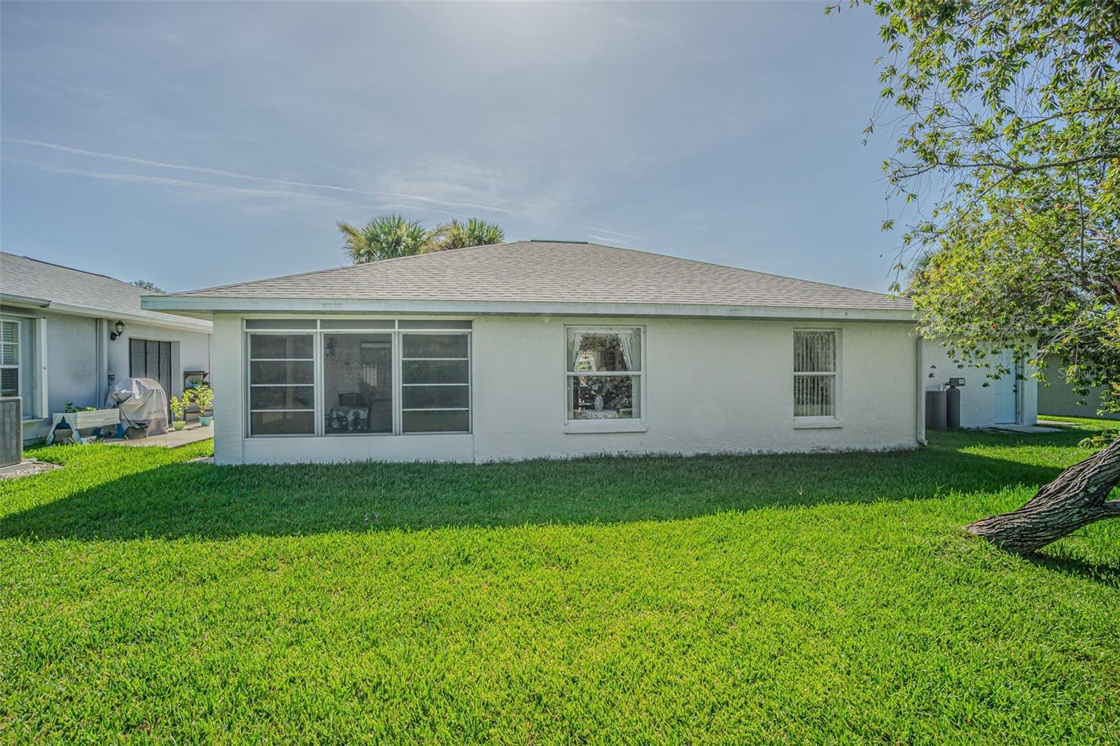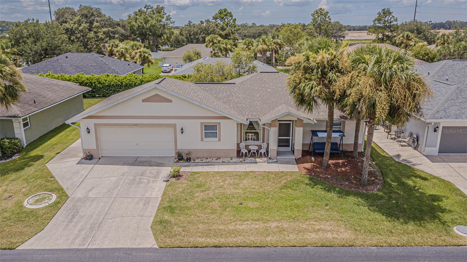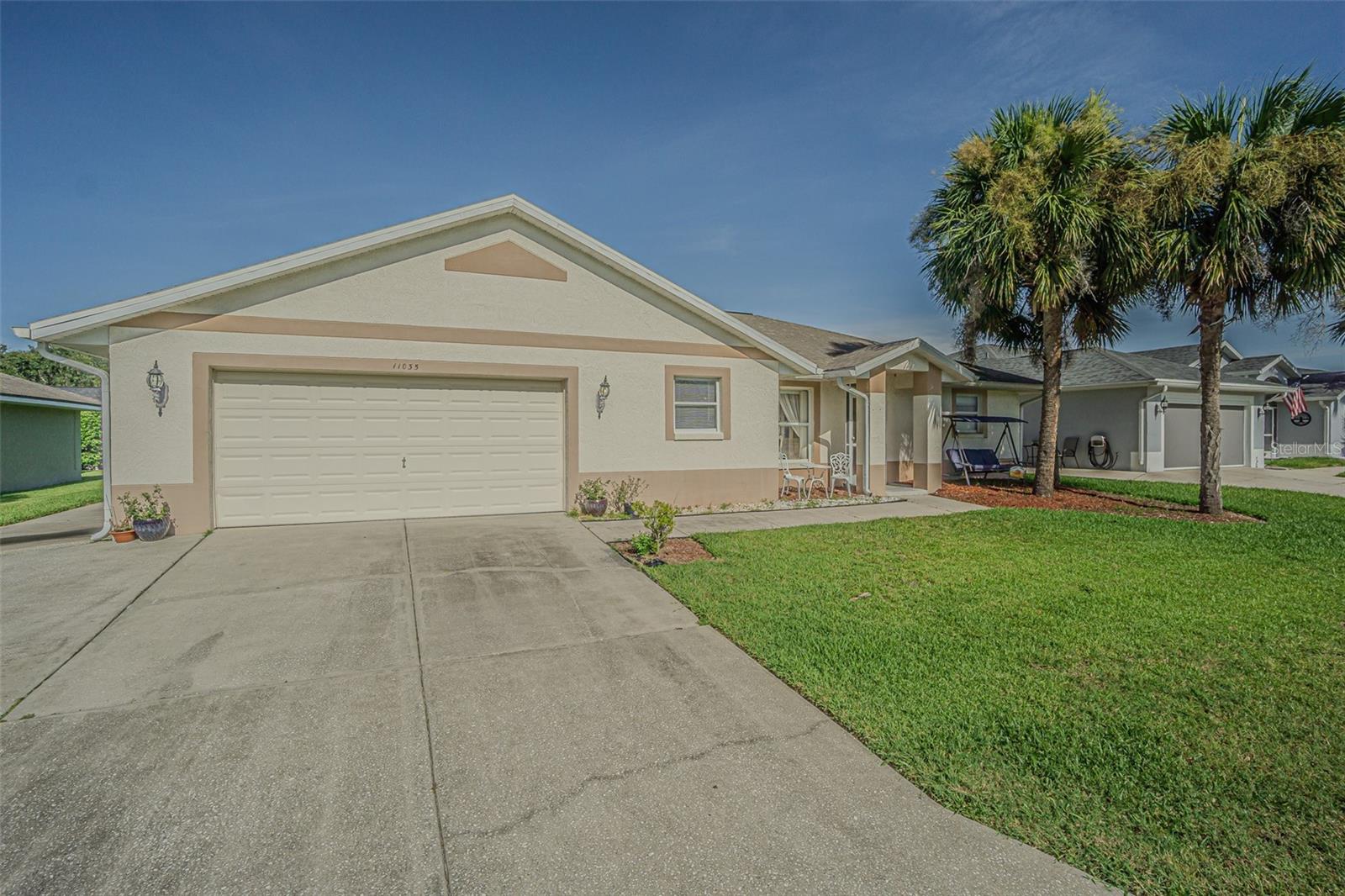 Live the RESORT Lifestyle in this updated 2-bedroom, 2-bath home located in the highly sought after 55+ gated community of Tampa Bay Golf & Tennis Club! Situated on an oversized lot, this modified Riviera model offers a thoughtfully expanded great room floor plan and a rare side-entry golf cart garage. The home boasts cathedral ceilings, double-pane windows, and a fully enclosed Florida room with vinyl windows... perfect for enjoying your morning coffee or entertaining guests overlooking your private backyard. Screened front entry welcomes you and once inside you will be greeted with a Light, Bright, OPEN floorplan with Cathedral ceilings. The U-shaped kitchen offers a window over the sink overlooking the front landscape, white cabinets with contrasting drawers for added storage, breakfast bar OPEN to dining area plus a closet pantry. All appliances are included... Stainless steel refrigerator, smooth top range, dishwasher, counter microwave, washer/dryer, as well as all window treatments and upgraded ceiling fans. The new garage door opener comes with two transmitters for added convenience. Split bedroom layout ensures privacy for both homeowners and guests with the cathedral ceiling, SPACIOUS Great room in the center to make entertaining a breeze! Great room and spacious primary suite features sliding glass doors to enclosed lanai, with spacious walk-in closet and a bath ensuite off the primary bedroom, featuring a walk-in shower, while the guest bath offers a tub/shower combo. Modified Rivera plan includes an inside utility closet off the kitchen instead of the washer and dryer in the garage. Major upgrades include a brand NEW ROOF in August 2023 with a limited lifetime warranty, newer A/C unit (August 2023) with a 5-year warranty plus a Culligan whole-house water softener system (owned, not leased). Additional highlights include gutters, an extra-wide driveway, screened-in entry and lanai areas under roof, creating cross breezes and wonderful outdoor living space. This Move in Ready property offers fantastic value, with a lot large enough to add your own private pool. Residents of Tampa Bay Golf & Tennis Club enjoy access to two championship golf courses, 15,000 sq. ft. clubhouse, heated community pool, full-service restaurant and bar, fitness center, library, billiards, shuffleboard, poker tables, two dog parks, and a vibrant calendar of social clubs and activities including dance lessons, painting, crafts... in addition to planned onsite entertainment, dinner shows and travel excursions. This is your opportunity to enjoy RESORT SYTLE living in a tranquil yet active community—perfect for downsizing or retiring in comfort. Located just North of Tampa with easy access to Ocala, Orlando, Tampa, Lakeland, Wesley Chapel, International airports or the beaches! CALL TODAY!